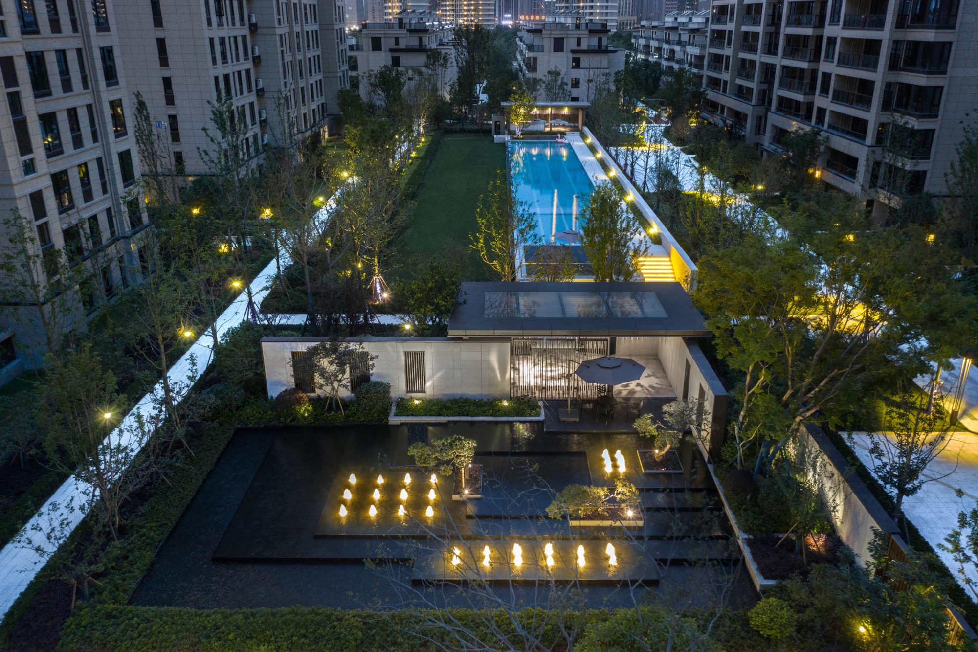 在设计中我们尽可能预留一些可以用来聚会、交流、娱乐的场所,而非是靠繁杂的绿化去填塞空间而牺牲了未来大量人流活动的可能性。设计将中庭多功能化,设计度假式主题景观会客厅、700㎡超大阳光草坪,50m分区泳池以及休闲廊架。