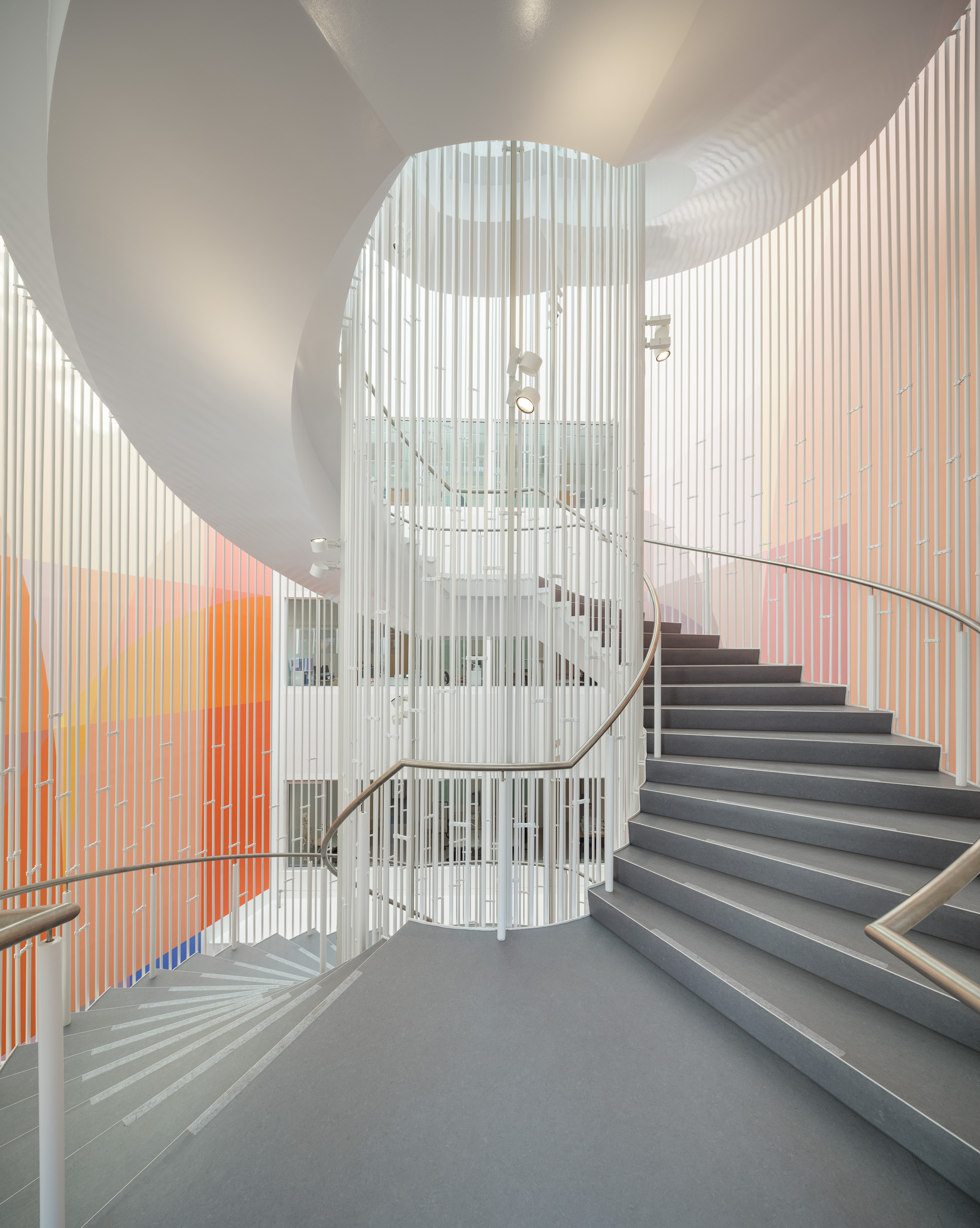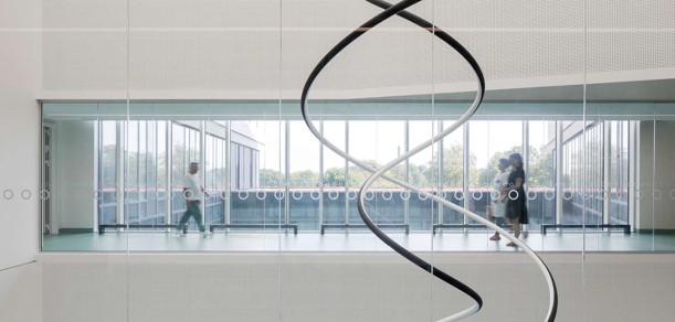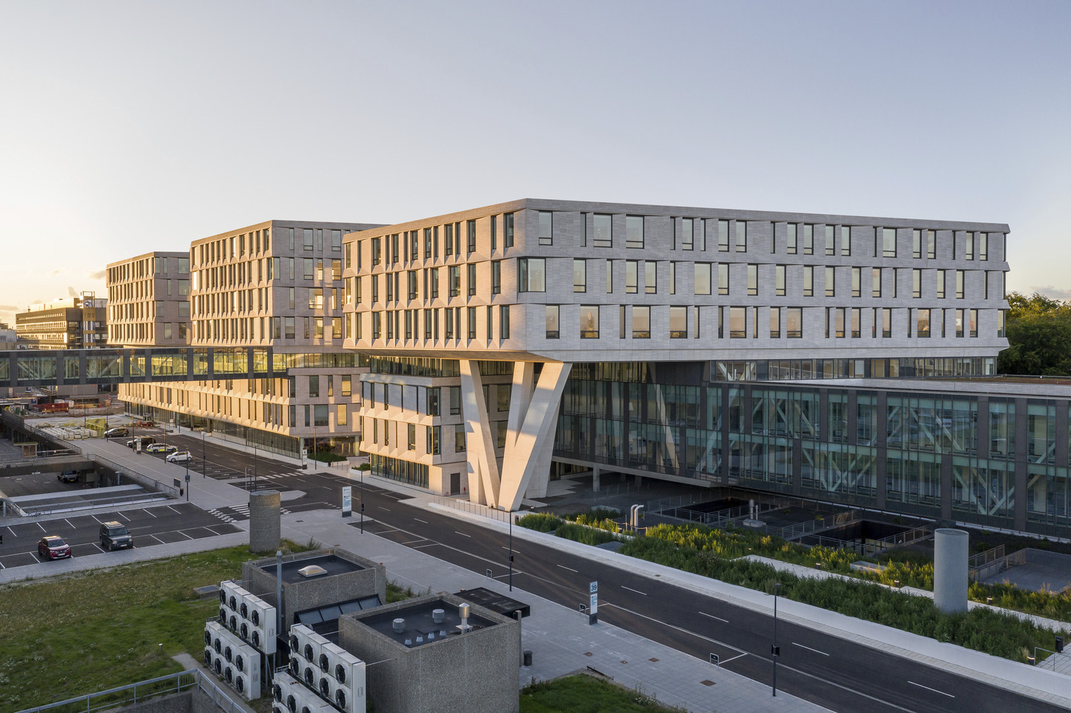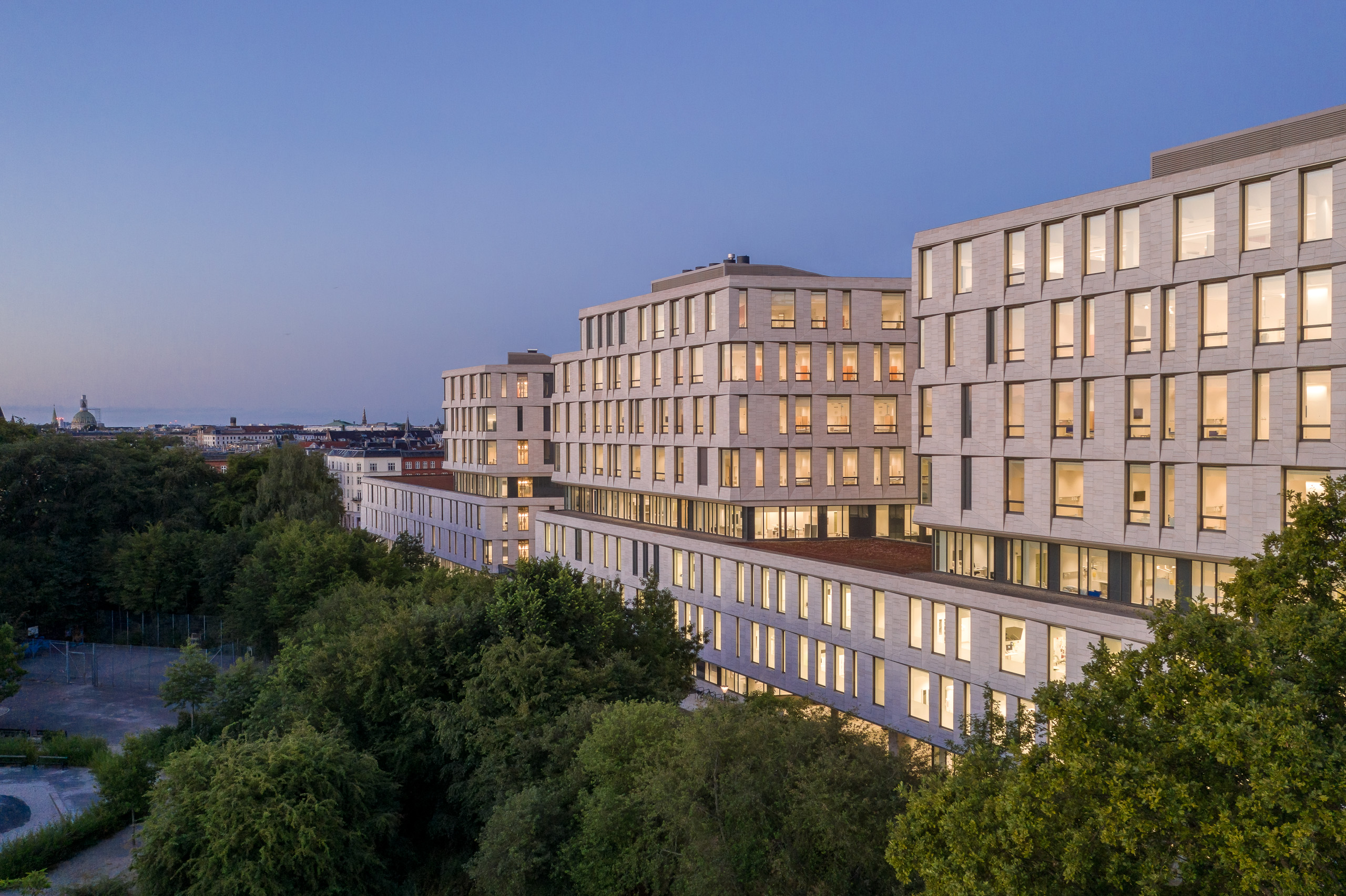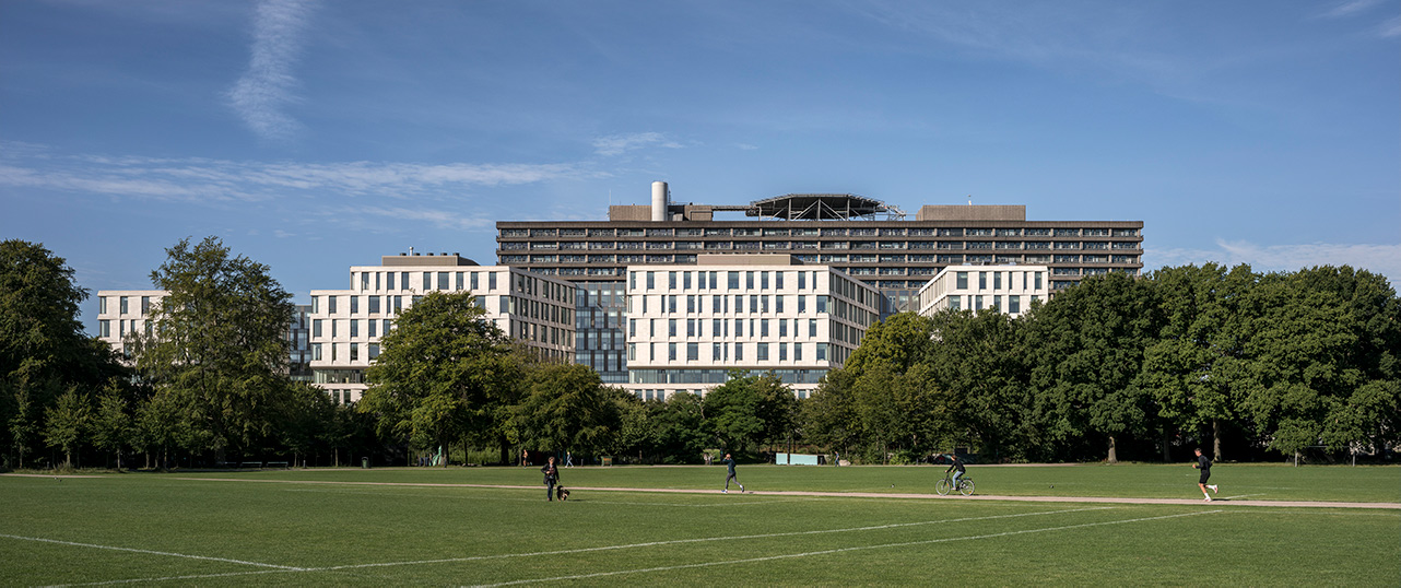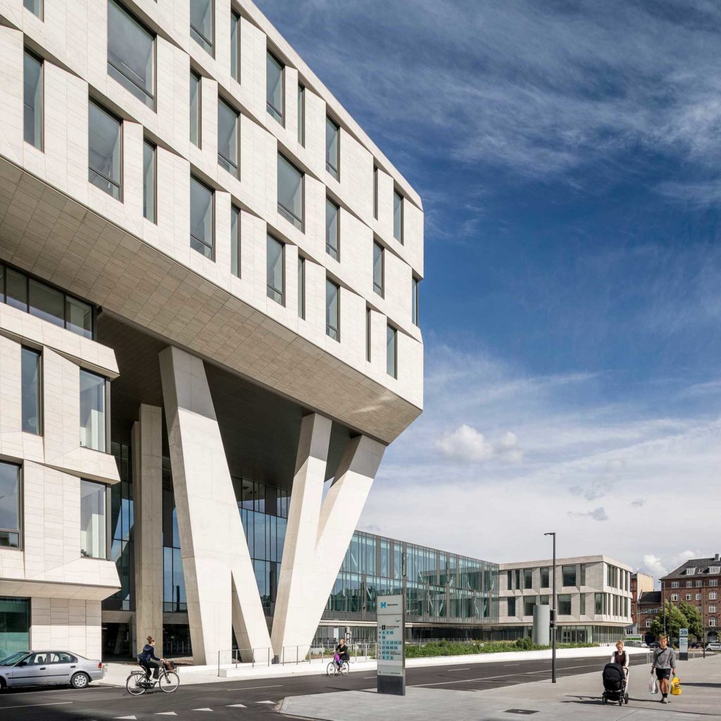 Rigshospital is situated between several urban green spaces in the city of Copenhagen, in close proximity to the University of Copenhagen and the Panum Institute. Together with the neighboring research and educational institutions, the hospital campus forms the “knowledge cluster” concept of the master plan for the area. The new ‘North Wing’ is a complex that better integrates and communicates with the whole area and contributes to the overall urban context. Through a simple deformation of the building form, the buildings are distributed around a major axis and folded into a V-shaped structure, which allows for easy access and flexibility in the arrangement of functions. At the same time this distribution system ensures a good logistic system and at the same time a good orientation for the medical staff and visitors.
