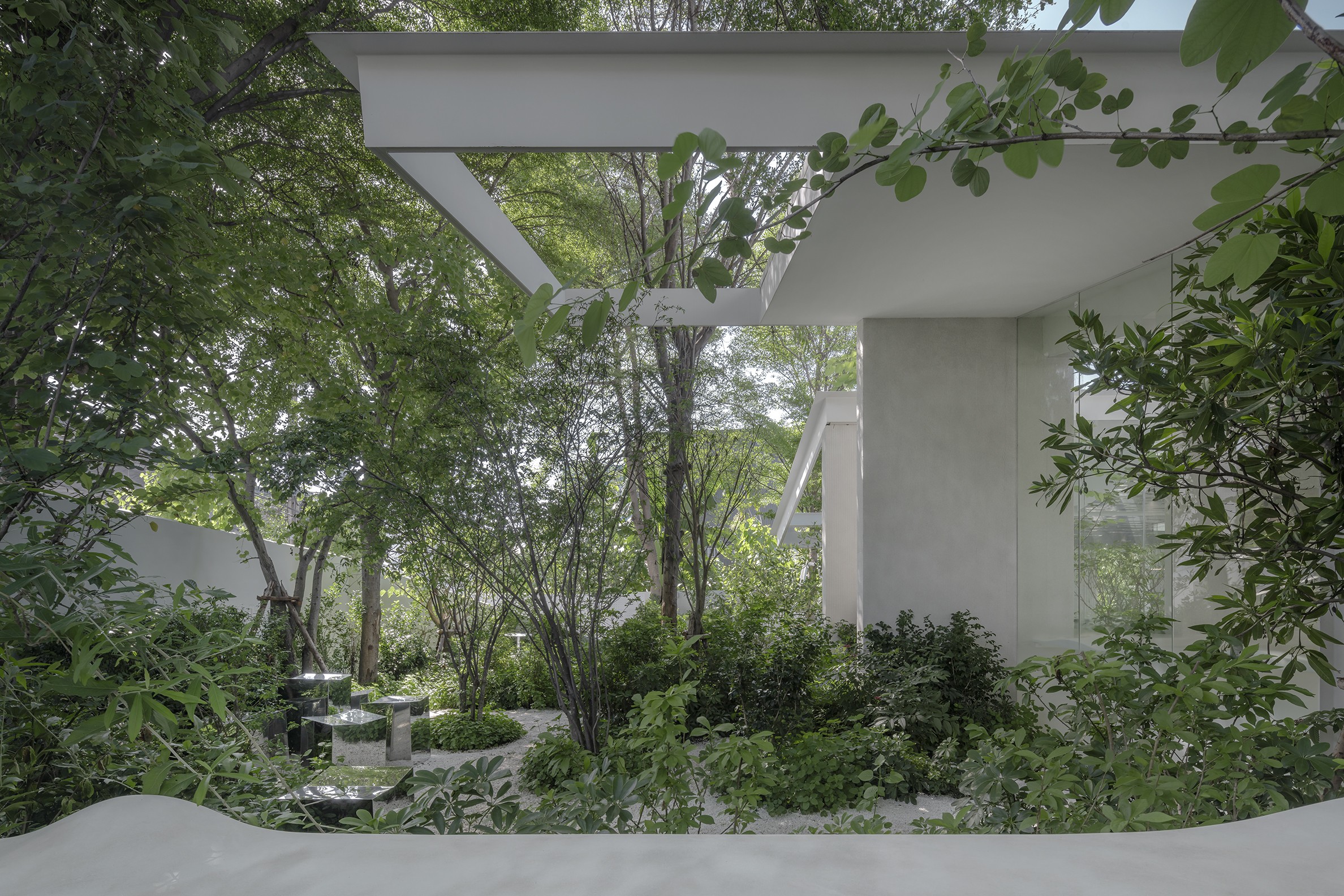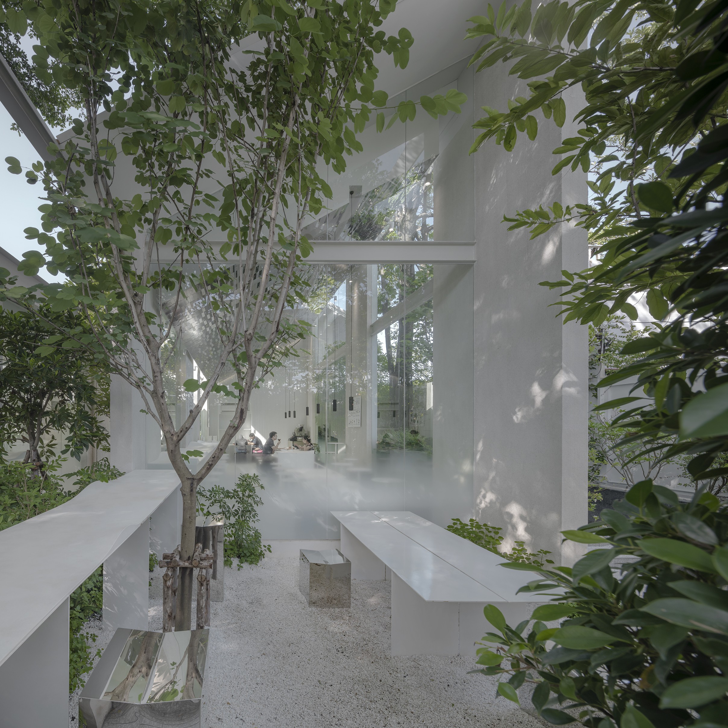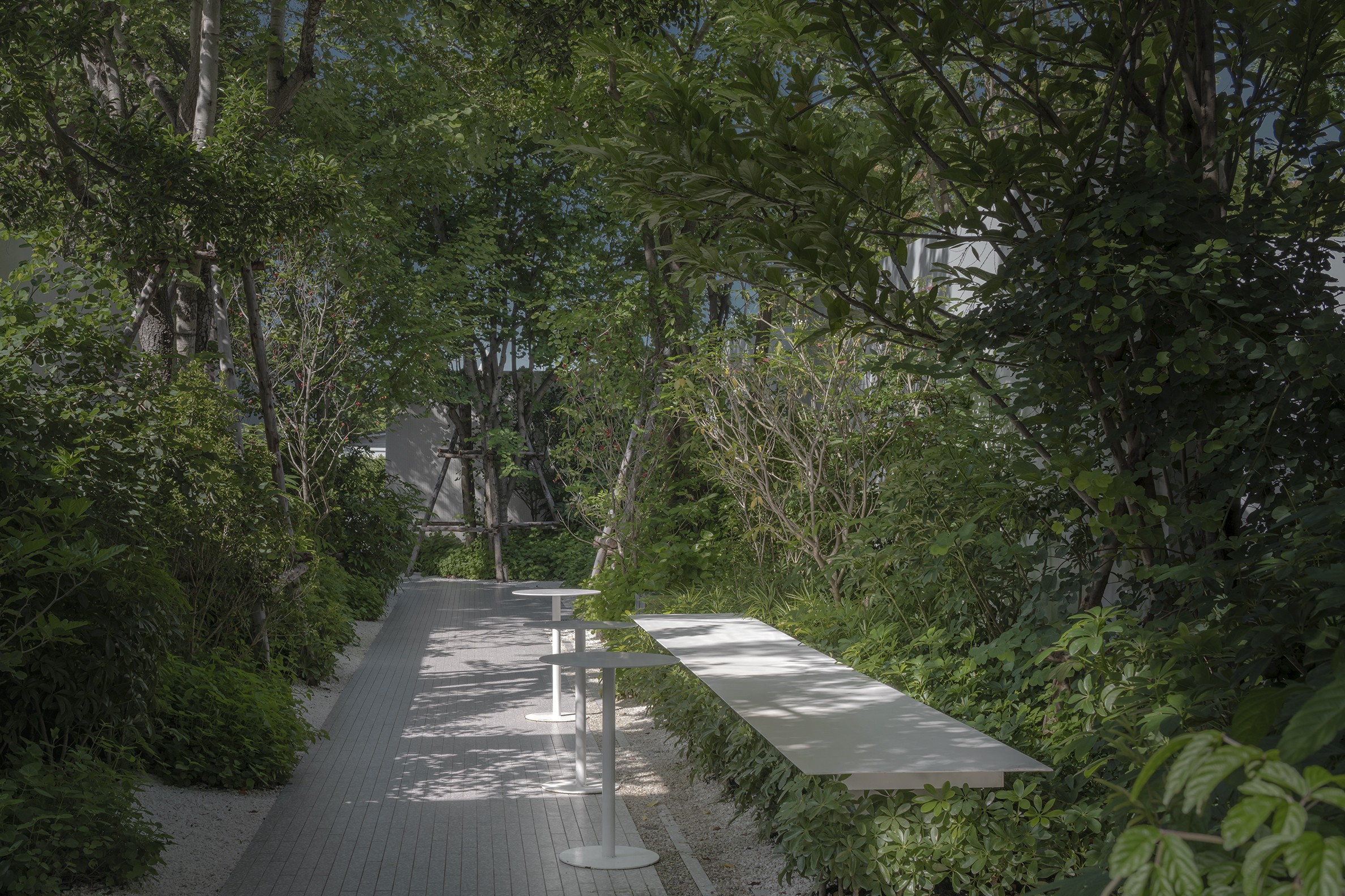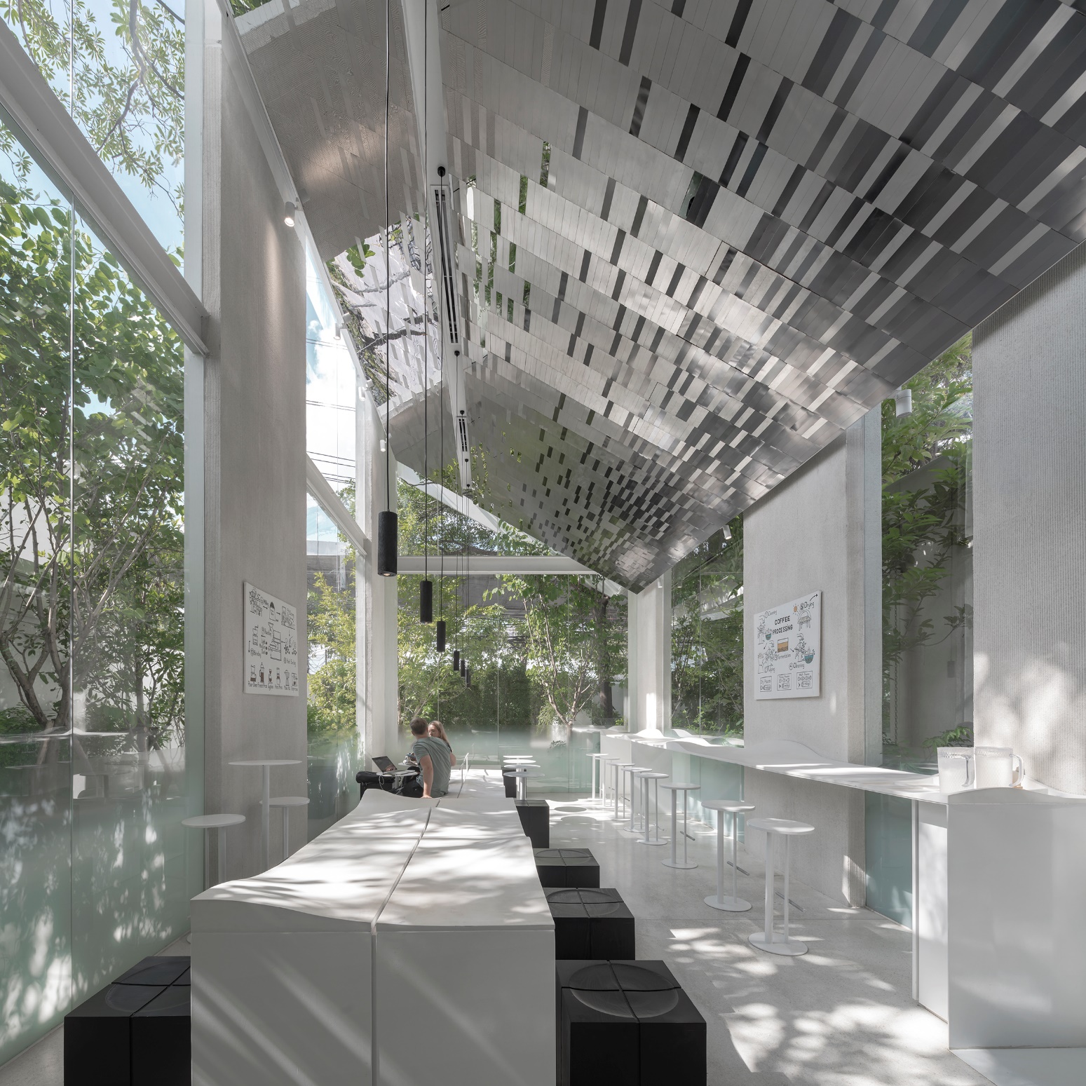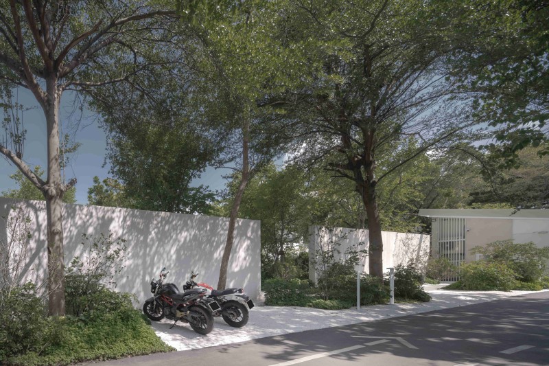 Nana Coffee Roasters Bangna, located in Bangna’s bustling commercial/residential district, offers a unique café design that merges architecture, interior, and landscape into a seamless experience. The design shifts focus from the busy Bangna-Trad motorway to a tranquil coffee-drinking environment surrounded by nature. Lush greenery shields the space from noise, dust, and pollution, while existing trees create a cooler microclimate. The landscape blends into the interior, with furniture extending to garden terraces, blurring the lines between inside and outside. This urban sanctuary not only enhances the visitor experience but also promotes biodiversity, providing habitats and food for birds, bees, and insects. The design prioritizes nature and quality coffee over Instagrammable aesthetics, creating a serene retreat in the heart of the city.