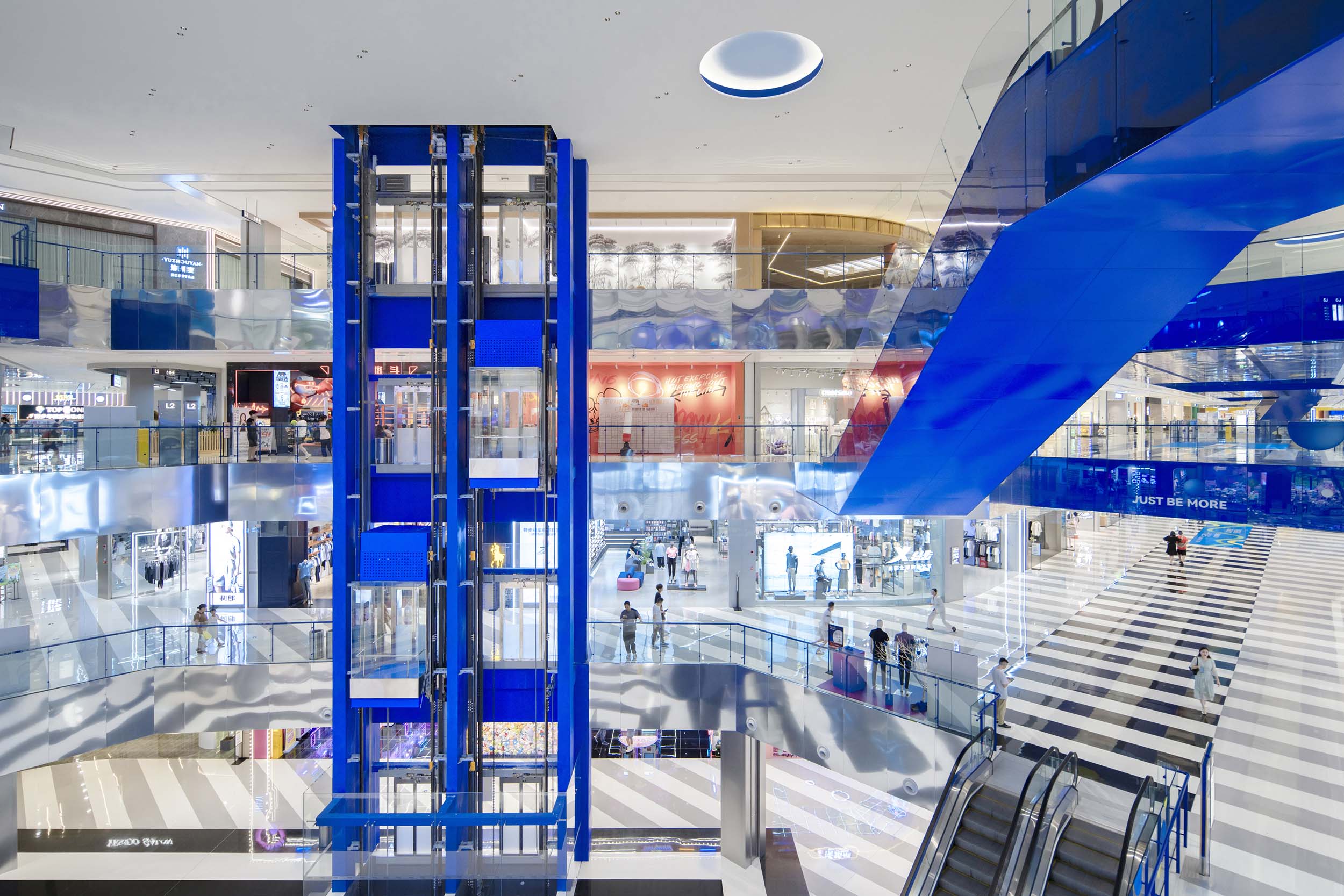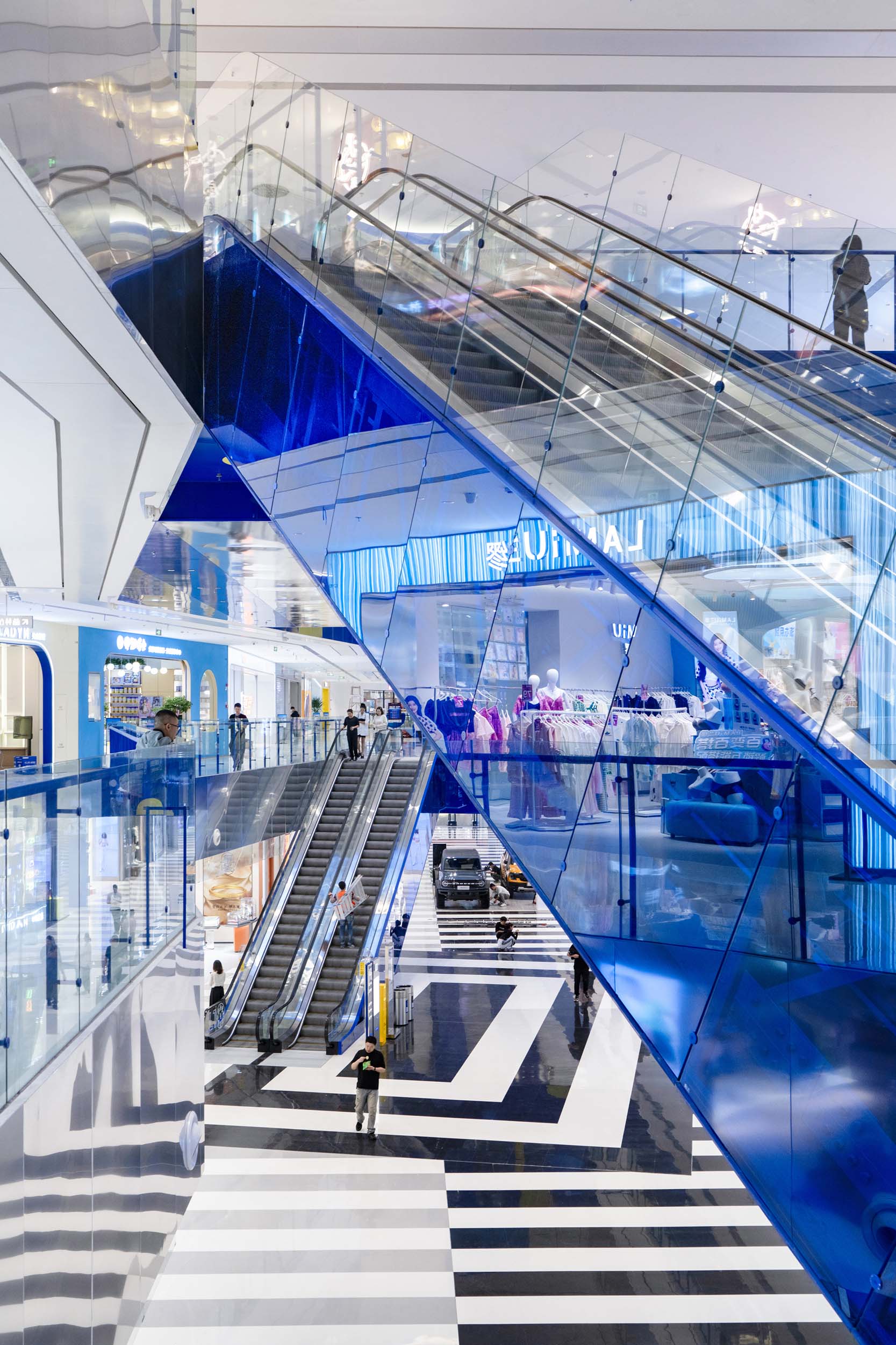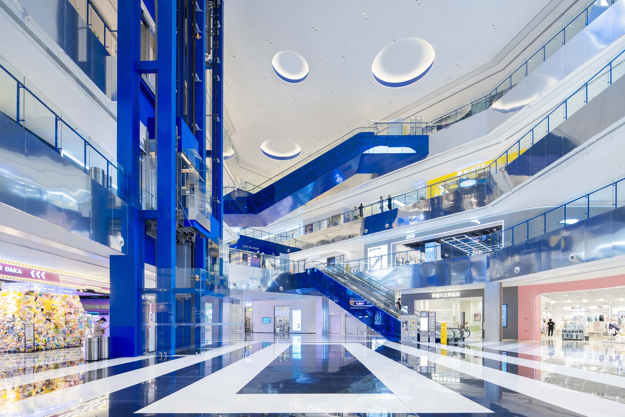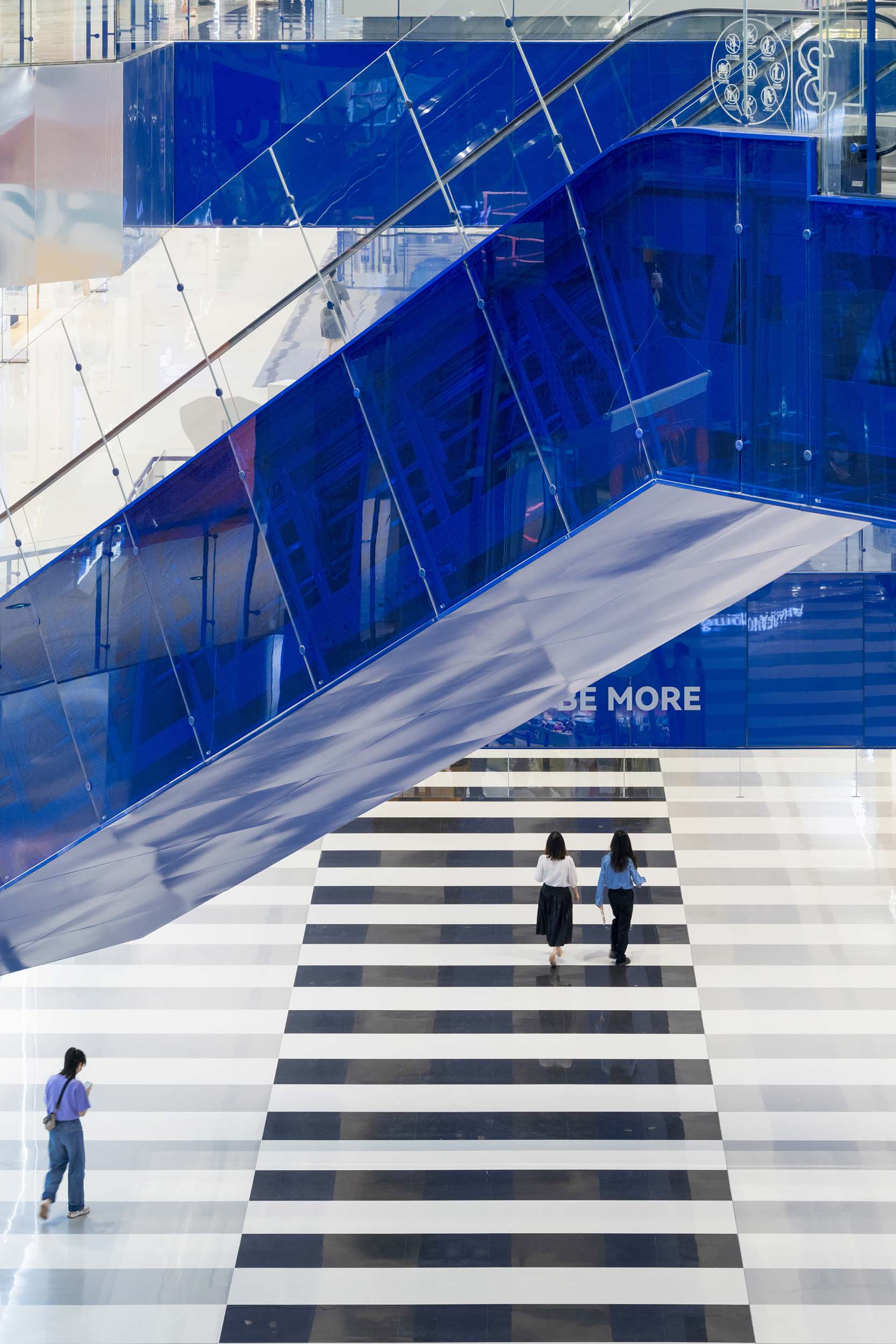 A Playful Urban Journey: CapitaMall Skyview’s Streetscape An interior streetscape is designed to evoke the feeling of exploring a vibrant urban environment. As visitors navigate the mall’s interconnected levels, they encounter a variety of engaging elements that create a playful and immersive experience. Inspired by Chongqing’s cinematic qualities, CLOU reinterprets this unique spatial experience, inviting visitors to navigate a colourful, interconnected environment that feels like a natural extension of Chongqing’s streetscape. The striking contrast between the blue signs and their monochrome surroundings shapes the architectural identity of CapitaMall Skyview, blending urban nostalgia with contemporary vibrancy.