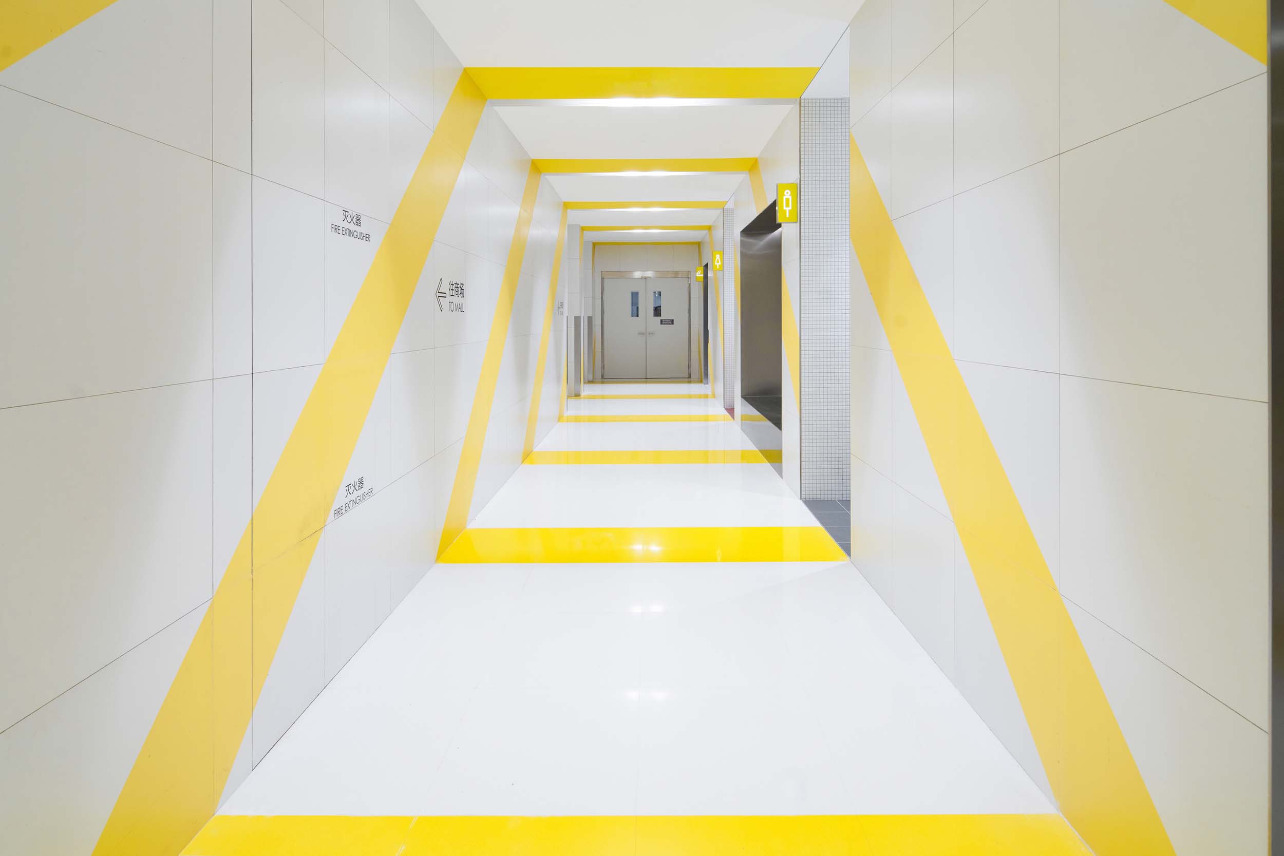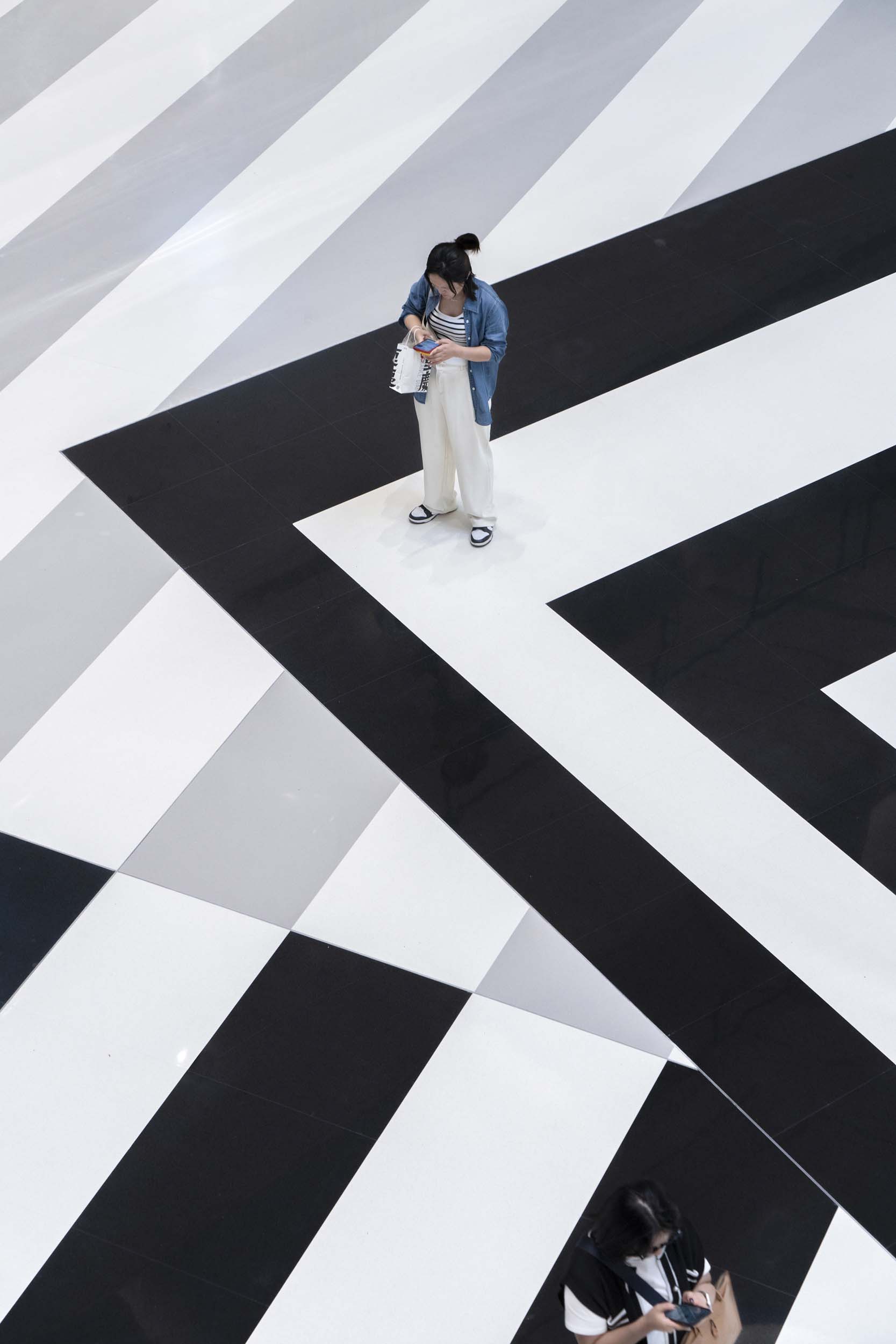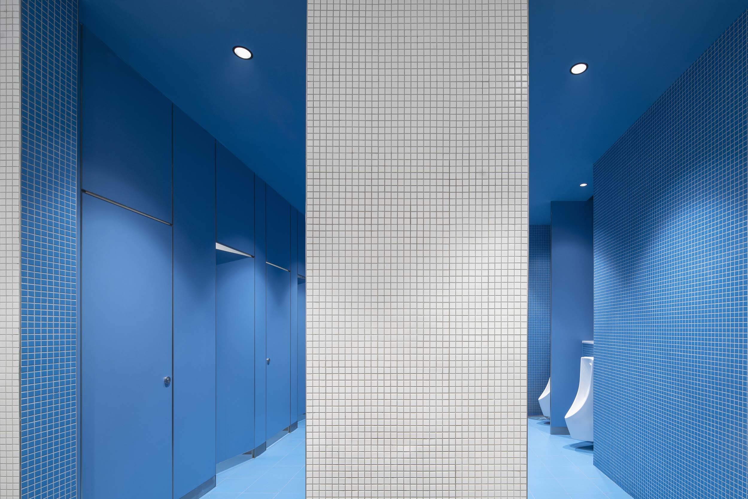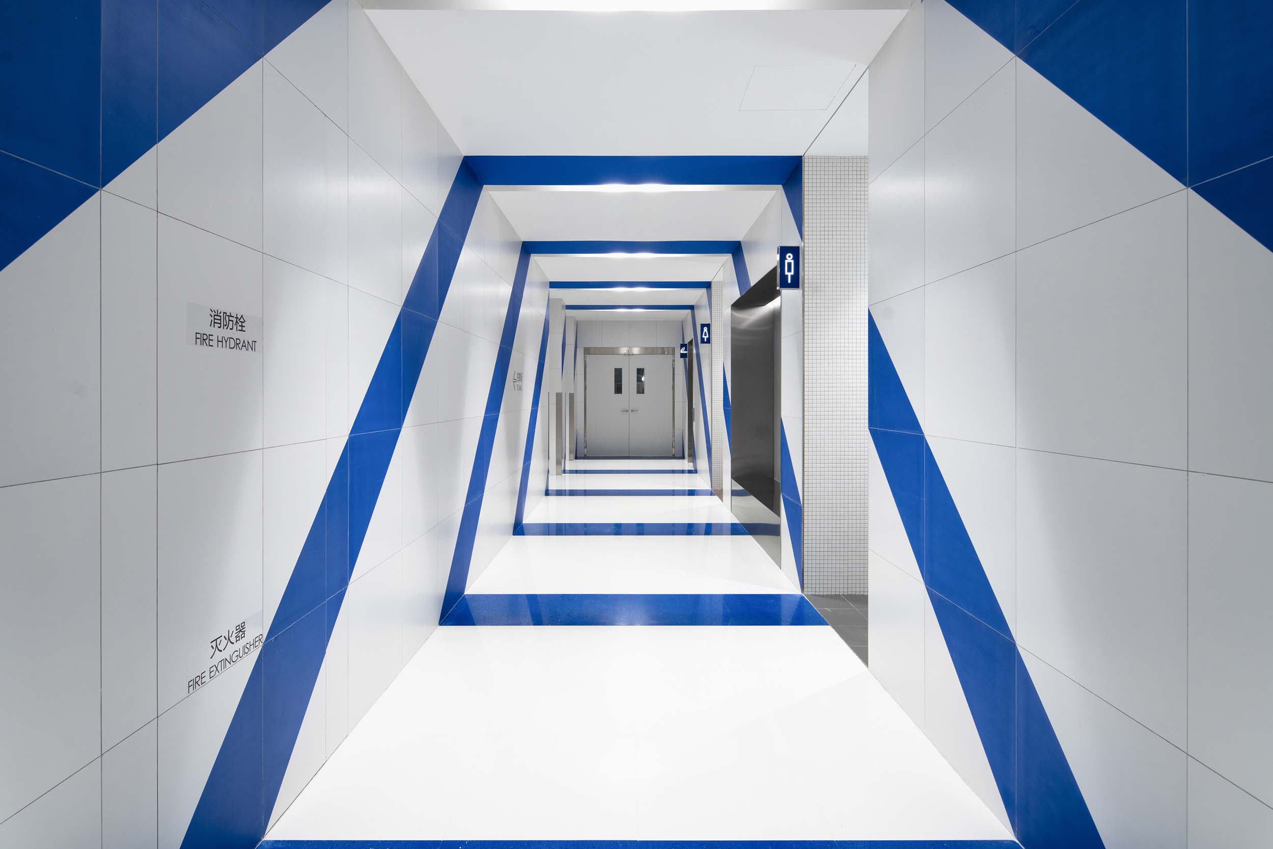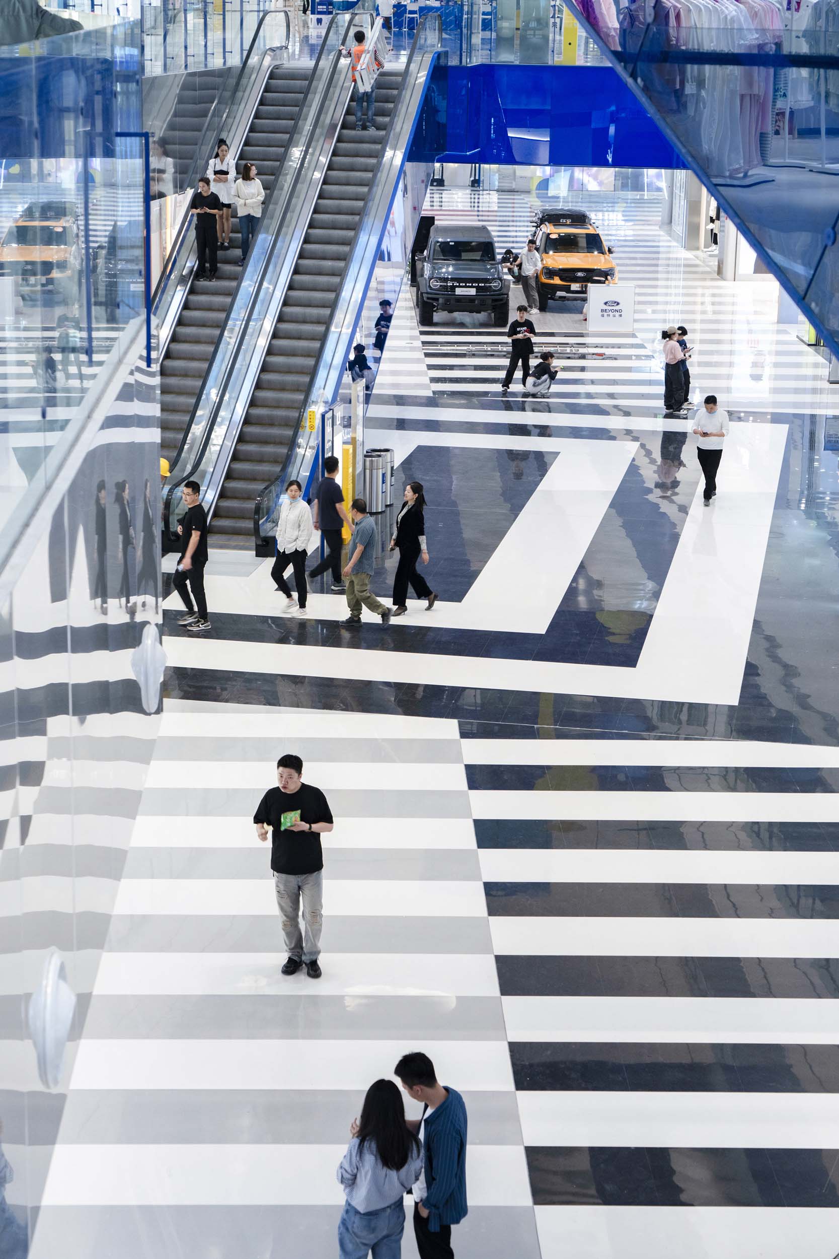 A Playful Urban Journey: CapitaMall Skyview’s Streetscape An interior streetscape is designed to evoke the feeling of exploring a vibrant urban environment. As visitors navigate the mall’s interconnected levels, they encounter a variety of engaging elements that create a playful and immersive experience. Inspired by Chongqing’s cinematic qualities, CLOU reinterprets this unique spatial experience, inviting visitors to navigate a colourful, interconnected environment that feels like a natural extension of Chongqing’s streetscape. The striking contrast between the blue signs and their monochrome surroundings shapes the architectural identity of CapitaMall Skyview, blending urban nostalgia with contemporary vibrancy.
