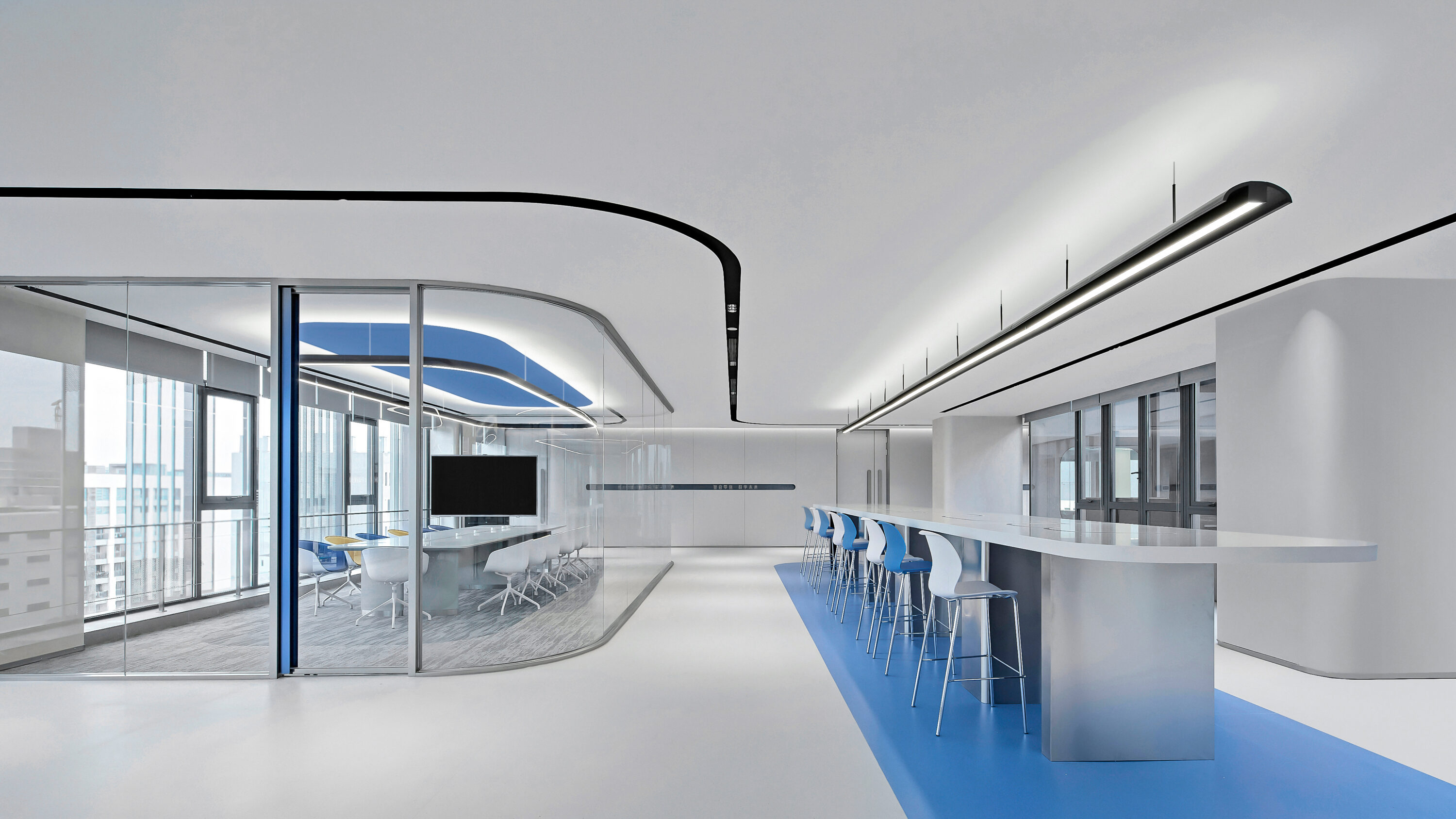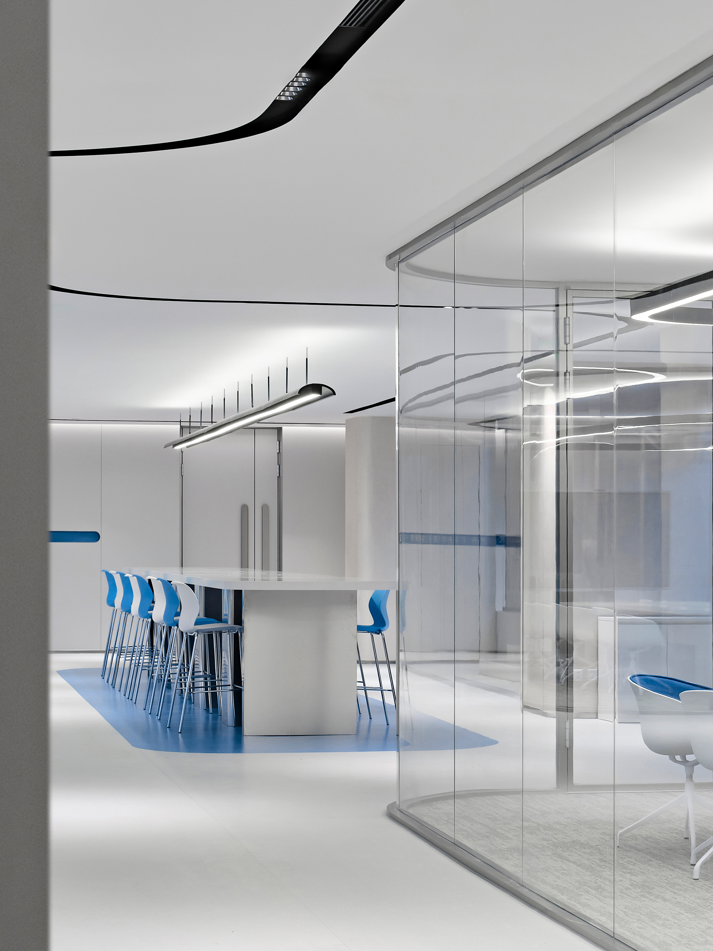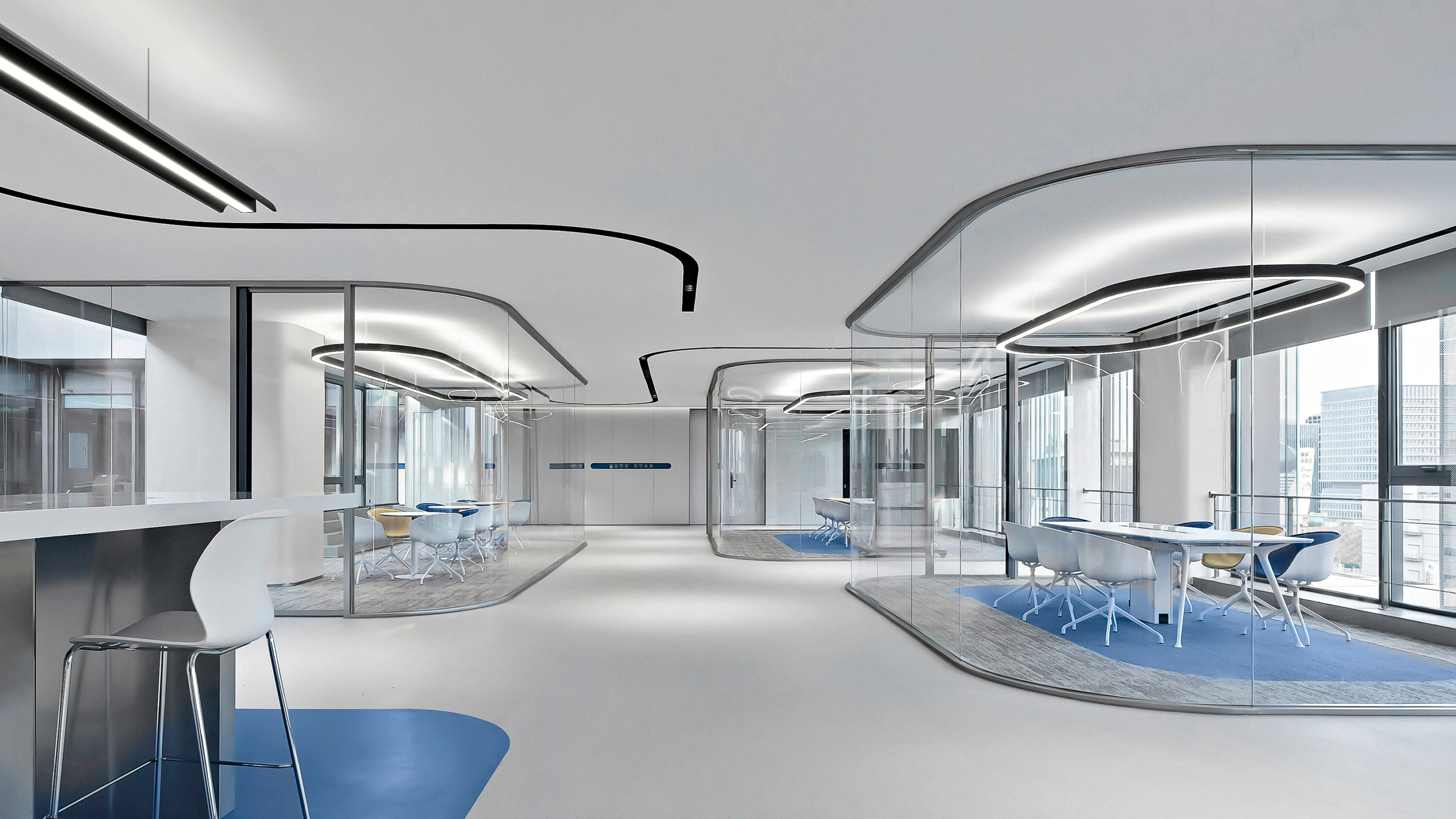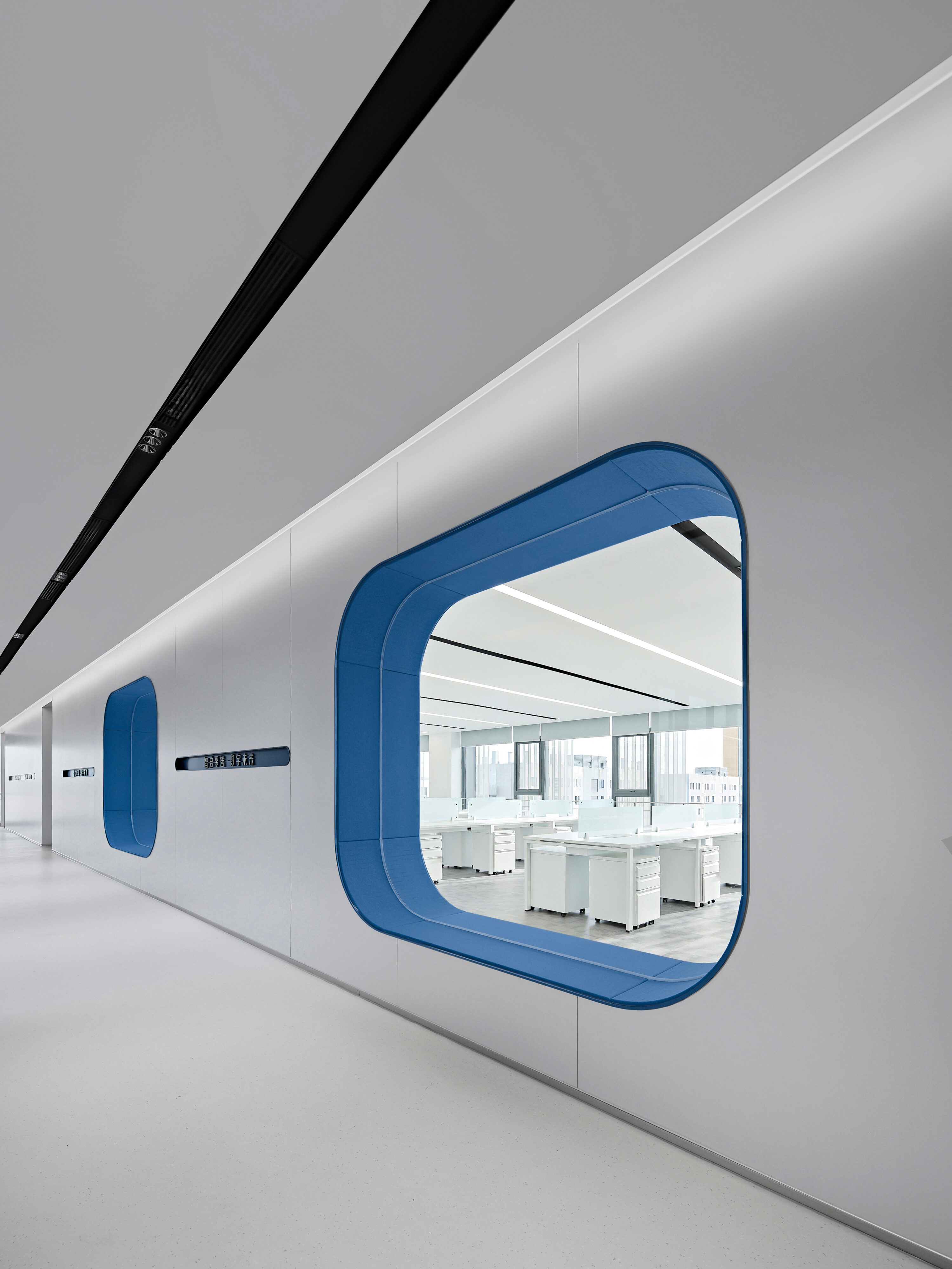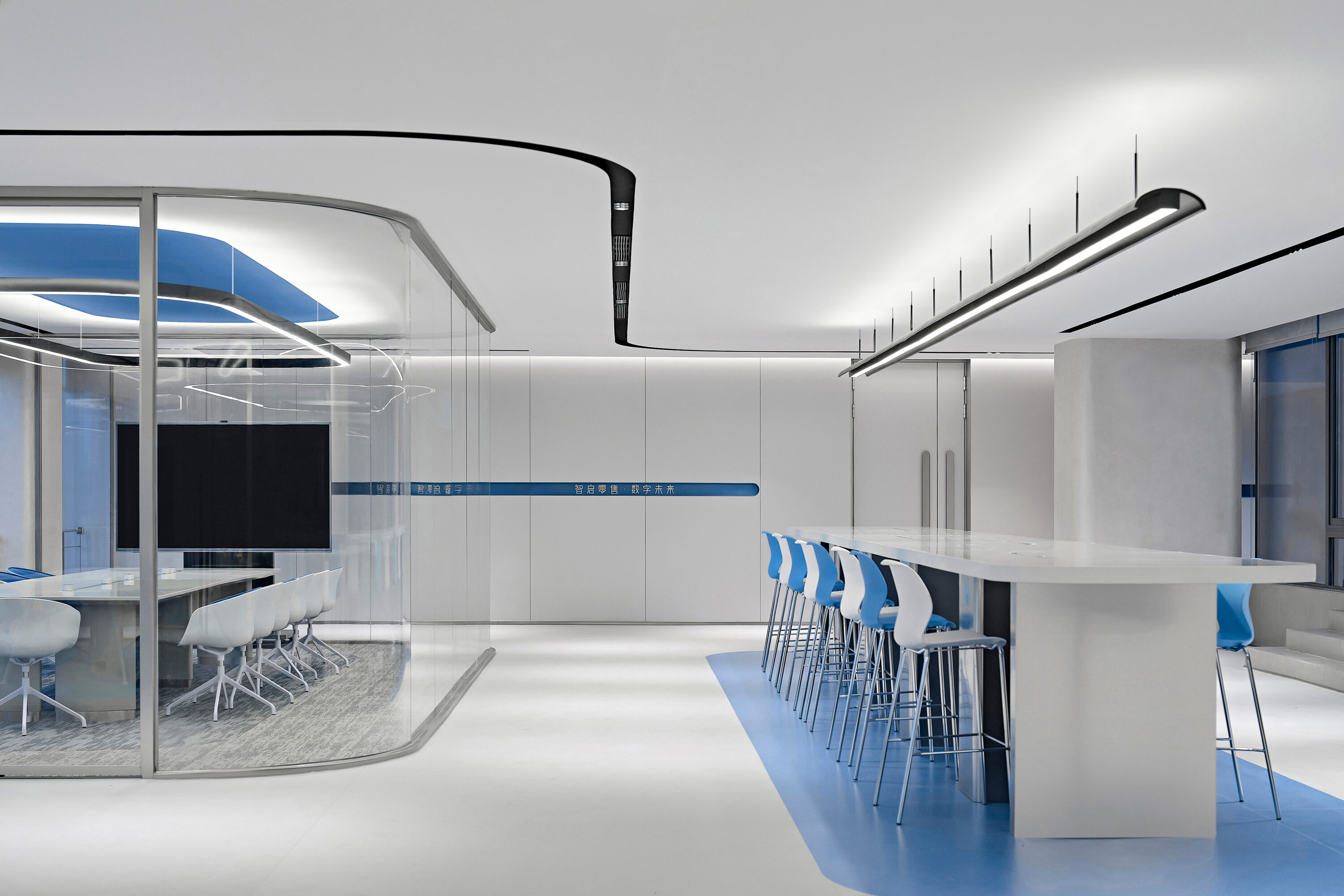 Electronic shelf label are an important window to the global market for Hanshow. The “Window to the Future” derived from electronic shelf label products is the spatial symbol that presents the office space, which can also be perceived in the refined geometric relationship of the Hanshow Logo. Window to the Future interprets various rounded rectangles in space, becoming a display interface for corporate culture, a medium for connecting different areas, and a series of furniture in the interior scenes.