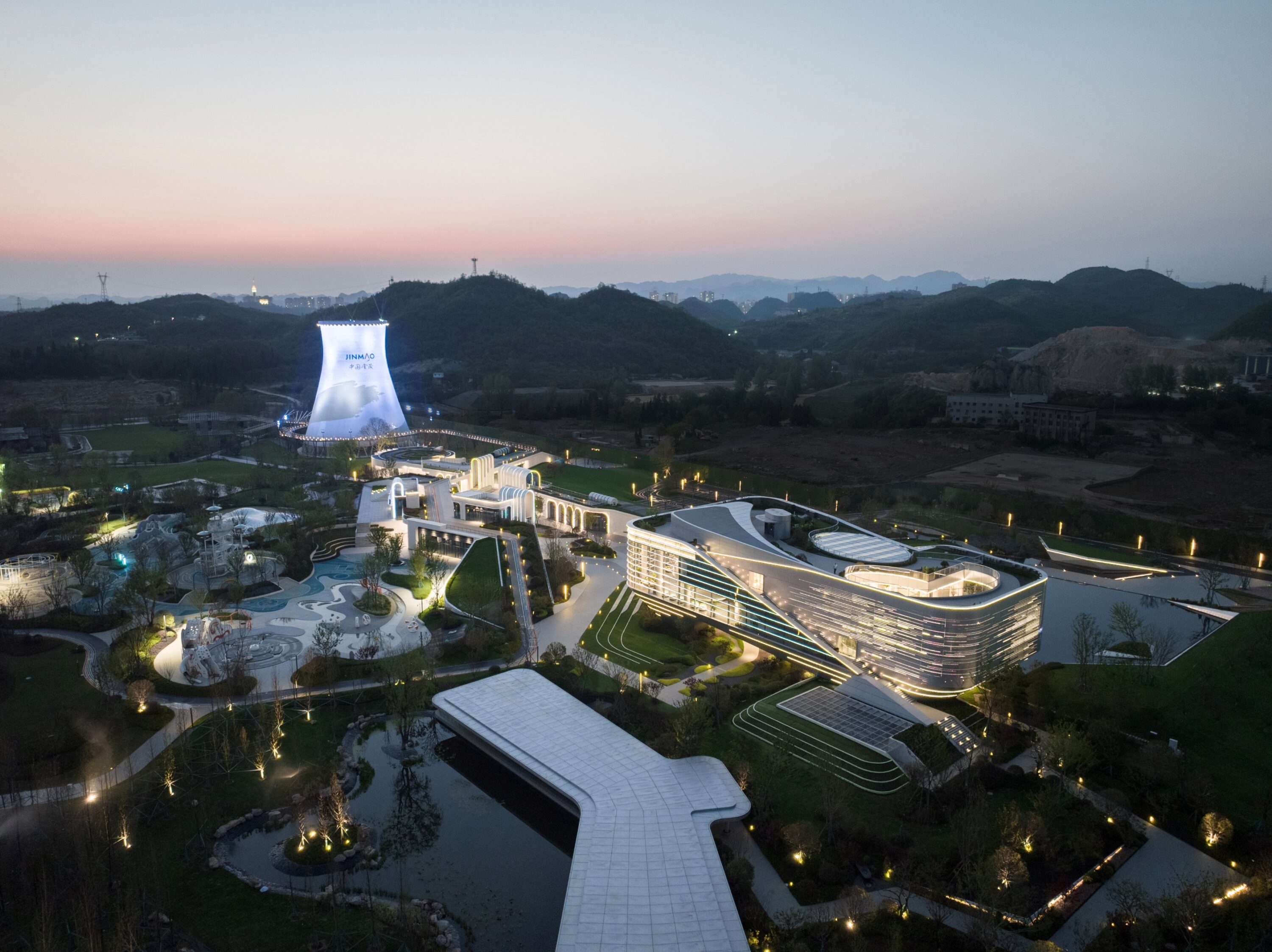 As the first project in the new district, the Guiyang Jinmao Crystal Smart New City Fan Exhibition Area has become a new living demonstration area in Guiyang New City. The city exhibition hall adopts the most minimalist form, with the meaning of “infinite star ship” as the starting point to drive the new city to “take off”. The eastern part of the exhibition hall is modeled after the unique Kashgar landform, creating an outdoor courtyard with a water moon cave. It falls from the rooftop garden, forming a rich interstellar space experience hall. The commercial area fully integrates architecture and landscape by combining the original terrain, using landscape design techniques. The design inspiration for the commercial facade comes from the shuttle orbit and the portal of time and space, using different combinations of arches to construct different themed facades.