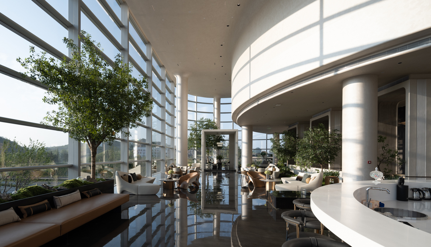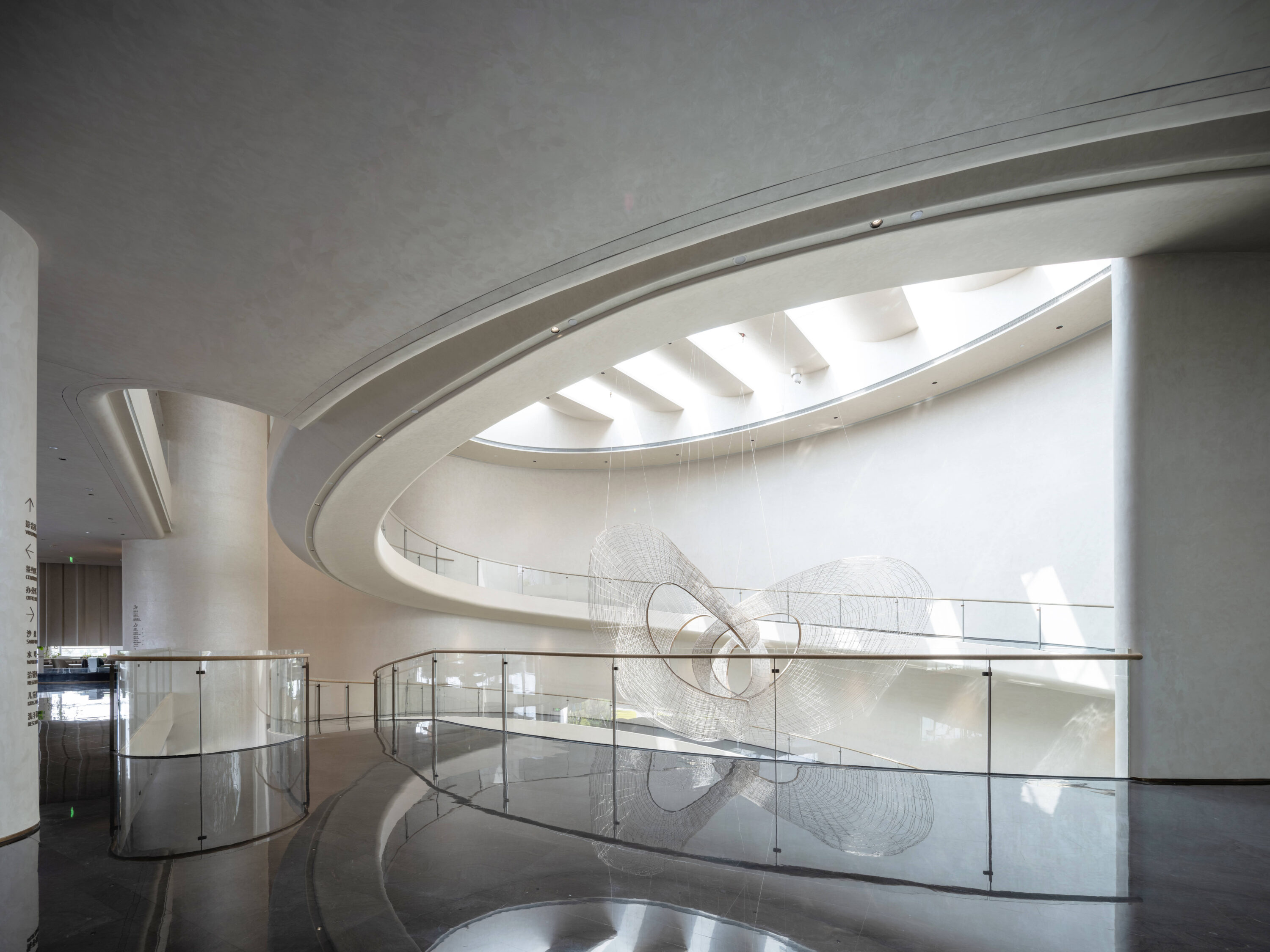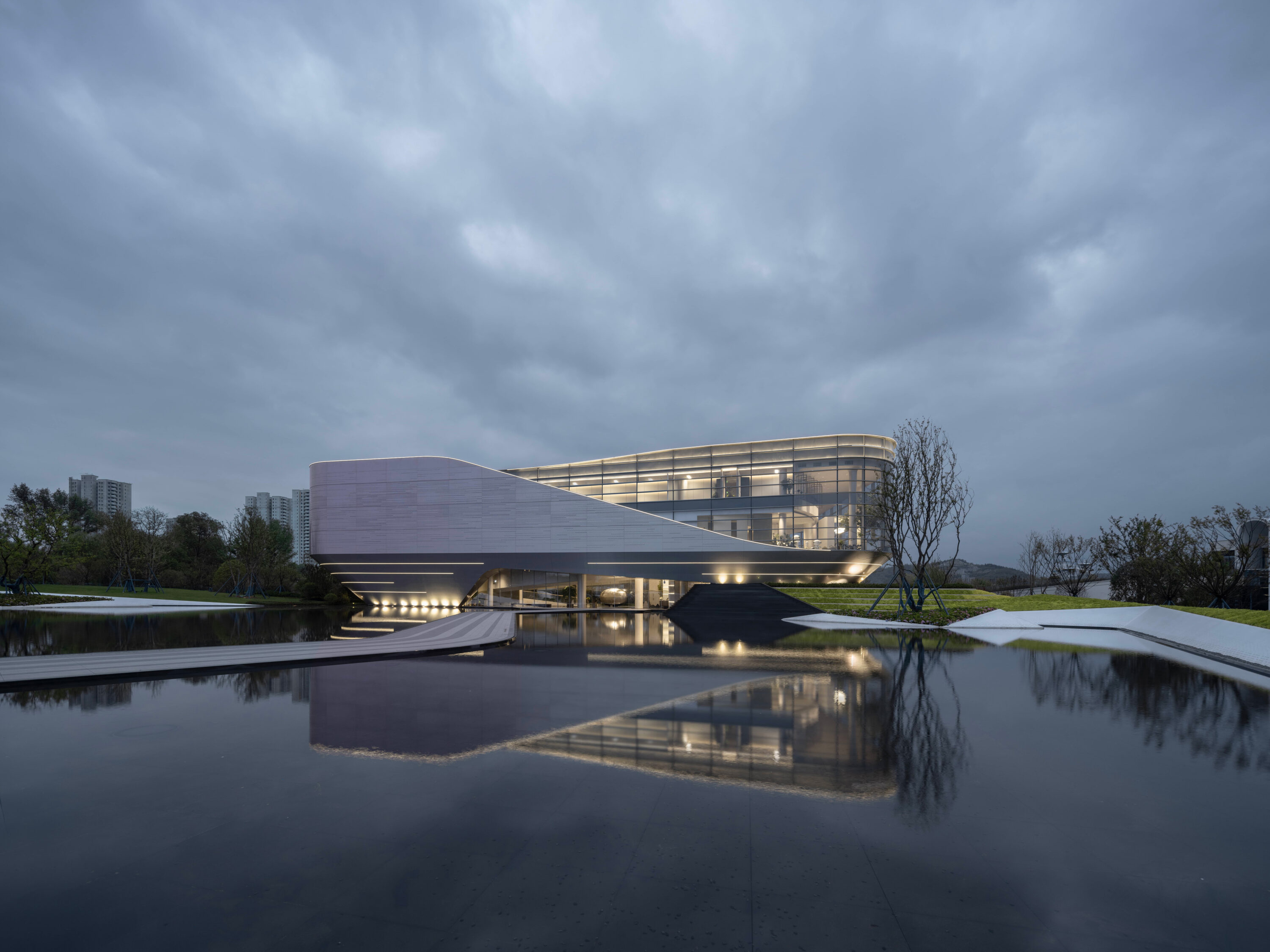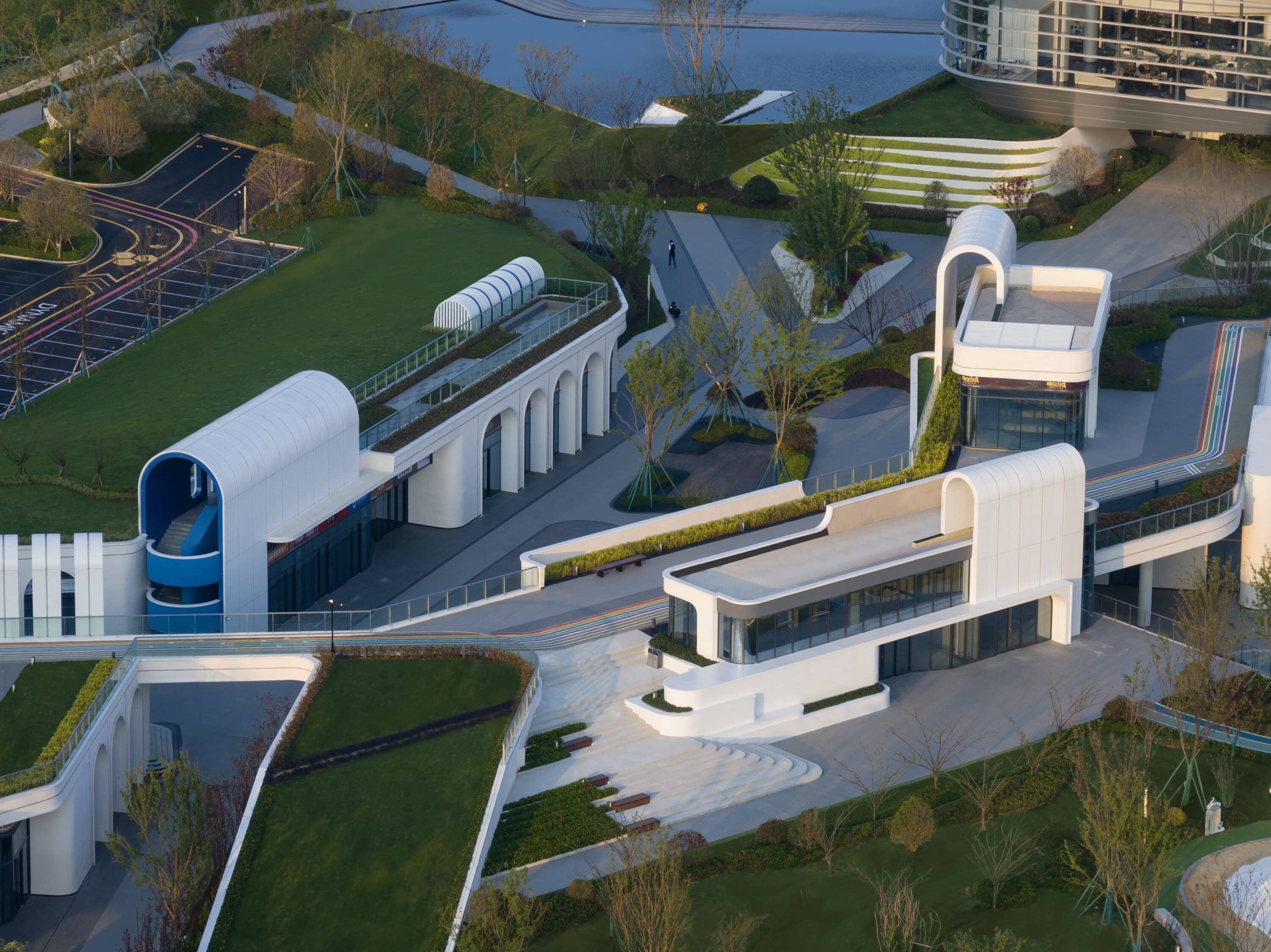 As the first project in the new district, the Guiyang Jinmao Crystal Smart New City Fan Exhibition Area has become a new living demonstration area in Guiyang New City. The city exhibition hall adopts the most minimalist form, with the meaning of “infinite star ship” as the starting point to drive the new city to “take off”. The eastern part of the exhibition hall is modeled after the unique Kashgar landform, creating an outdoor courtyard with a water moon cave. It falls from the rooftop garden, forming a rich interstellar space experience hall. The commercial area fully integrates architecture and landscape by combining the original terrain, using landscape design techniques. The design inspiration for the commercial facade comes from the shuttle orbit and the portal of time and space, using different combinations of arches to construct different themed facades.