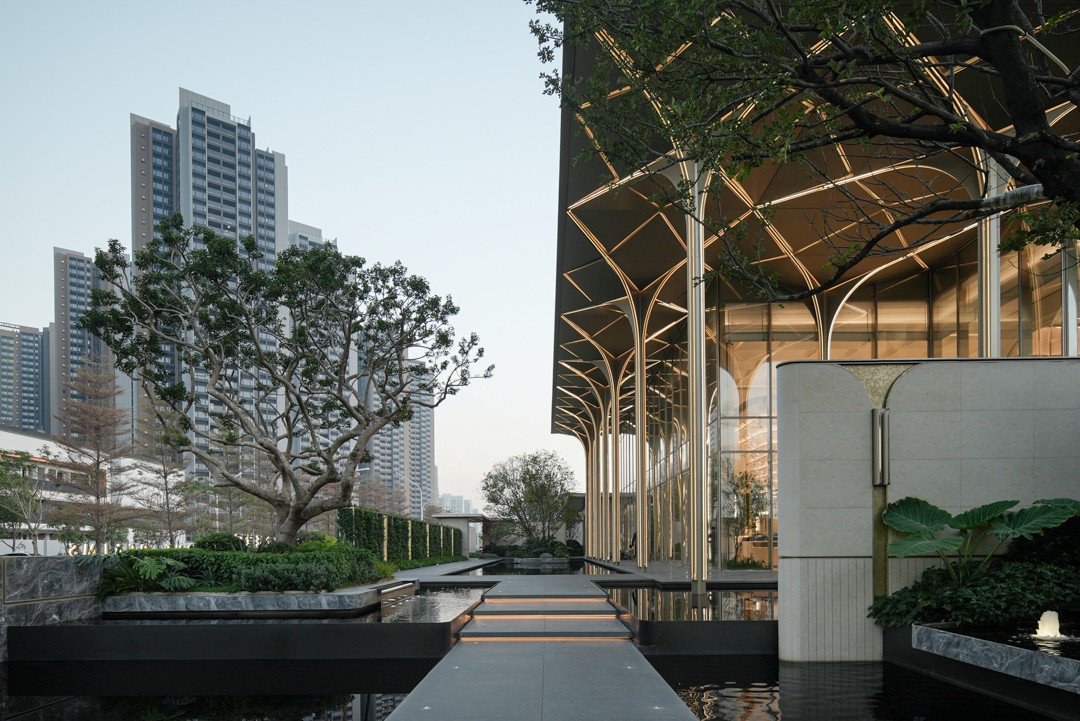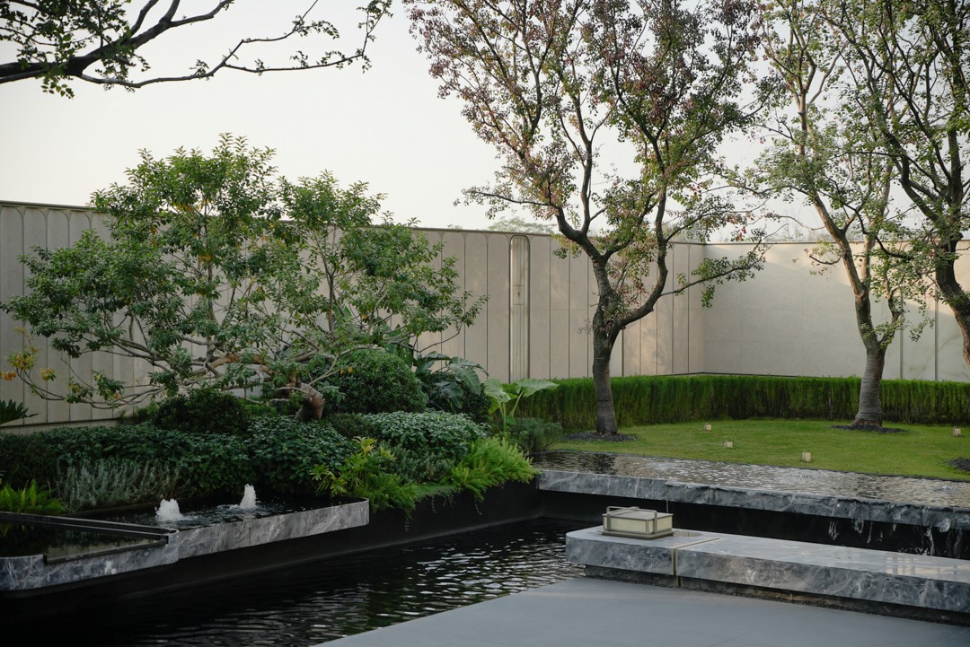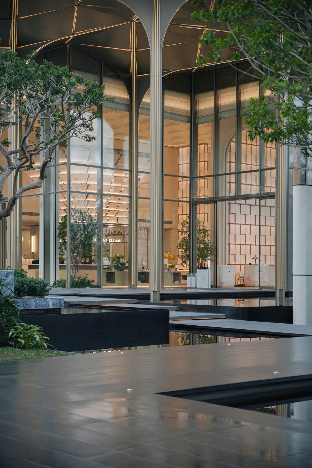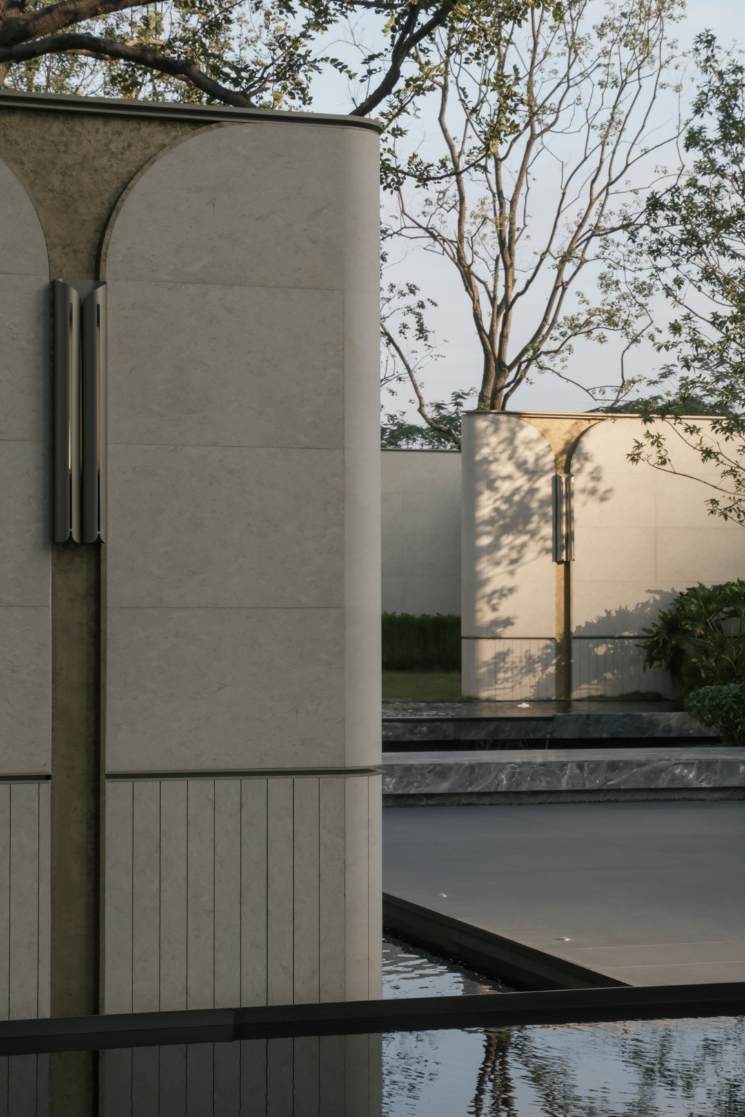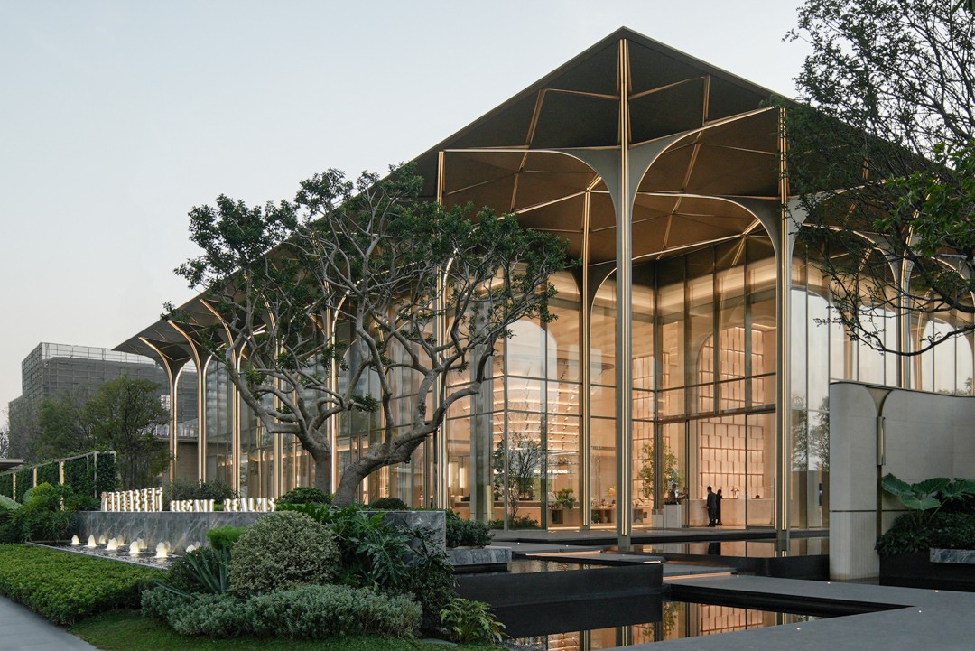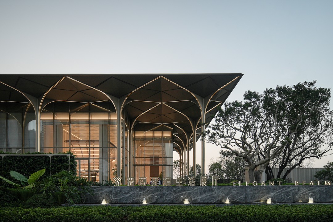The core design concept of this project is to create a future living experience pavilion with multiple experiences through the progressive creation of spatial sequences. The welcoming entrance is set off by the champagne gold high dome of the building. The metal with rounded corners and the agate beige scenery wall collide and reflect each other, highlighting the meticulous craftsmanship. Walking along the water, the water reflects the dome, and the characteristic paving echoes the dome elements. The tree pools and flower beds are scattered in a patchwork, and the blue-gray plants create an elegant plant atmosphere. The axis water feature and the array of Chinese tallow trees float above the water, reflected on the translucent marble and elegant beige scenery wall. Strolling here, one’s steps are light, enjoying the beauty of life