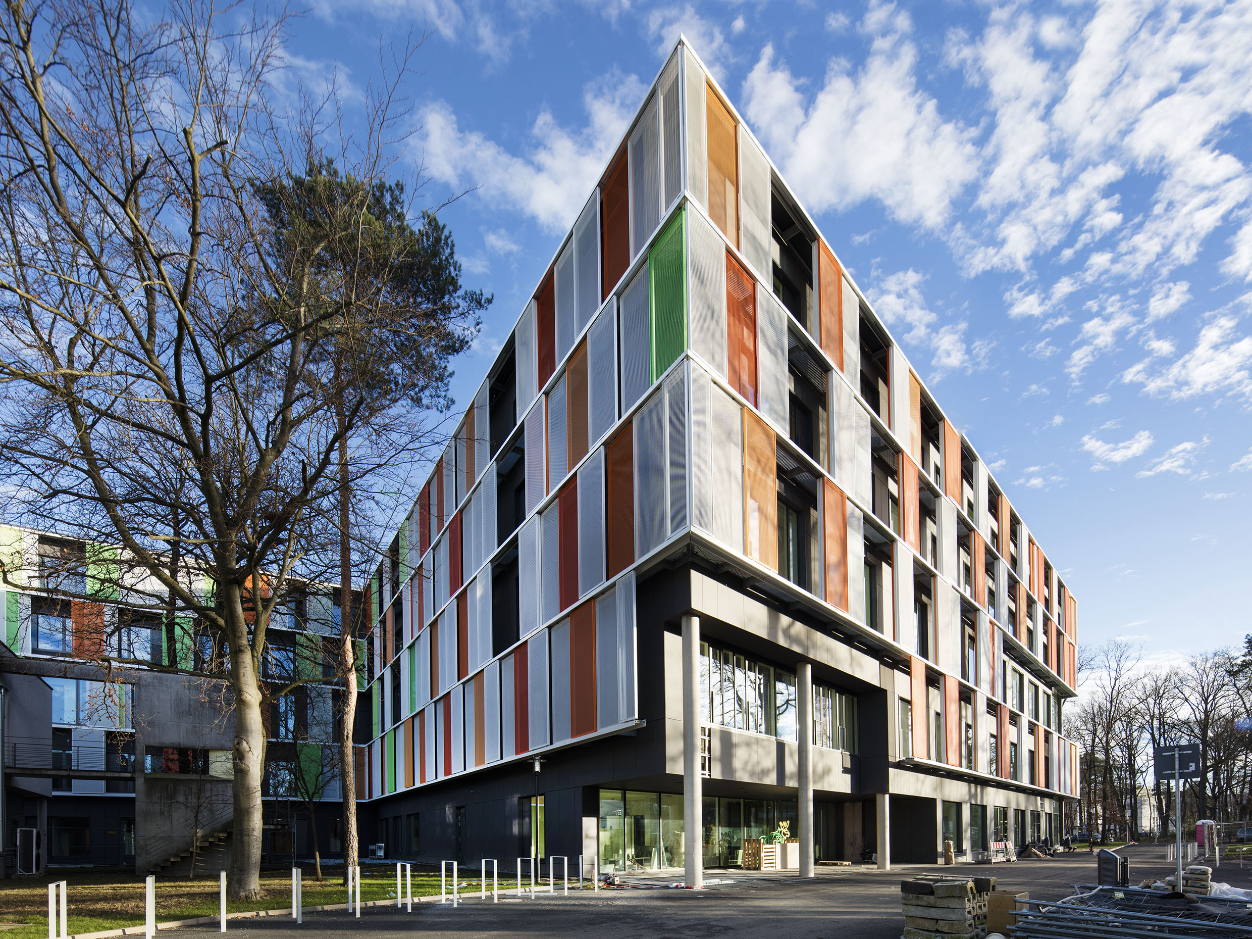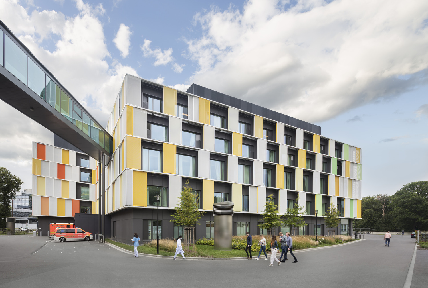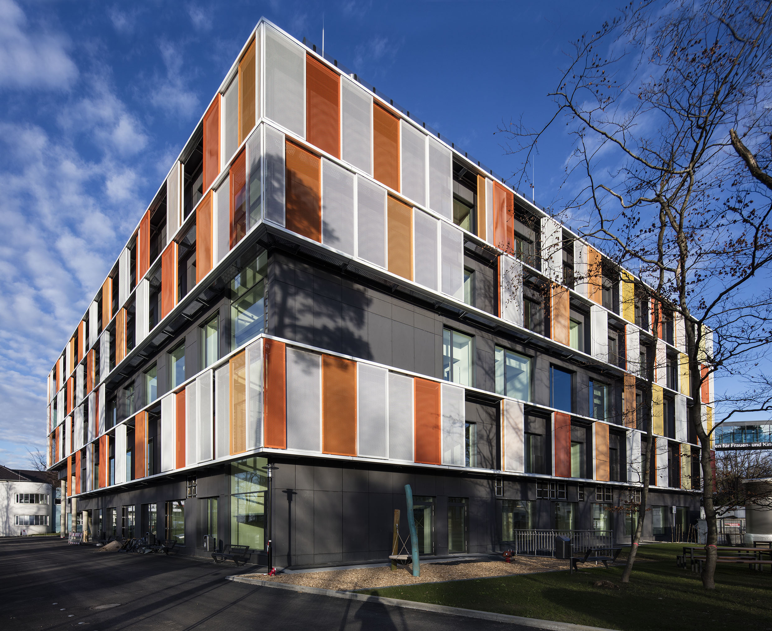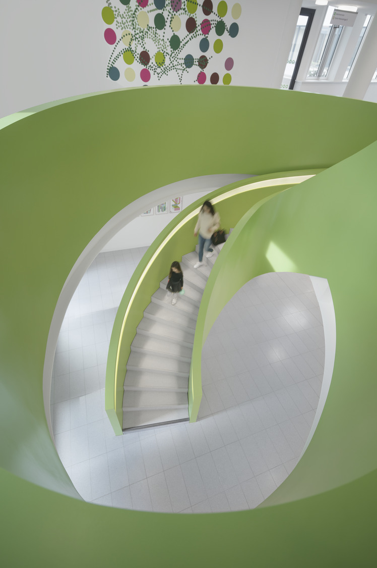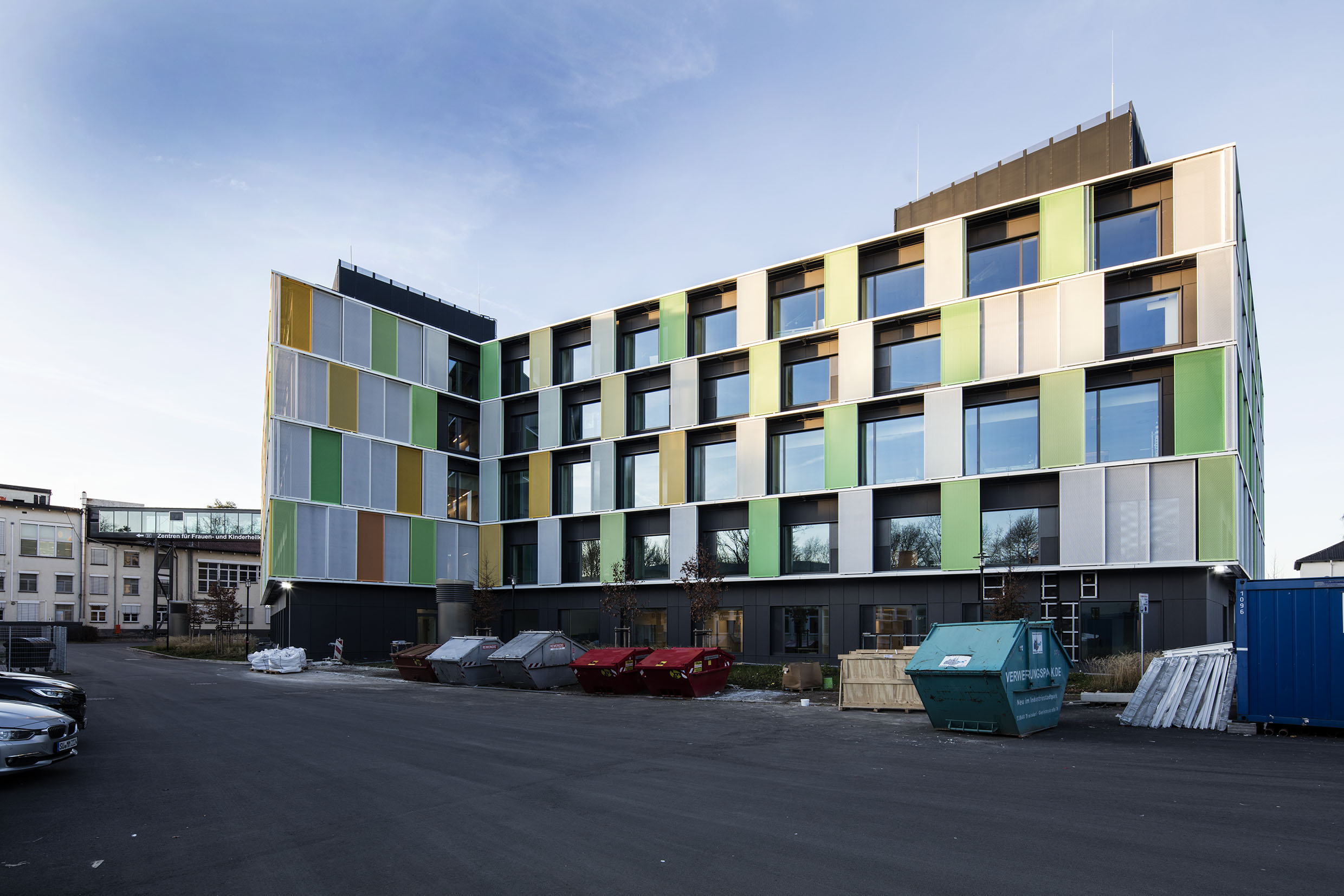 The Parent-Child Center of the Bonn University Hospital is located in an oasis in Venusberg, next to the Bonn University Medical Center. The initial idea was to create a new, harmonized and functionally independent building in both spaces. The themes of vitality and health are expressed in a clear and modern architectural language, characterized by a lively, dynamic and bright architecture.