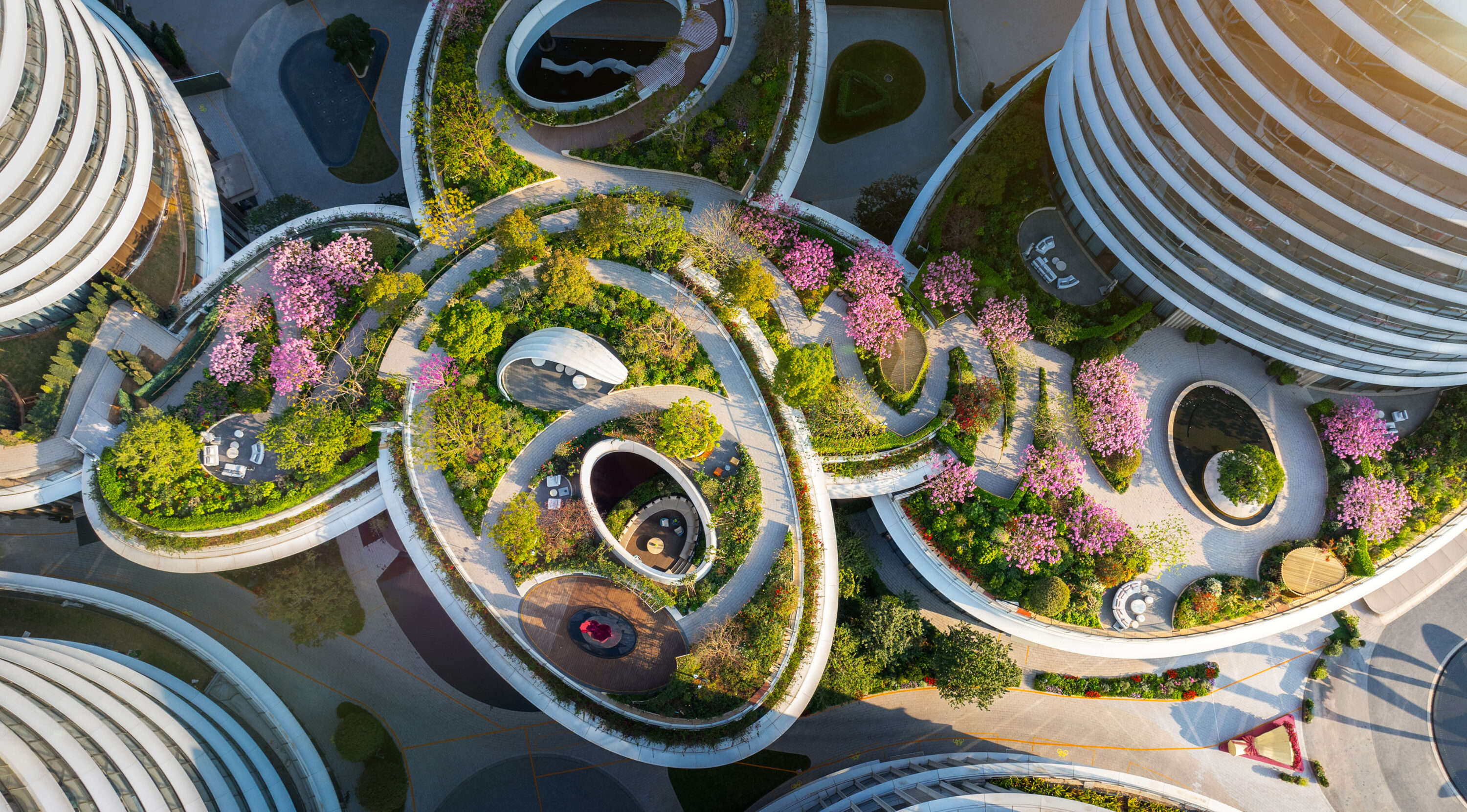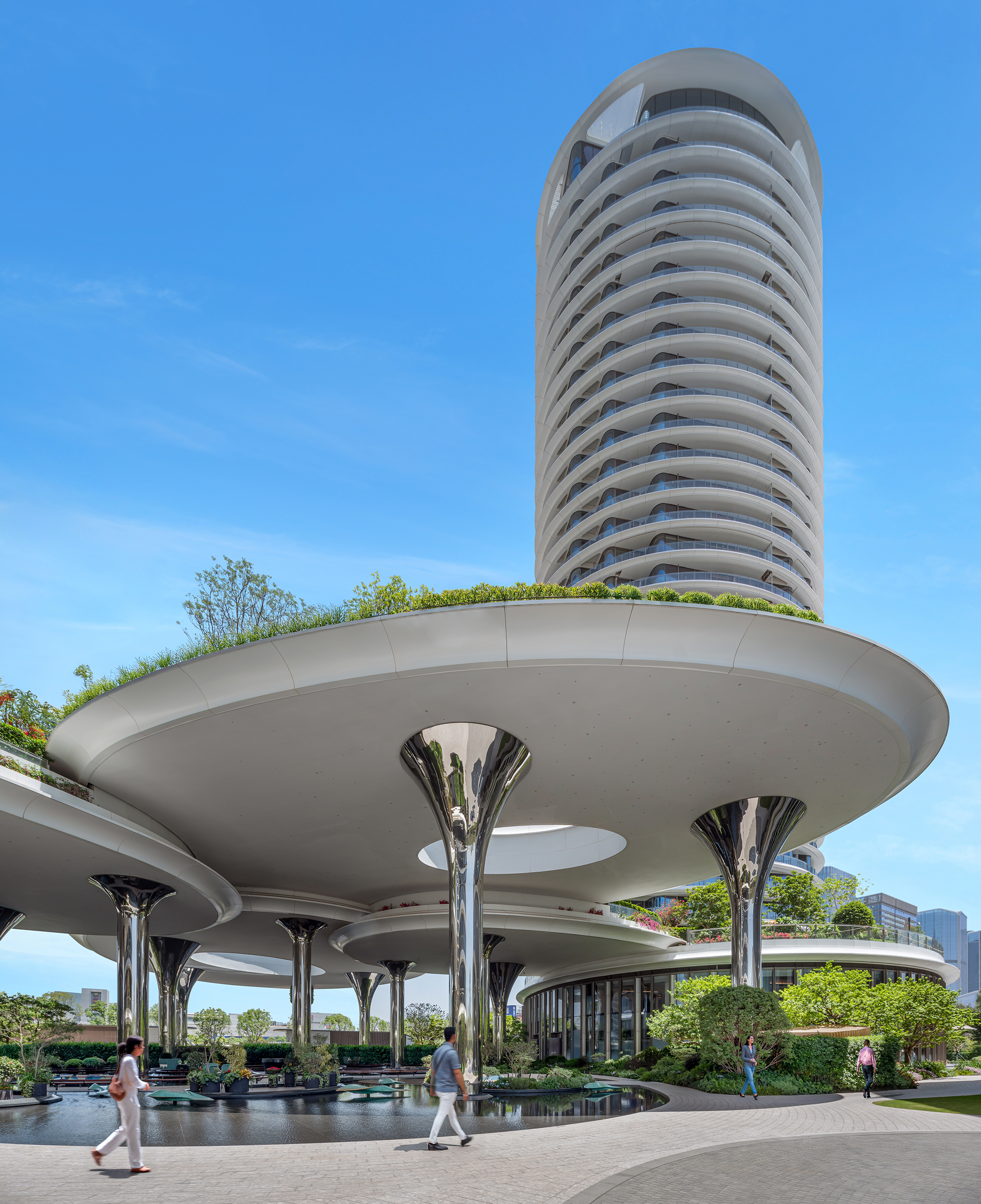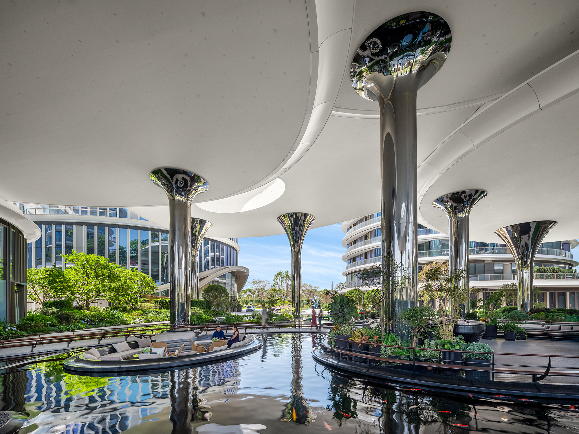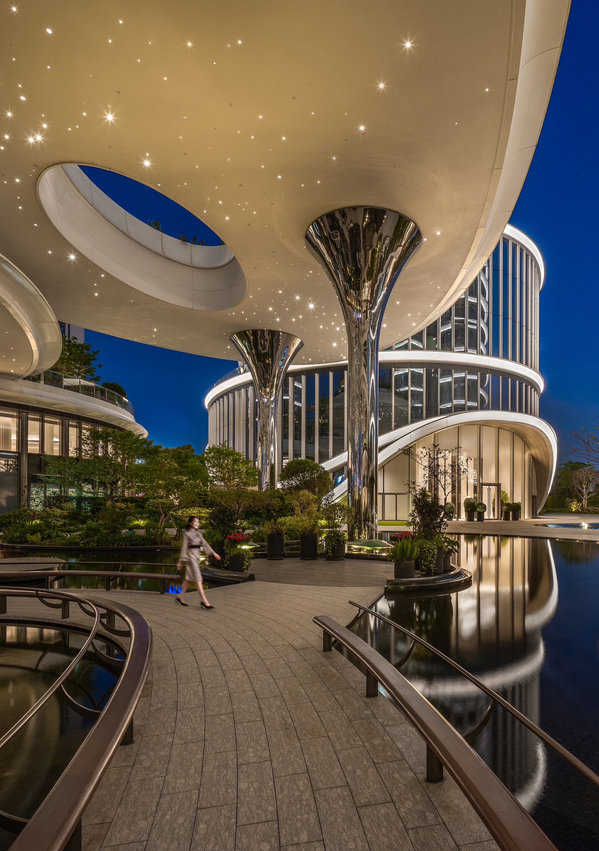 其亲生物景观强化了海绵城市设计,融入透水铺装、本土植物及雨水管理系统。建筑以椭圆形外观呼应河流蜿蜒,优化观景视野。