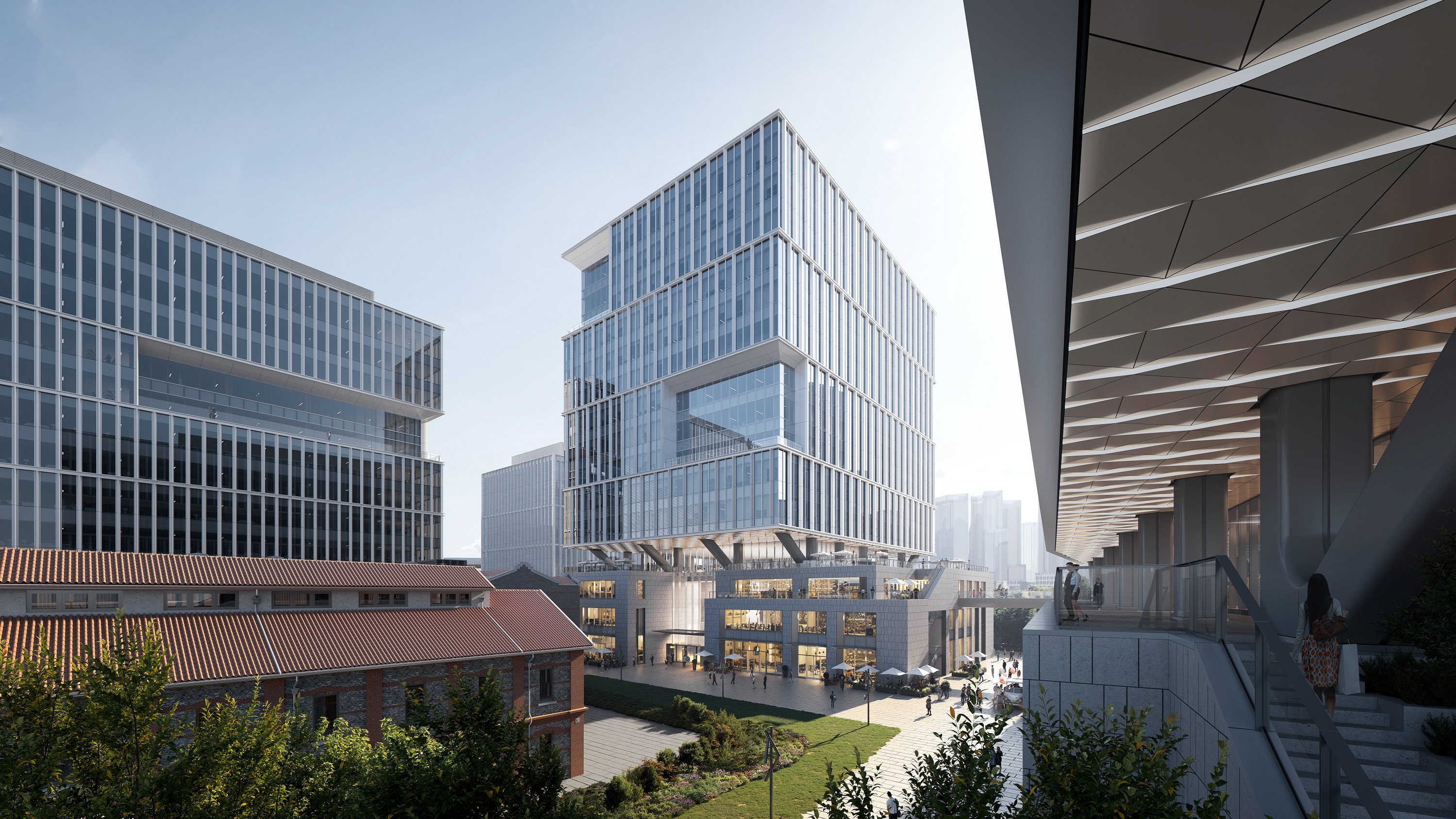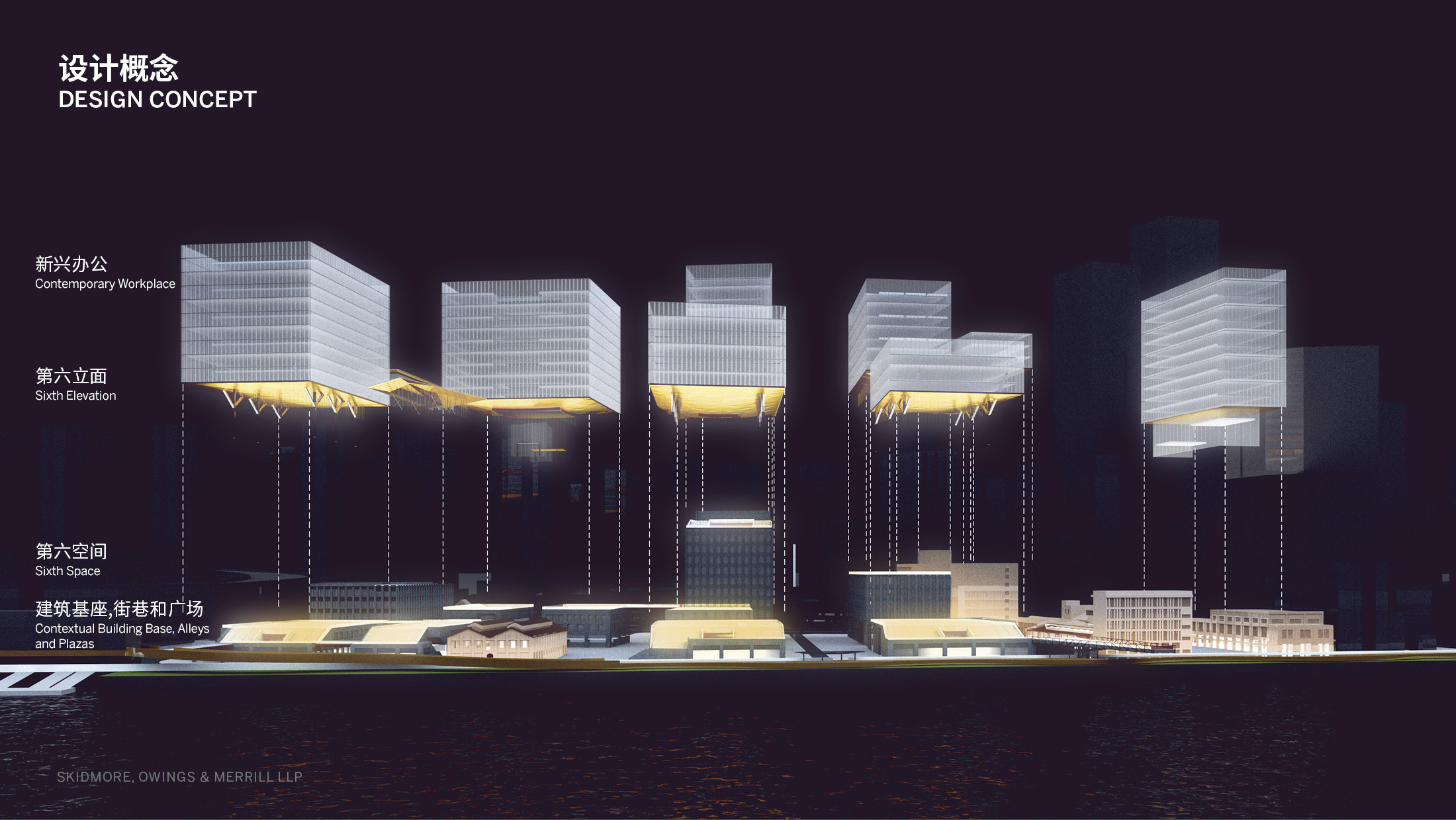 SOM’s design for the South Bund Financial Center envisions a dynamic renewal of one of the last remaining areas along the South Bund that has not yet been redeveloped. At this key location, just north of the landmark Nanpu Bridge, and with connections to the river promenade, the South Bund Financial Center is poised to become a thriving part of Shanghai’s contemporary riverfront. In contrast to other redevelopment projects in Shanghai, our masterplan strikes a careful and intentional balance between historic preservation and new construction. The plan aims to retain and preserve historic buildings, while floating new office buildings above them—creating a dynamic mix of uses that will realize the area’s potential to become a commercial and cultural destination. In this way, the project offers a compelling model for how to preserve and redevelop historic industrial sites throughout China.