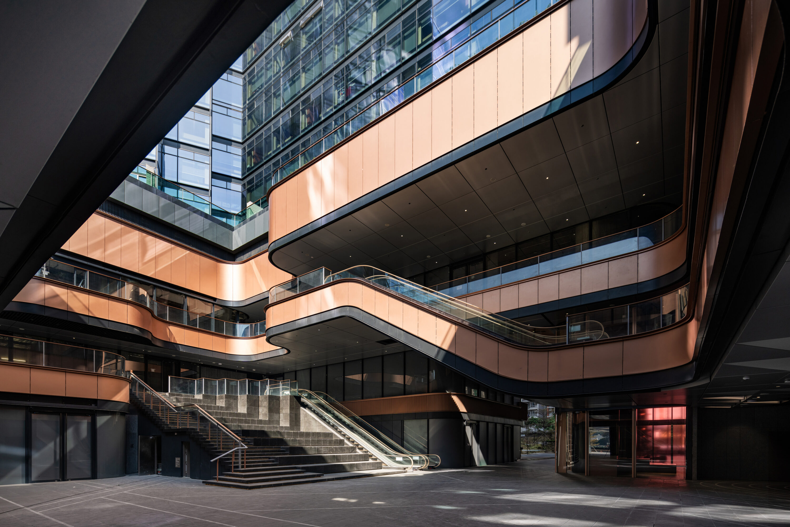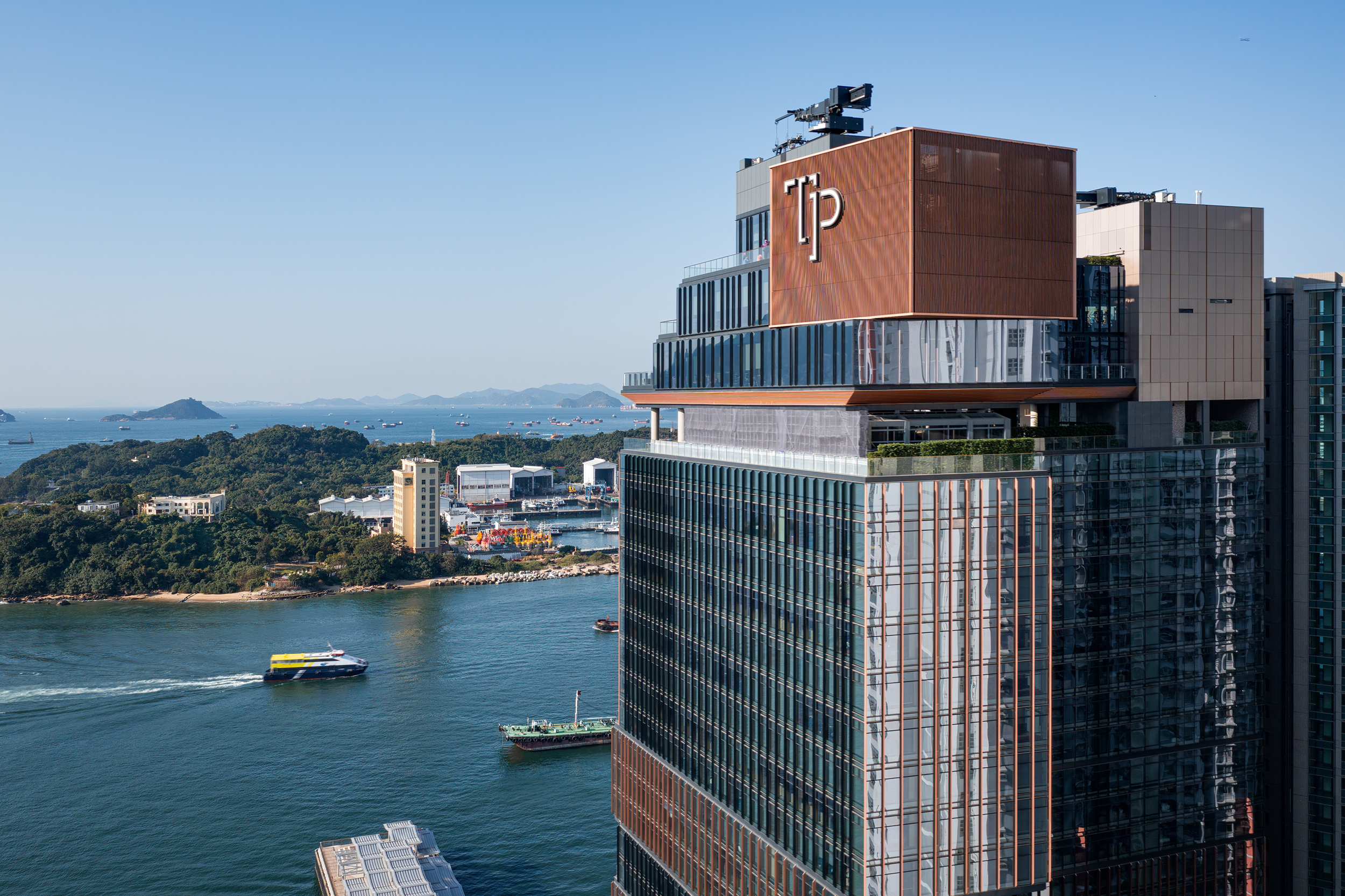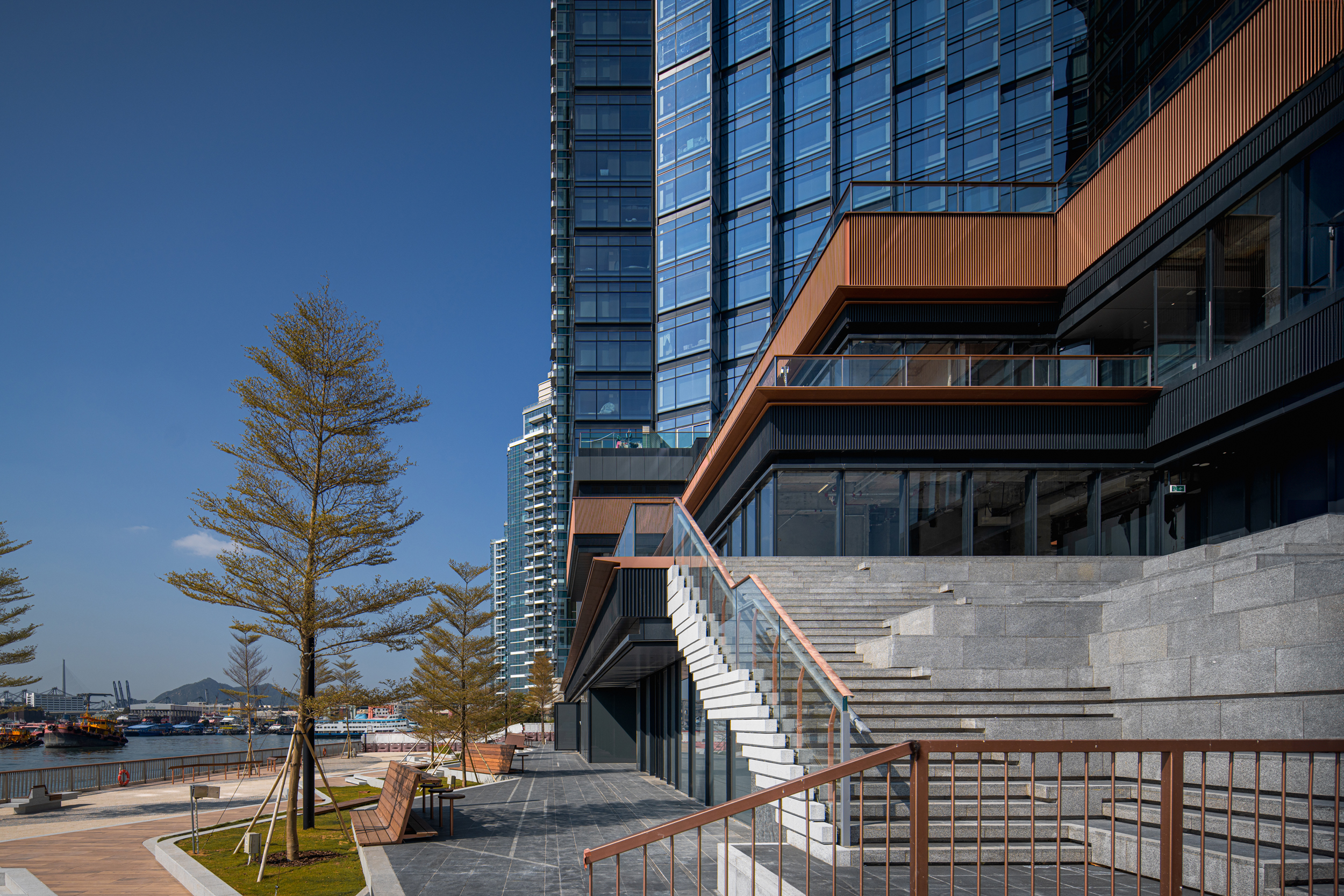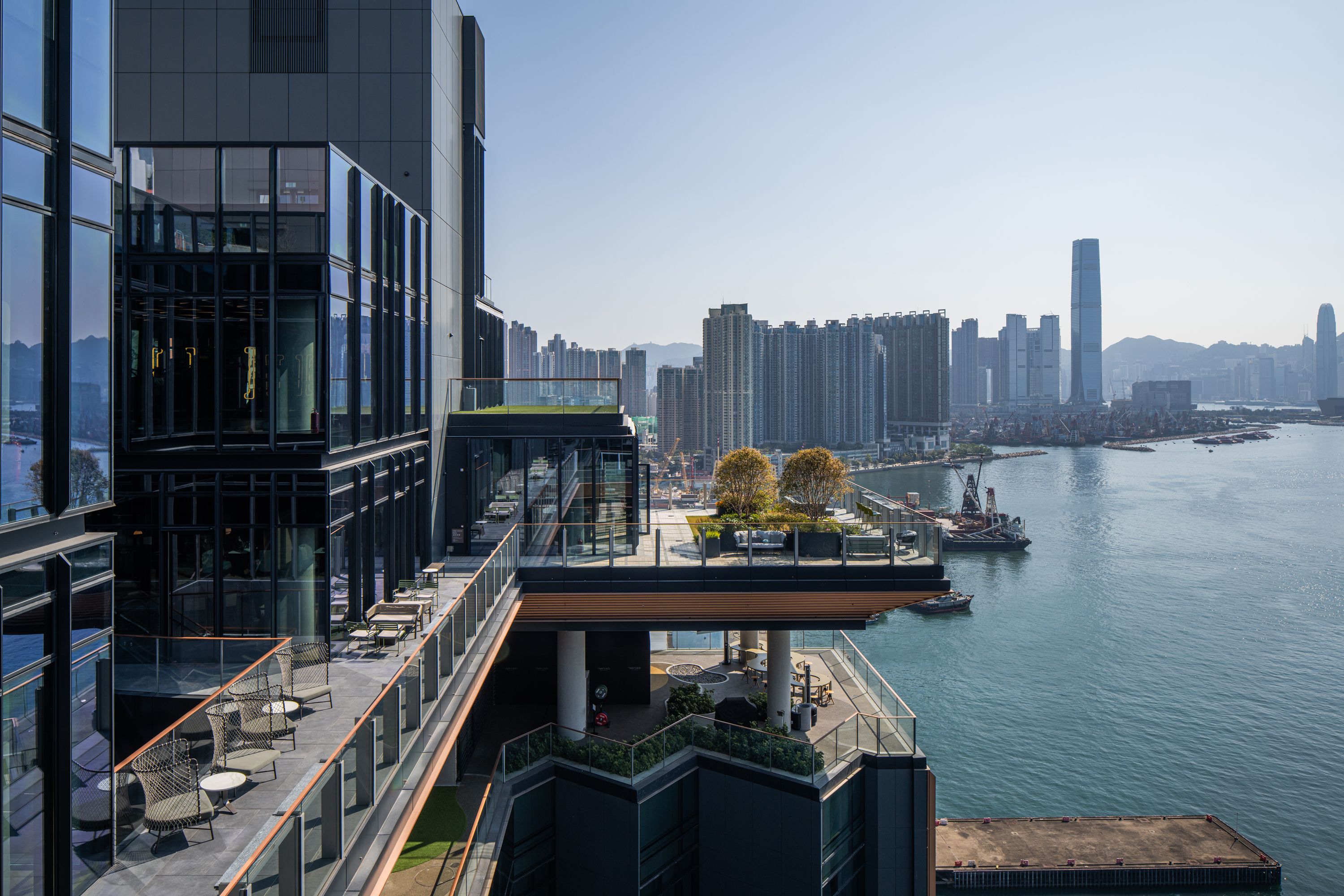 西九龙本舍是以海滨长廊概念设计的现代化租住式酒店,设有长短租酒店服务和休闲设施,营造互动社区氛围,提供工作室和1至3房单元,其独特的H形设计确保了全景海景,立面无缝融合玻璃面板与古铜色装饰条子,优化散热遮阳效果。本舍连接公共长廊和餐饮区,延伸到塔楼的绿化景观。高层的俱乐部展示一个郁郁葱葱的天空花园和多层露台,饱览维多利亚港美景。显著的屋顶特色成為城市景观中的独特地标,给予动态且令人向往的居住体验。