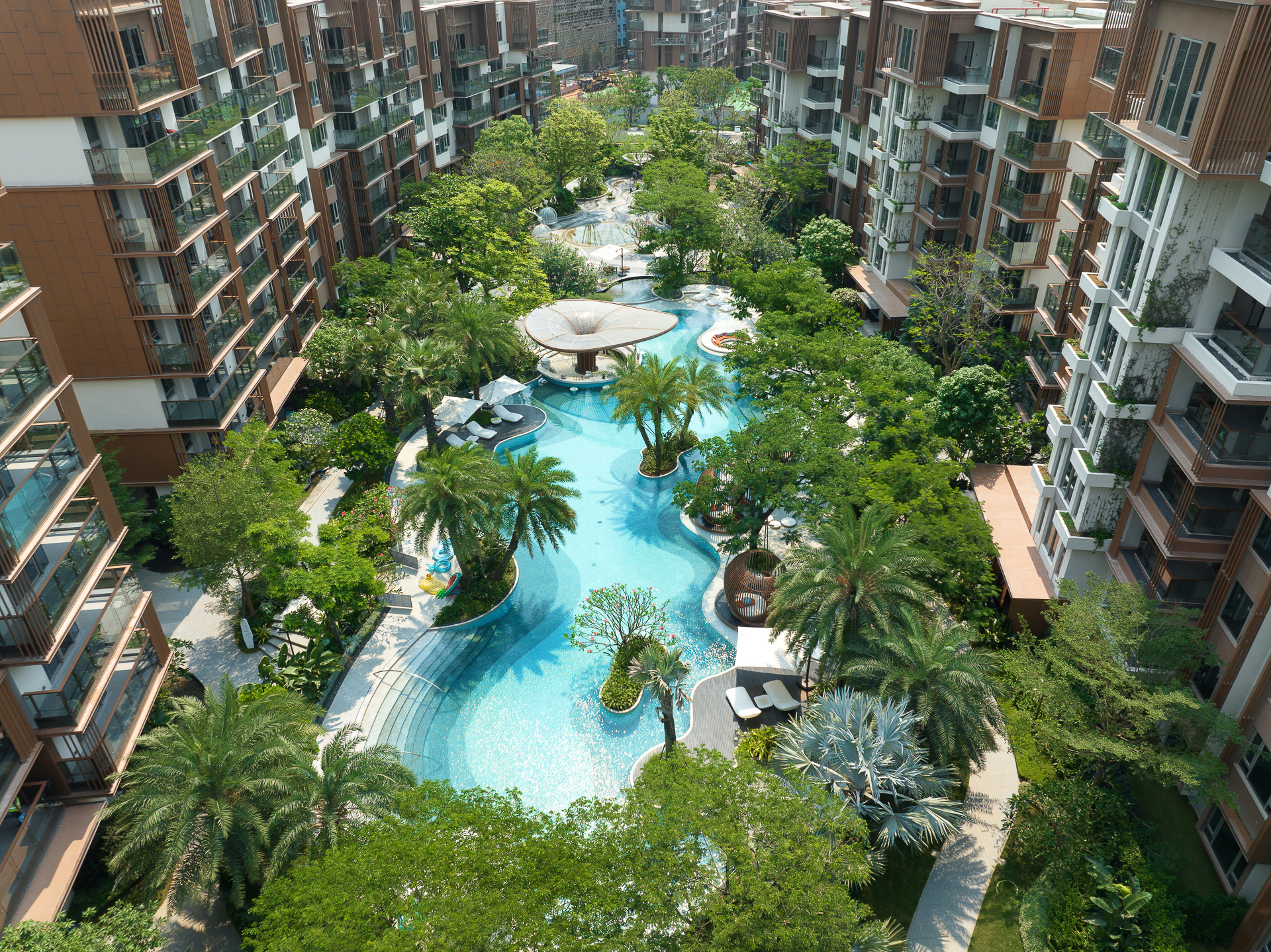 项目以“漂浮的绿洲”为设计概念,模拟自然,创造热带自然生态系统为基底,把热带风情,水的律动以及度假感受有机的结合起来。大环线功能链接整体规划,实现引水入城,临水而居的空间布局。建筑,绿地和水系交融共生。项目从艺术、在地、自然风貌各方面不断创新与突破,在特色植物空间的营造、在地艺术的符号表达以及社群场景的融入寻找切入点,打造兼具国际视野与本土特色的高端滨水住宅景观。