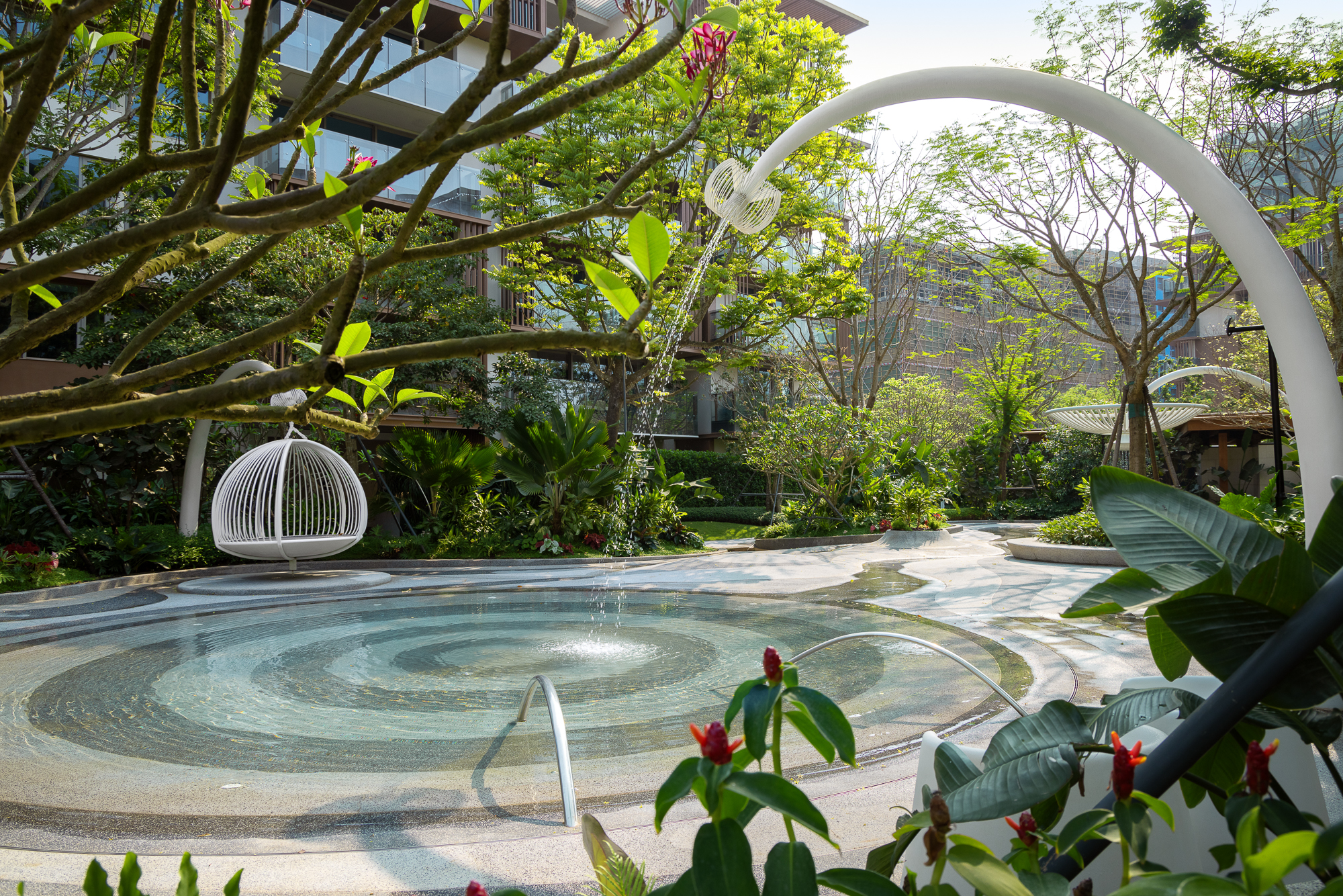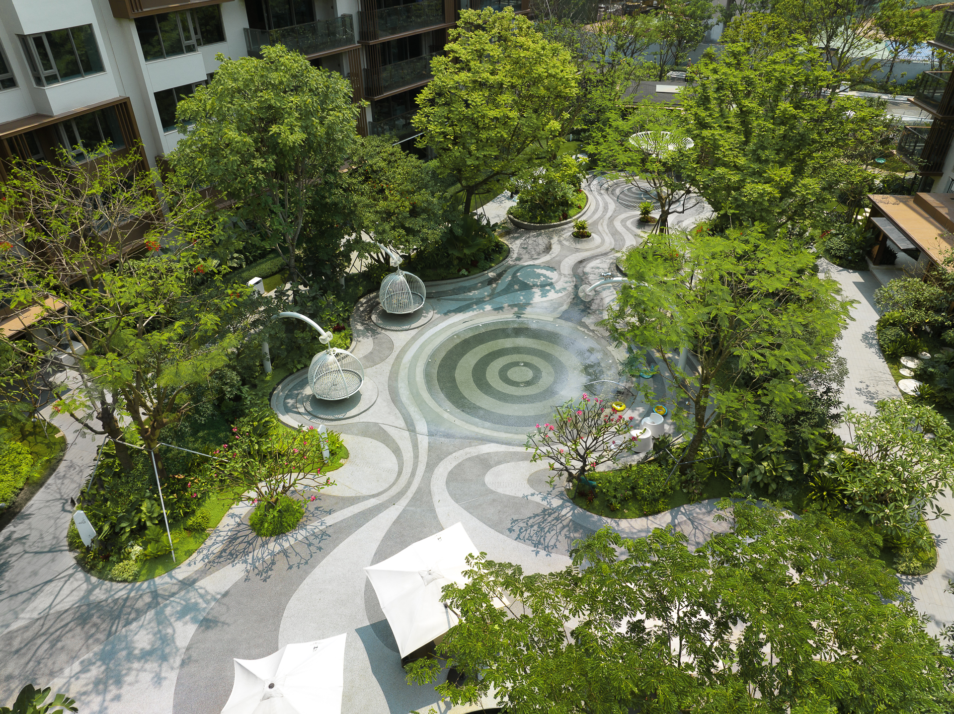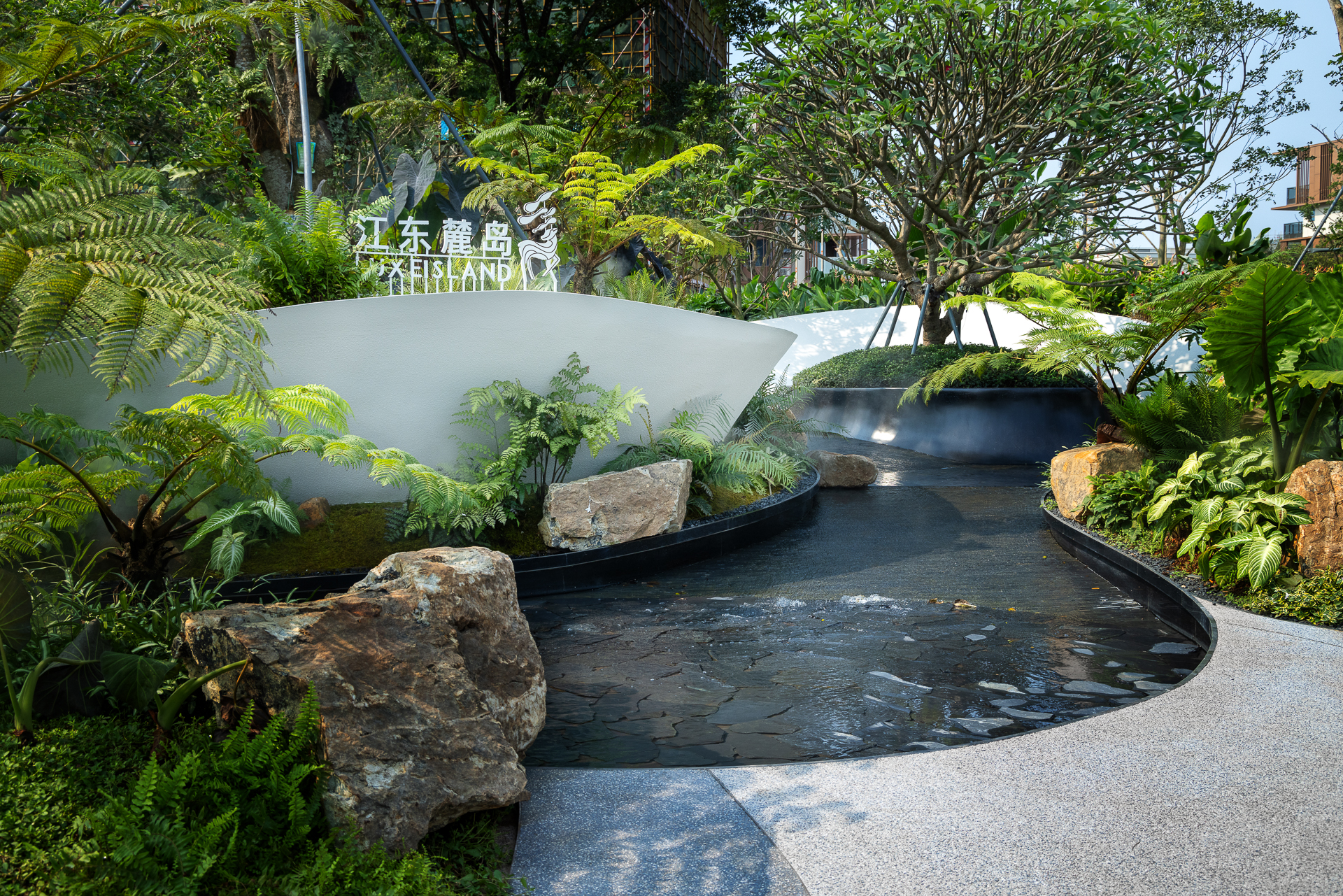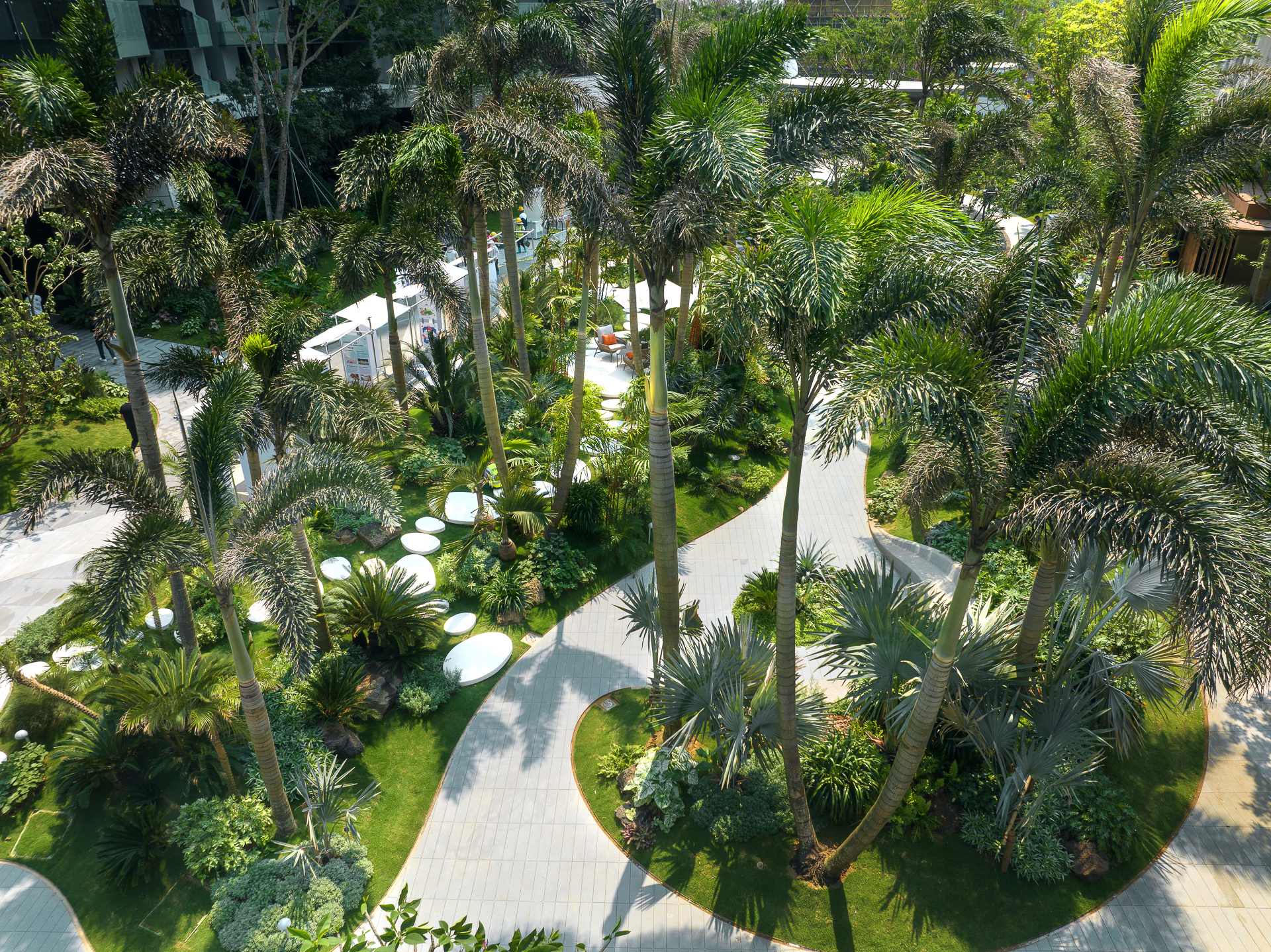 项目以“漂浮的绿洲”为设计概念,模拟自然,创造热带自然生态系统为基底,把热带风情,水的律动以及度假感受有机的结合起来。大环线功能链接整体规划,实现引水入城,临水而居的空间布局。建筑,绿地和水系交融共生。项目从艺术、在地、自然风貌各方面不断创新与突破,在特色植物空间的营造、在地艺术的符号表达以及社群场景的融入寻找切入点,打造兼具国际视野与本土特色的高端滨水住宅景观。