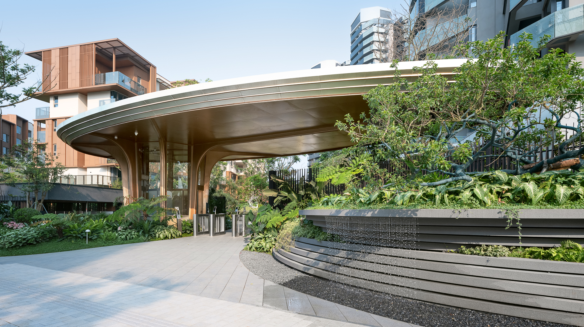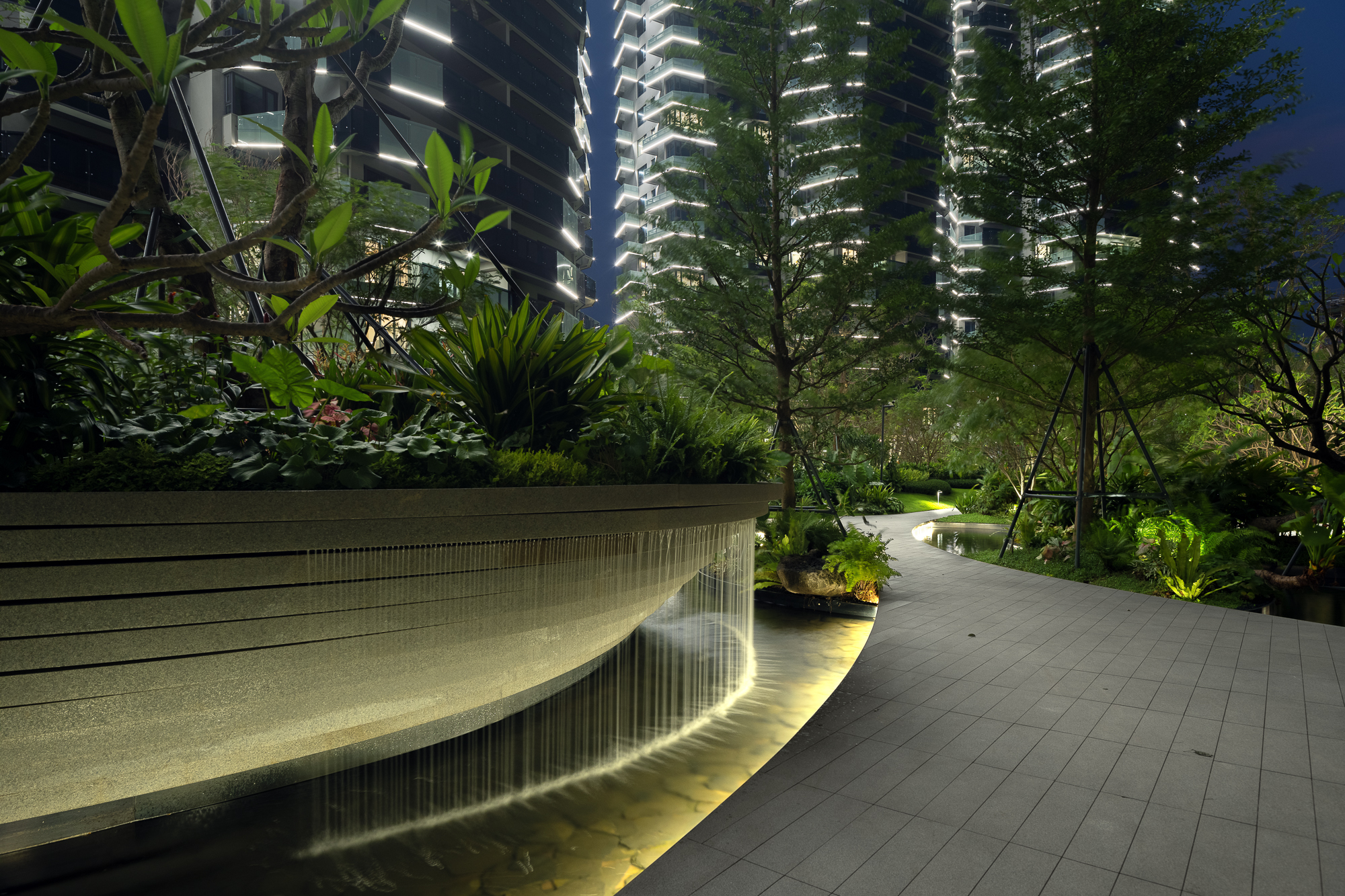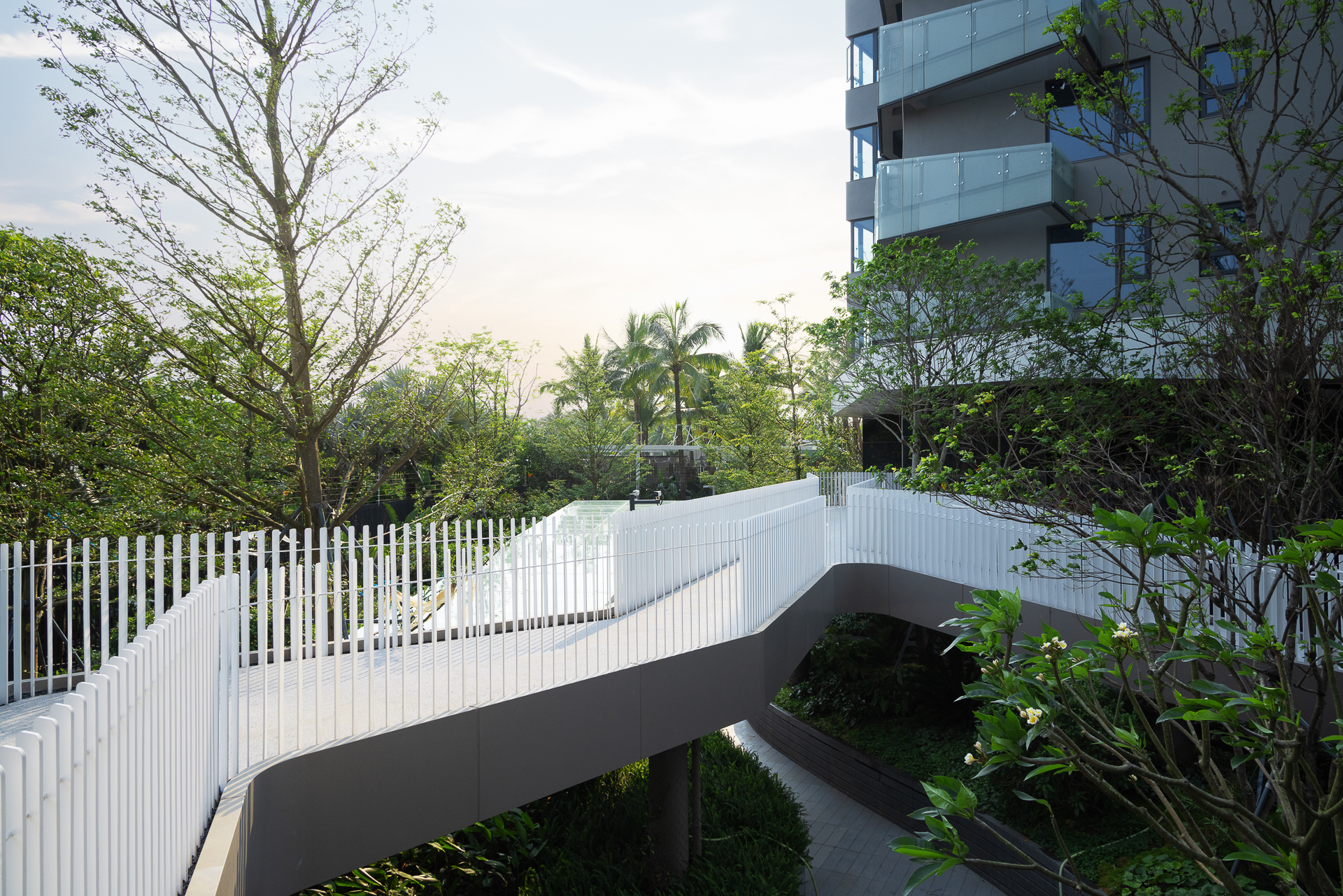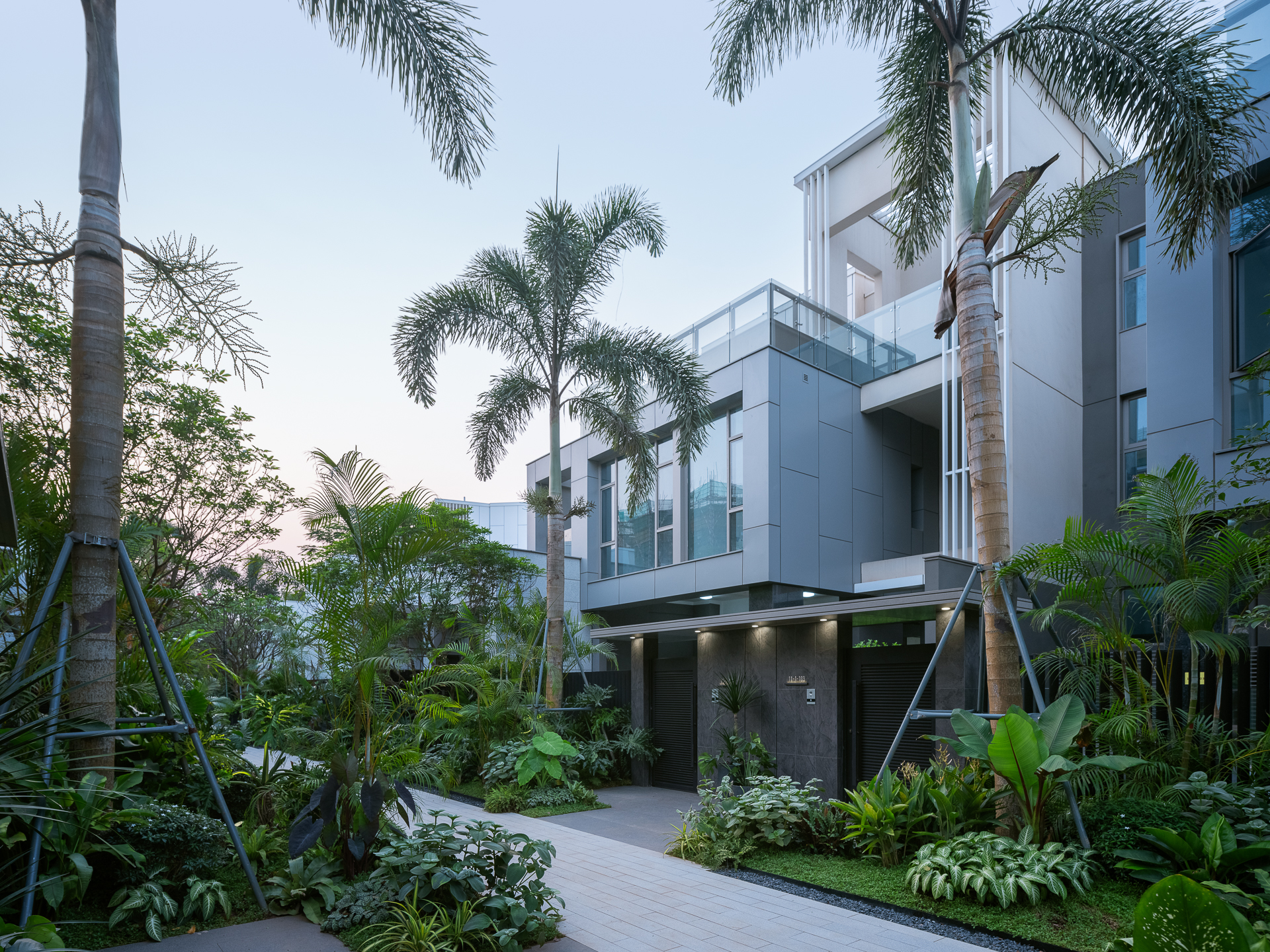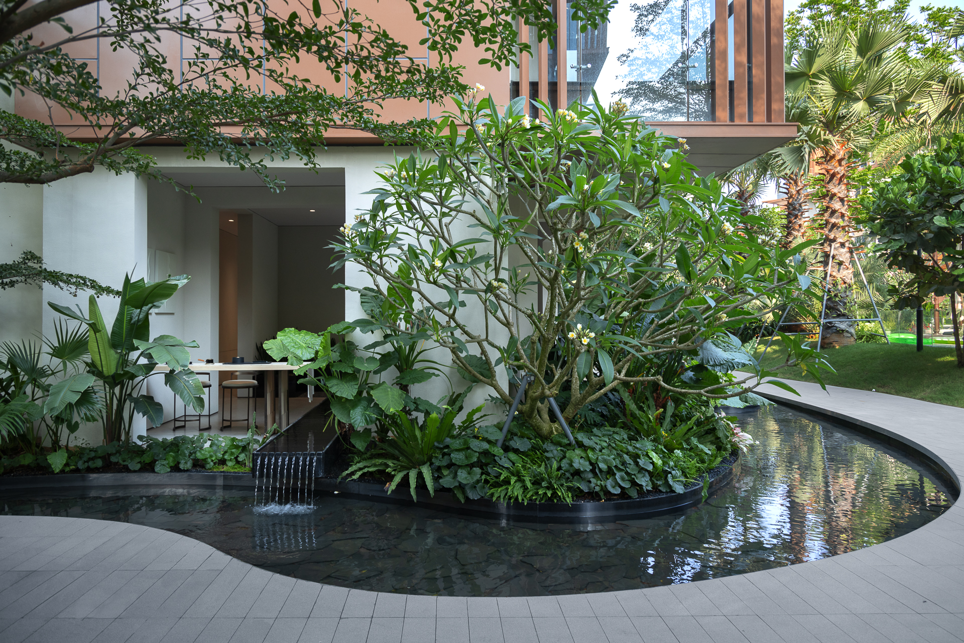 项目以“漂浮的绿洲”为设计概念,模拟自然,创造热带自然生态系统为基底,把热带风情,水的律动以及度假感受有机的结合起来。大环线功能链接整体规划,实现引水入城,临水而居的空间布局。建筑,绿地和水系交融共生。项目从艺术、在地、自然风貌各方面不断创新与突破,在特色植物空间的营造、在地艺术的符号表达以及社群场景的融入寻找切入点,打造兼具国际视野与本土特色的高端滨水住宅景观。