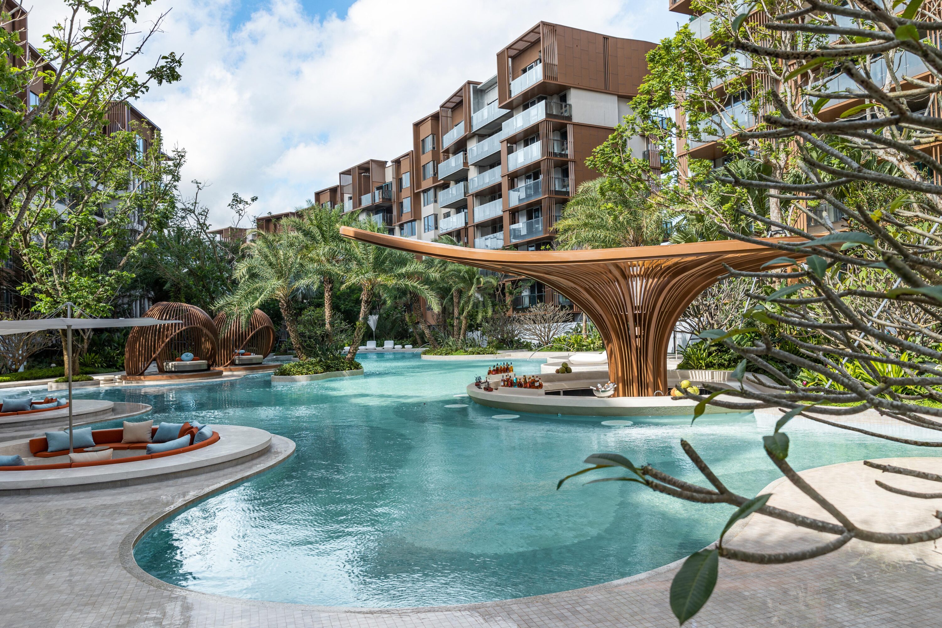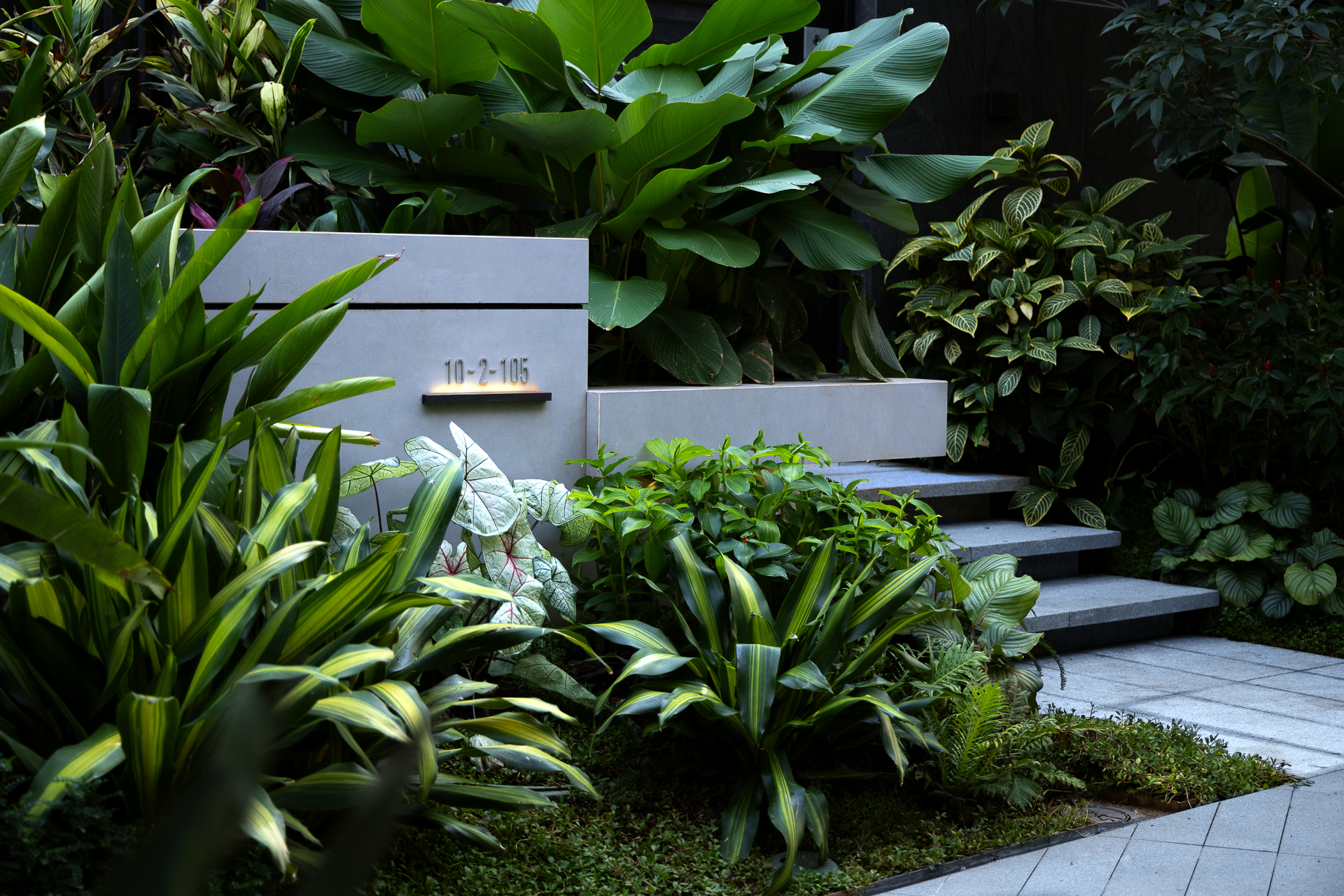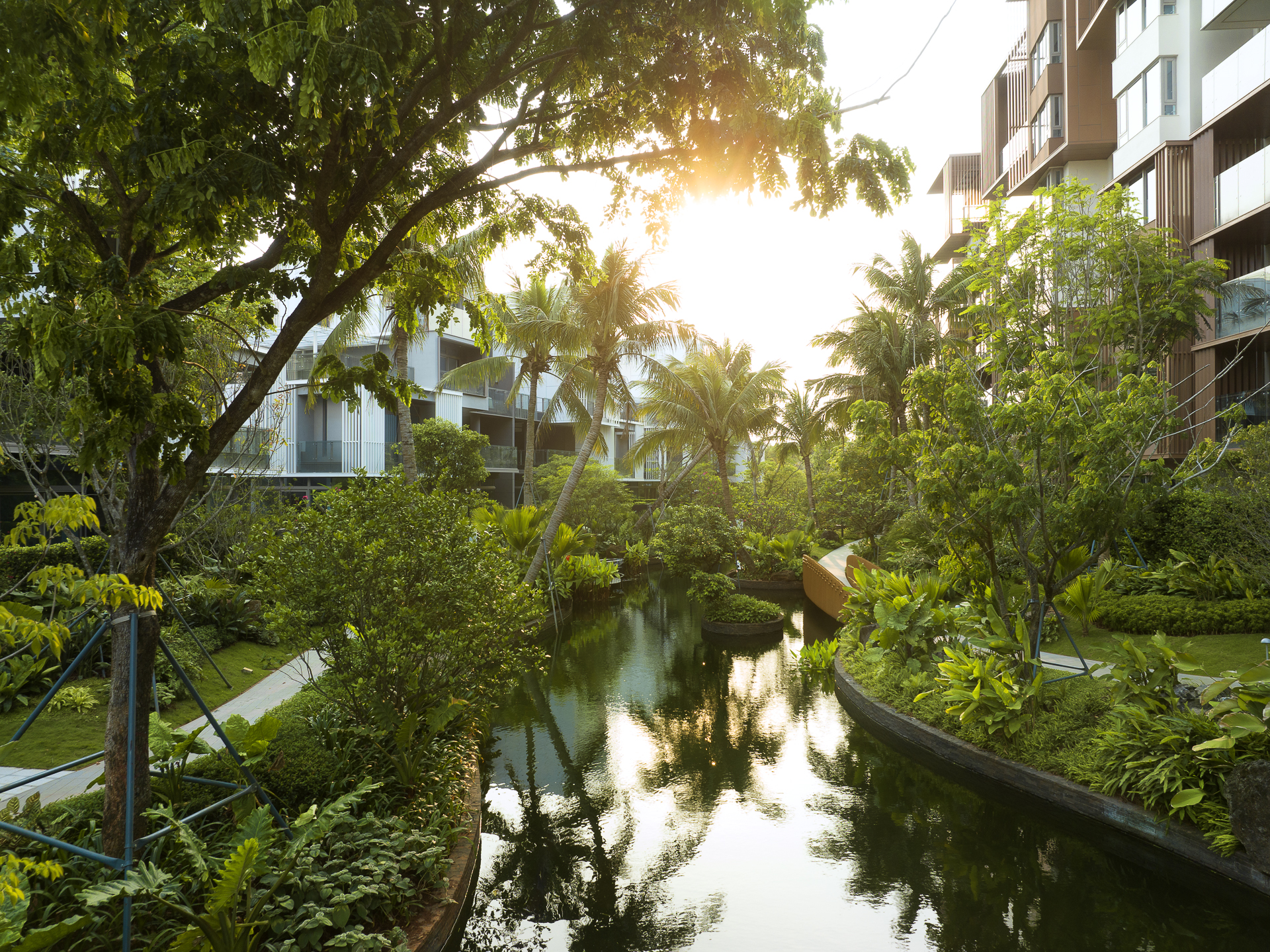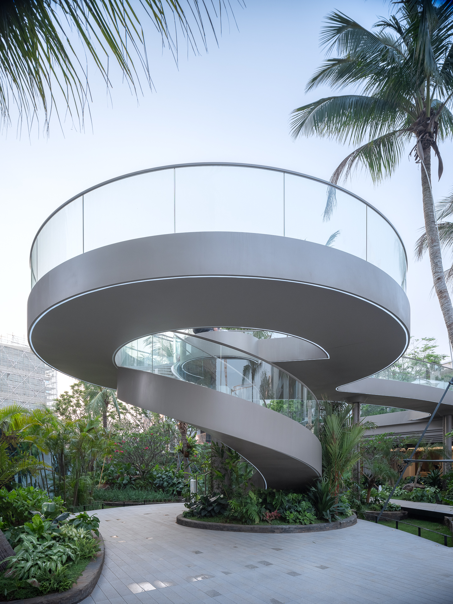 项目以“漂浮的绿洲”为设计概念,模拟自然,创造热带自然生态系统为基底,把热带风情,水的律动以及度假感受有机的结合起来。大环线功能链接整体规划,实现引水入城,临水而居的空间布局。建筑,绿地和水系交融共生。项目从艺术、在地、自然风貌各方面不断创新与突破,在特色植物空间的营造、在地艺术的符号表达以及社群场景的融入寻找切入点,打造兼具国际视野与本土特色的高端滨水住宅景观。