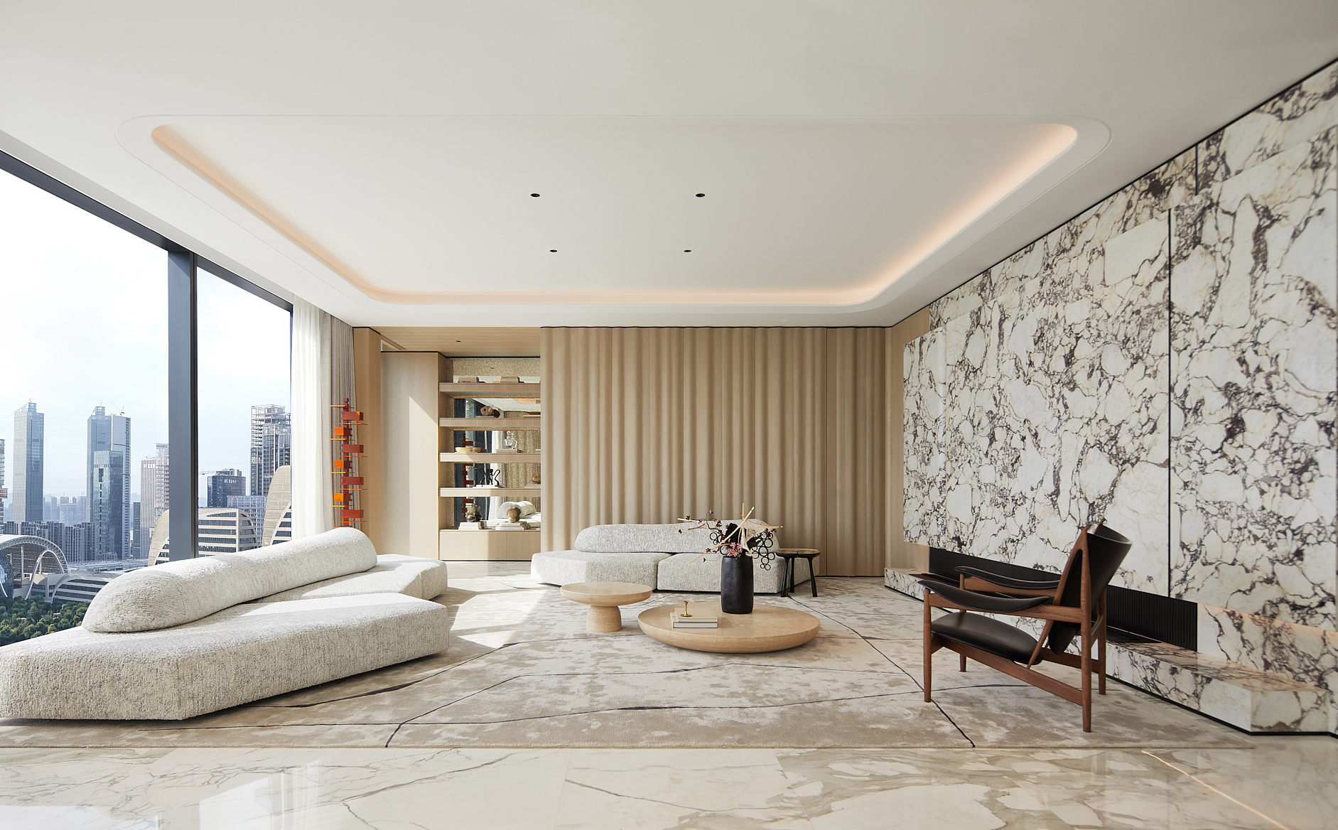 设计思考始于该地块与钱塘江的关系。 我们希望加强这种联系,引导居者的视线聚焦于钱塘江的变迁。因此,水的精髓被带入空间,并贯穿始终。