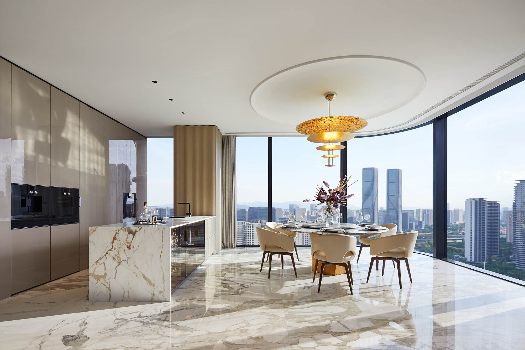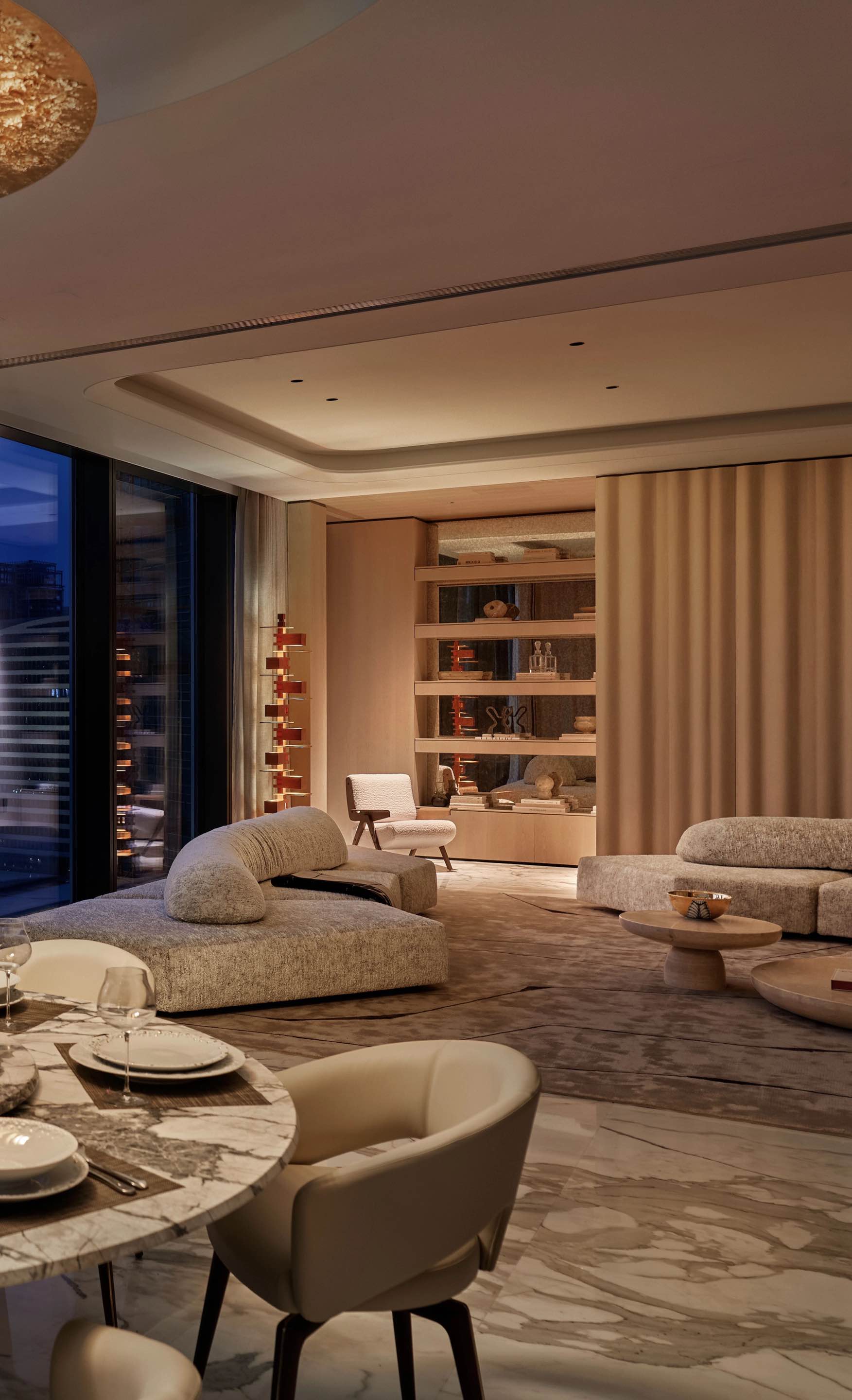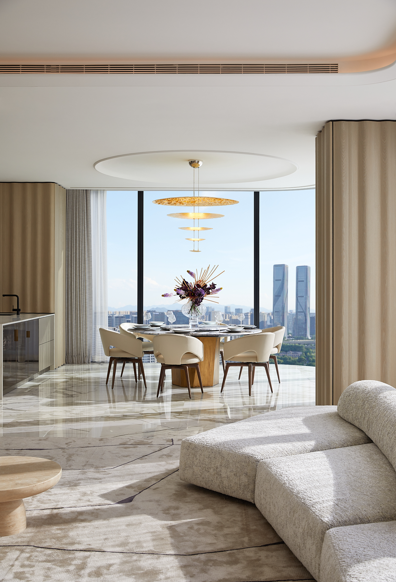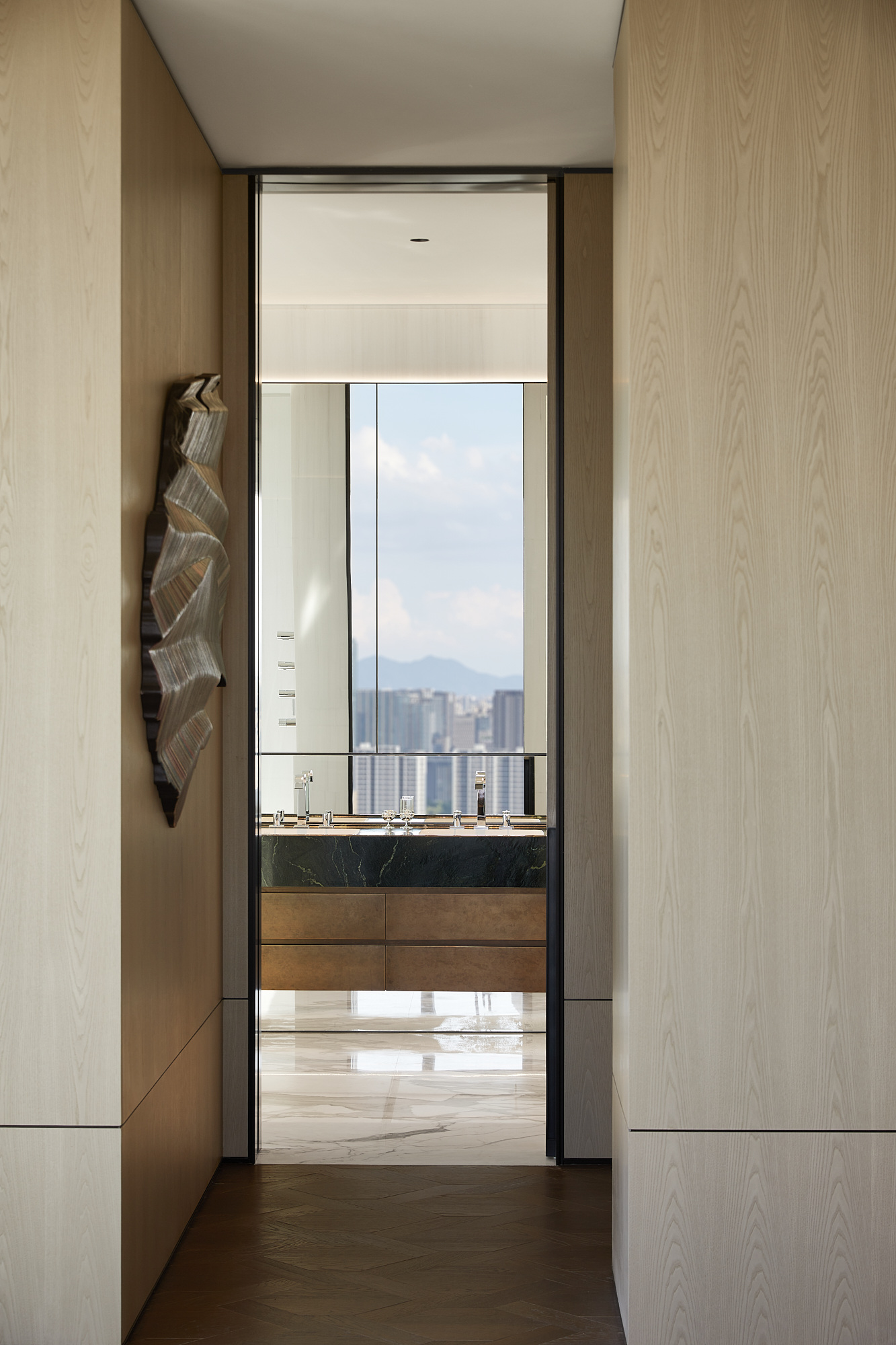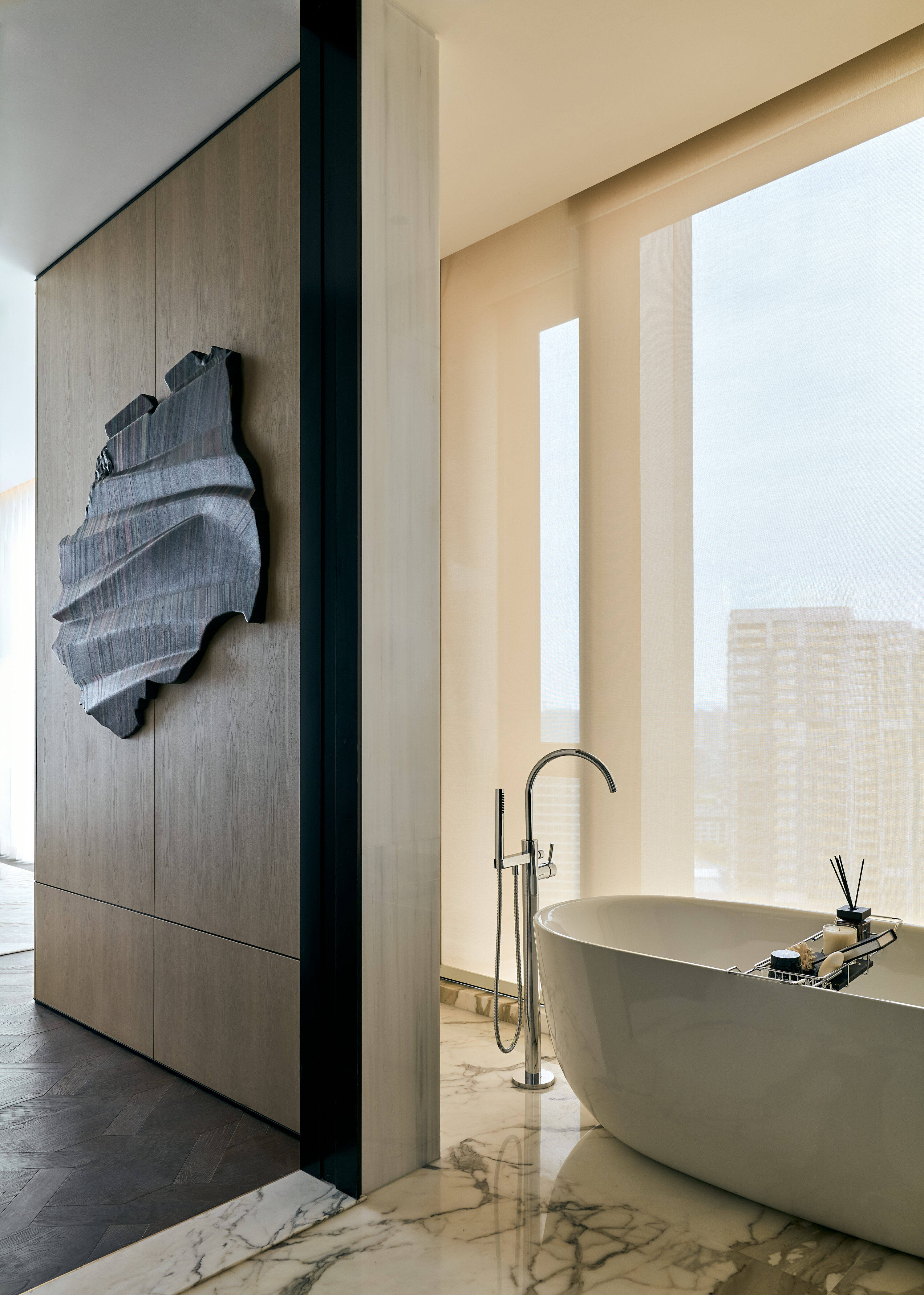 设计思考始于该地块与钱塘江的关系。 我们希望加强这种联系,引导居者的视线聚焦于钱塘江的变迁。因此,水的精髓被带入空间,并贯穿始终。