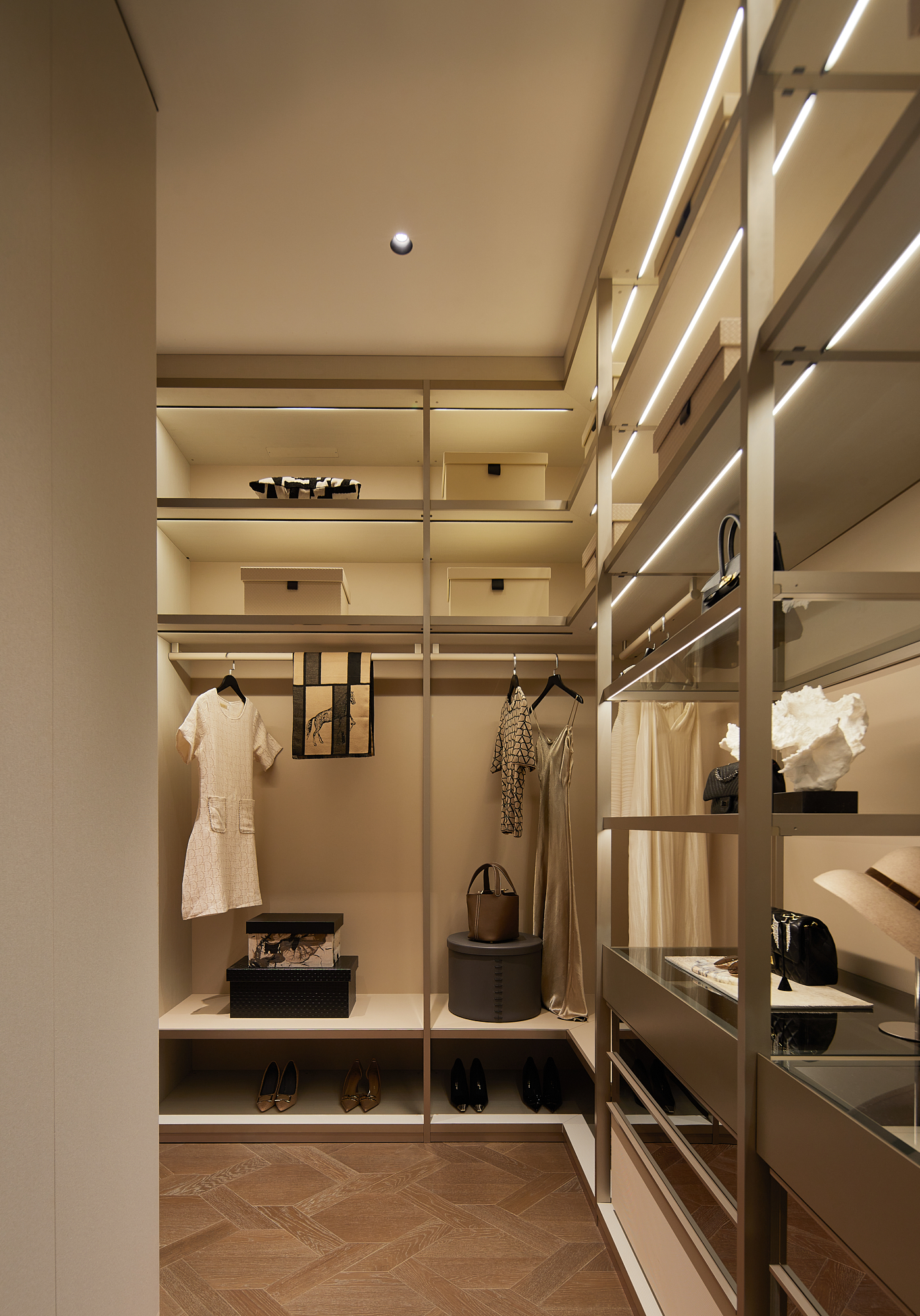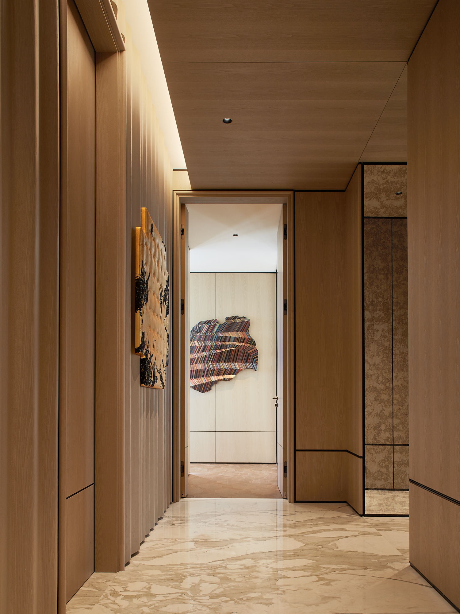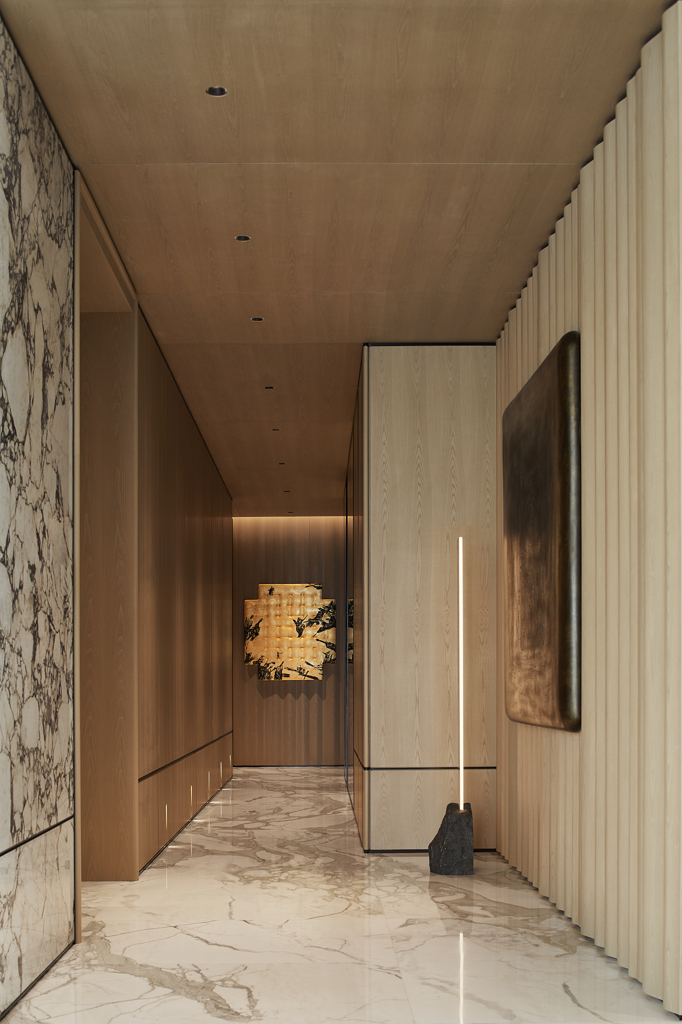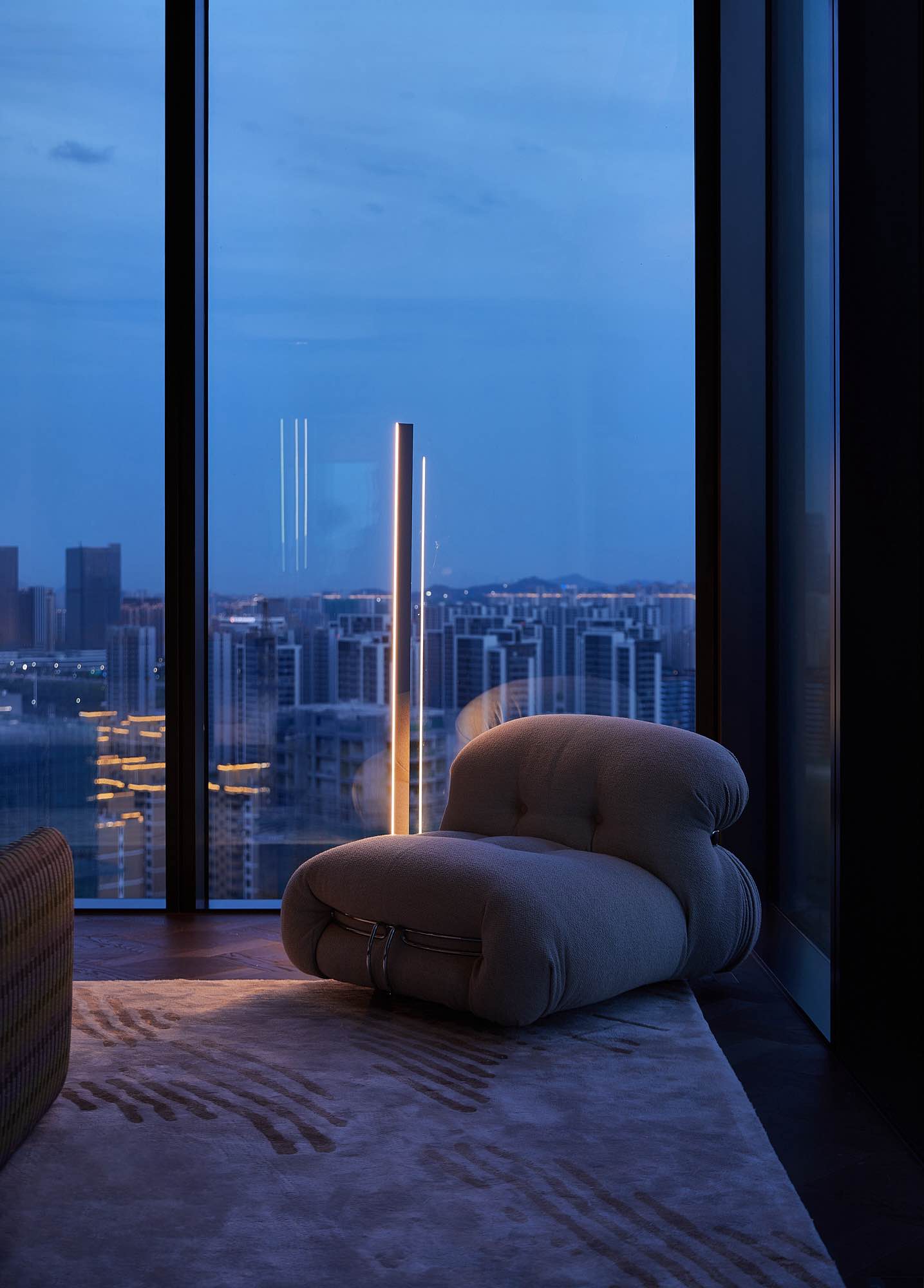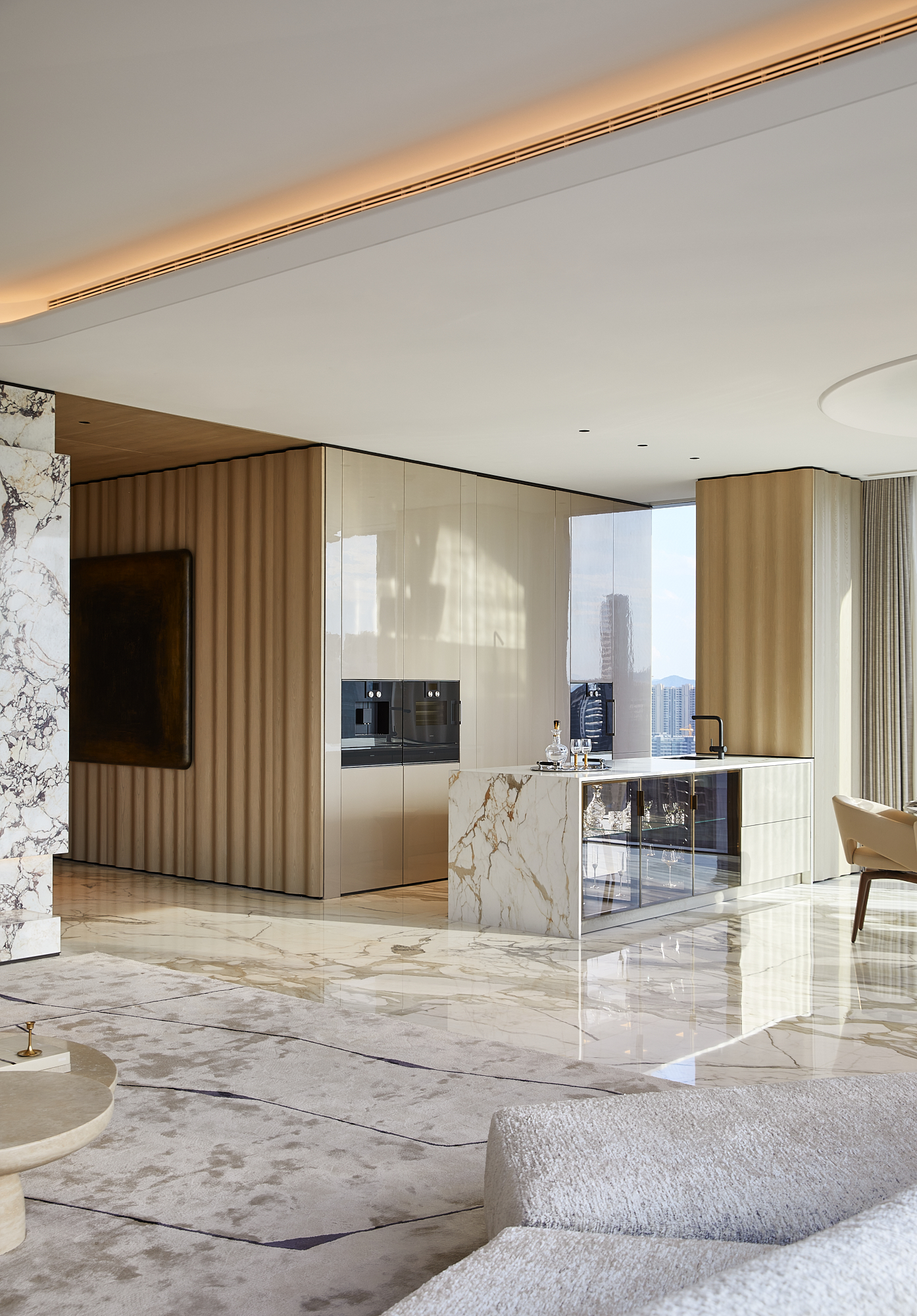 设计思考始于该地块与钱塘江的关系。 我们希望加强这种联系,引导居者的视线聚焦于钱塘江的变迁。因此,水的精髓被带入空间,并贯穿始终。