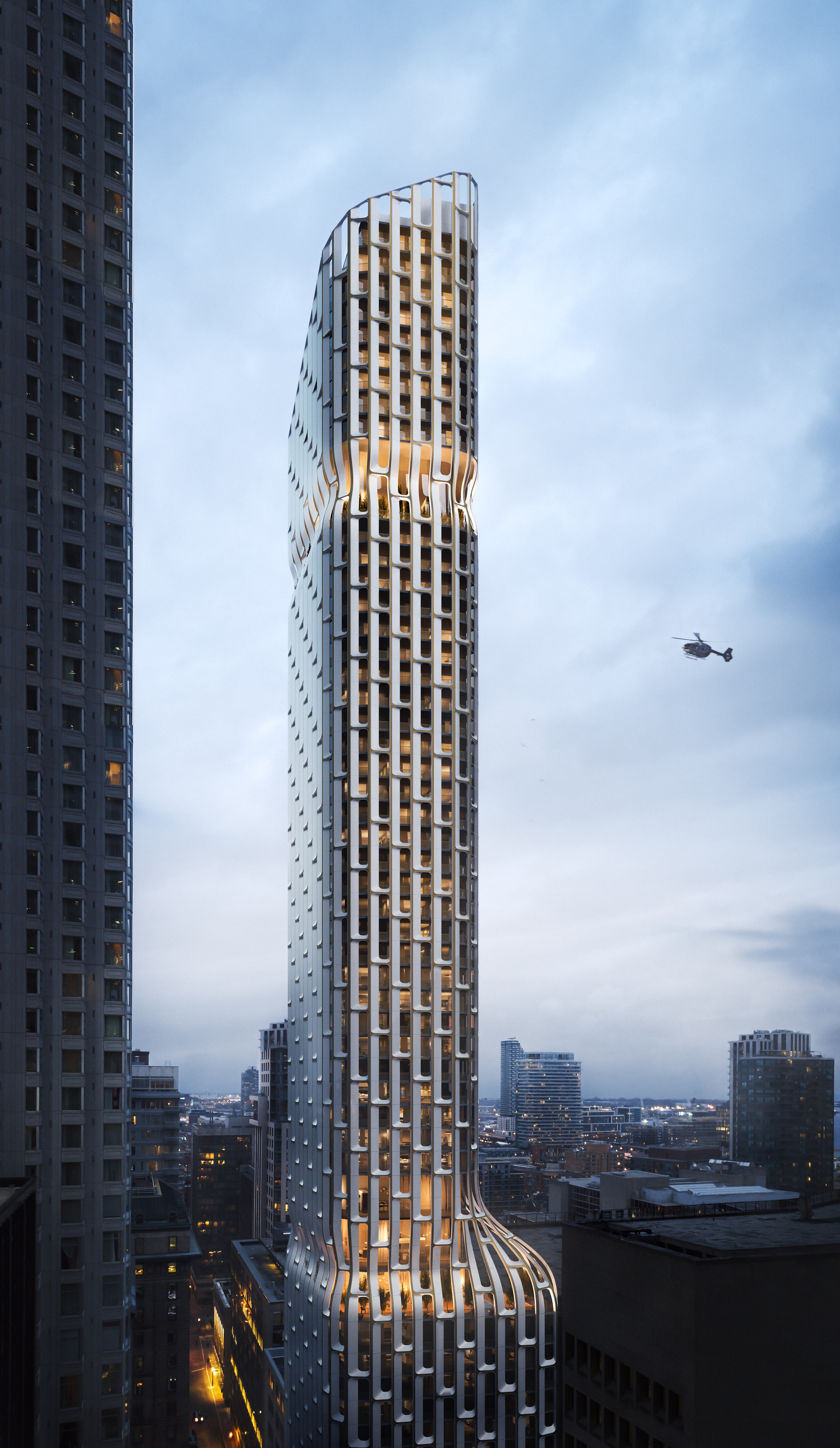 55 Yonge 是一座由加拿大领先的房地产投资信托公司 H&R REIT 委托设计的气候响应型住宅楼,同时也是对多伦多快速增长的住房需求所作出的大胆回应。55 Yonge以高级时装的工艺视角重新诠释了高层建筑的设计语言。大楼的设计从服装剪裁与布料的垂坠感获取灵感,将雕塑般的外立面视为一块高性能的“织物”,包裹着整个建筑体,将美感、效率与环境智能融为一体。