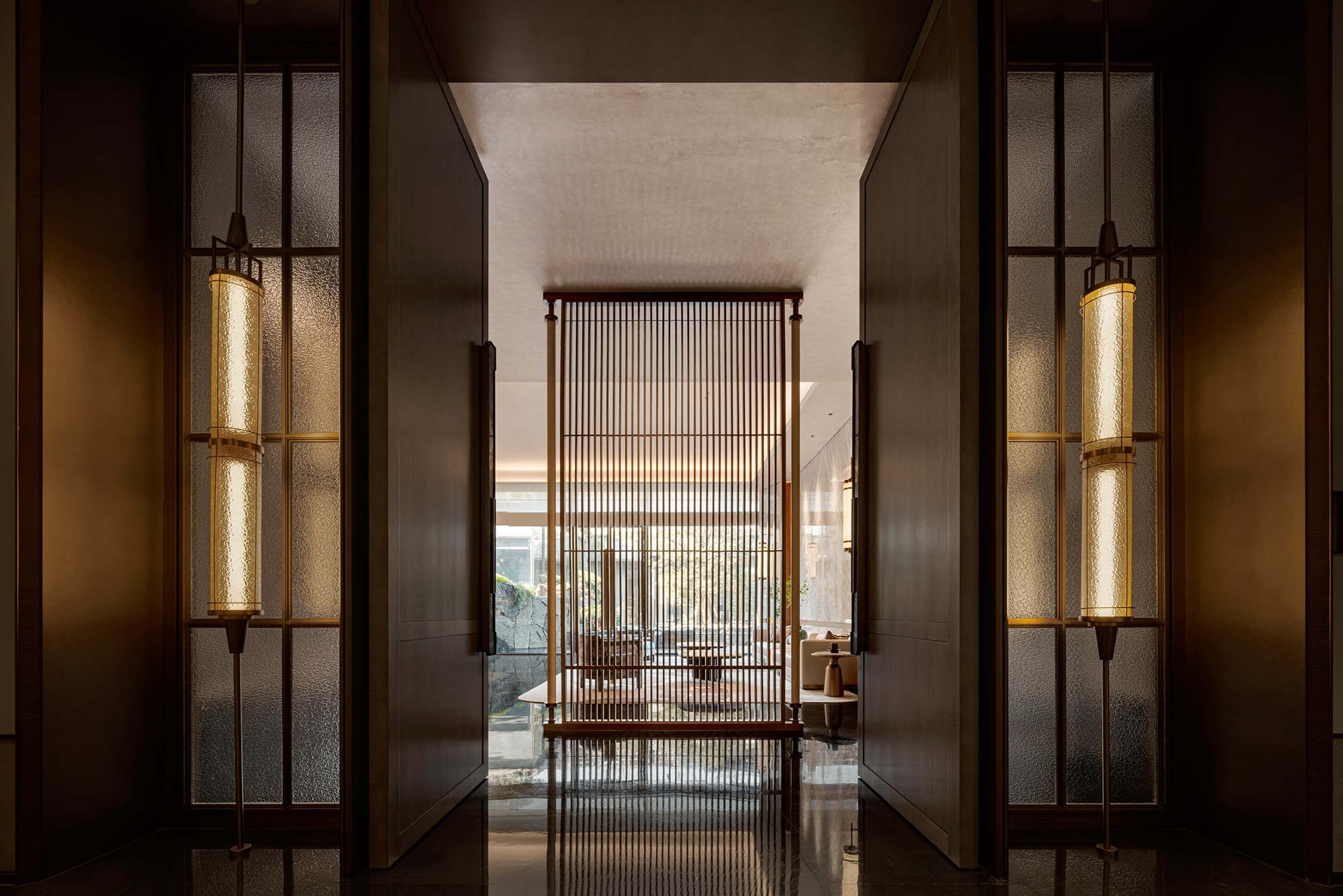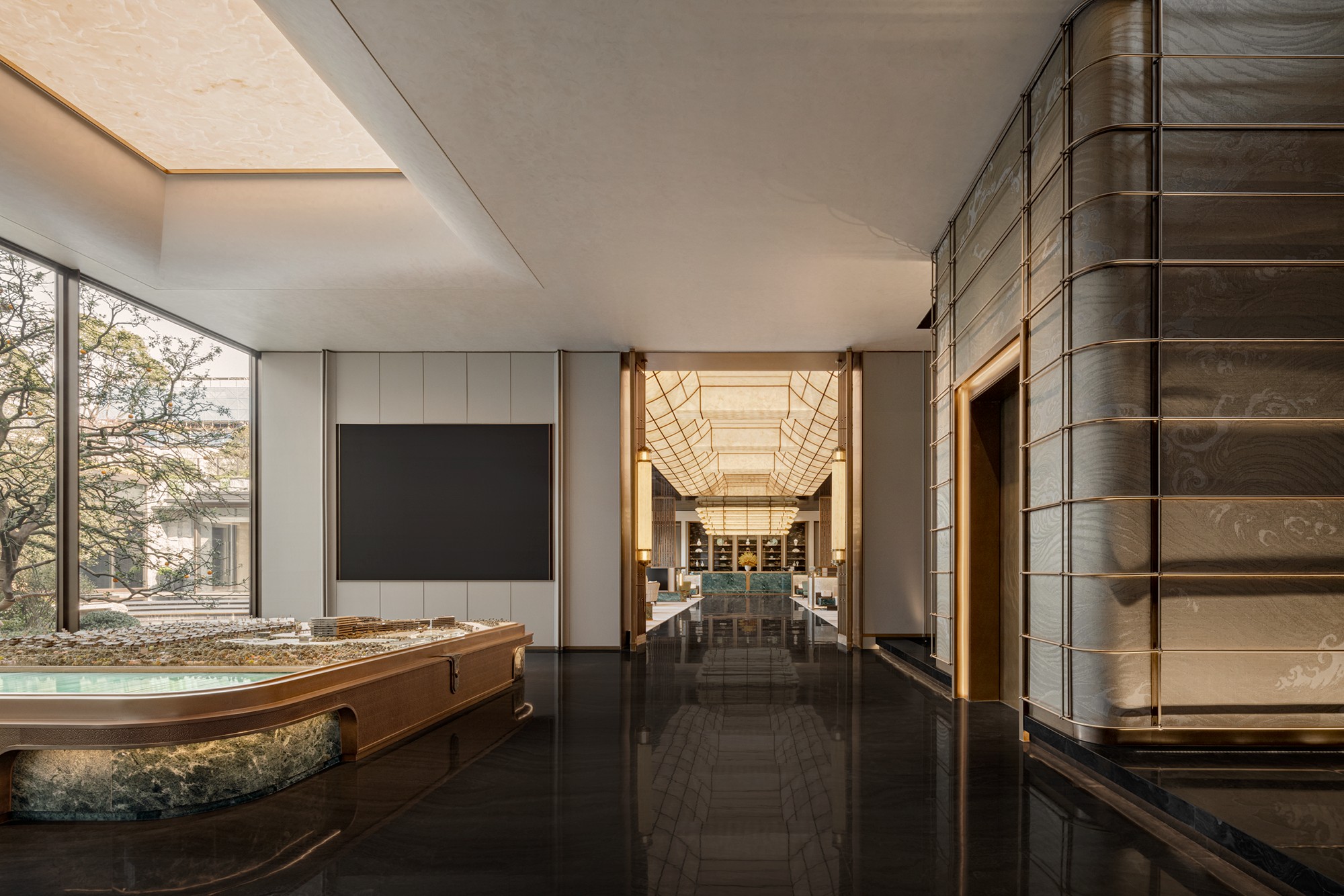 项目位于杭州东部湾新城金沙嘴板块、杭州新主城区拥江发展带极佳位置,临江景观资源优越,周边绿地系统与配套设施完备;设计将场地融入街区级绿地系统并引入林荫步行街区体系,同时也将住区分为更小的街区单位,并合理设置归家入口节点,使住区归家慢行动线与城市景观慢行系统相融,实现绿色归家;沿江组团设置利于景观渗透,有效呼应与最优利用景观资源;户型设计以“借光-借势-借景”三大策略打造有天有地的中式宅园。