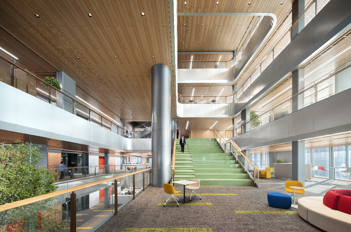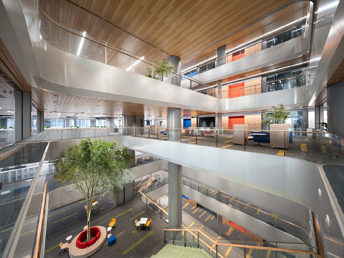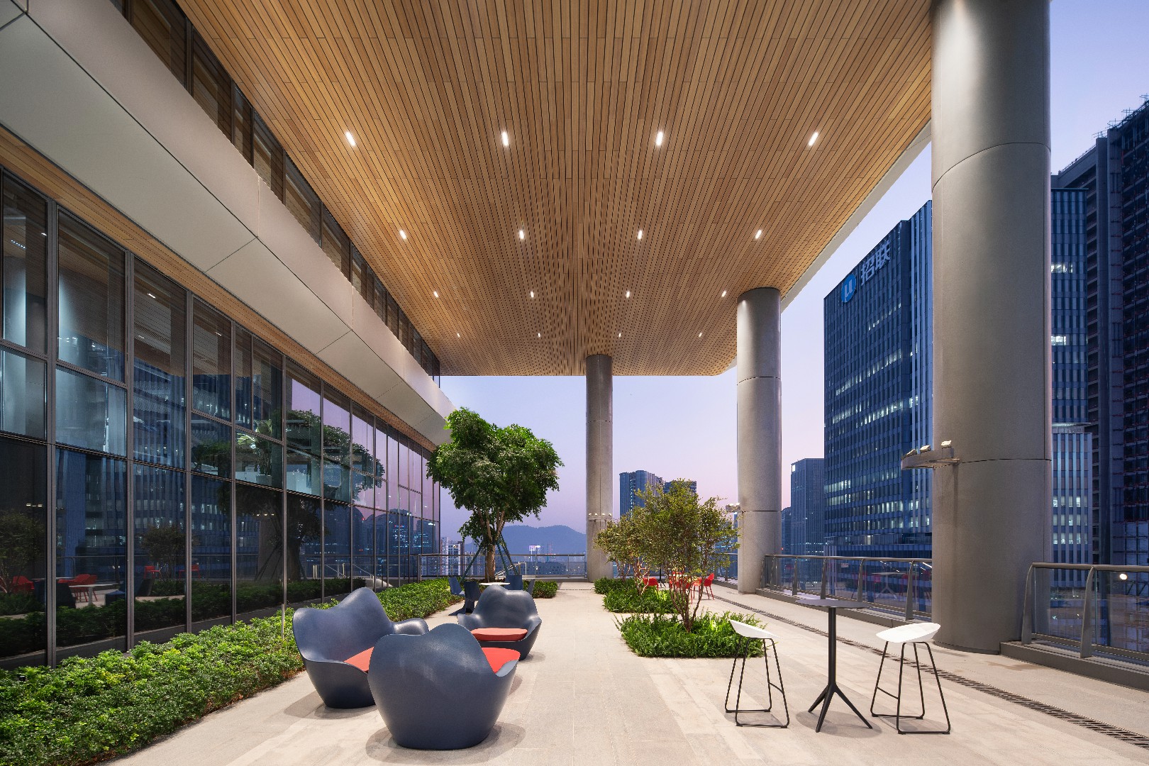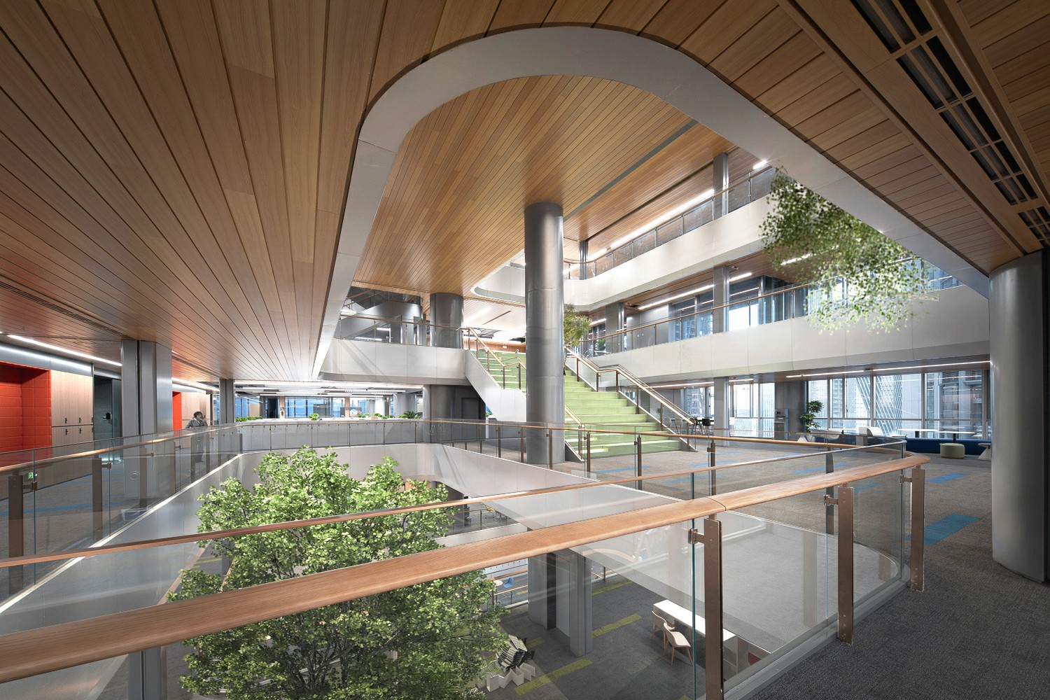 深圳微众银行总部大厦位于深圳前海自贸区核心区域桂湾,是微众银行的全球总部所在地。设计团队将周边街区的公共空间融入工作环境之中。地面层的开放式拱廊与庭院将总体规划的绿化轴和交通便利性融入总部大楼。同时延续建筑设计绿色低碳的号召,提出“垂直森林中的金融新界”的设计理念,以岭南派建筑原理为依据,开放式拱廊与庭院作为设计思路,为其打造灵活高效、健康环保、智能科技的绿色生态办公环境。