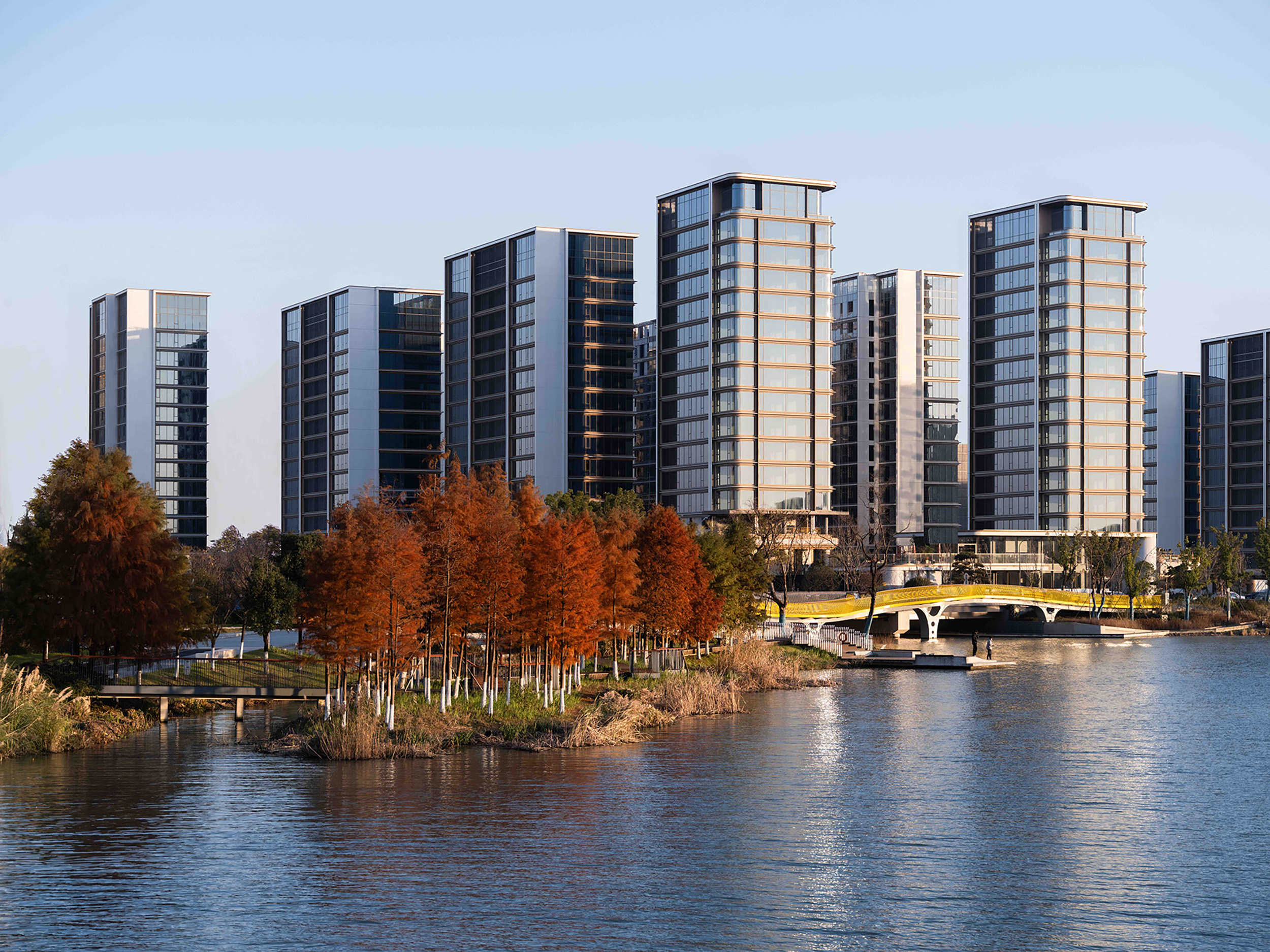 项目位于宁波明湖之畔,坐拥一线湖景,与明湖公园水系景观共同勾勒出一线湖景大宅。 弧形转角造型,温和建筑体量,呈现温润典雅的建筑气质。 大面积落地玻璃,270°环幕曲面屏,打造无界宽幕立面,极致视野。 机翼式弧形外挑铝板,轻盈建筑体量,同时起到遮阳功能,降低能耗。 取中国古典金镶玉的韵味,融于建筑白+金的组合之中,精致搭配,延续经典。