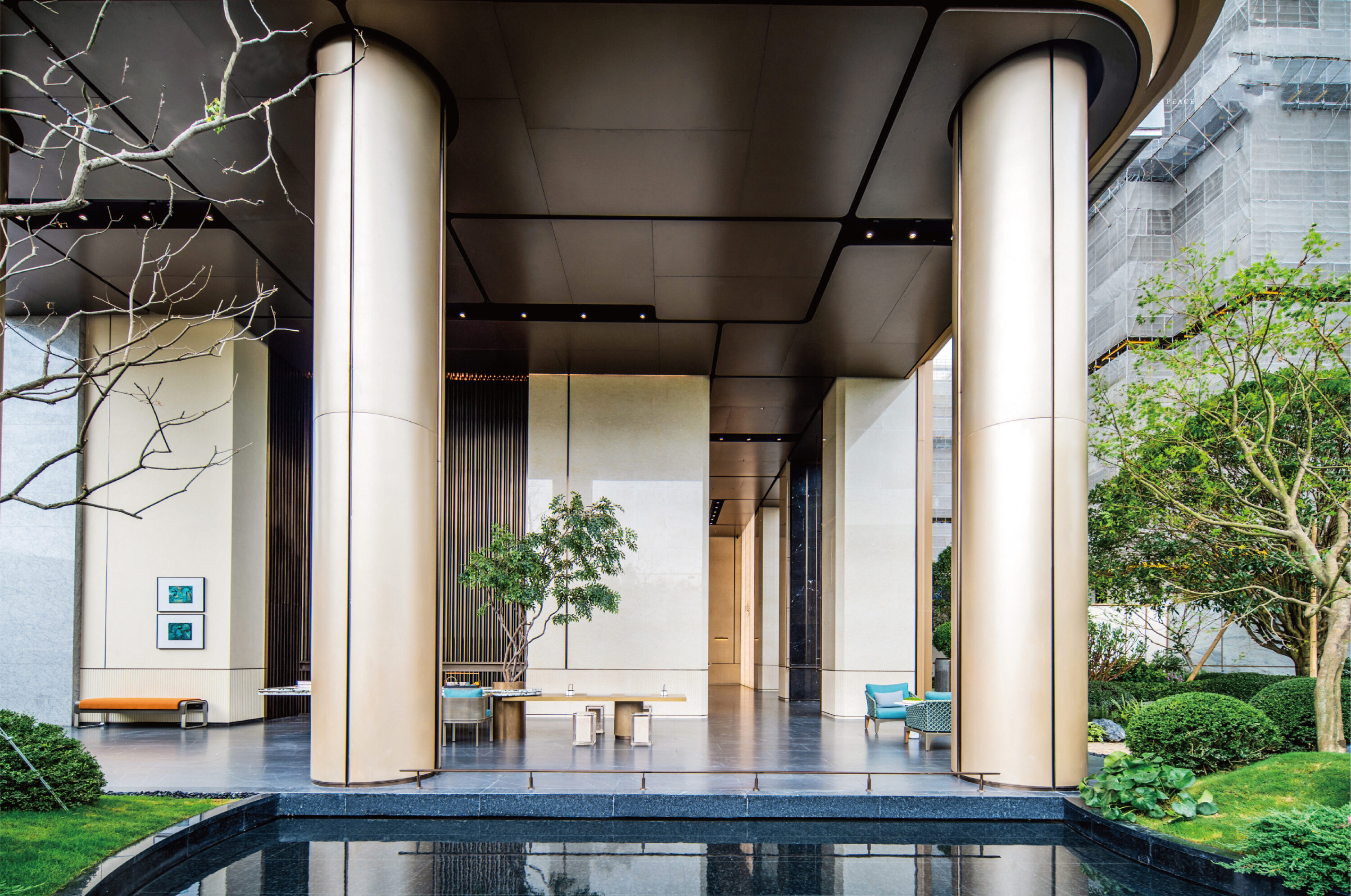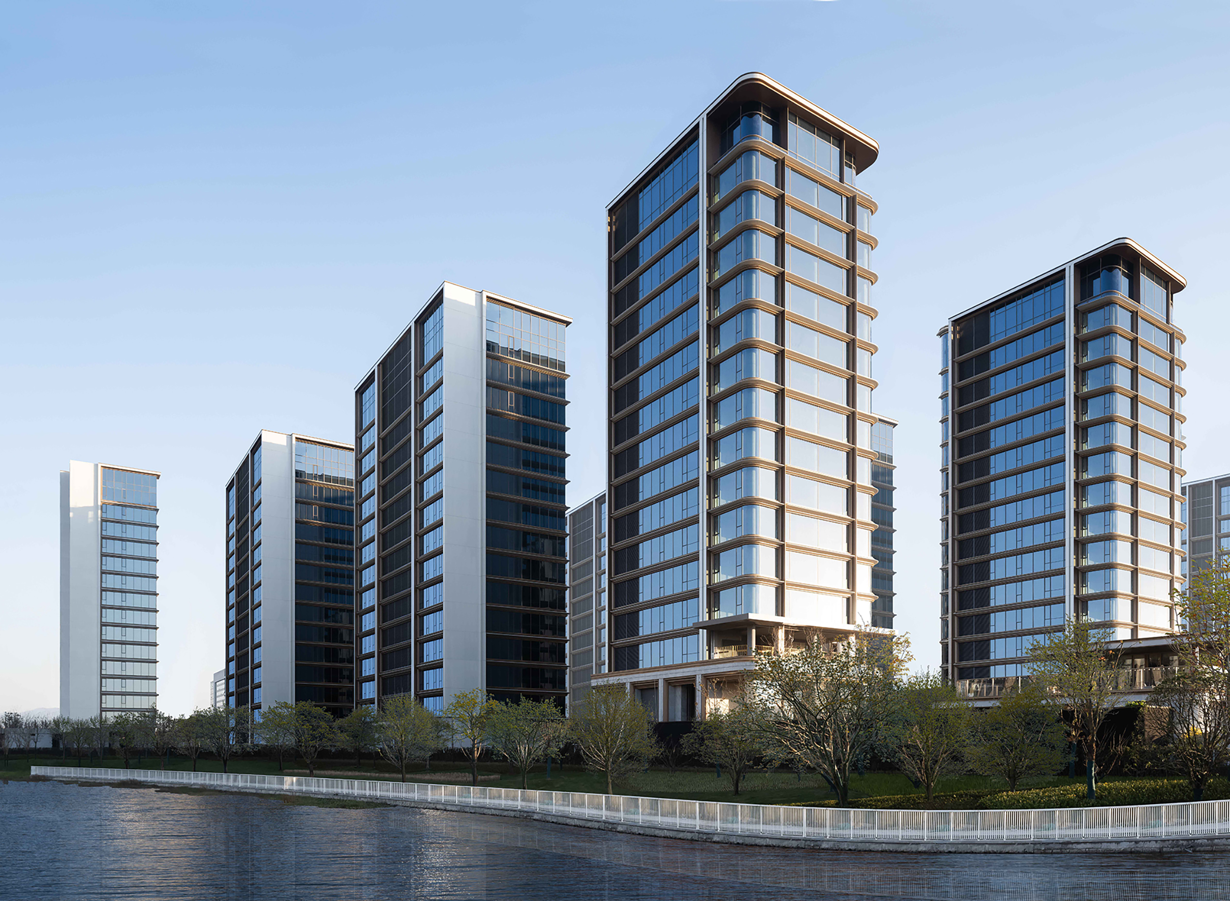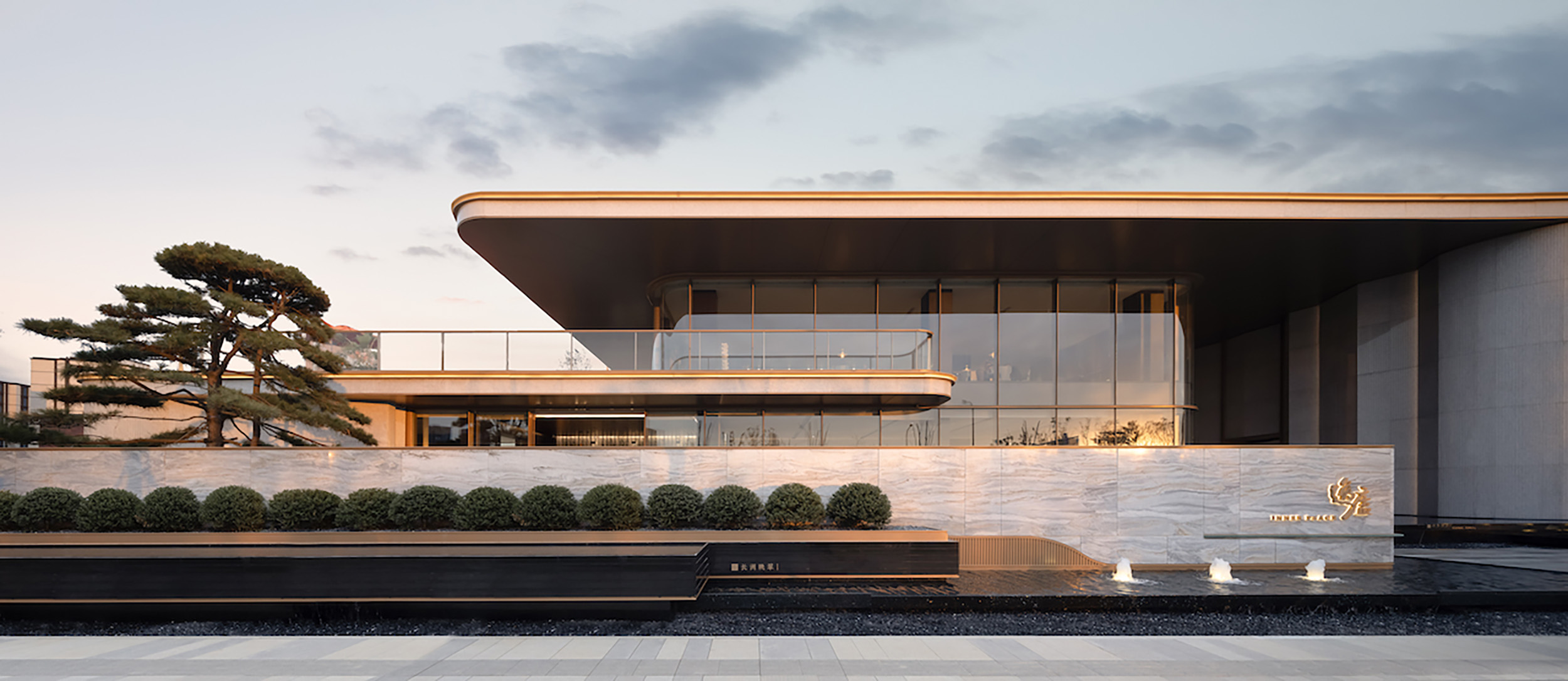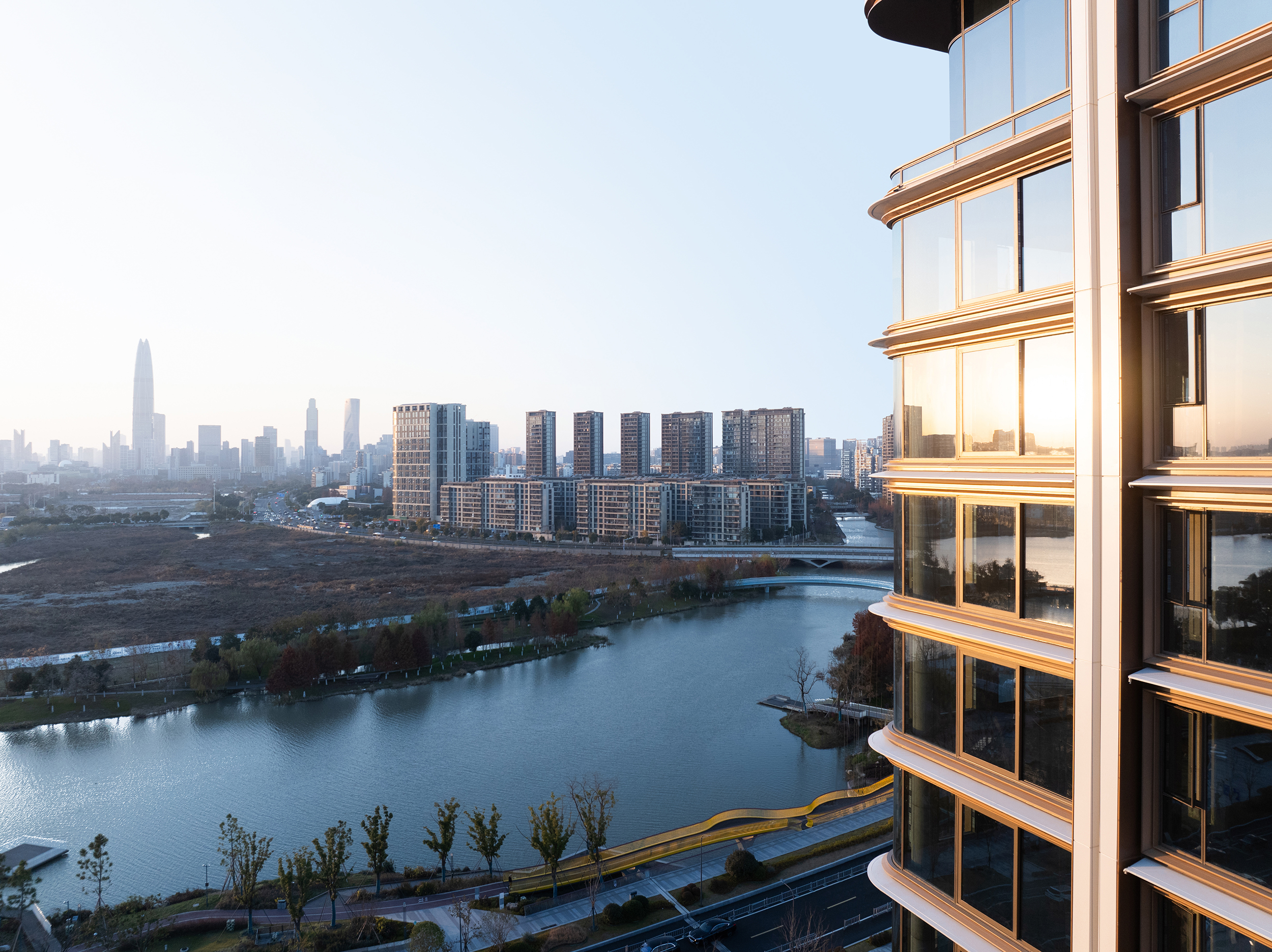 项目位于宁波明湖之畔,坐拥一线湖景,与明湖公园水系景观共同勾勒出一线湖景大宅。 弧形转角造型,温和建筑体量,呈现温润典雅的建筑气质。 大面积落地玻璃,270°环幕曲面屏,打造无界宽幕立面,极致视野。 机翼式弧形外挑铝板,轻盈建筑体量,同时起到遮阳功能,降低能耗。 取中国古典金镶玉的韵味,融于建筑白+金的组合之中,精致搭配,延续经典。