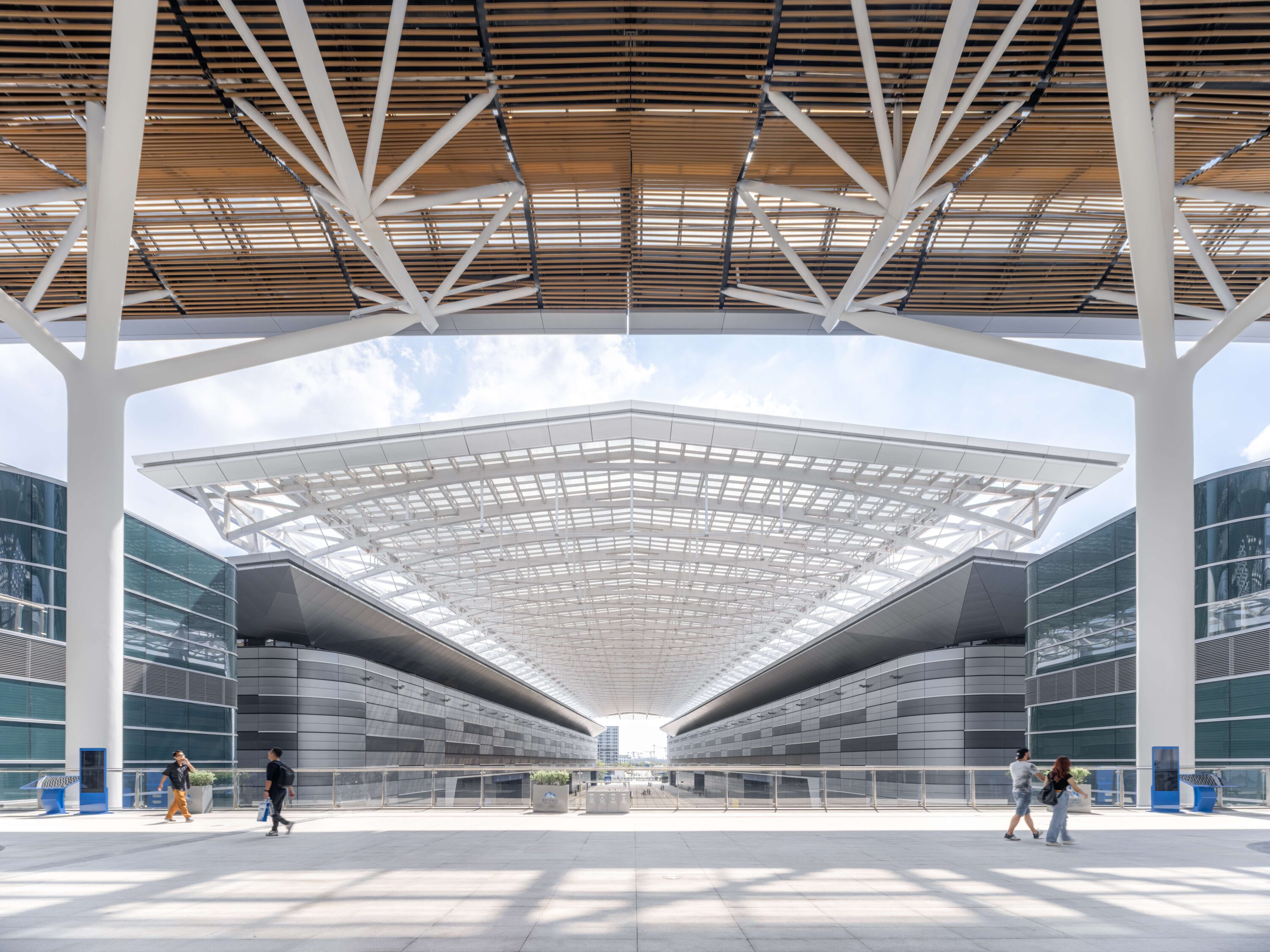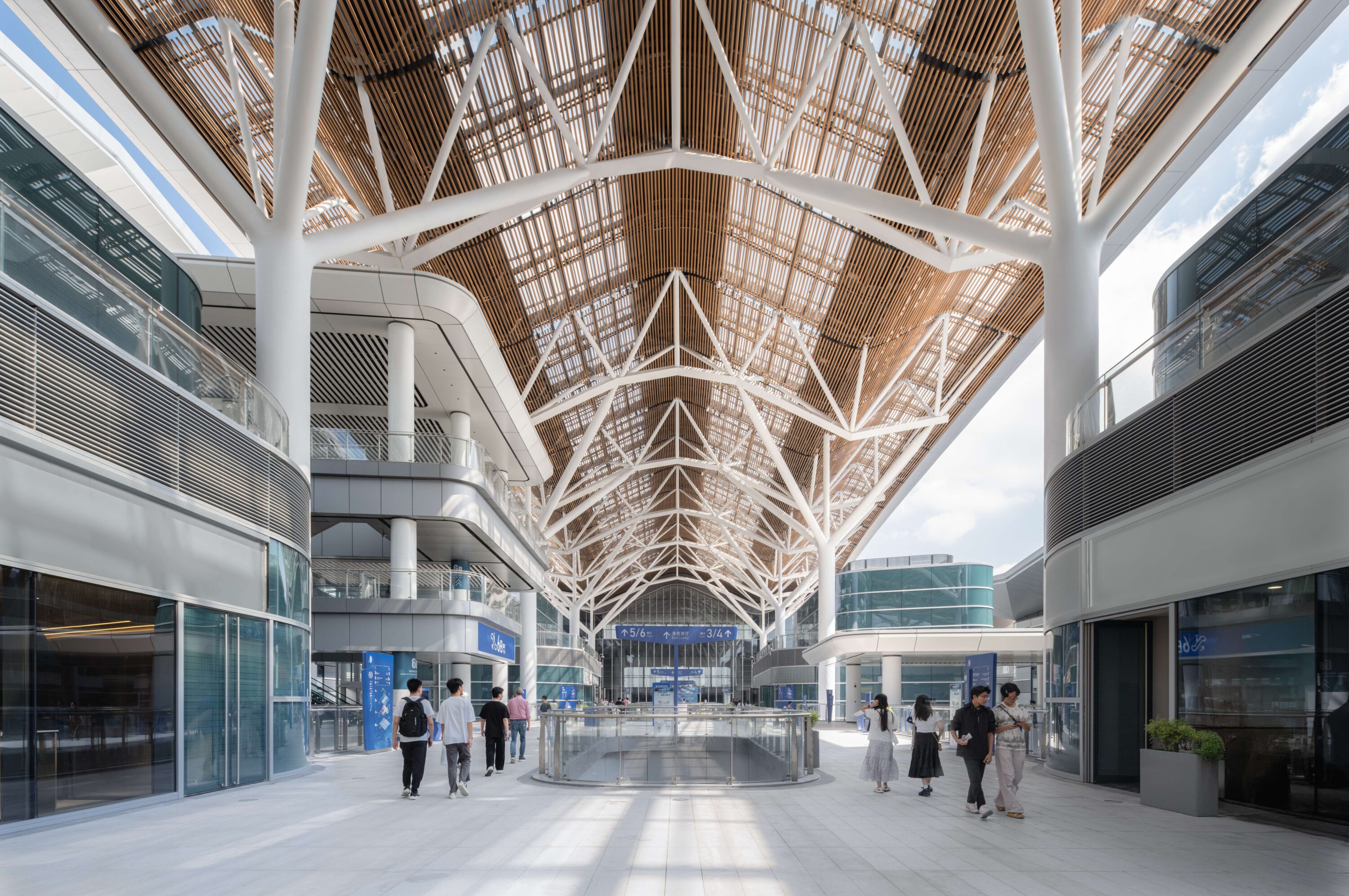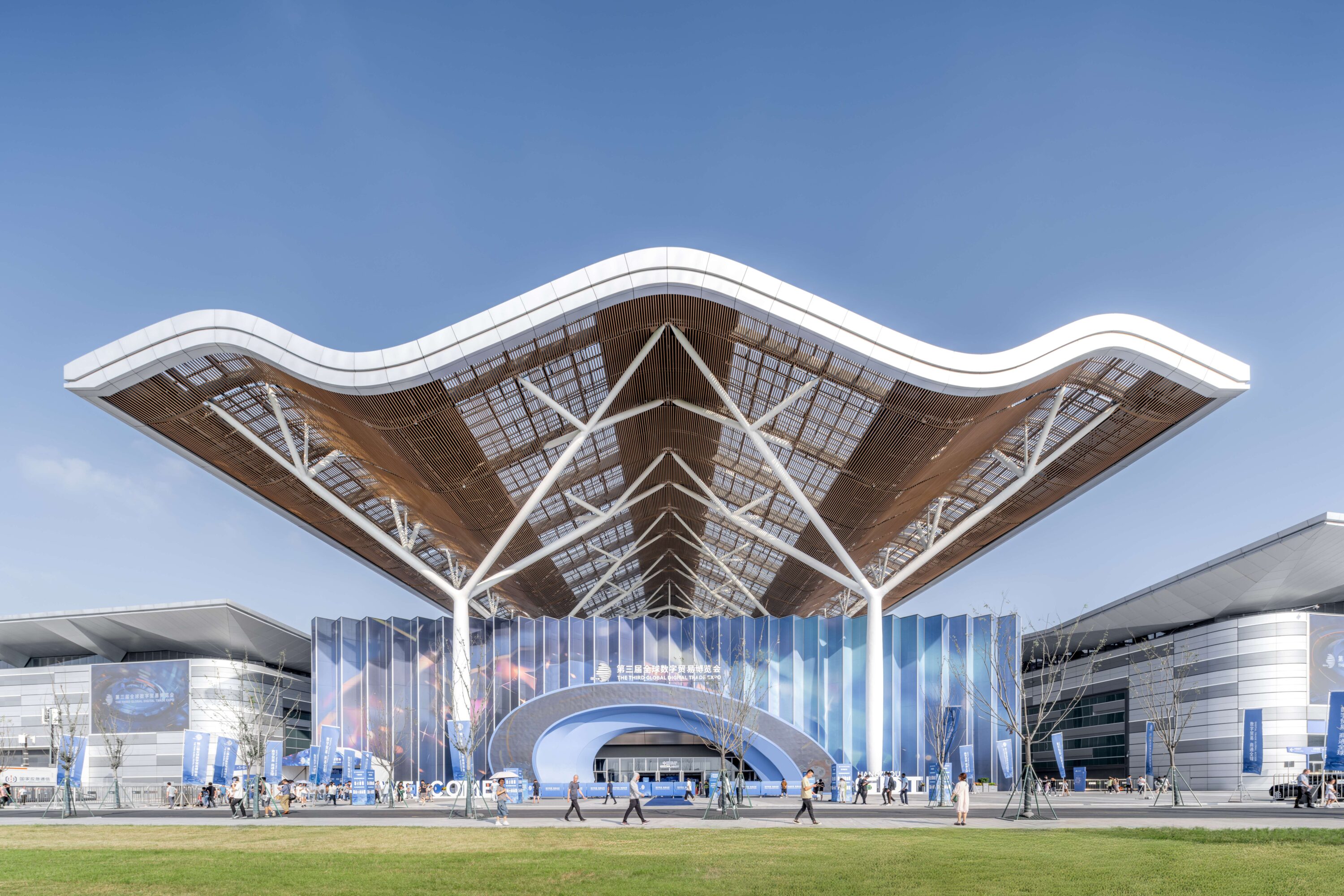杭州大会展中心总建筑面积134万方、净展面积30万方,已投用的一期项目建筑面积64万方、净展面积15.5万方。作为国内领先的一流复合型会展场馆,场馆采用“杭扇、丝绸”传统文化元素,以钱塘江畔“风帆”造型为整体设计,巧妙地将江南韵味与现代会展的需求相结合,是后亚运时期杭州打造国际“赛”“会”之城的新地标建筑。