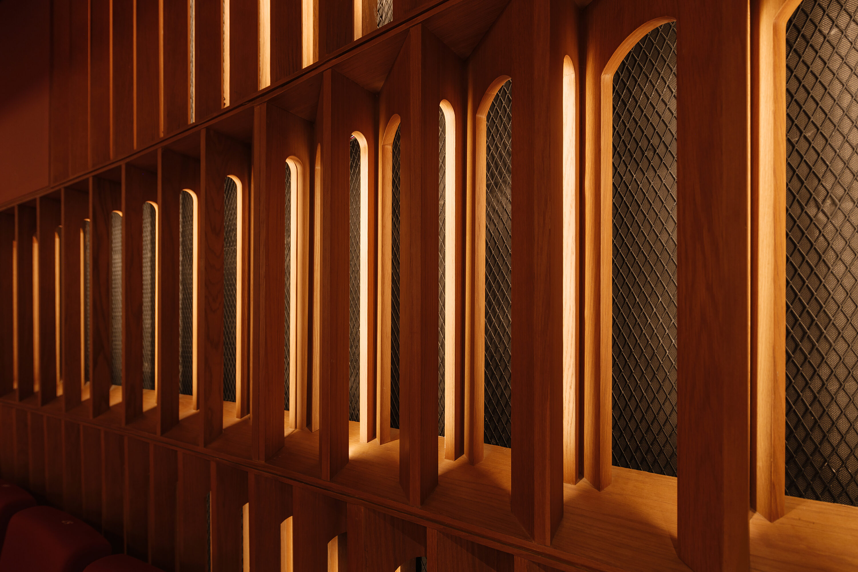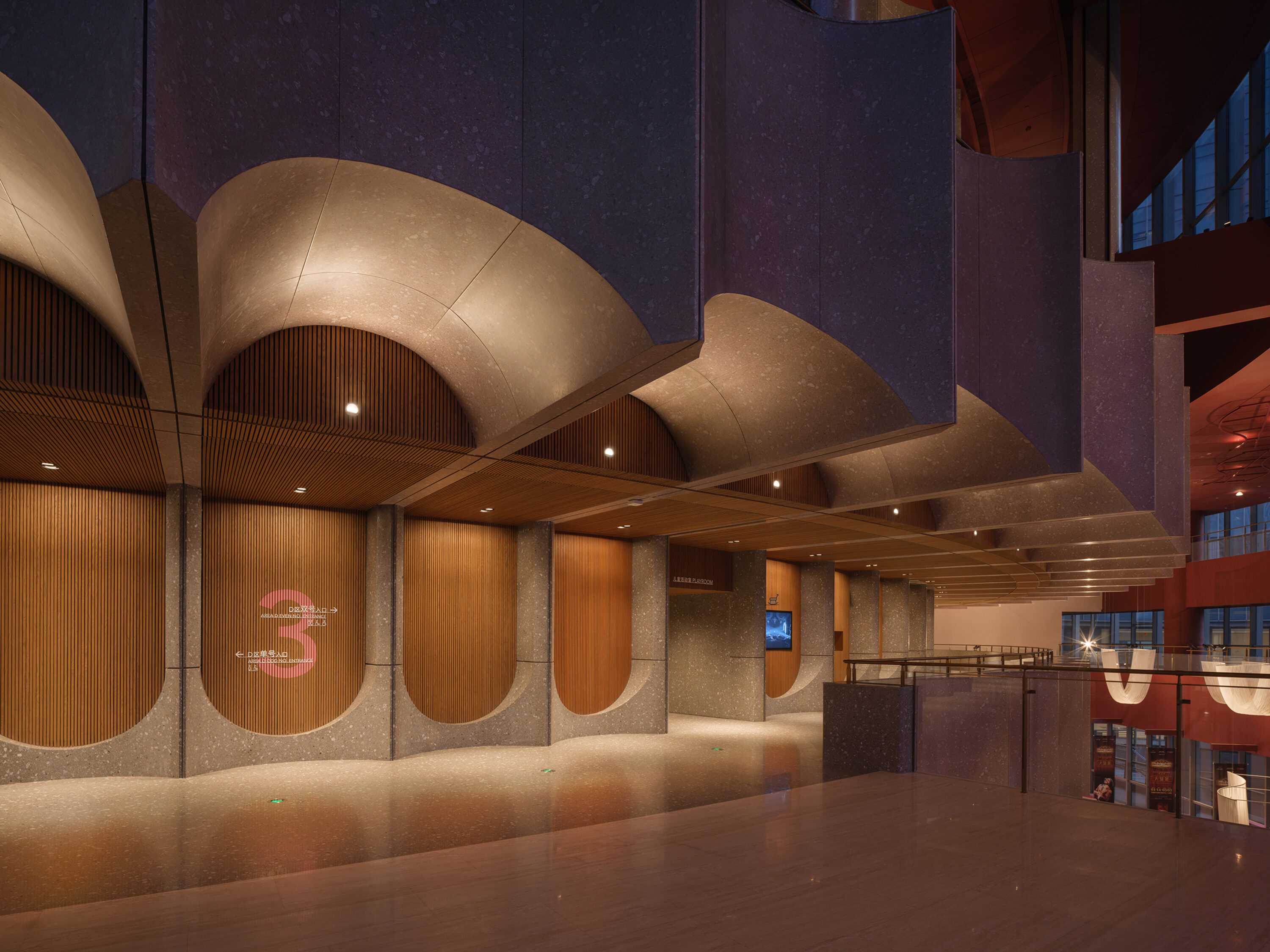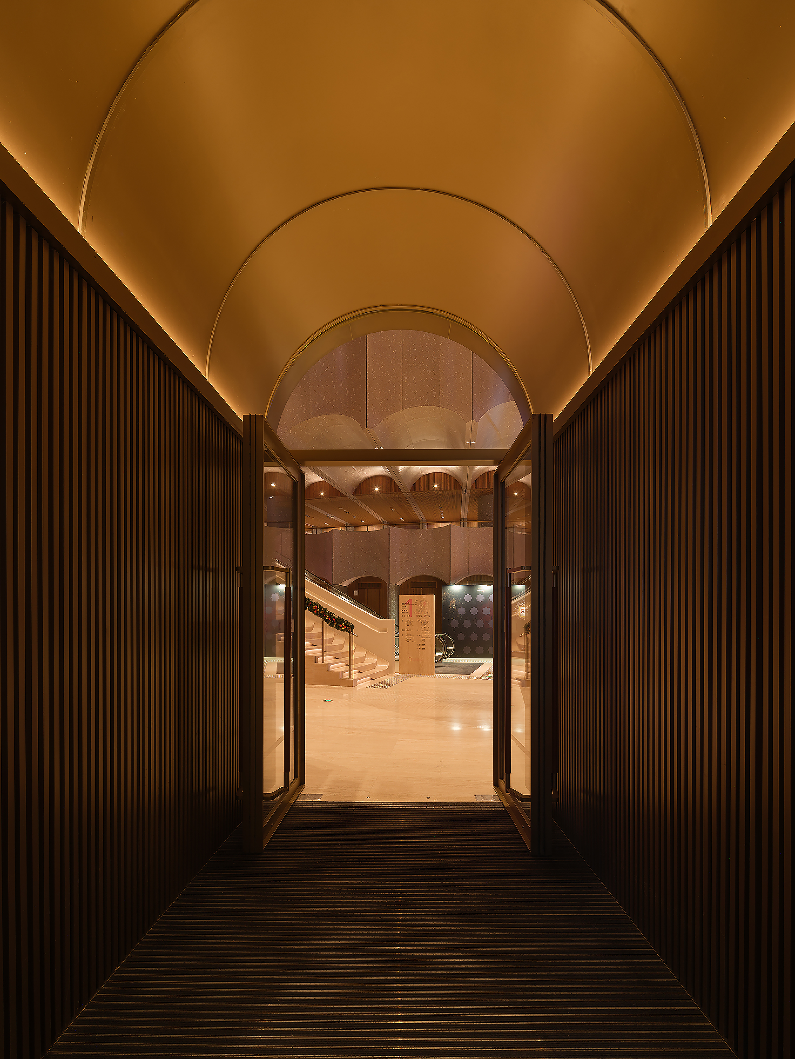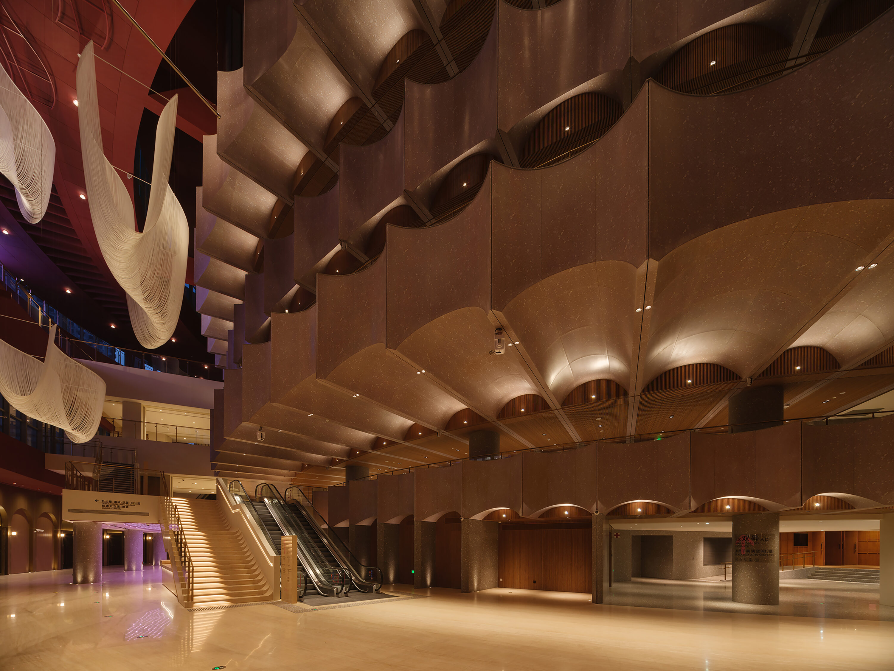 宛若“竞技场”的剧院空间,用现代的照明理念致敬传统的空间想象。 特殊的洗墙灯将拱形完美的照亮,光从层层叠叠的拱形溢出,环绕整个空间。不同楼层穿行的观众同时也成为了剧场空间的演员。 剧院观众厅拱形的墙面肌理,灯光则呈现出更为灵动的状态,背透光通过编程实现与音乐同步,表演前的候场时间不再单调,情绪被灯光慢慢催化,形成独特的观演体验。