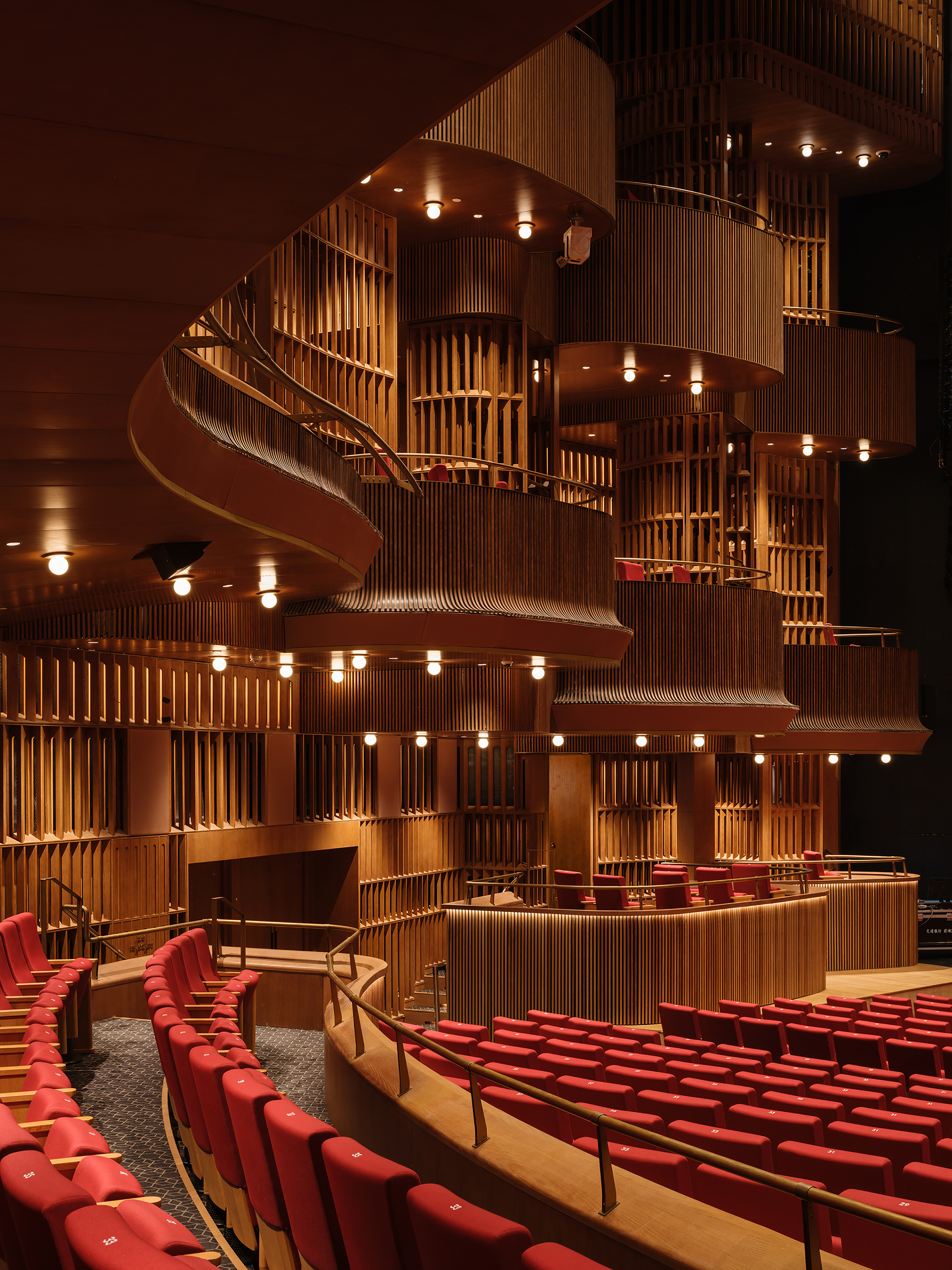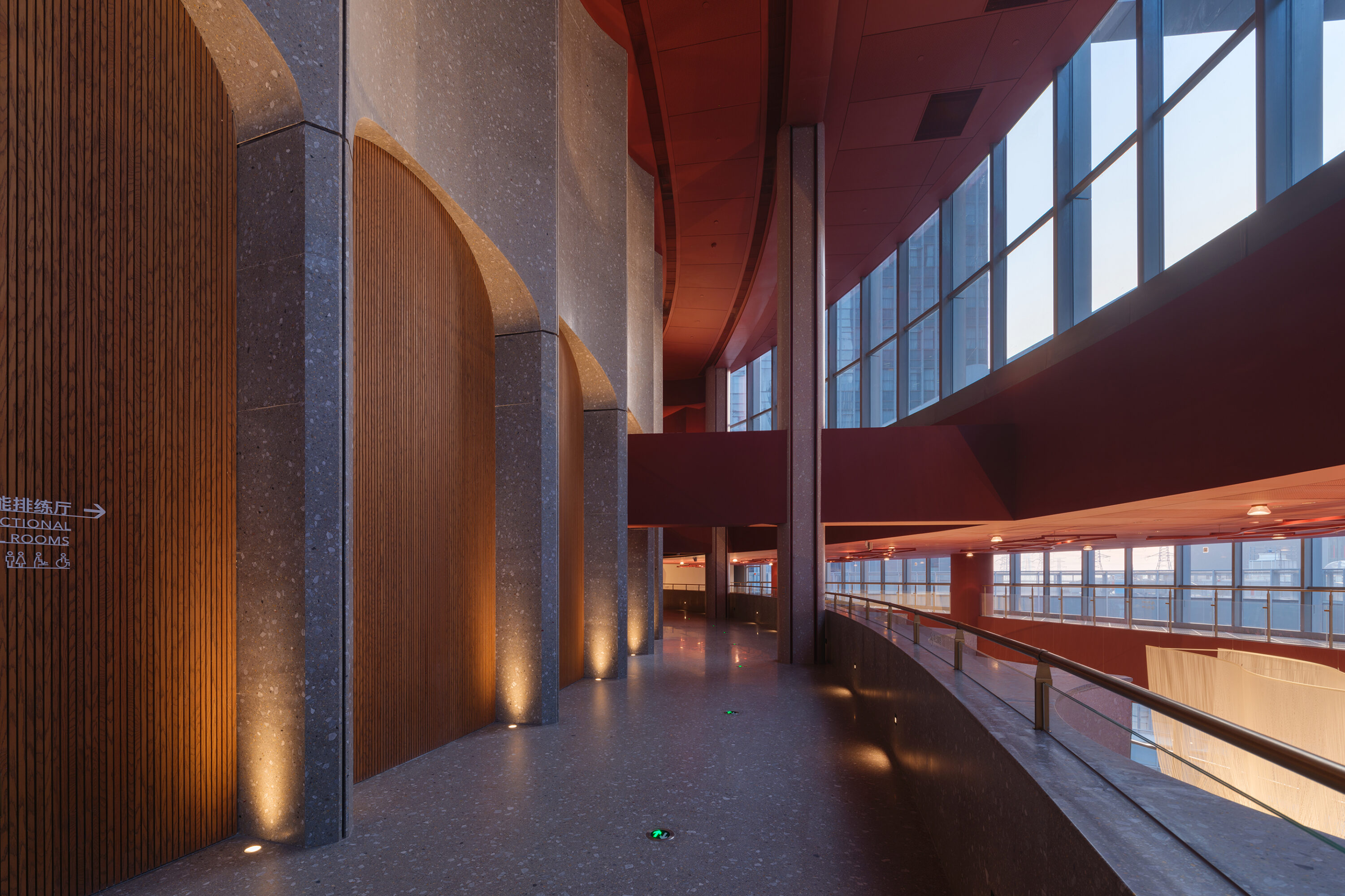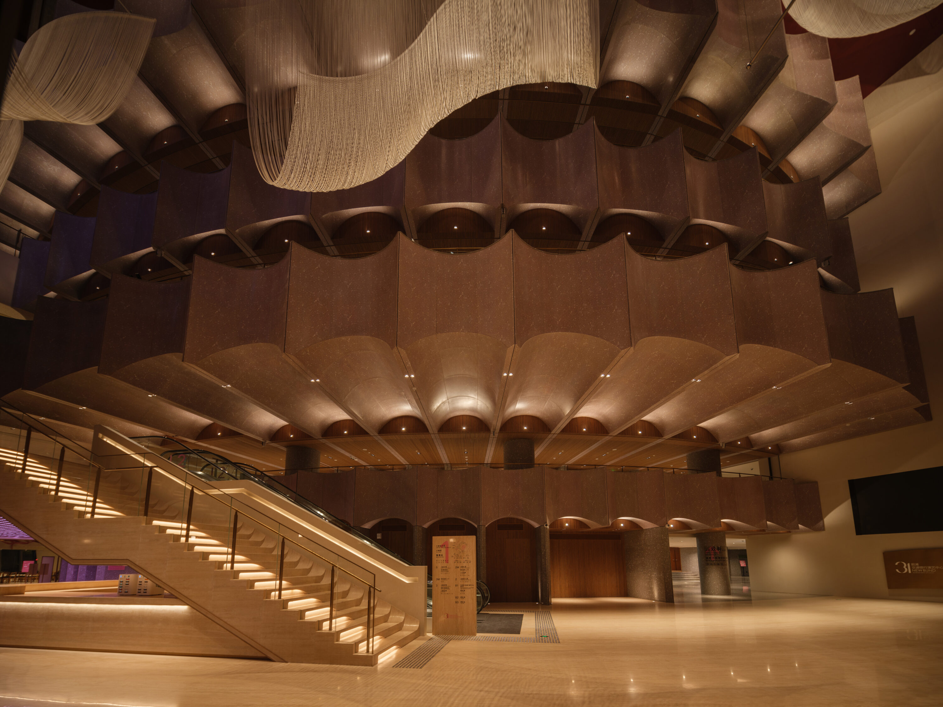 宛若“竞技场”的剧院空间,用现代的照明理念致敬传统的空间想象。 特殊的洗墙灯将拱形完美的照亮,光从层层叠叠的拱形溢出,环绕整个空间。不同楼层穿行的观众同时也成为了剧场空间的演员。 剧院观众厅拱形的墙面肌理,灯光则呈现出更为灵动的状态,背透光通过编程实现与音乐同步,表演前的候场时间不再单调,情绪被灯光慢慢催化,形成独特的观演体验。