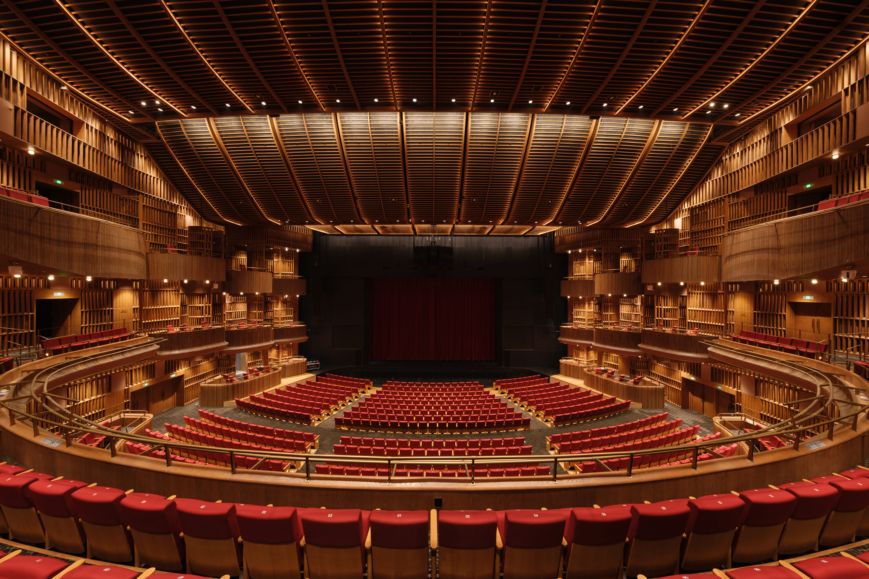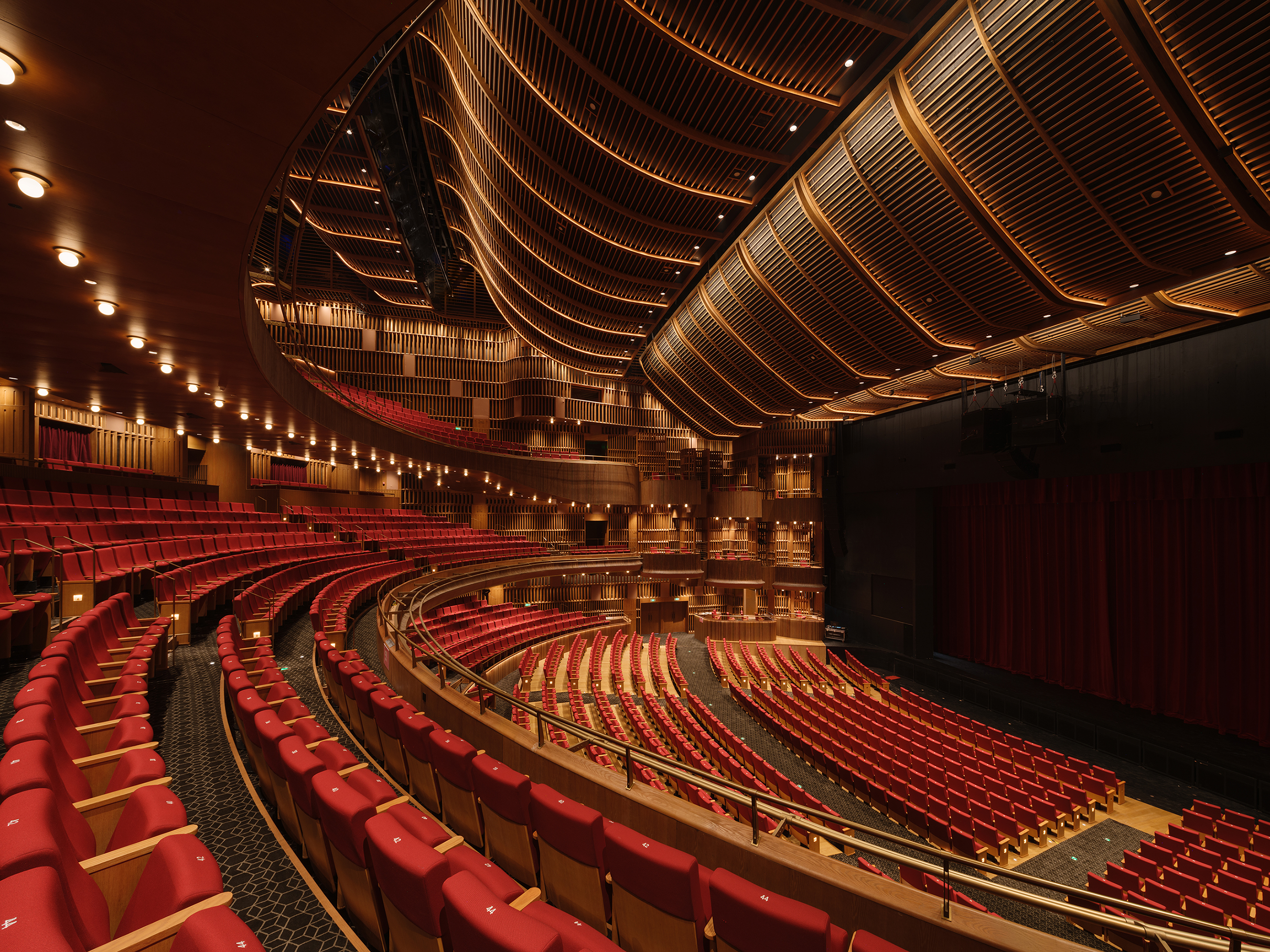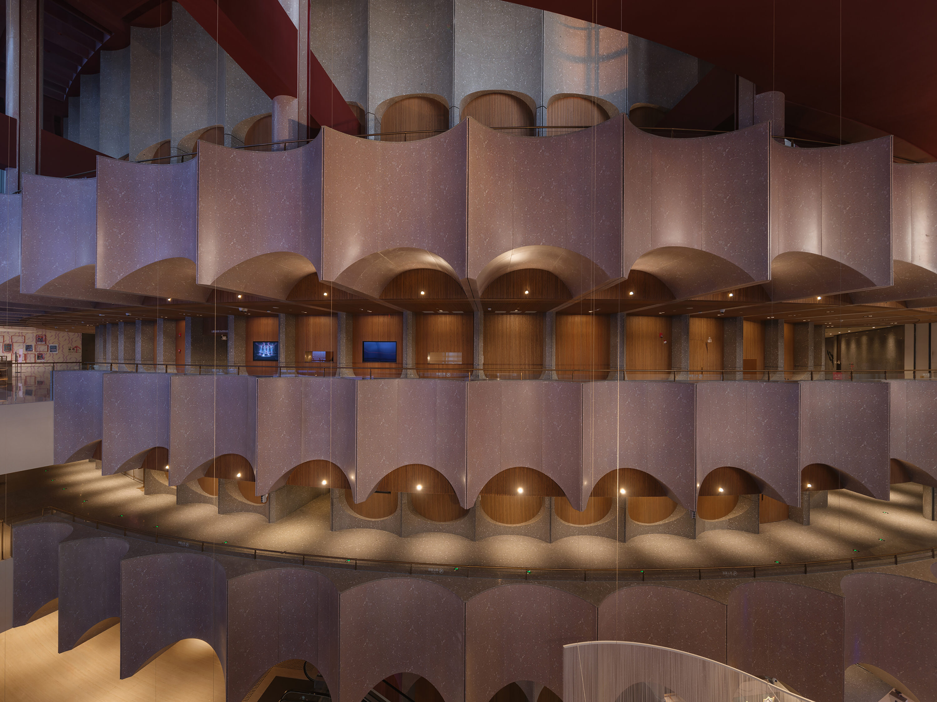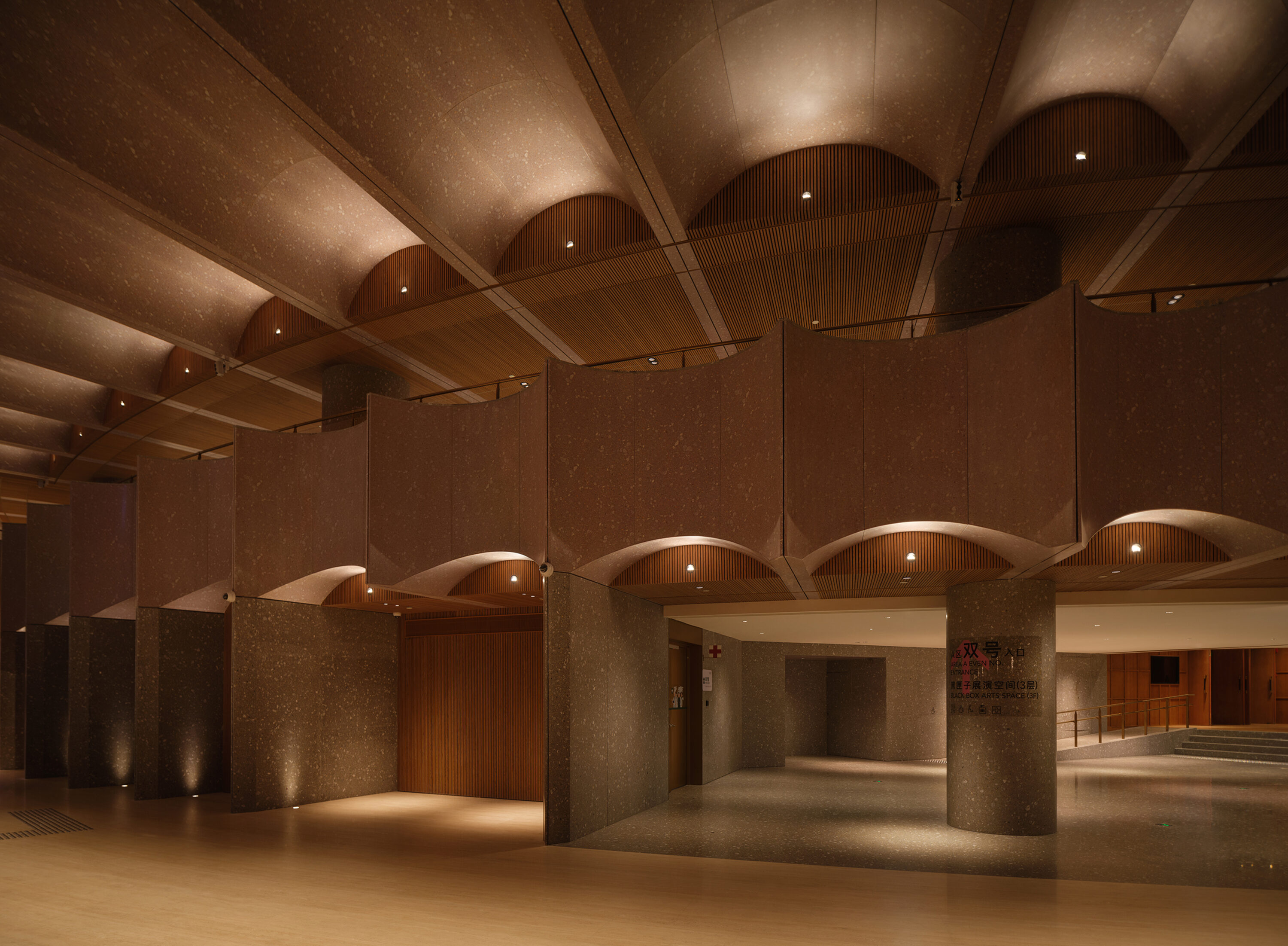 宛若“竞技场”的剧院空间,用现代的照明理念致敬传统的空间想象。 特殊的洗墙灯将拱形完美的照亮,光从层层叠叠的拱形溢出,环绕整个空间。不同楼层穿行的观众同时也成为了剧场空间的演员。 剧院观众厅拱形的墙面肌理,灯光则呈现出更为灵动的状态,背透光通过编程实现与音乐同步,表演前的候场时间不再单调,情绪被灯光慢慢催化,形成独特的观演体验。