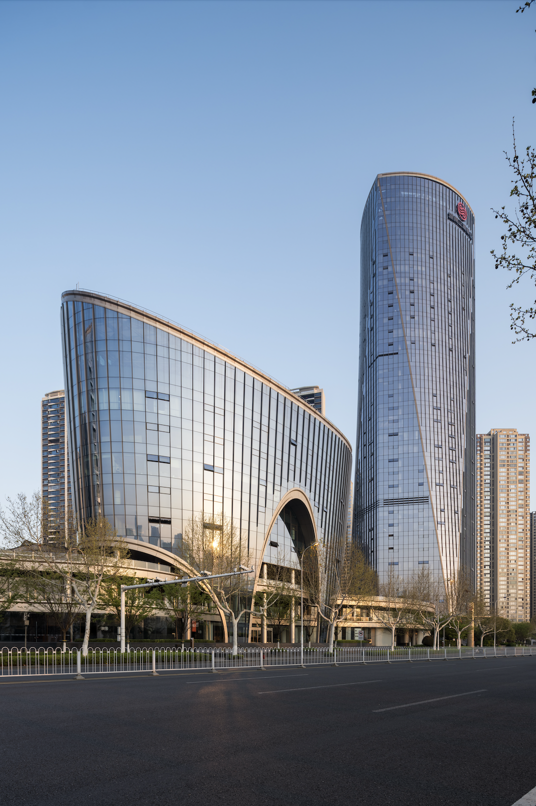建筑打破传统对称构图,通过偏移、曲线与尺度对比,生成非均质场地策略。整体由滨江空中花园与架空式公共平台组织为连续系统,塔楼之间穿插大尺度拱廊,形成多层次的流动界面。理性构图中,空间承载对城市边界、机构象征与社会体验的回应,体现贝氏建筑在当代表达中的持续张力与演化。