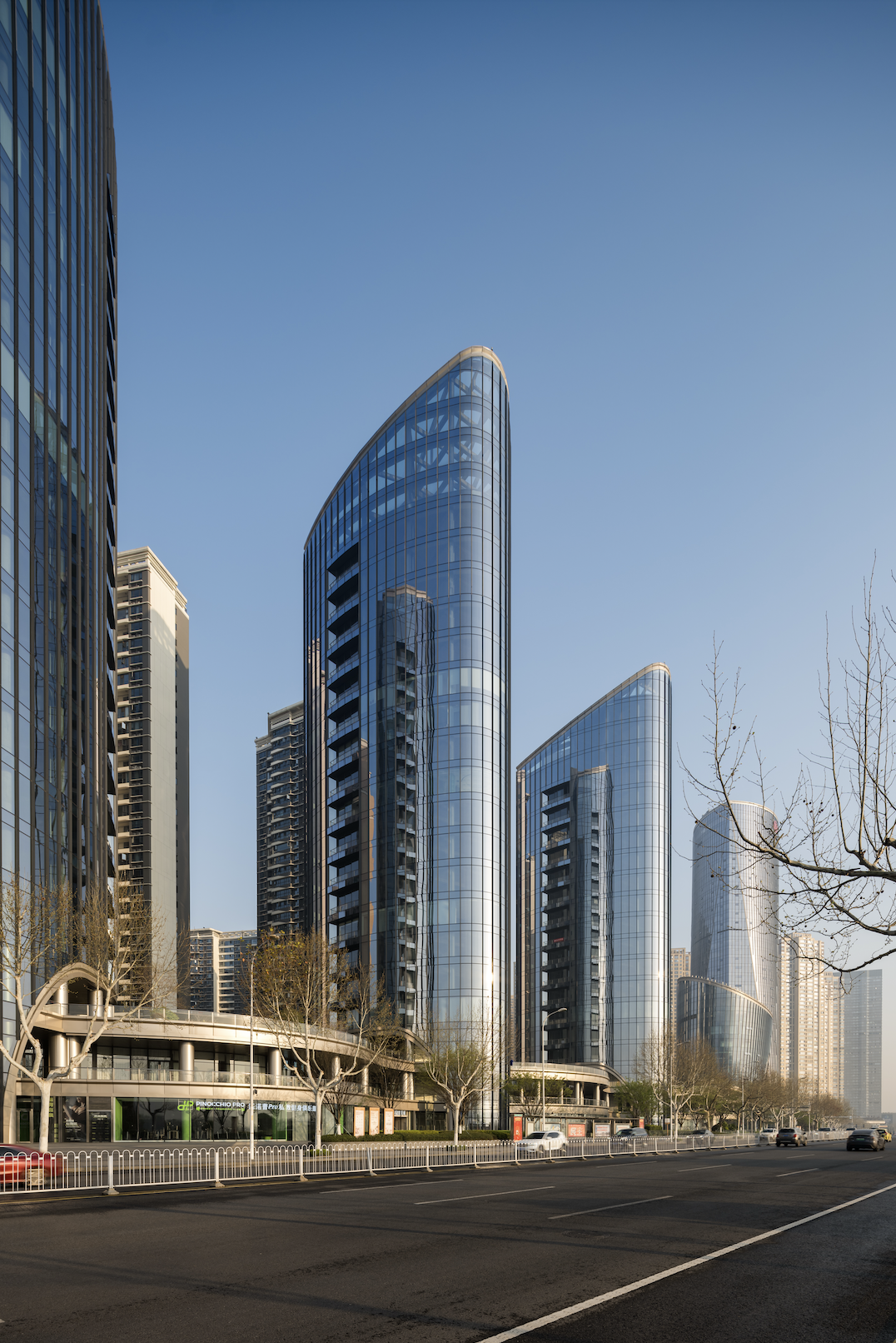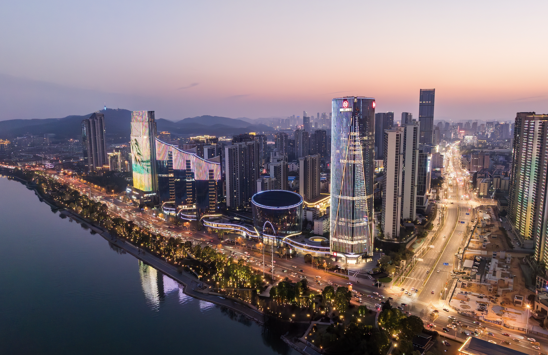 三湘一品位于长沙湘江东岸金融核心地段,是在限高、视线与滨水界面等多重挑战下展开的金融总部综合开发实践。项目以北区旋转上升的主塔确立金融锚点,辅以椭锥副楼与南区三座曲面塔楼,构成非对称、张力充沛的几何体系,围合出流动而开放的城市空间。
