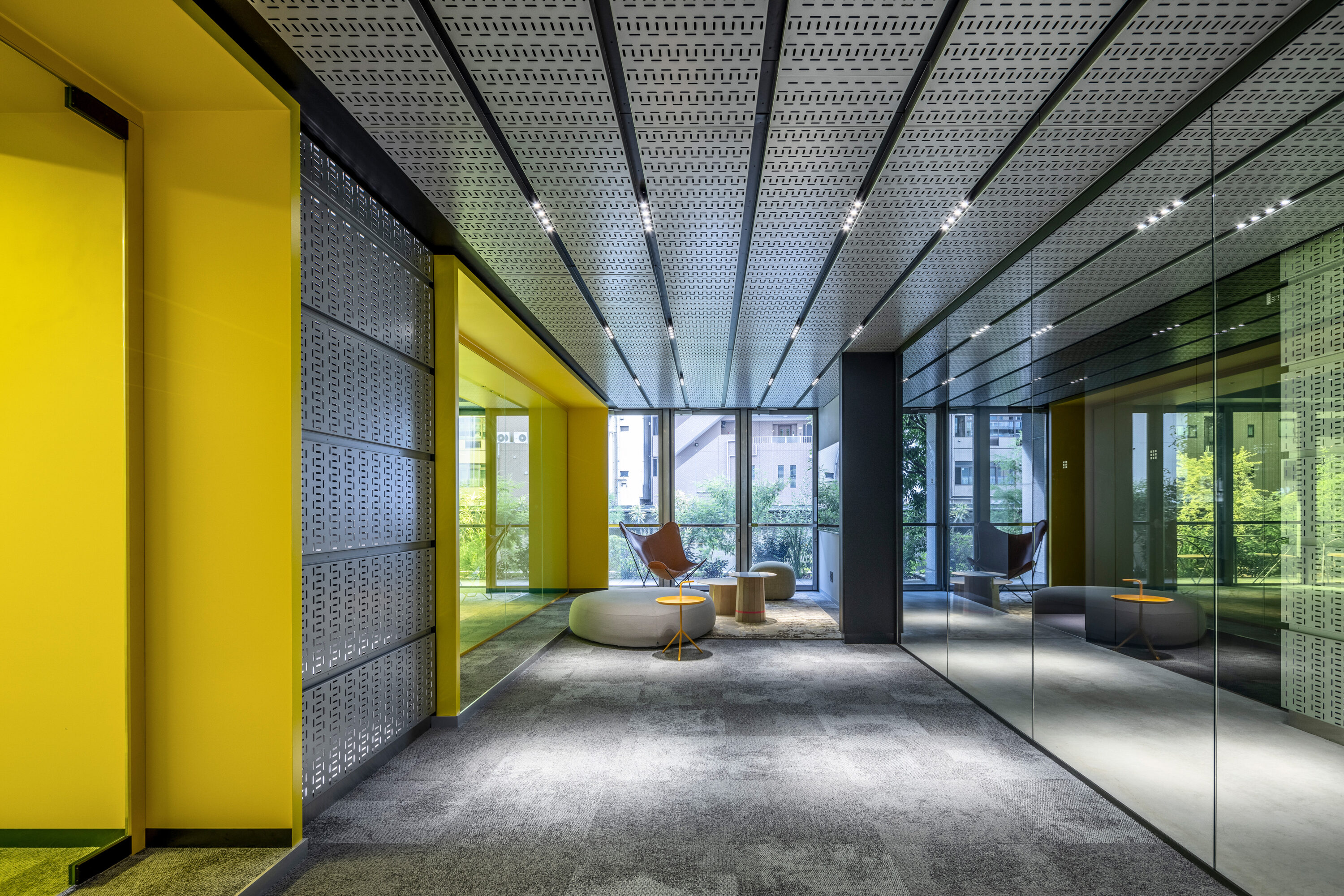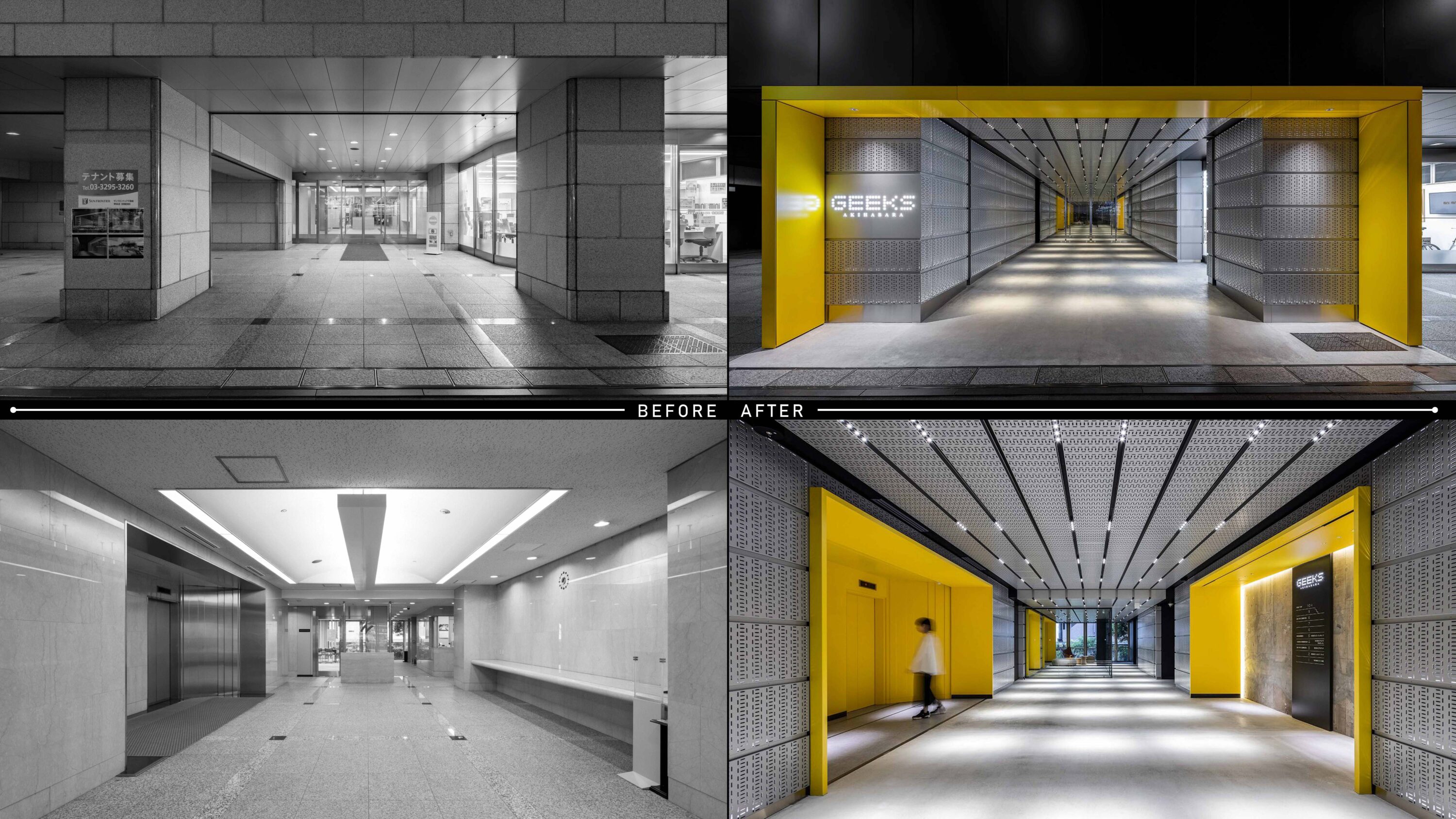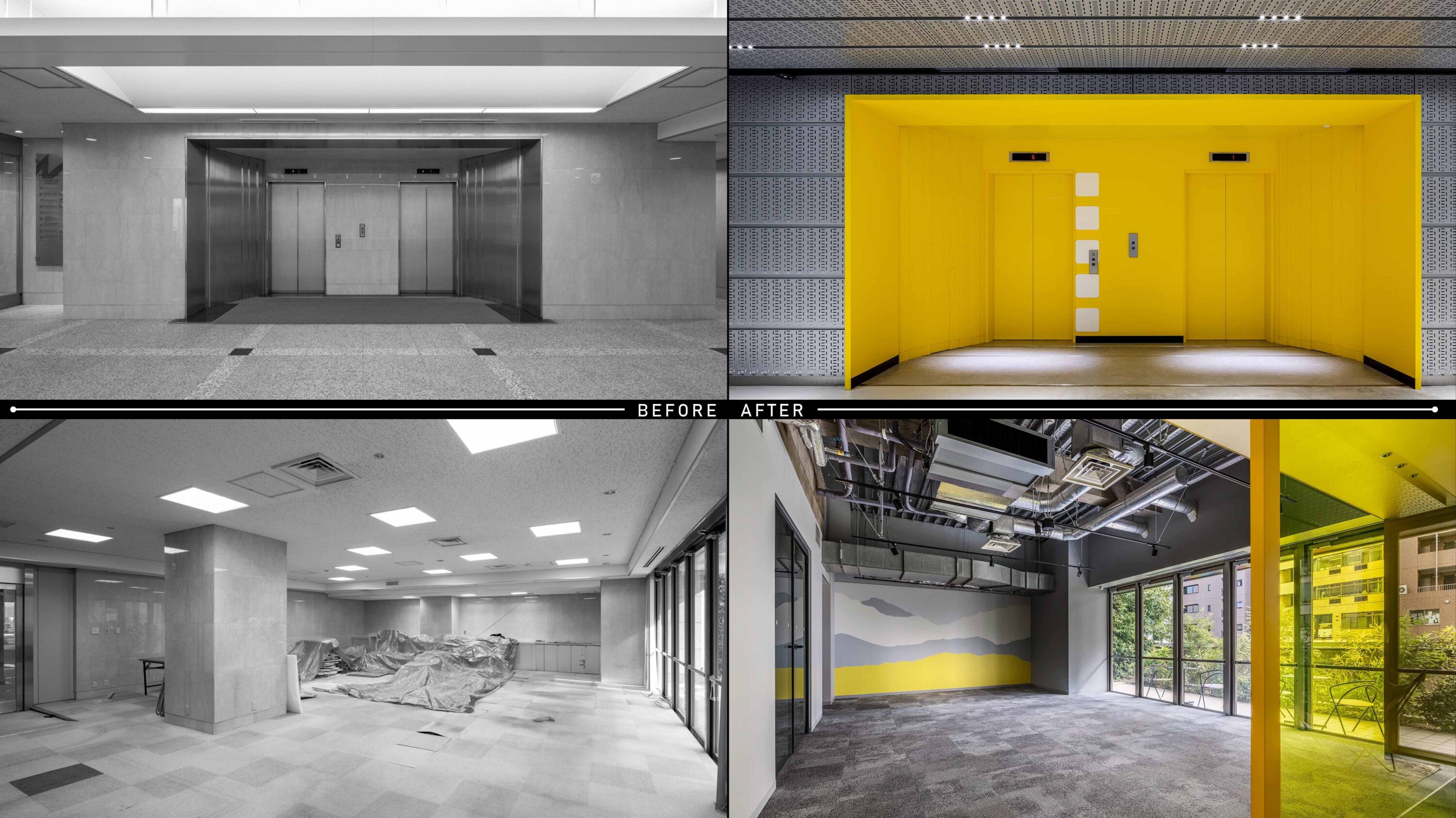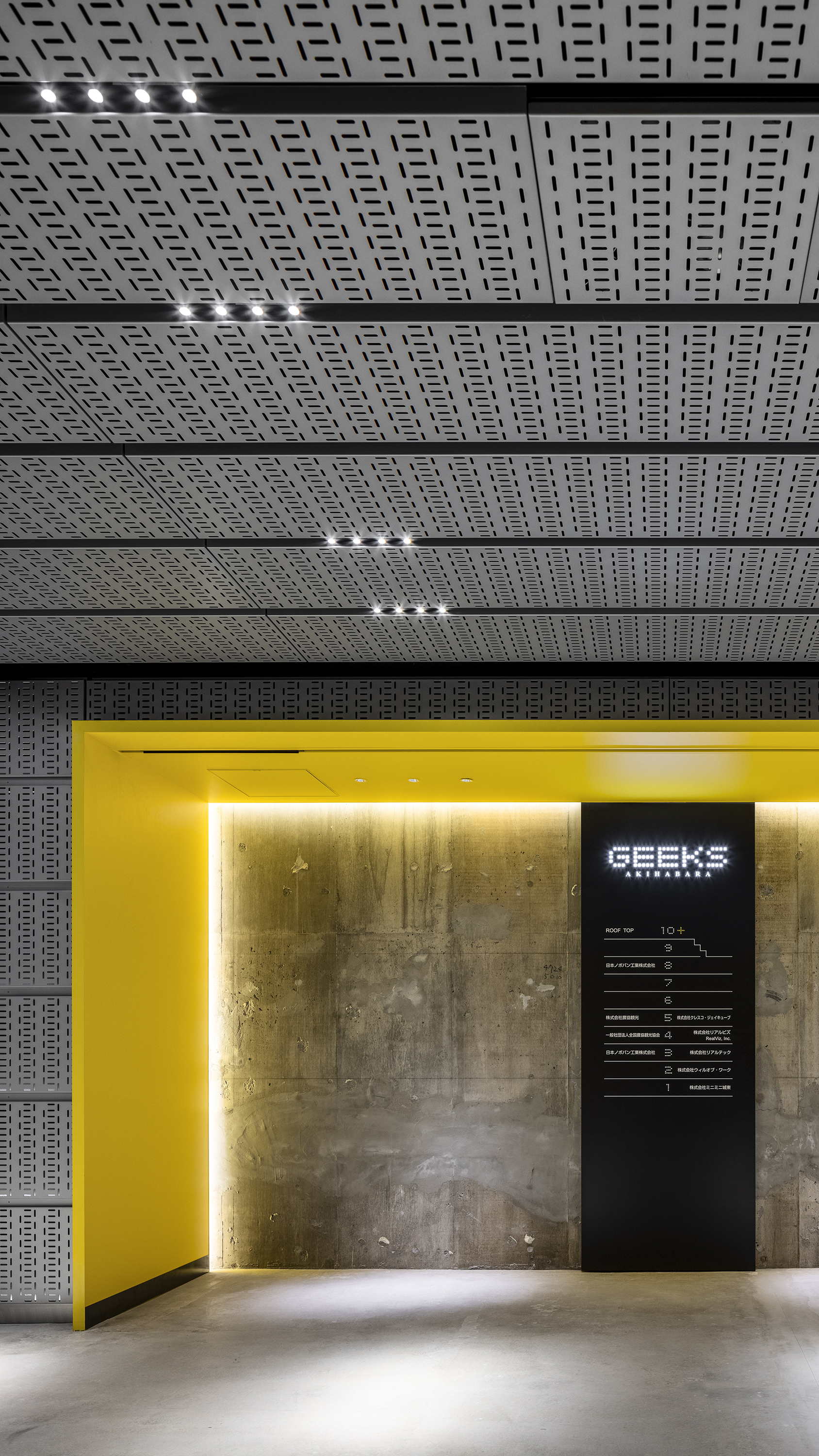 这是一个租赁式办公楼的品牌重塑项目。该项目将秋叶原地区所具有的能量与热情以及从用户内部渗透出的活力与热量变换成“黄色”,以可视化的形式将建筑外立面升华为城市的标志。入口处的天花板和墙面上采用了一般不用作装饰材料的设备布线用电缆梯架,通过连接到电梯厅的动态构成与利用冲孔开口的间接照明,使空间焕然一新,让人感受到与城市的连接。通过充满活力的全新设计,为开创新天地的人们打造了一个“起点”空间。