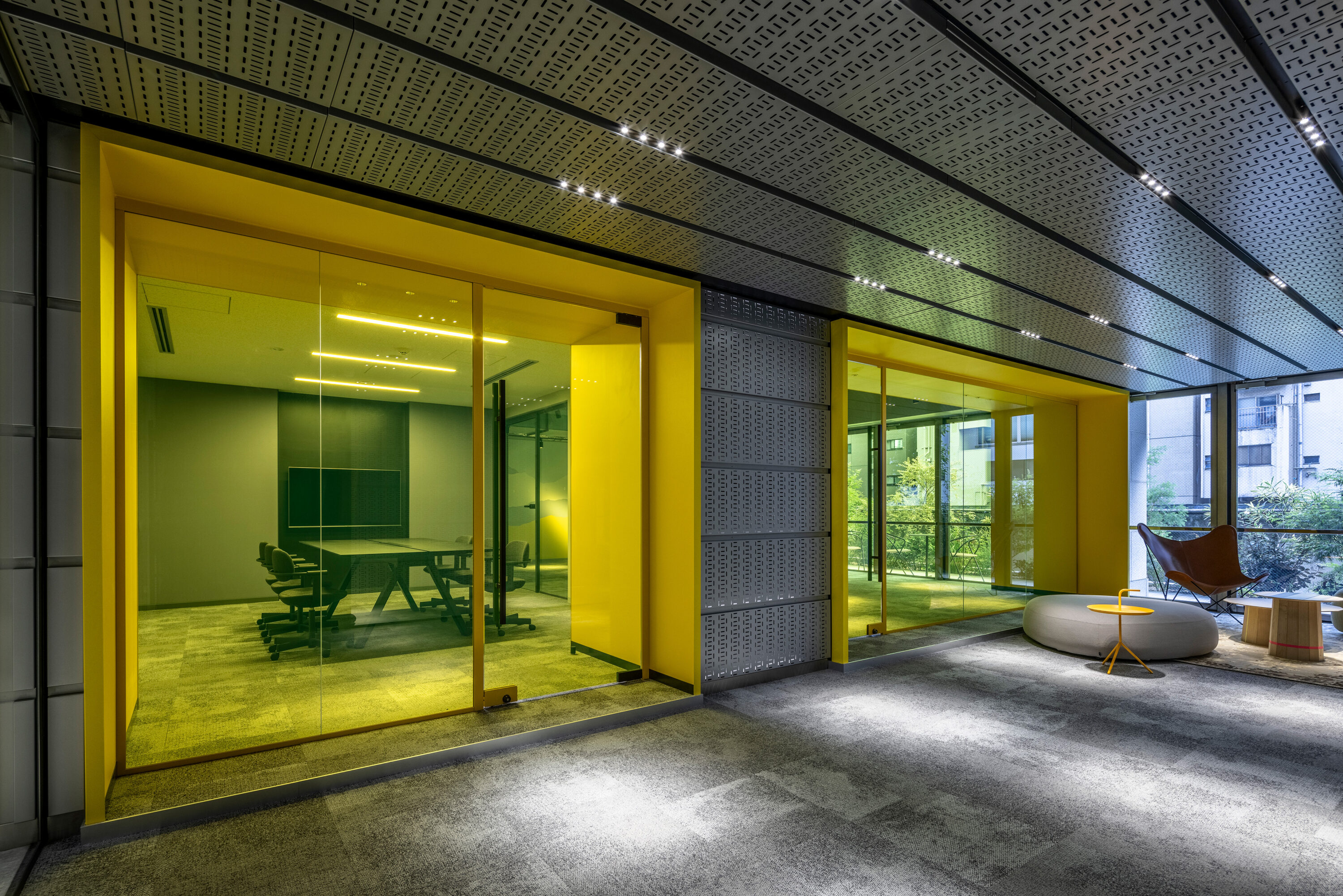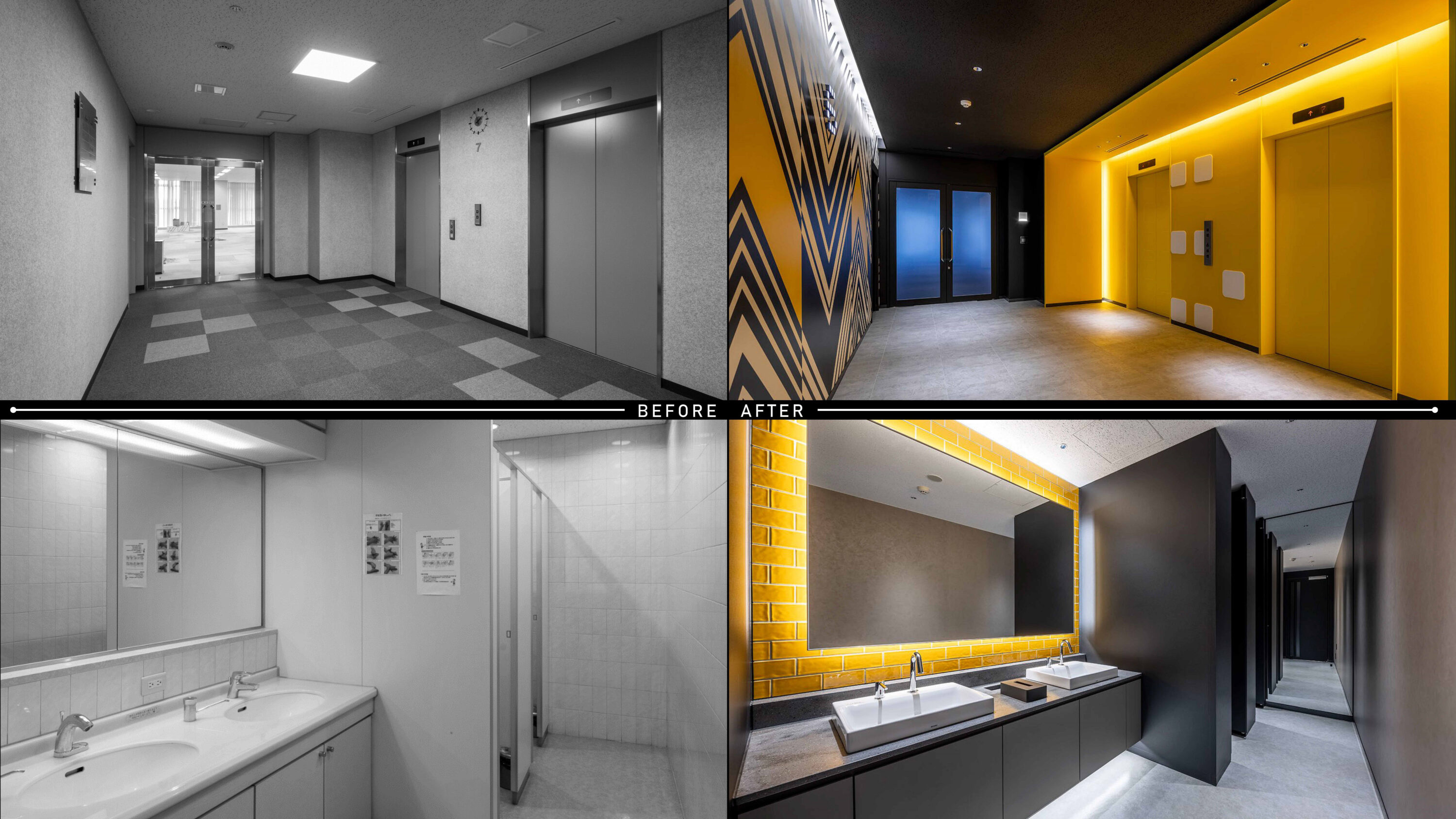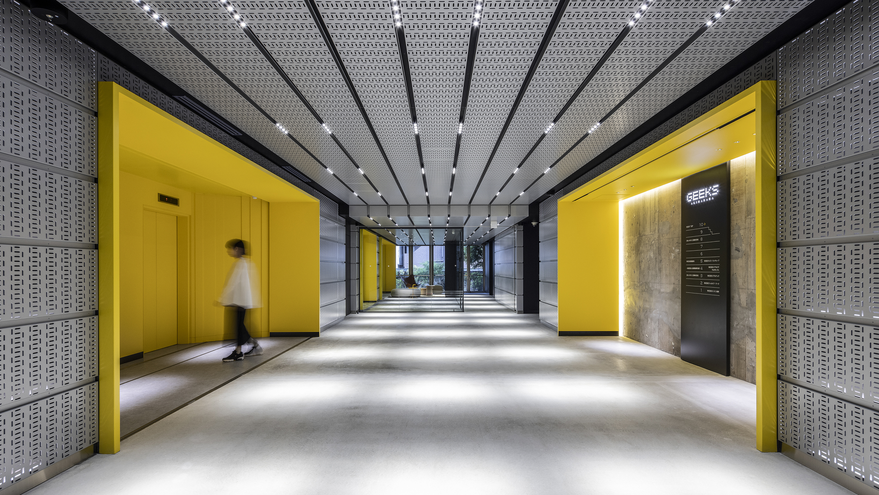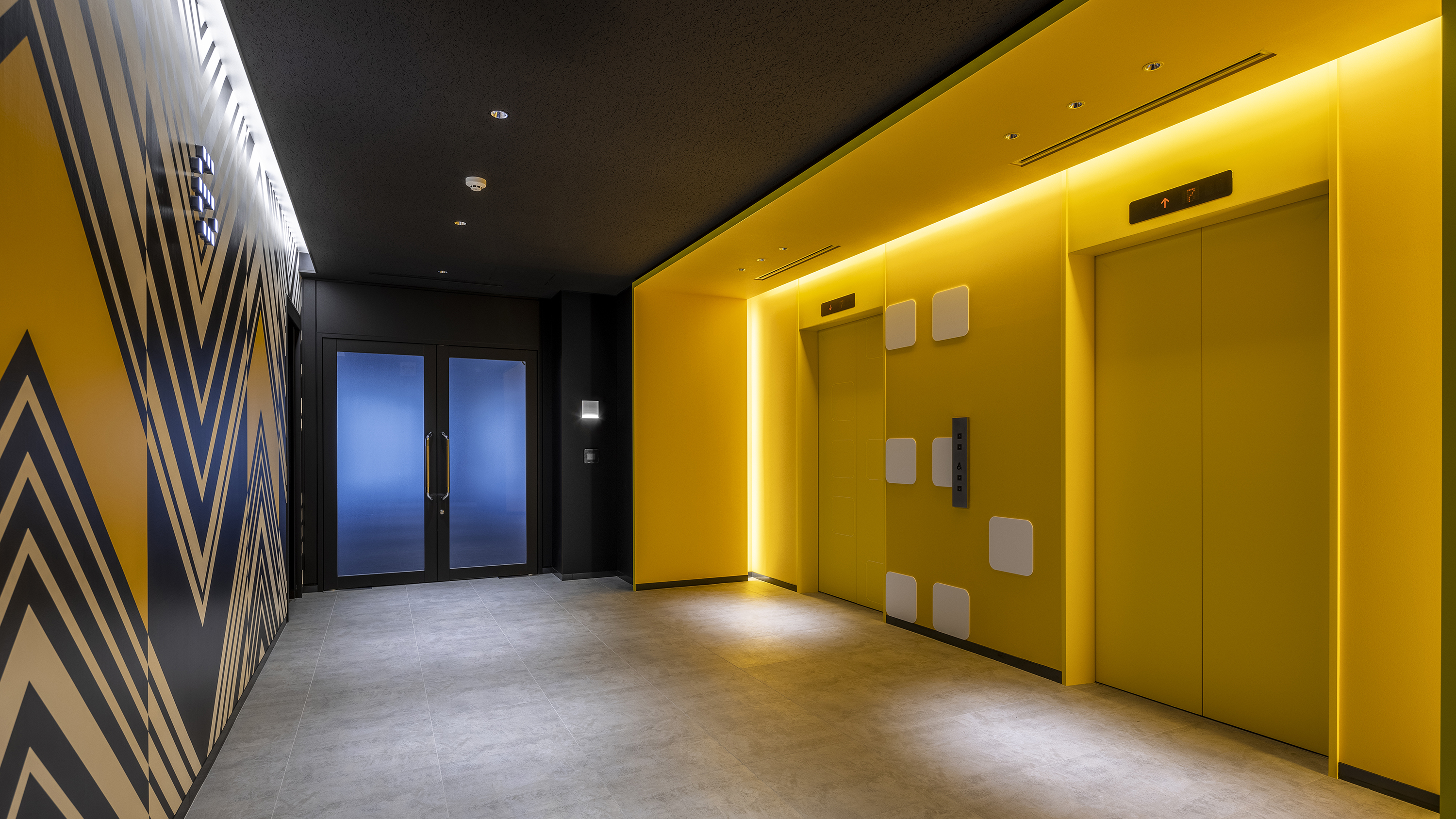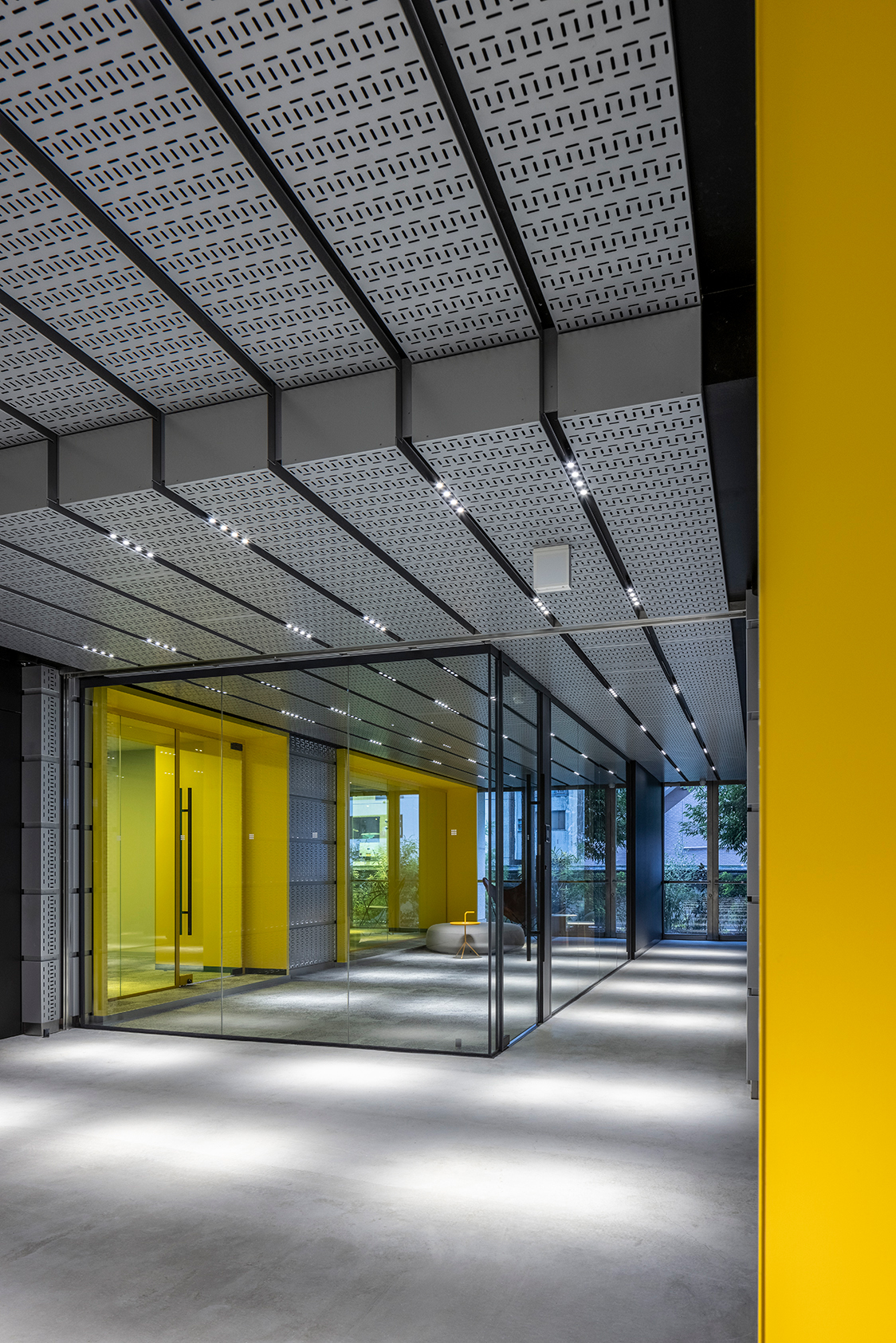 这是一个租赁式办公楼的品牌重塑项目。该项目将秋叶原地区所具有的能量与热情以及从用户内部渗透出的活力与热量变换成“黄色”,以可视化的形式将建筑外立面升华为城市的标志。入口处的天花板和墙面上采用了一般不用作装饰材料的设备布线用电缆梯架,通过连接到电梯厅的动态构成与利用冲孔开口的间接照明,使空间焕然一新,让人感受到与城市的连接。通过充满活力的全新设计,为开创新天地的人们打造了一个“起点”空间。