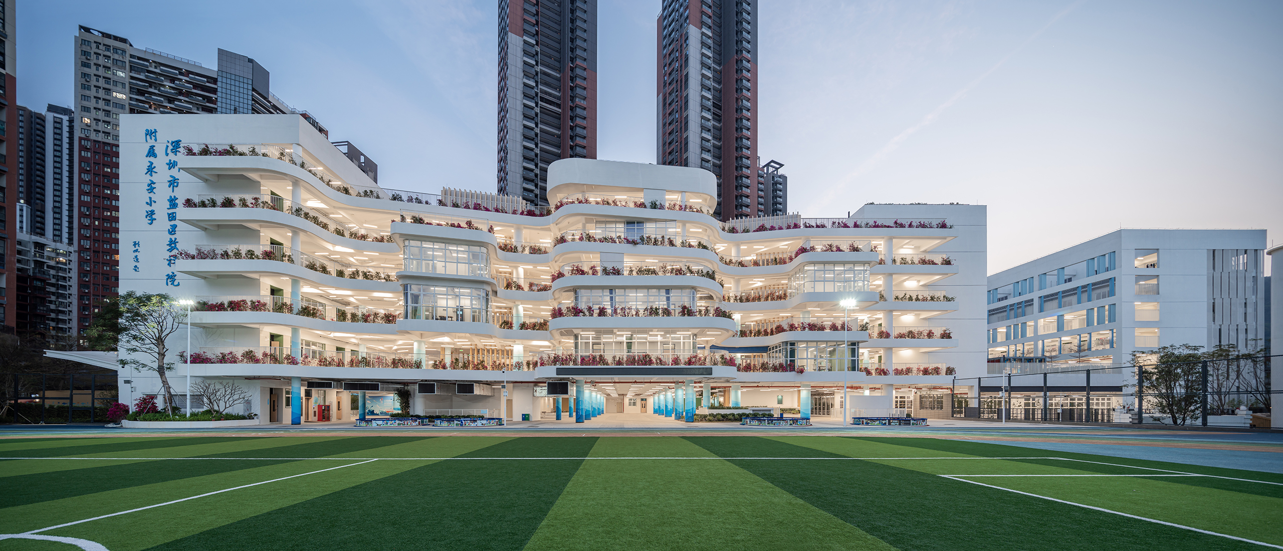 永安小学是一所建筑面积41729平方米的36班小学,位于深圳市盐田区。设计力求为高密度校园创造更适于学生轻松学习生活的场景,以曲线设计校园连廊空间,不仅创造了流动的空间效果,更为学生提供适于课件奔跑玩乐的非教学空间。设计运用白色和原木质感的材料,并在教学楼面向操场的曲线波浪式连廊空间布置立体绿化,为高密度校园提供更加自然的学习氛围。