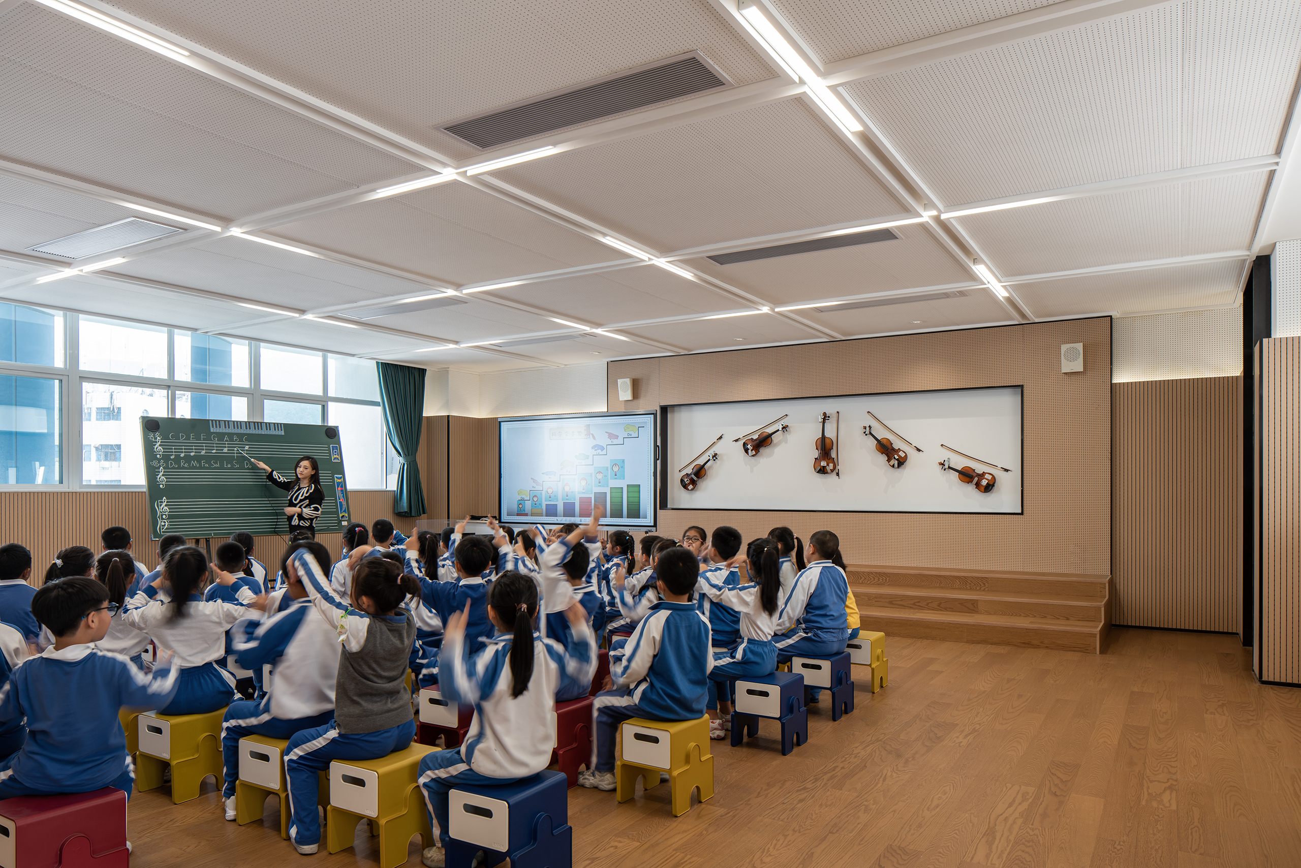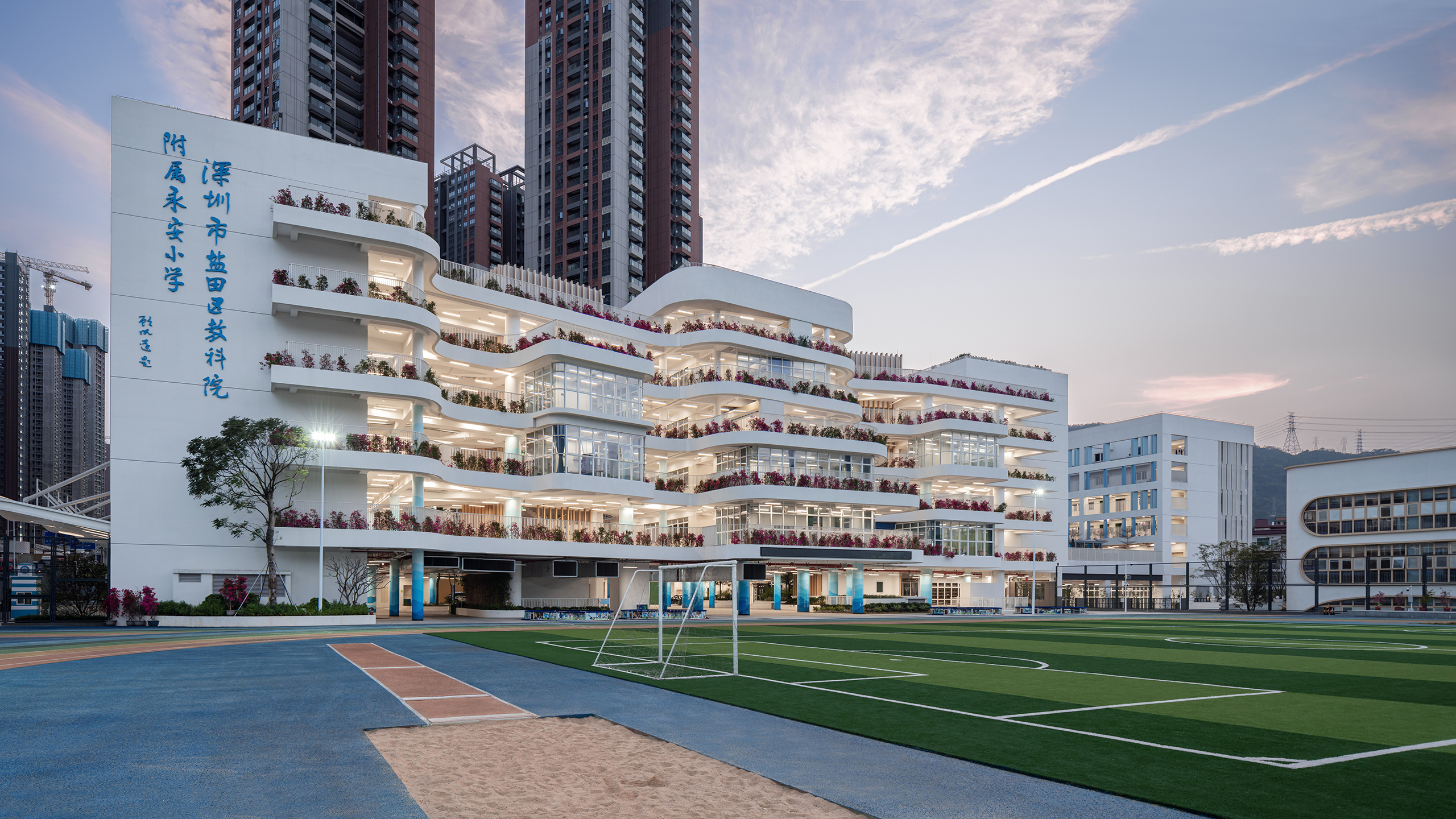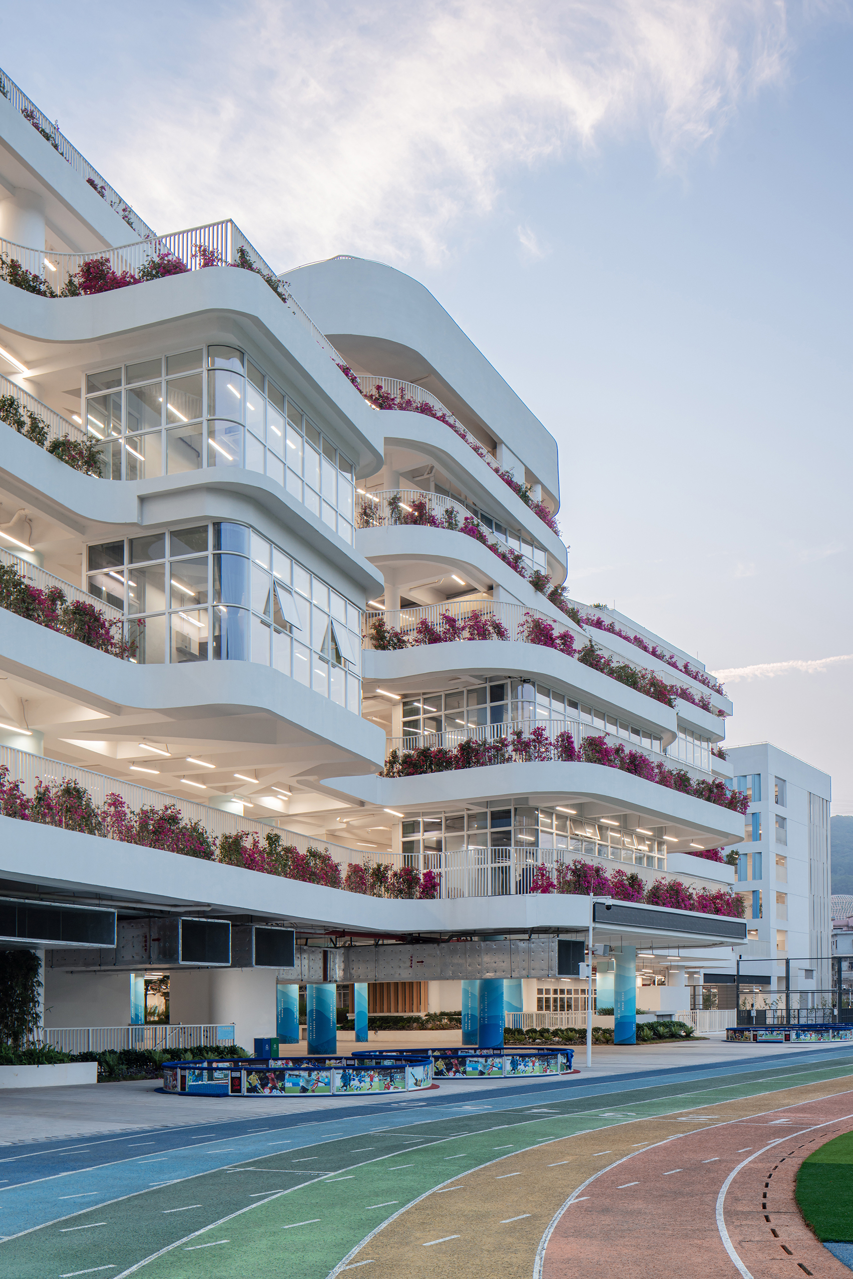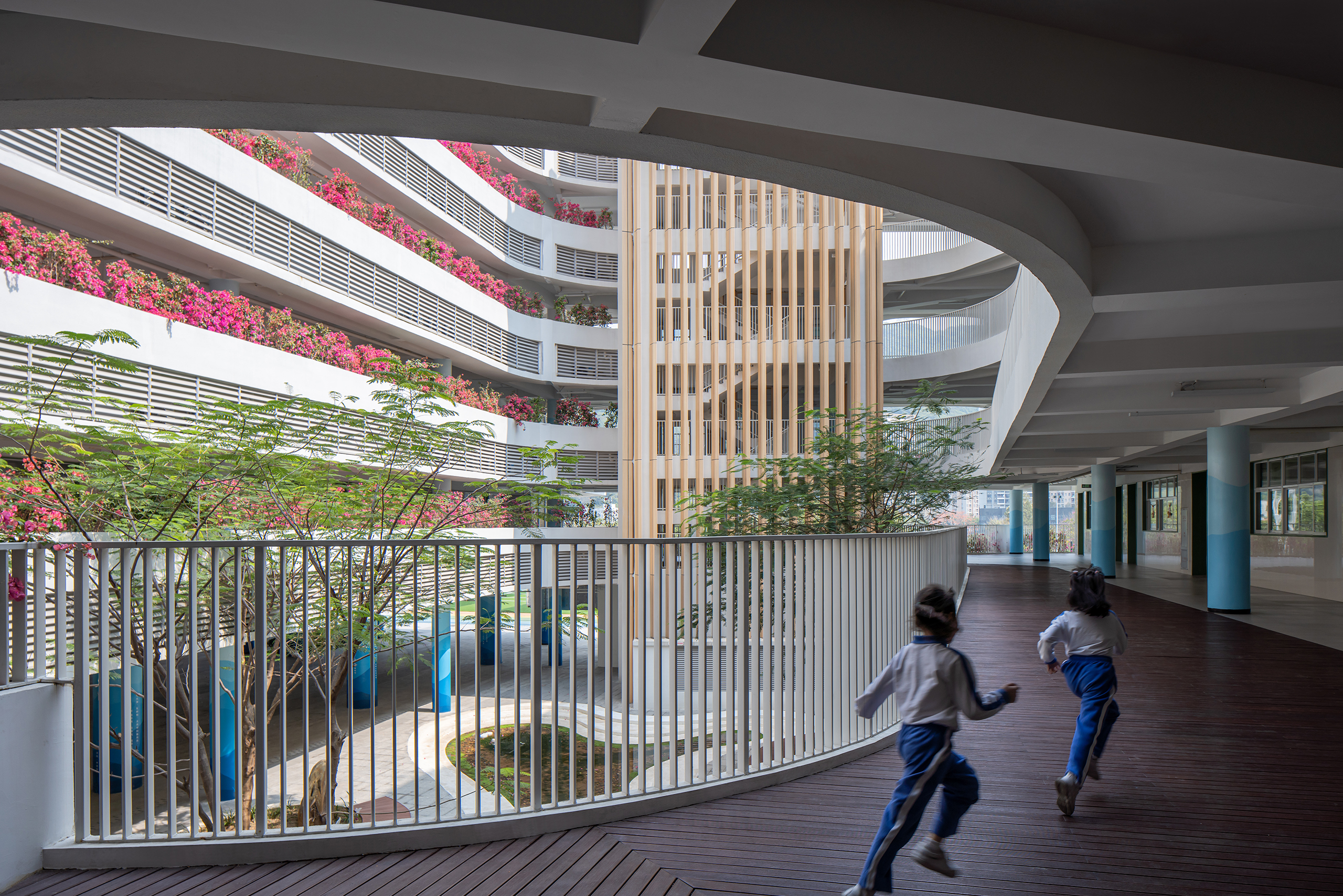 永安小学是一所建筑面积41729平方米的36班小学,位于深圳市盐田区。设计力求为高密度校园创造更适于学生轻松学习生活的场景,以曲线设计校园连廊空间,不仅创造了流动的空间效果,更为学生提供适于课件奔跑玩乐的非教学空间。设计运用白色和原木质感的材料,并在教学楼面向操场的曲线波浪式连廊空间布置立体绿化,为高密度校园提供更加自然的学习氛围。