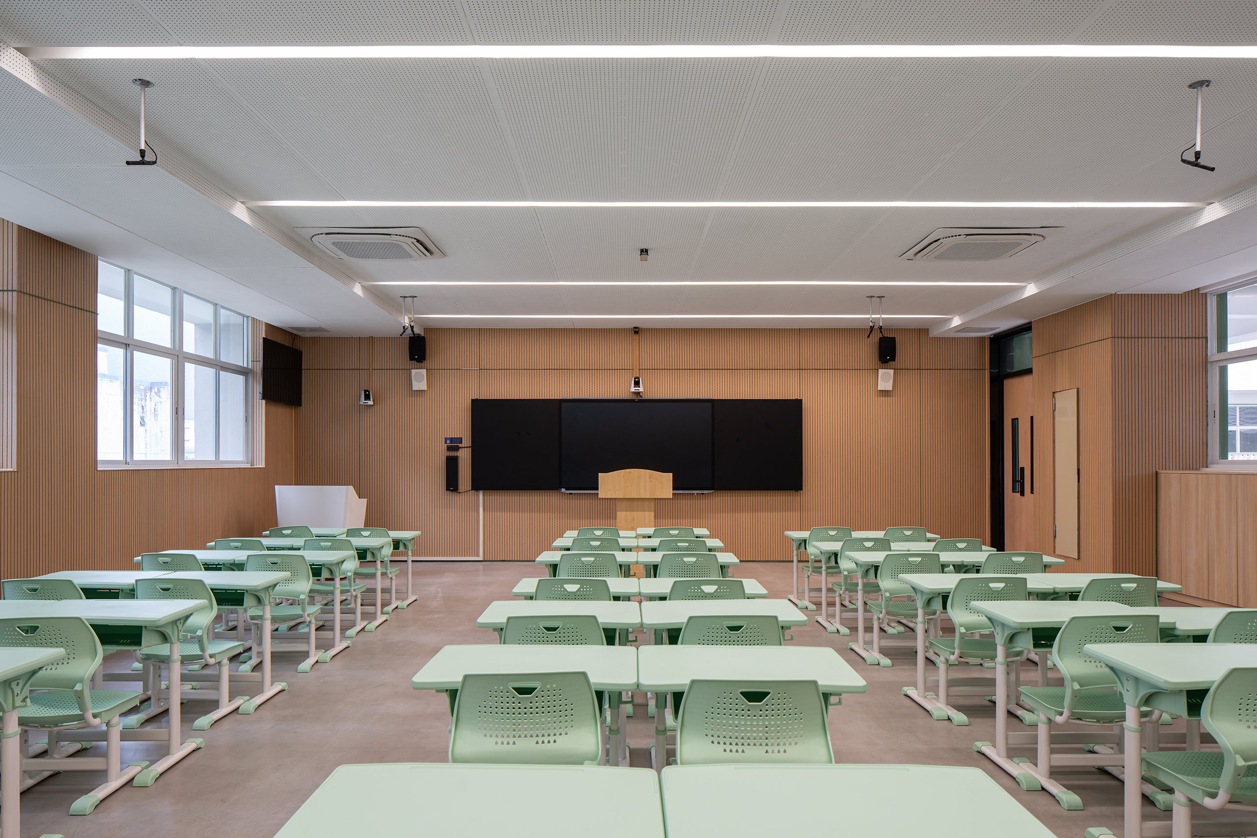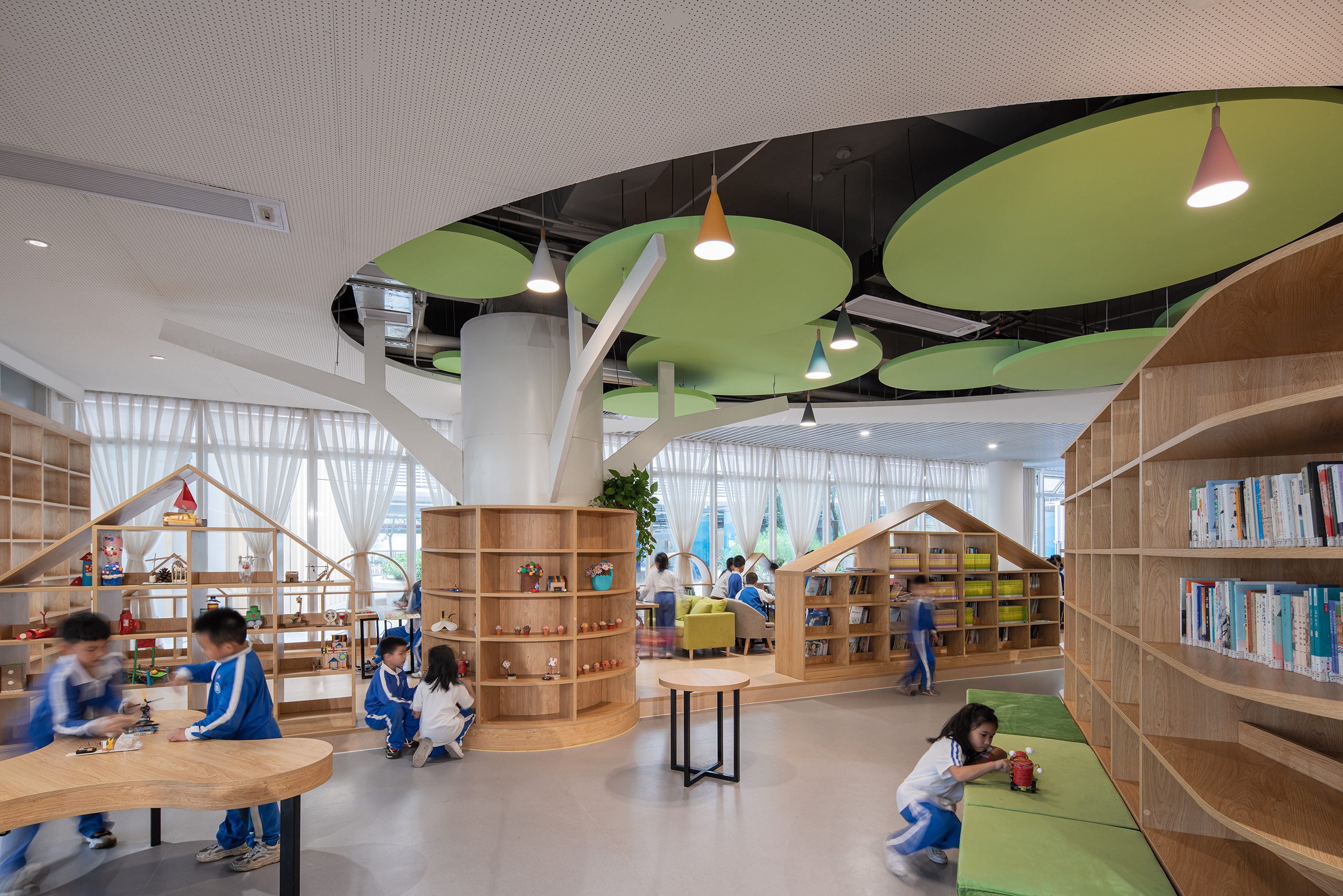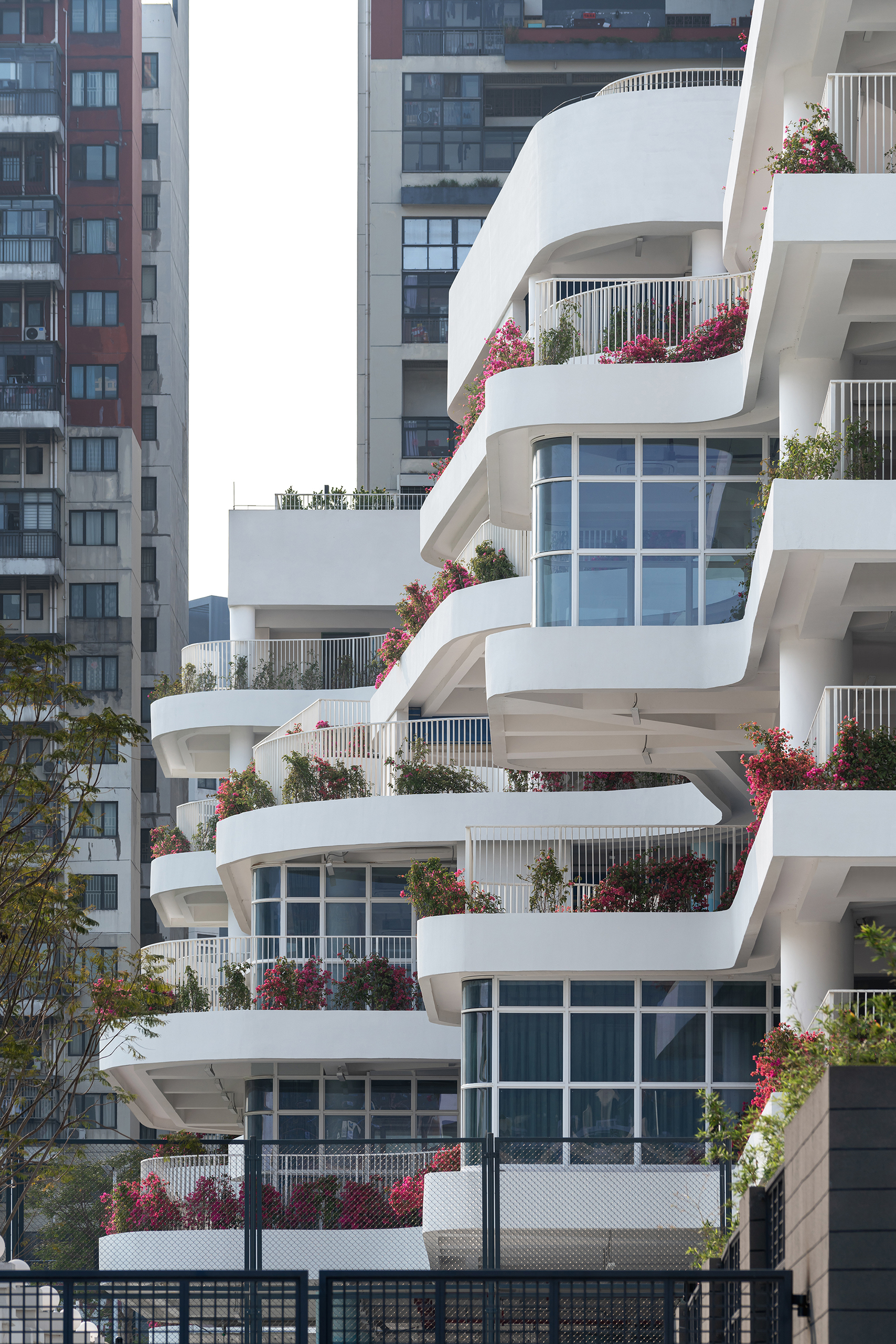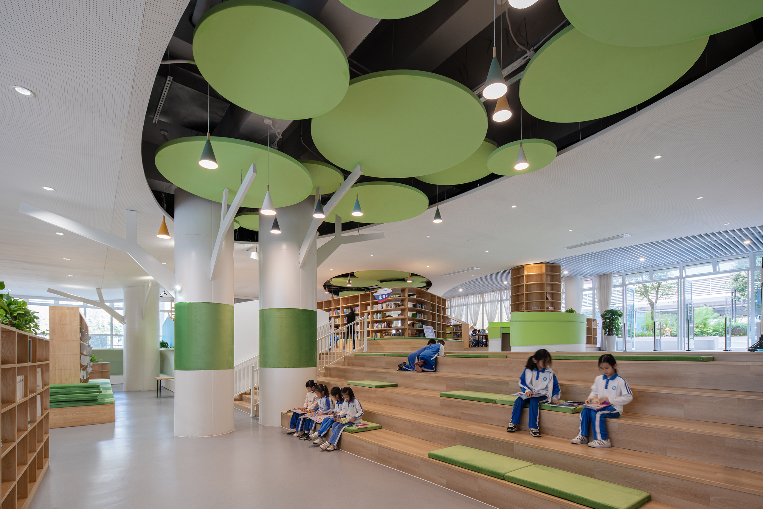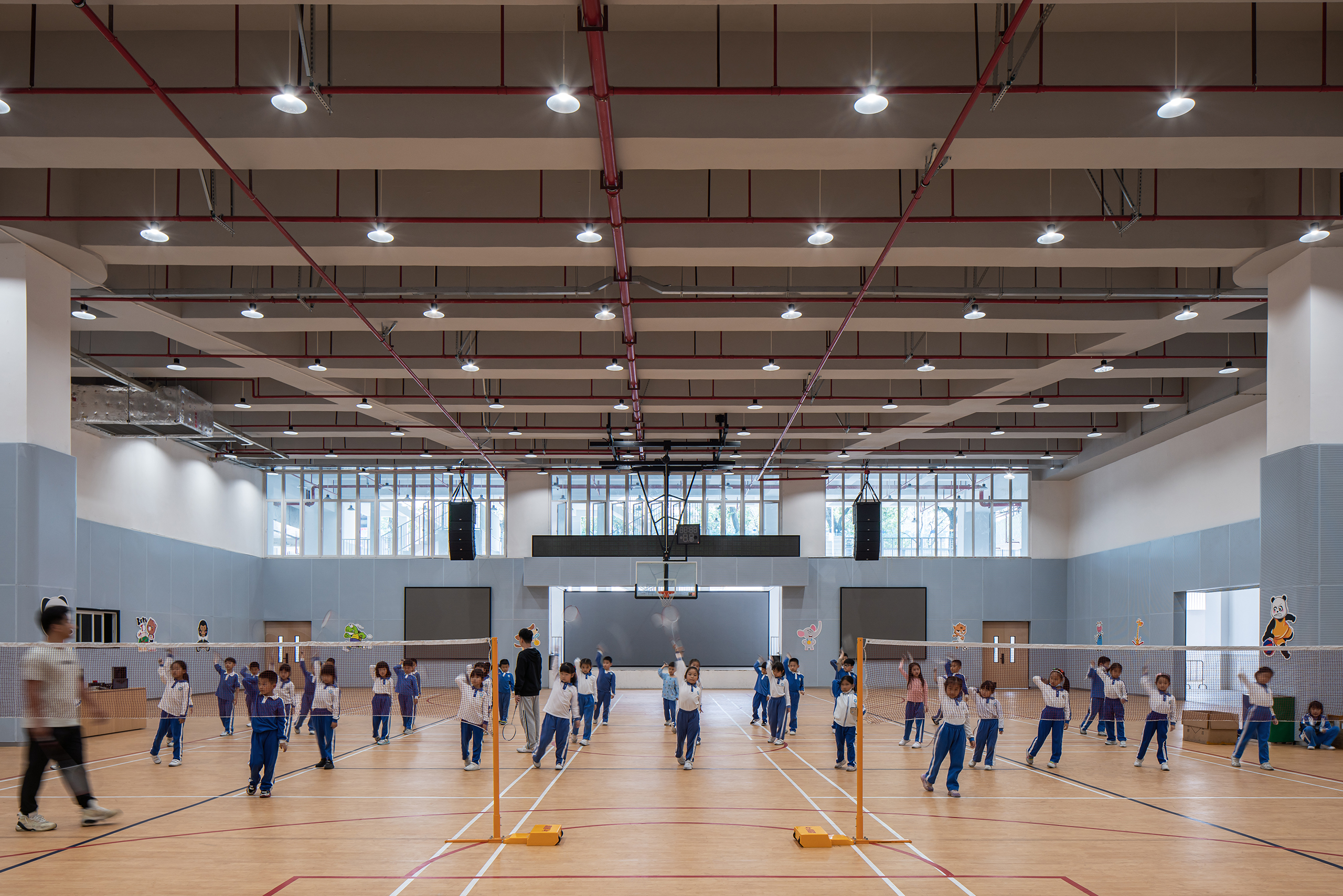 永安小学是一所建筑面积41729平方米的36班小学,位于深圳市盐田区。设计力求为高密度校园创造更适于学生轻松学习生活的场景,以曲线设计校园连廊空间,不仅创造了流动的空间效果,更为学生提供适于课件奔跑玩乐的非教学空间。设计运用白色和原木质感的材料,并在教学楼面向操场的曲线波浪式连廊空间布置立体绿化,为高密度校园提供更加自然的学习氛围。