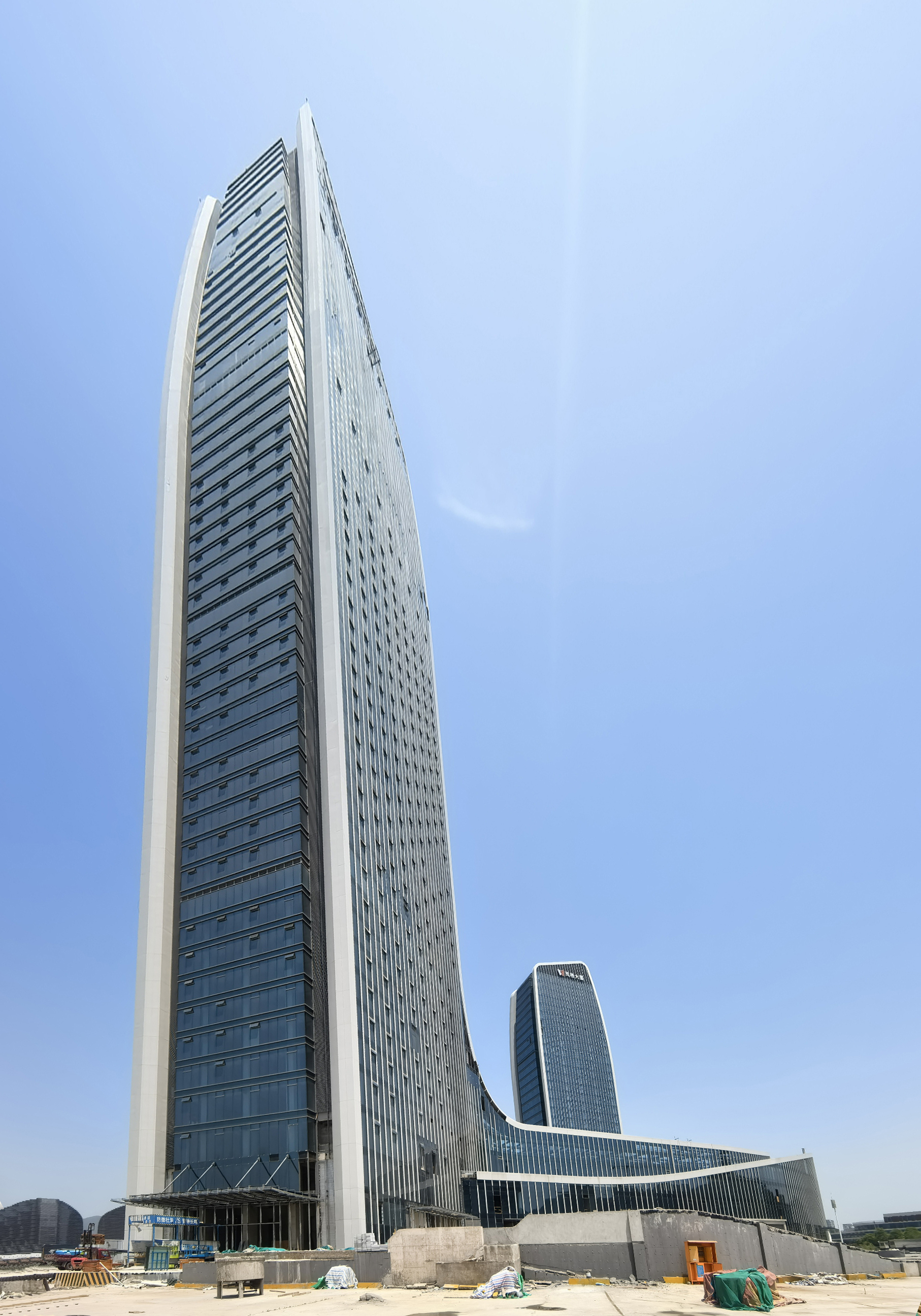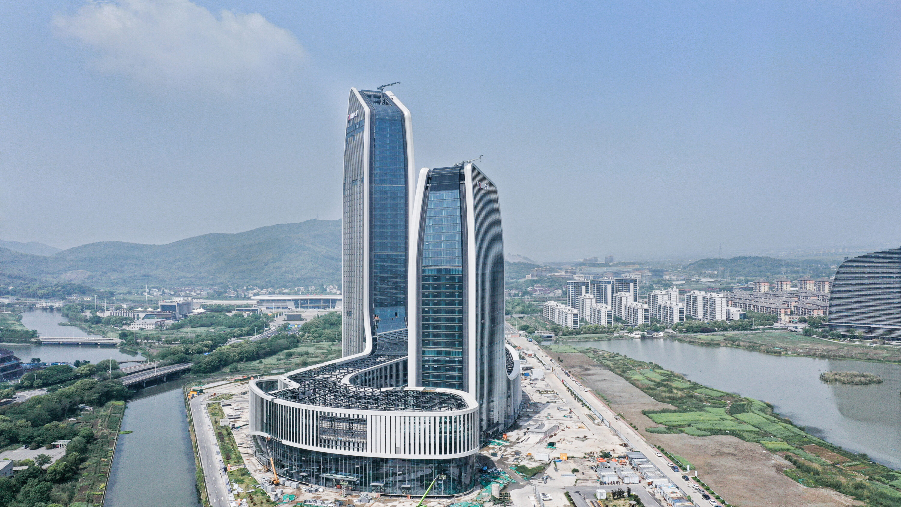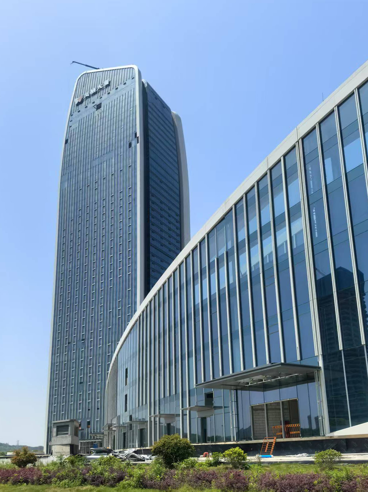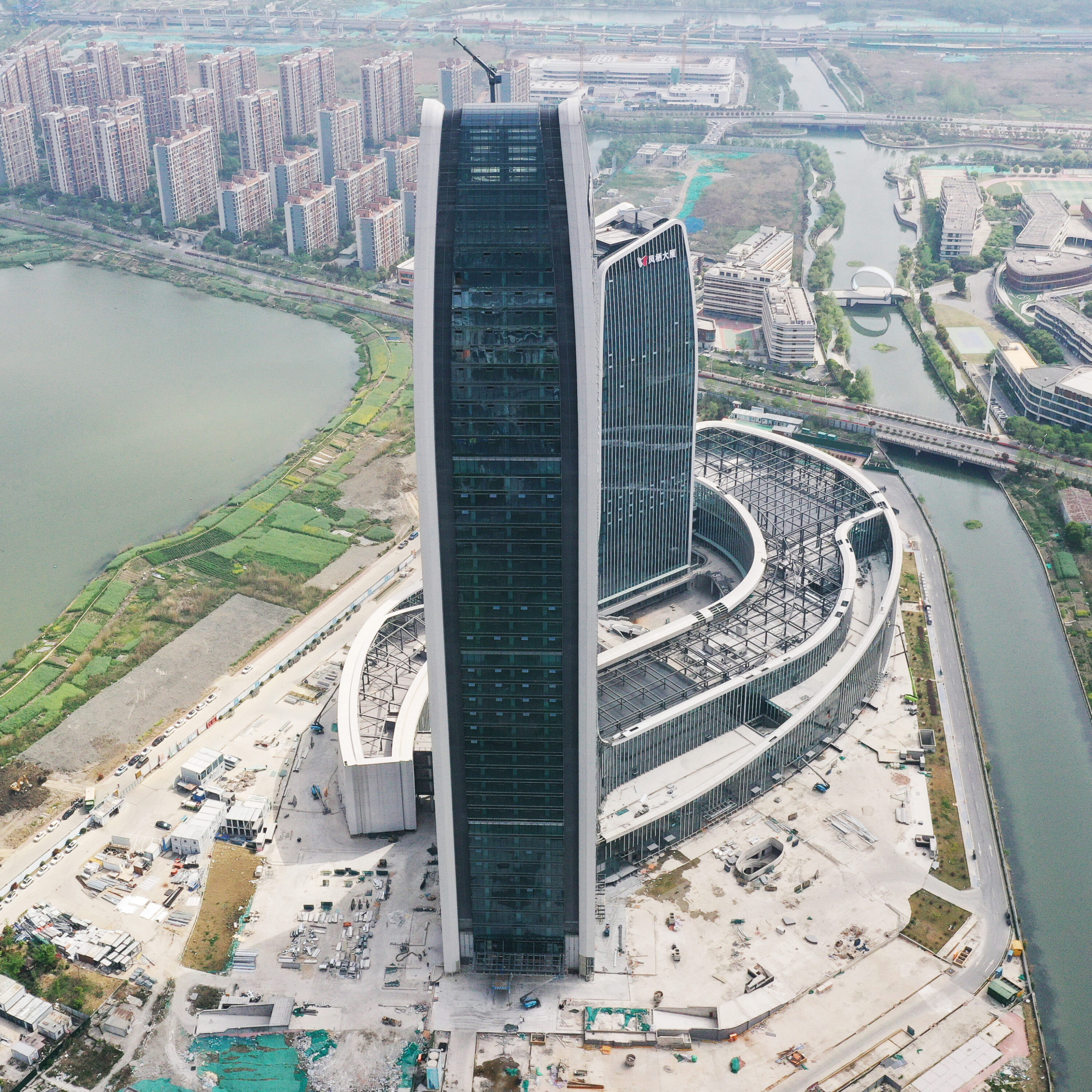 本项目位于湖州生态科技城核心区,定位为总部办公、商务、人才综合体、城市配套商业。项目计划打造绿色生态城超高层建筑新地标,成为区域未来发展的重要平台。总建筑面积约31万平方米,包含两栋超高层建筑,分别为46层和30层,最高建筑高度达230米。主楼形体方正,平面组织高效合理。主楼和裙房外立面采用一体化设计,提取江南山水形态特征,具有时尚的流线感,充满地域文化气息,象征着湖州不断涅磐舞动的城市发展历程。