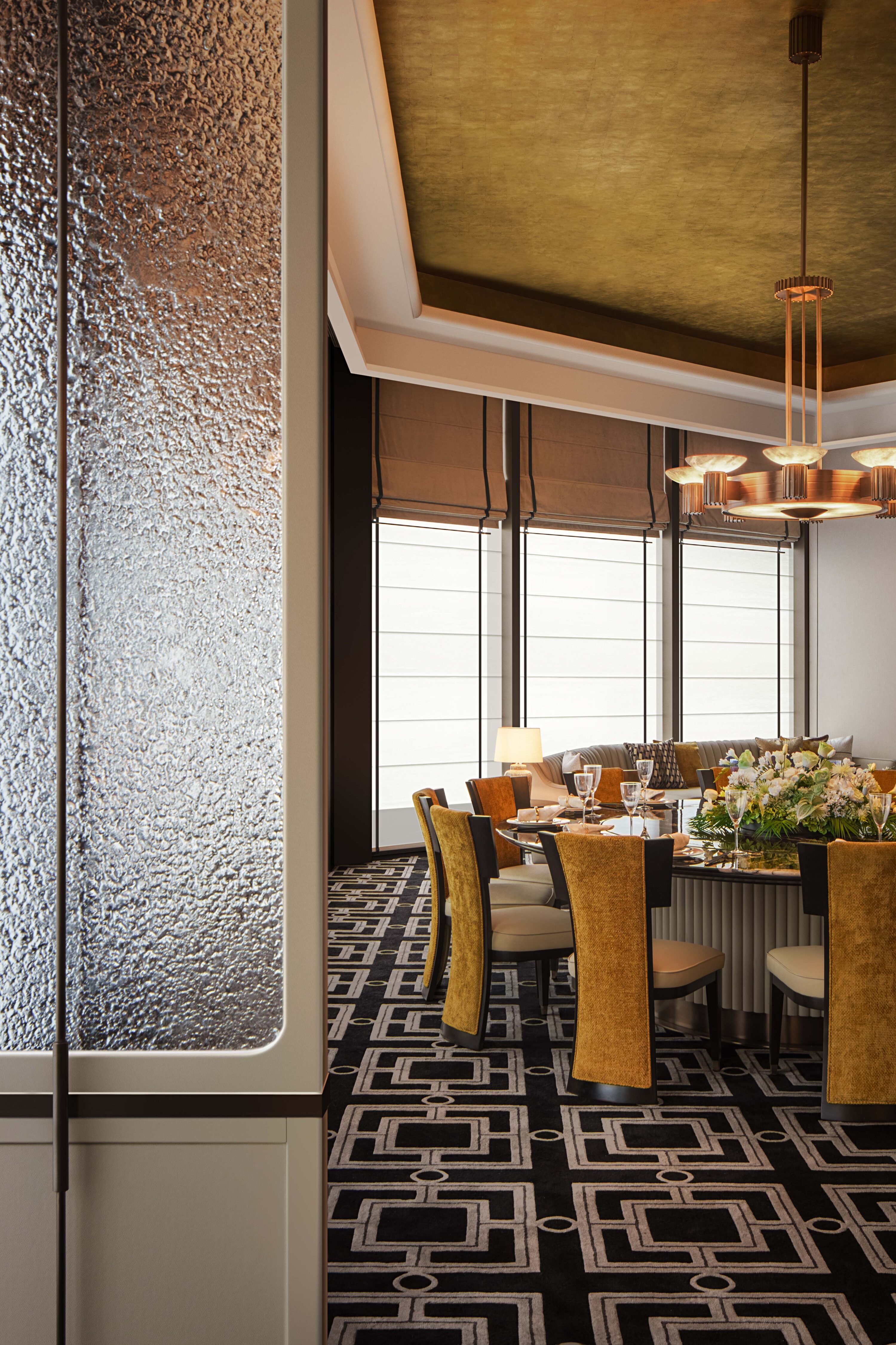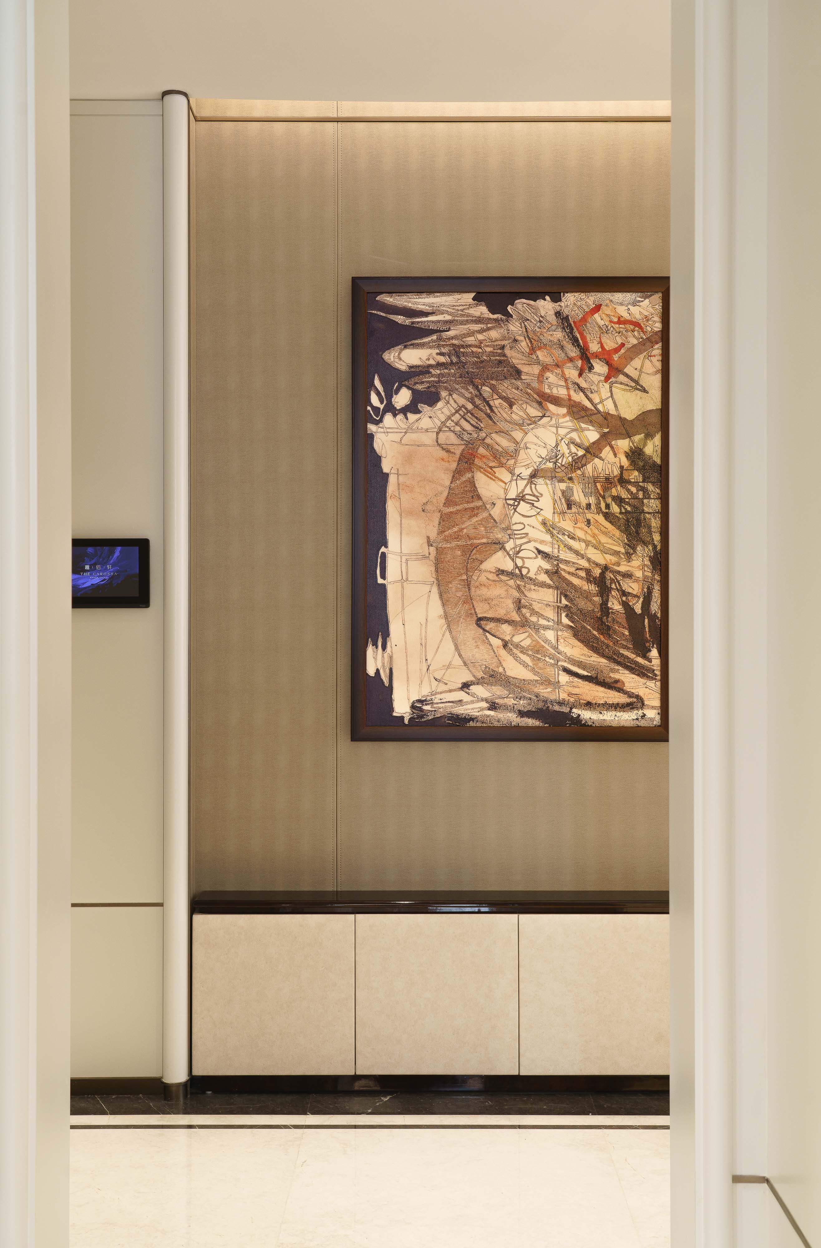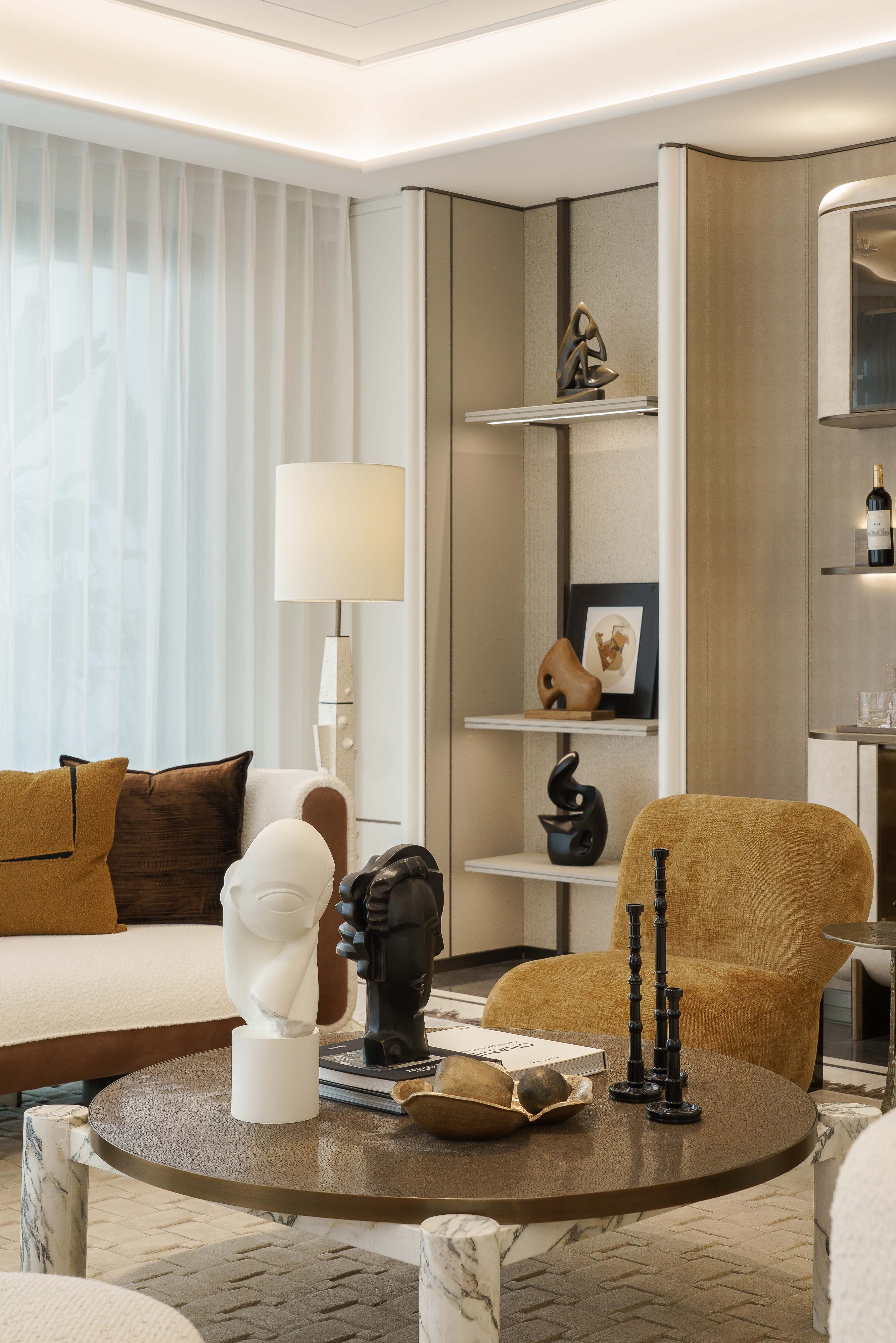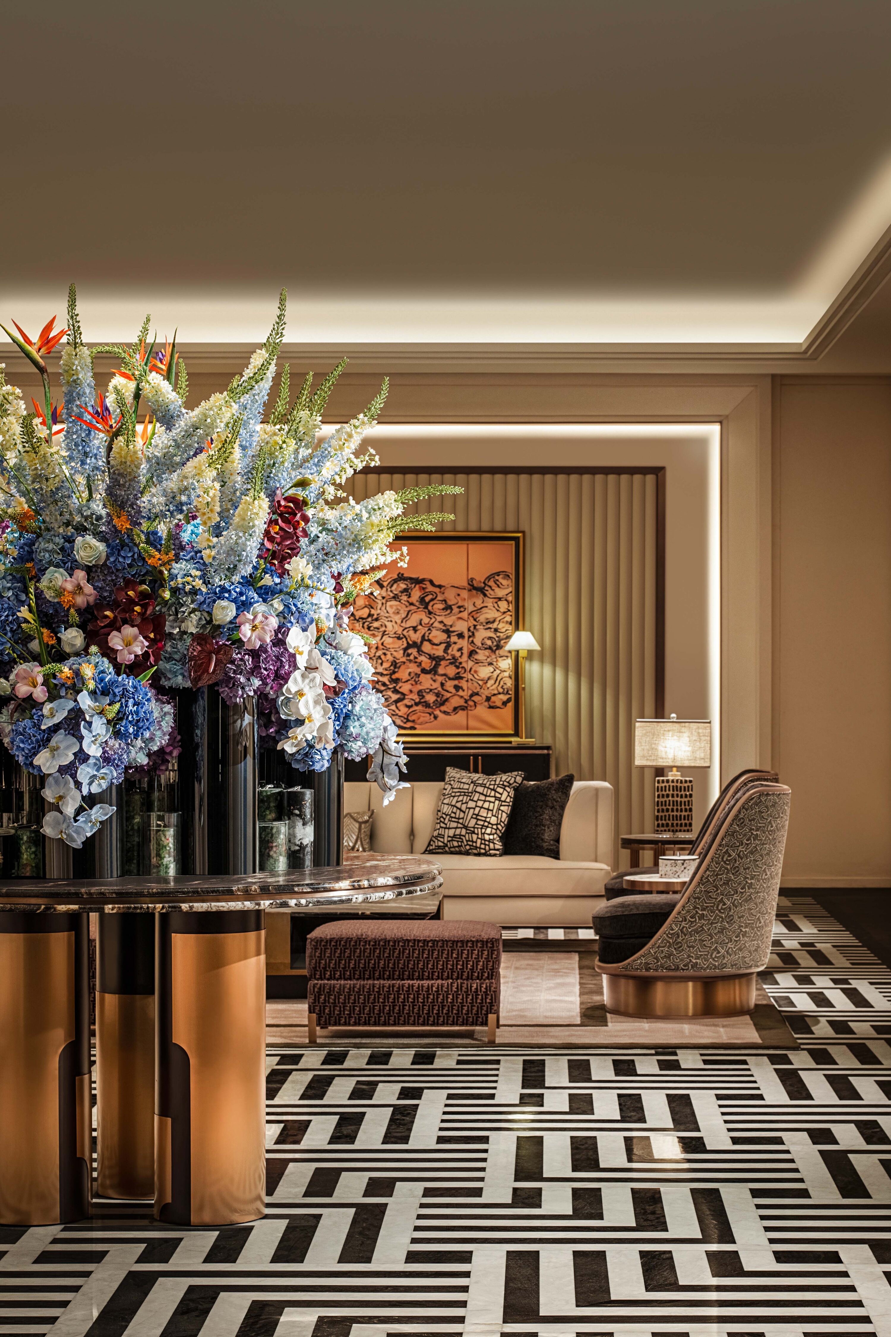 室内属于西伦敦的米金色优雅色调,搭配比较有生机的绿色大型花艺,以及parada绿奢石与液态金属相结合的茶几,形成一个具有奢华高雅又不失温度的空间。ArtDeco风格吊灯搭配玉石台灯,使空间更显大气与时髦。休息大堂整体设计灵感源自极具传奇色彩和历史底蕴的奢华酒店——纽约华尔道夫酒店,纽约华尔道夫酒店被视为装饰艺术时期建筑与室内设计的典范,将其设计元素应用于休息大堂,比如立面和家具细节采用了大量装饰丰富的石材和金属元素,复杂的金属浮雕、线条和几何形状,营造出华丽的装饰效果。