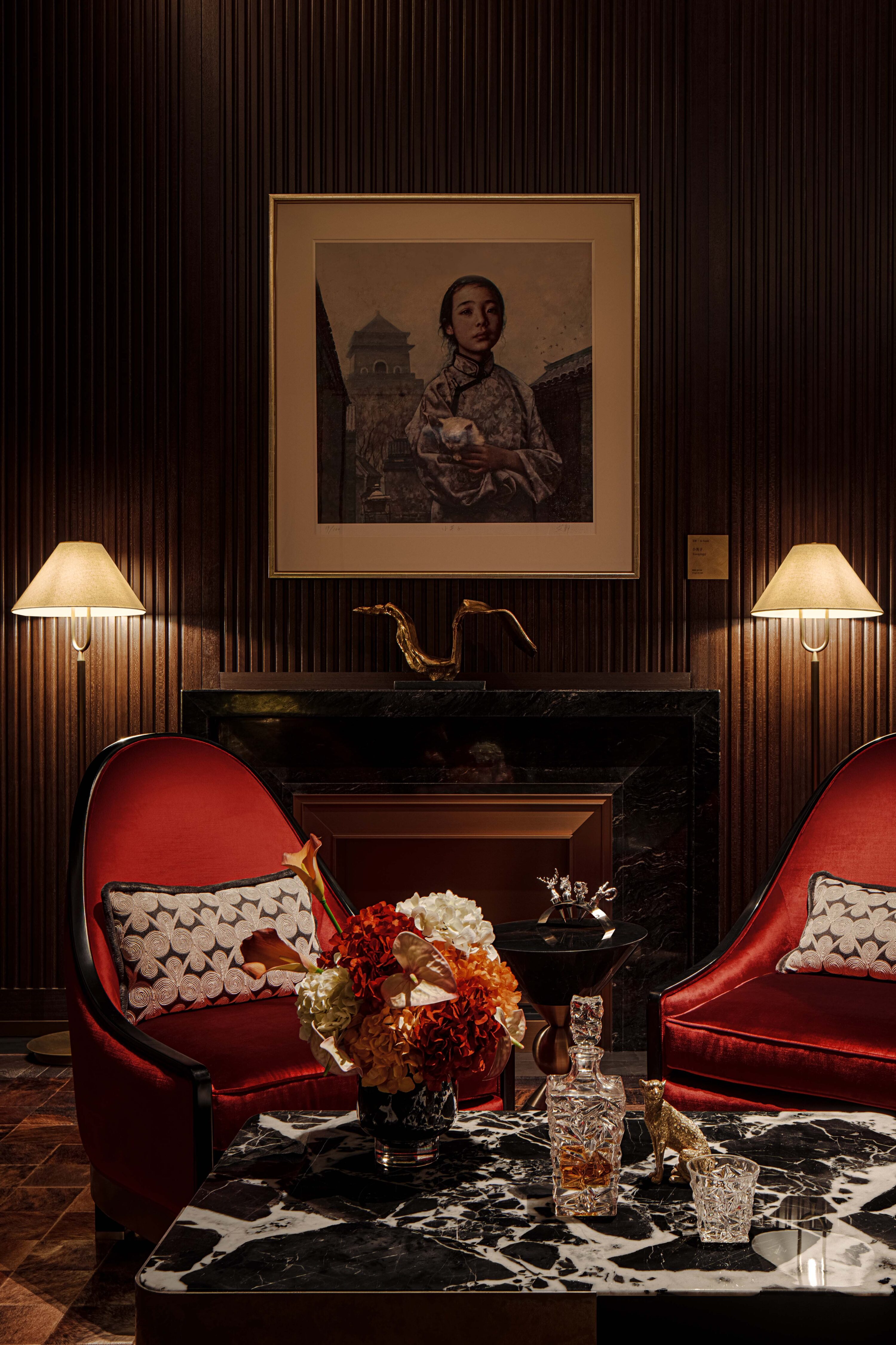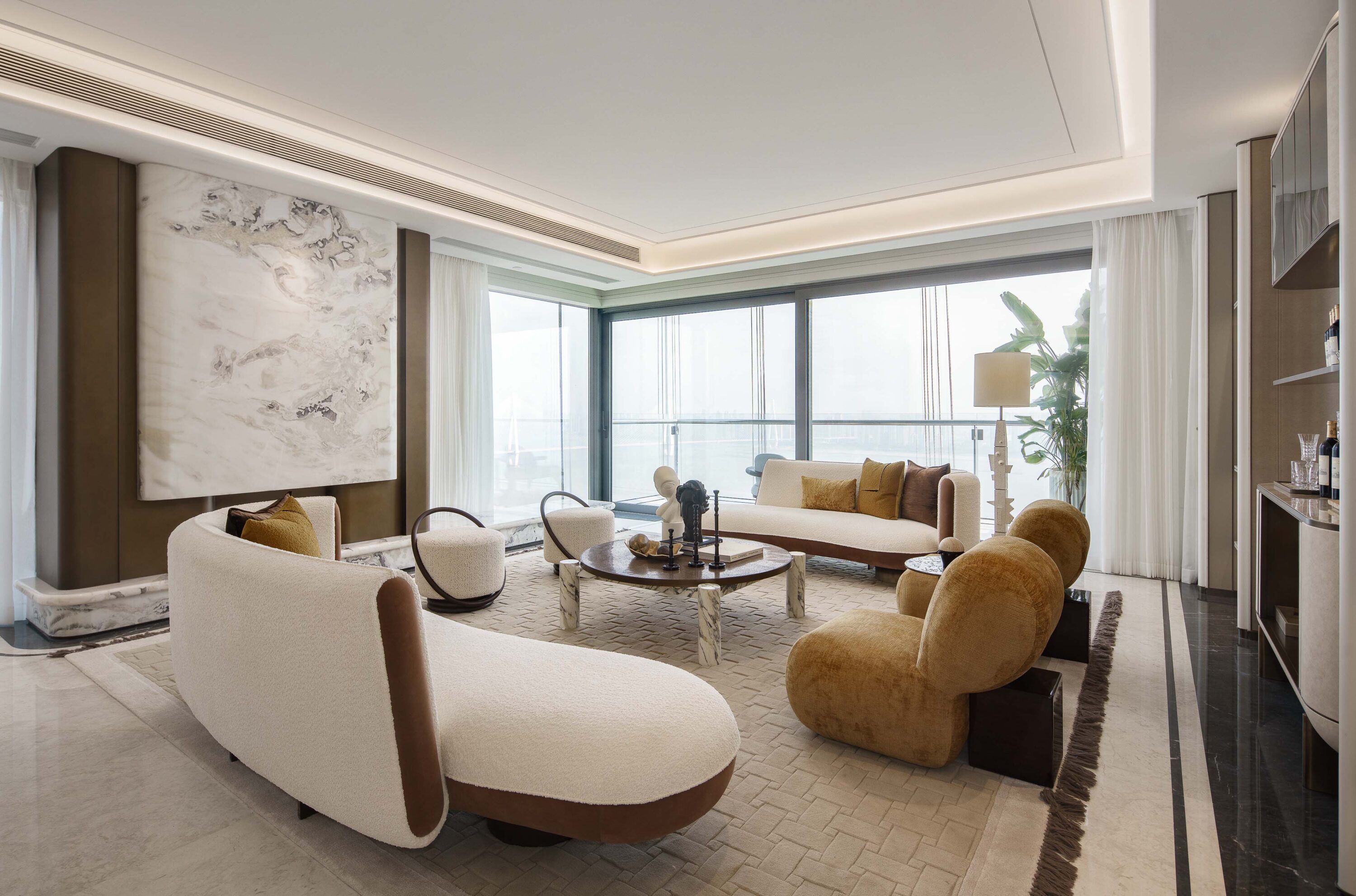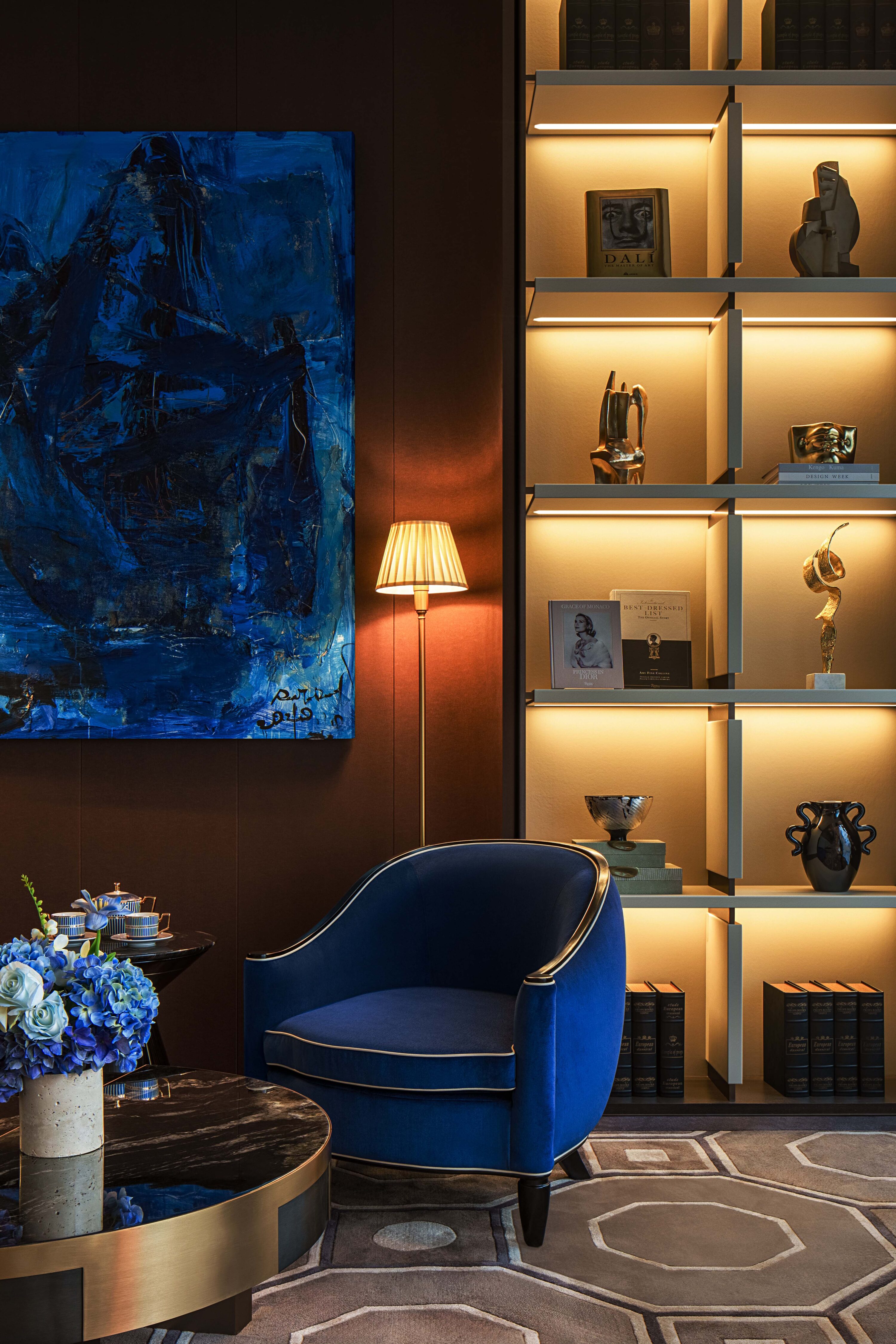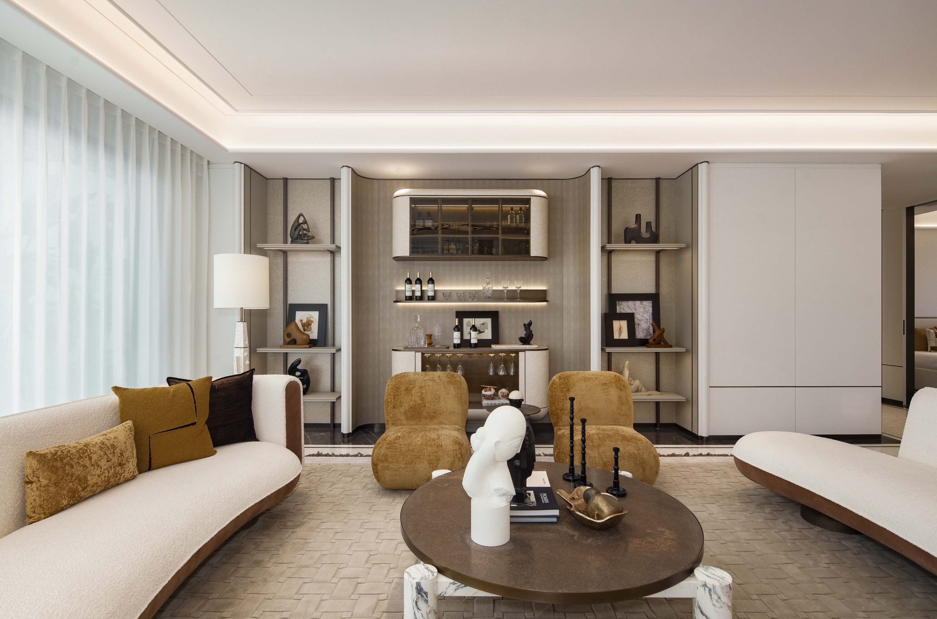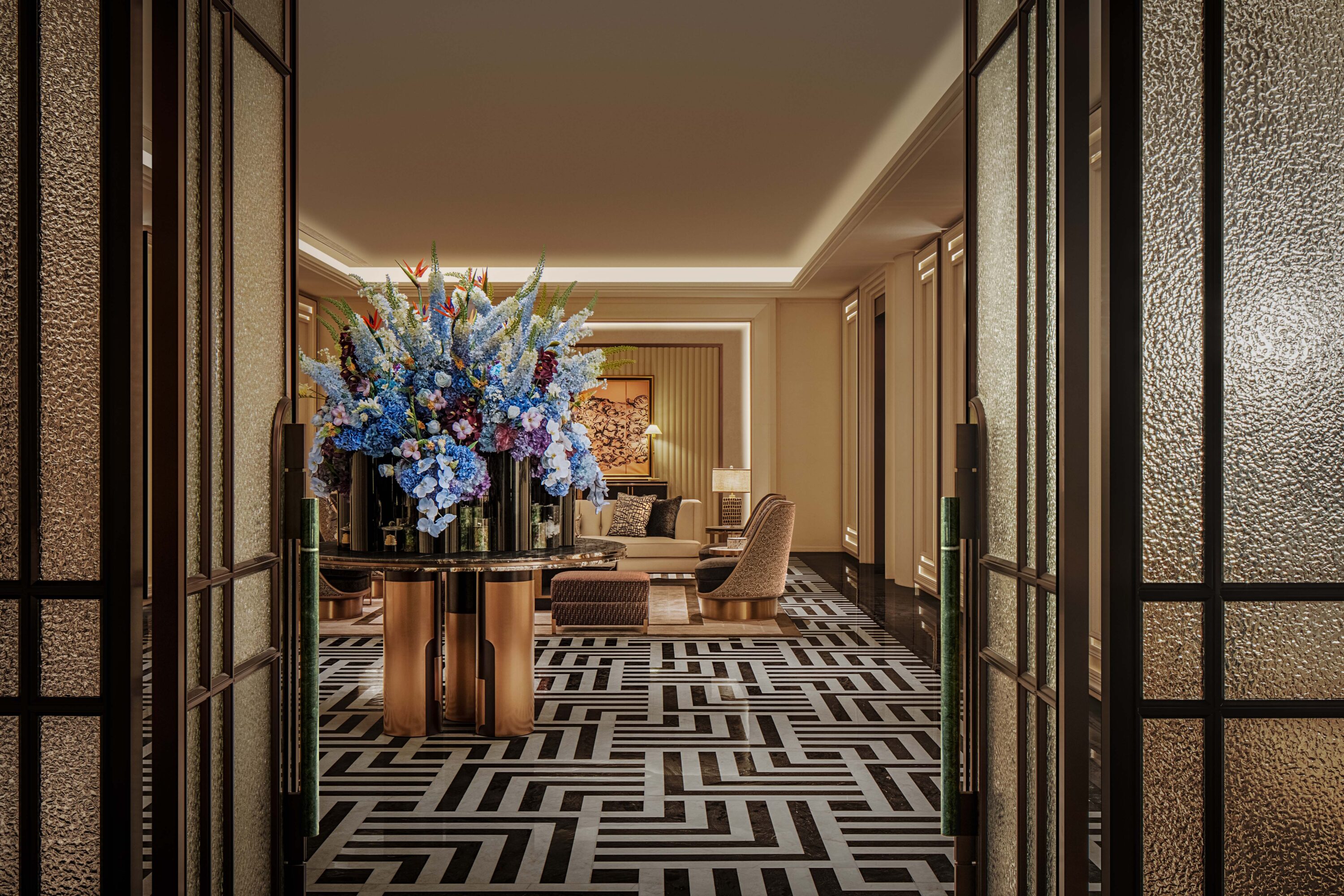 室内属于西伦敦的米金色优雅色调,搭配比较有生机的绿色大型花艺,以及parada绿奢石与液态金属相结合的茶几,形成一个具有奢华高雅又不失温度的空间。ArtDeco风格吊灯搭配玉石台灯,使空间更显大气与时髦。休息大堂整体设计灵感源自极具传奇色彩和历史底蕴的奢华酒店——纽约华尔道夫酒店,纽约华尔道夫酒店被视为装饰艺术时期建筑与室内设计的典范,将其设计元素应用于休息大堂,比如立面和家具细节采用了大量装饰丰富的石材和金属元素,复杂的金属浮雕、线条和几何形状,营造出华丽的装饰效果。