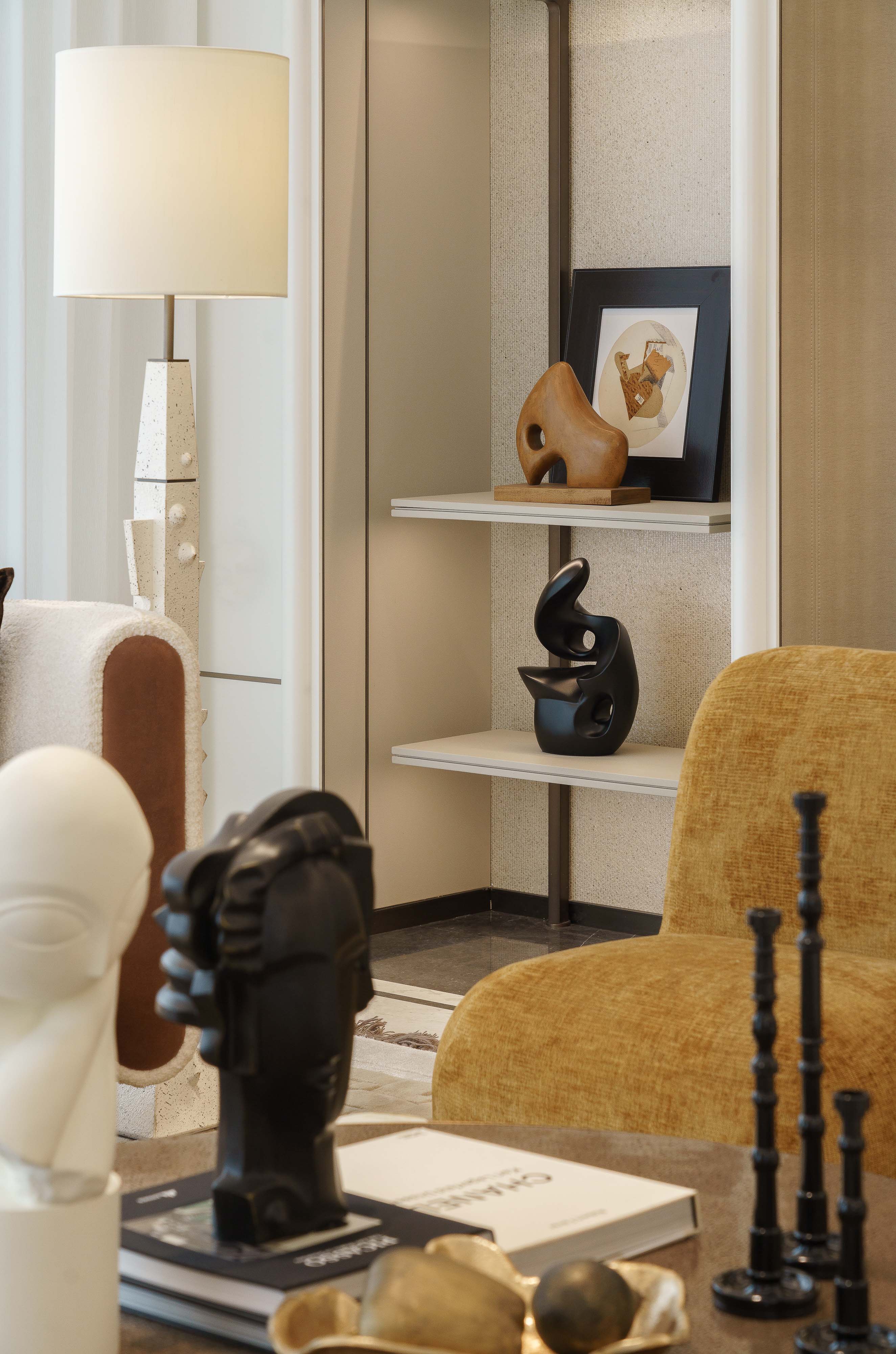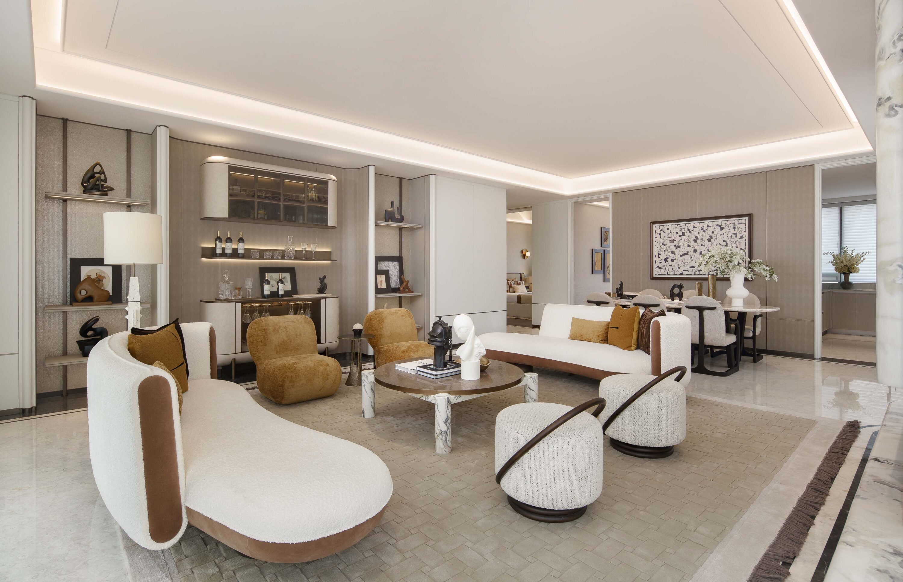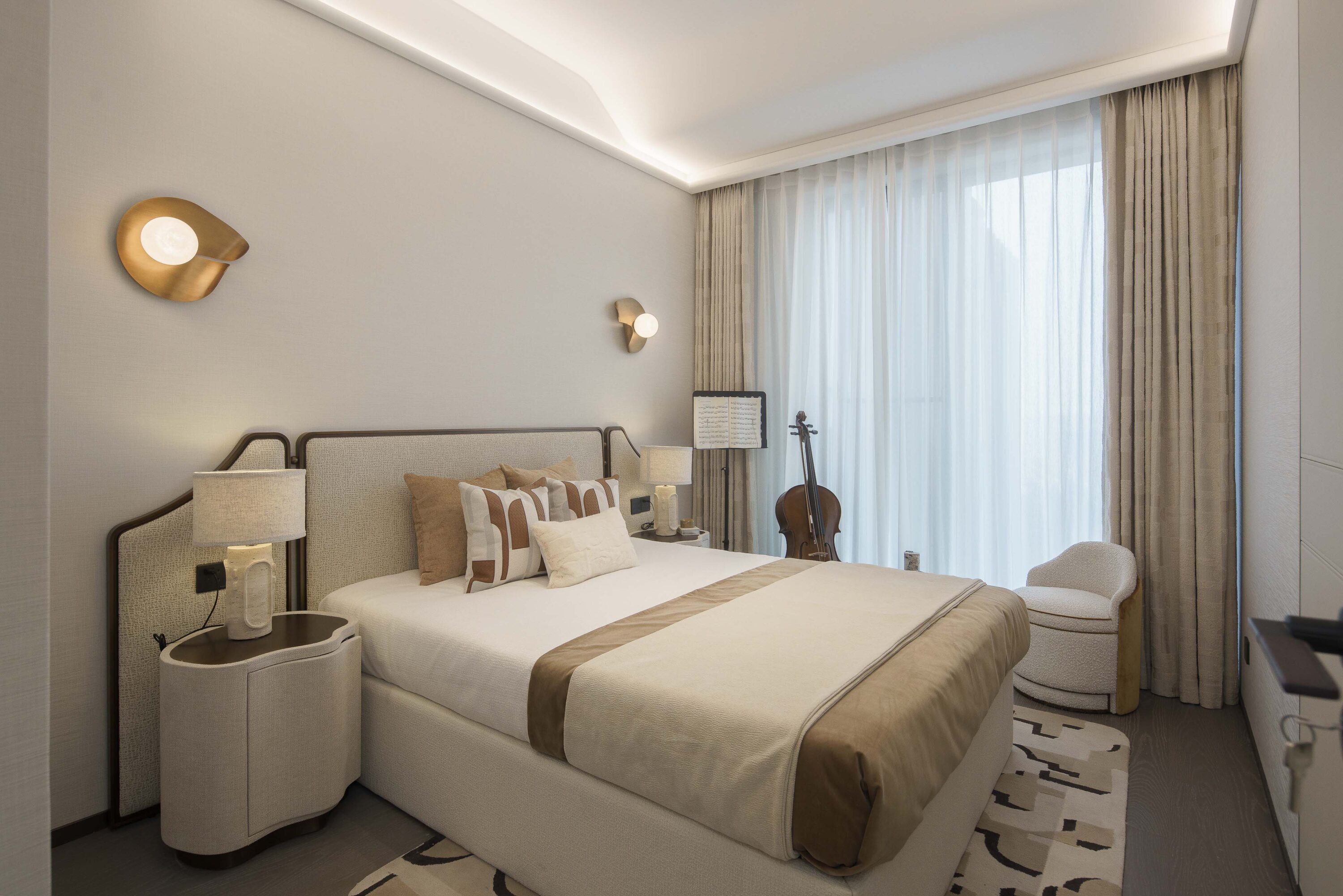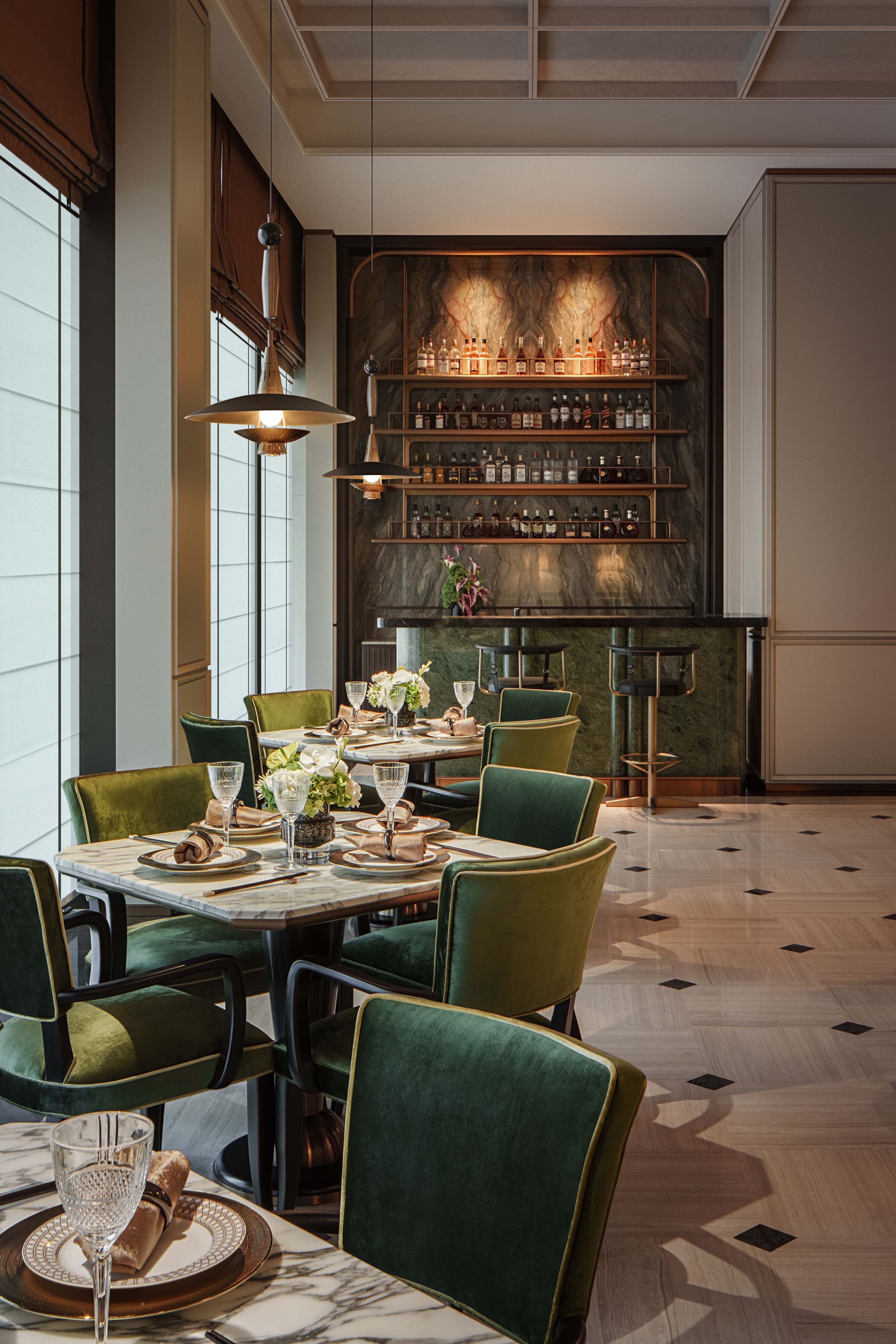 室内属于西伦敦的米金色优雅色调,搭配比较有生机的绿色大型花艺,以及parada绿奢石与液态金属相结合的茶几,形成一个具有奢华高雅又不失温度的空间。ArtDeco风格吊灯搭配玉石台灯,使空间更显大气与时髦。休息大堂整体设计灵感源自极具传奇色彩和历史底蕴的奢华酒店——纽约华尔道夫酒店,纽约华尔道夫酒店被视为装饰艺术时期建筑与室内设计的典范,将其设计元素应用于休息大堂,比如立面和家具细节采用了大量装饰丰富的石材和金属元素,复杂的金属浮雕、线条和几何形状,营造出华丽的装饰效果。