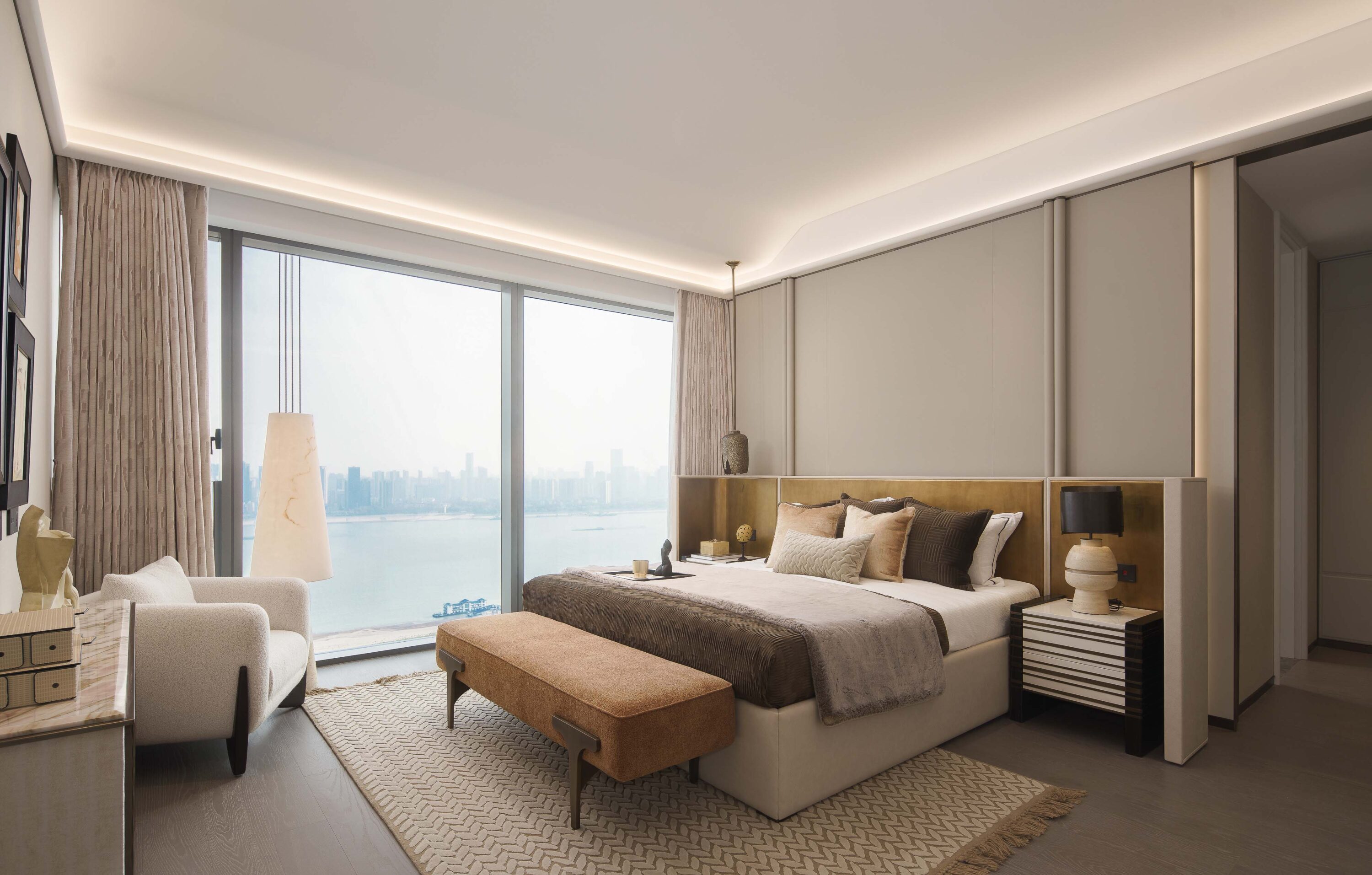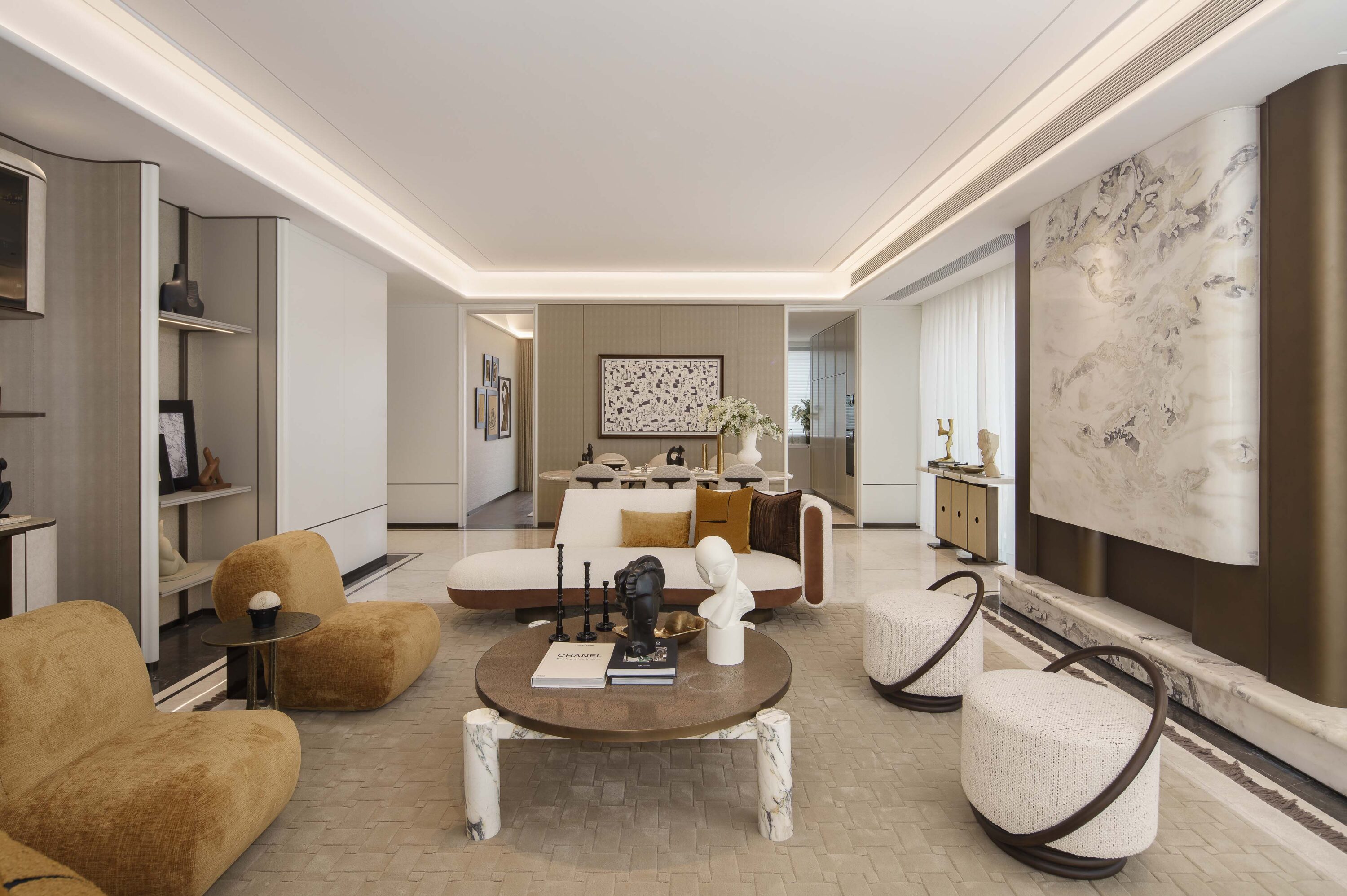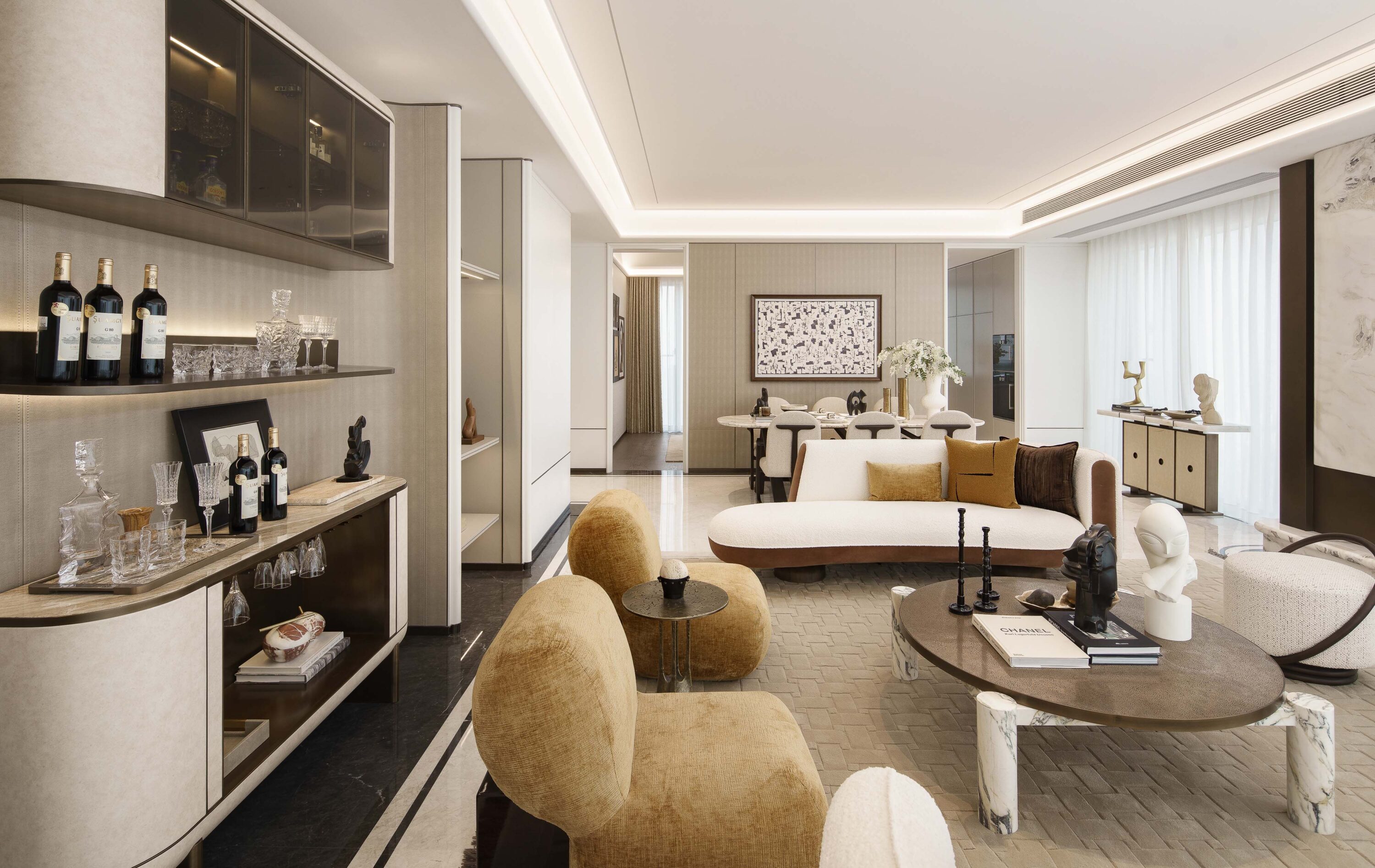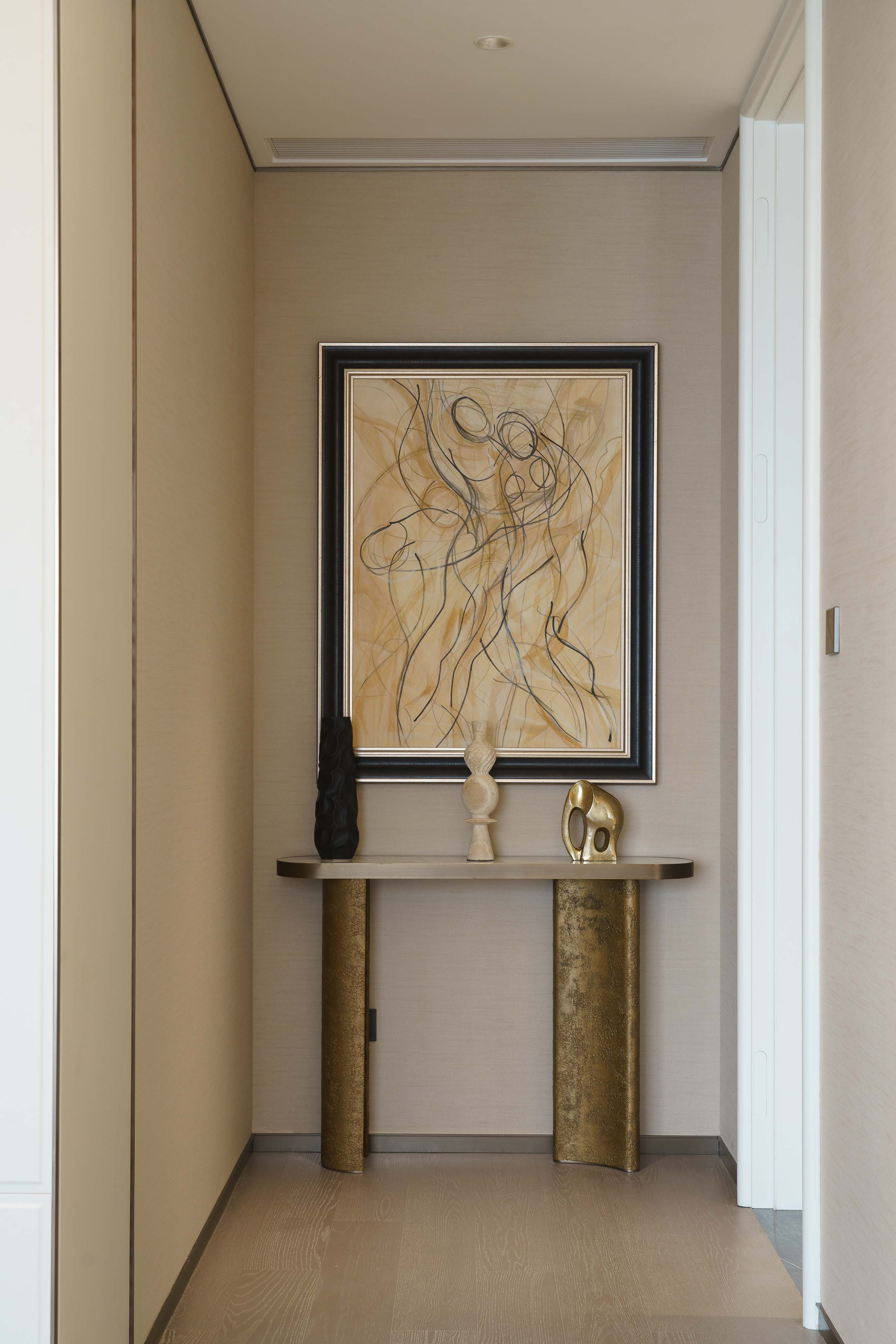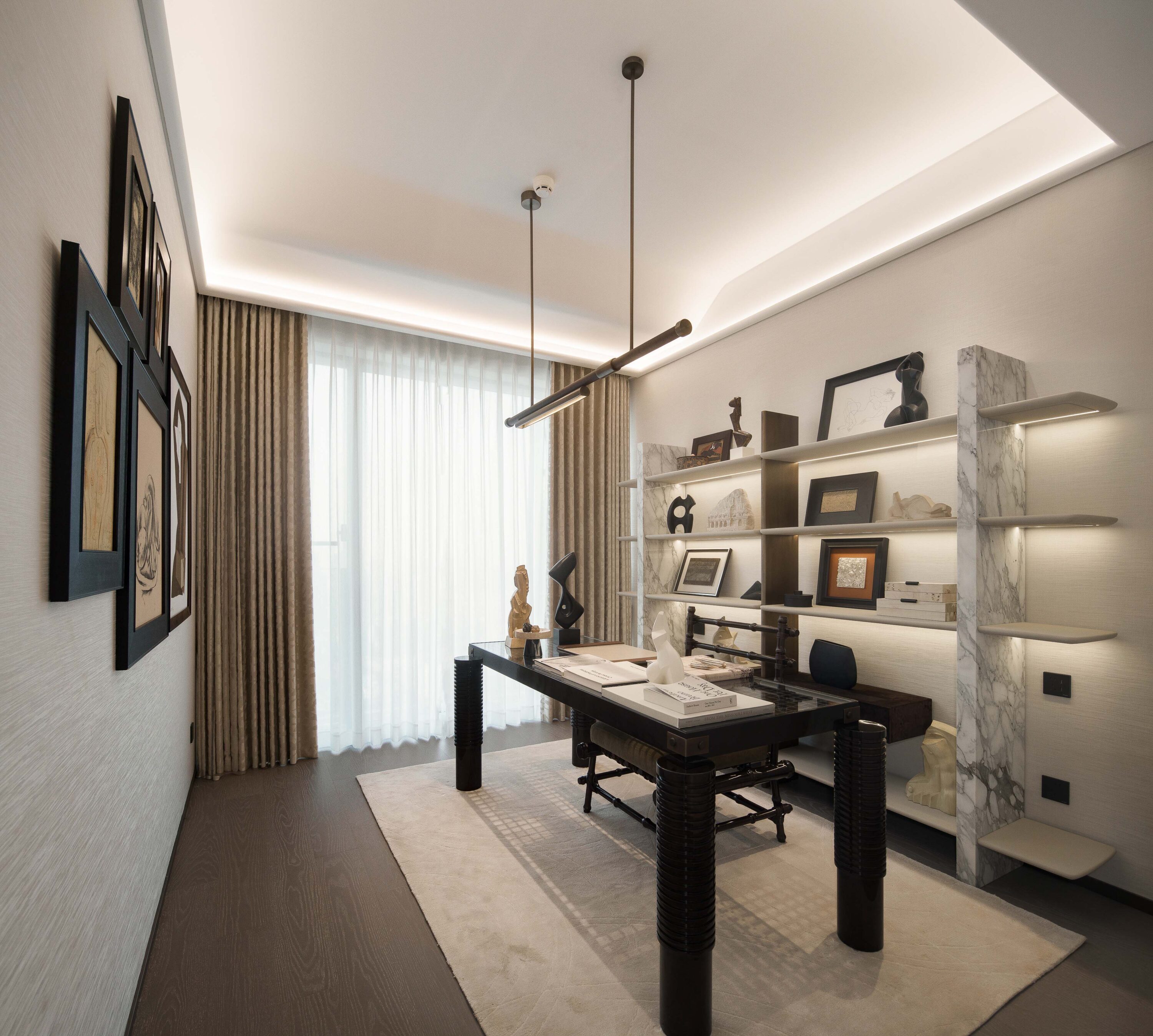 室内属于西伦敦的米金色优雅色调,搭配比较有生机的绿色大型花艺,以及parada绿奢石与液态金属相结合的茶几,形成一个具有奢华高雅又不失温度的空间。ArtDeco风格吊灯搭配玉石台灯,使空间更显大气与时髦。休息大堂整体设计灵感源自极具传奇色彩和历史底蕴的奢华酒店——纽约华尔道夫酒店,纽约华尔道夫酒店被视为装饰艺术时期建筑与室内设计的典范,将其设计元素应用于休息大堂,比如立面和家具细节采用了大量装饰丰富的石材和金属元素,复杂的金属浮雕、线条和几何形状,营造出华丽的装饰效果。