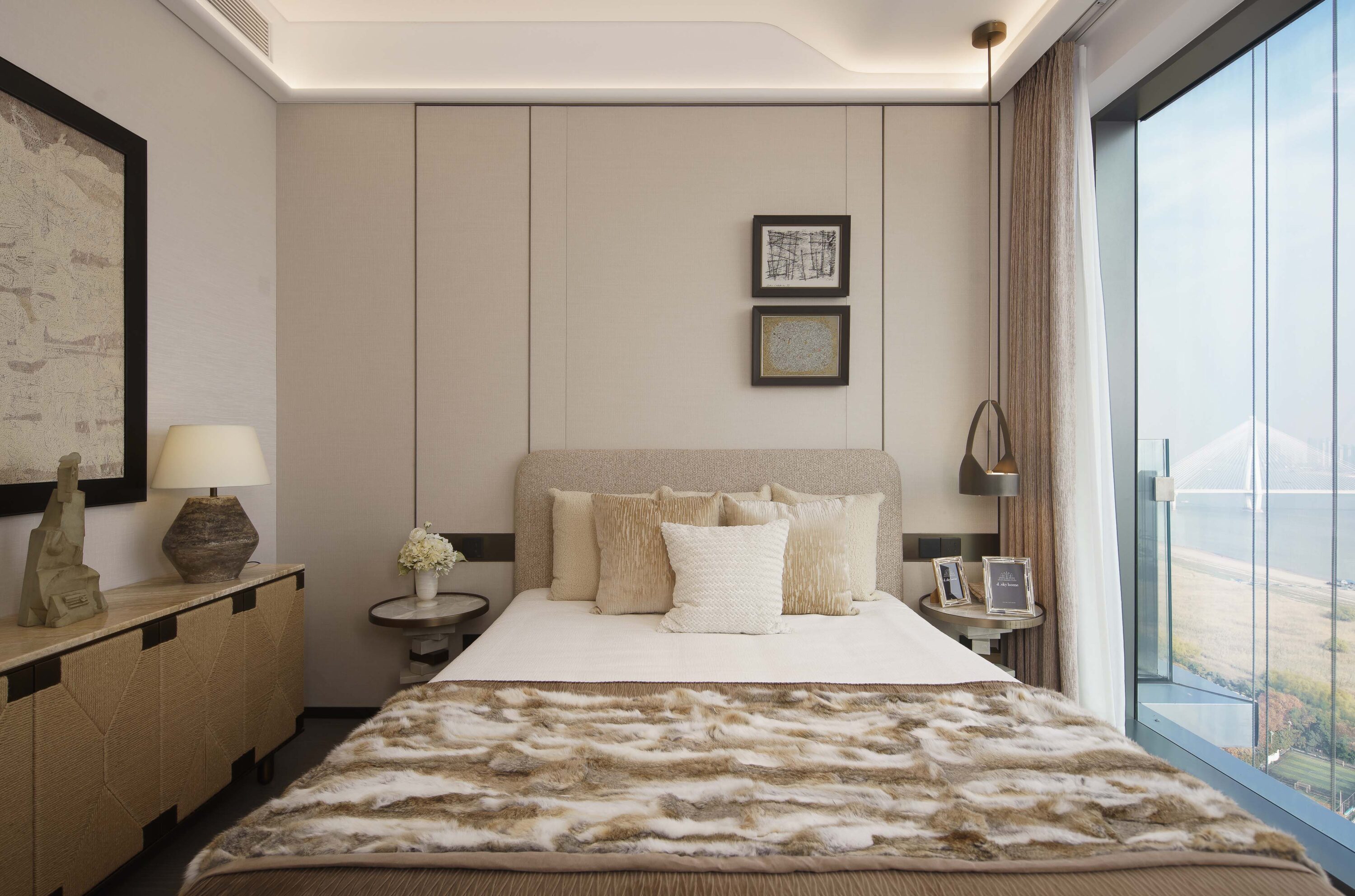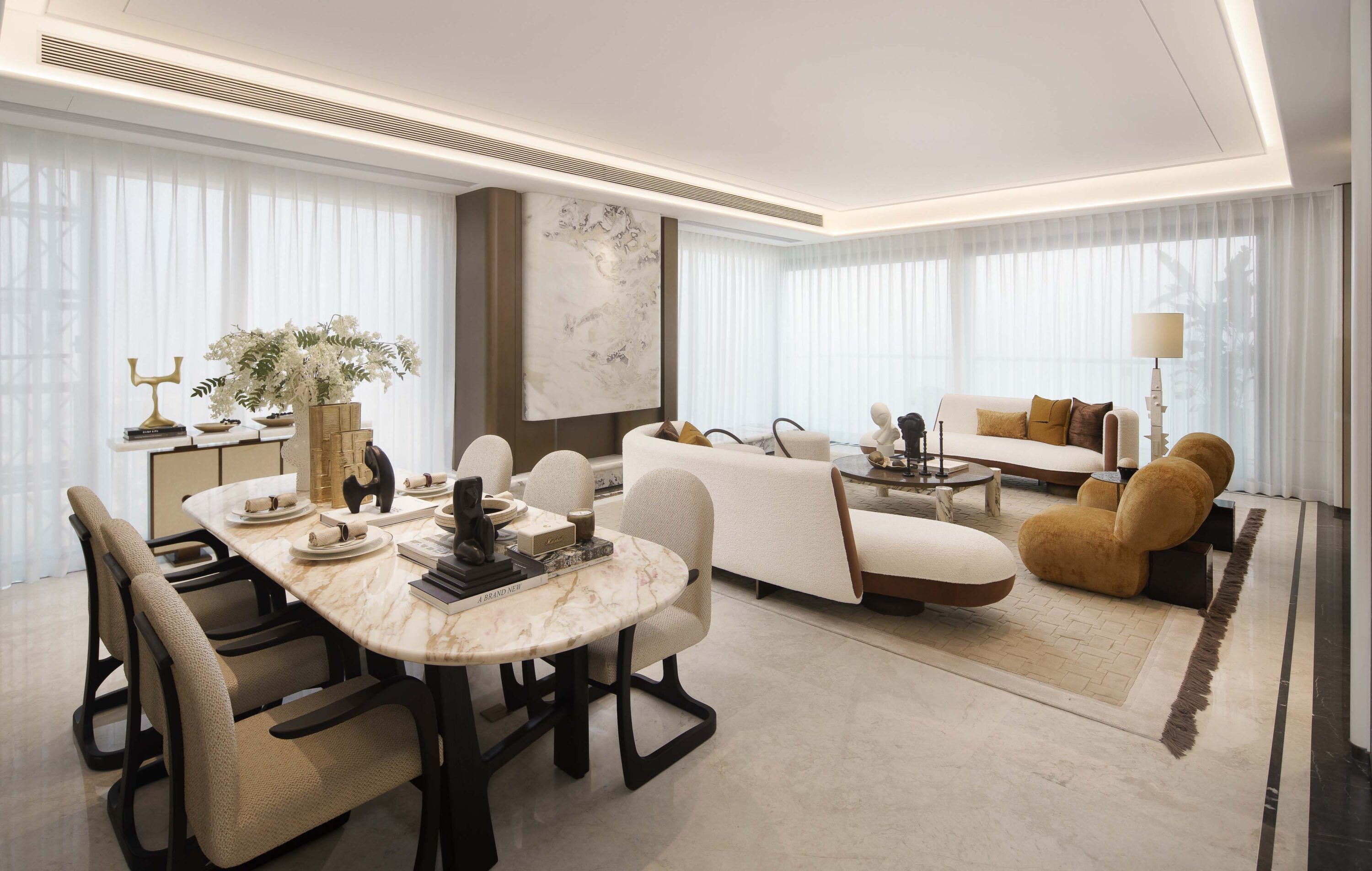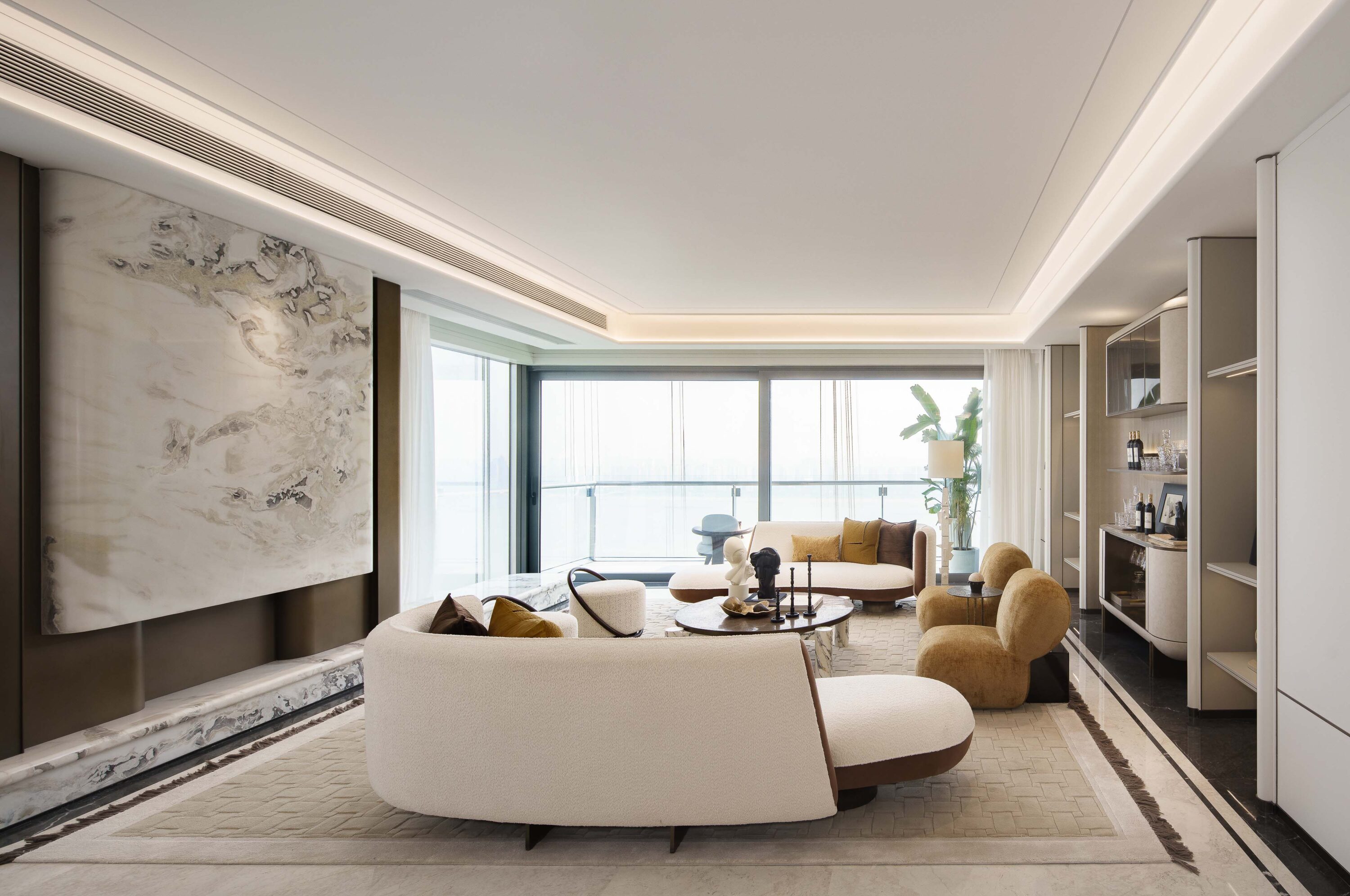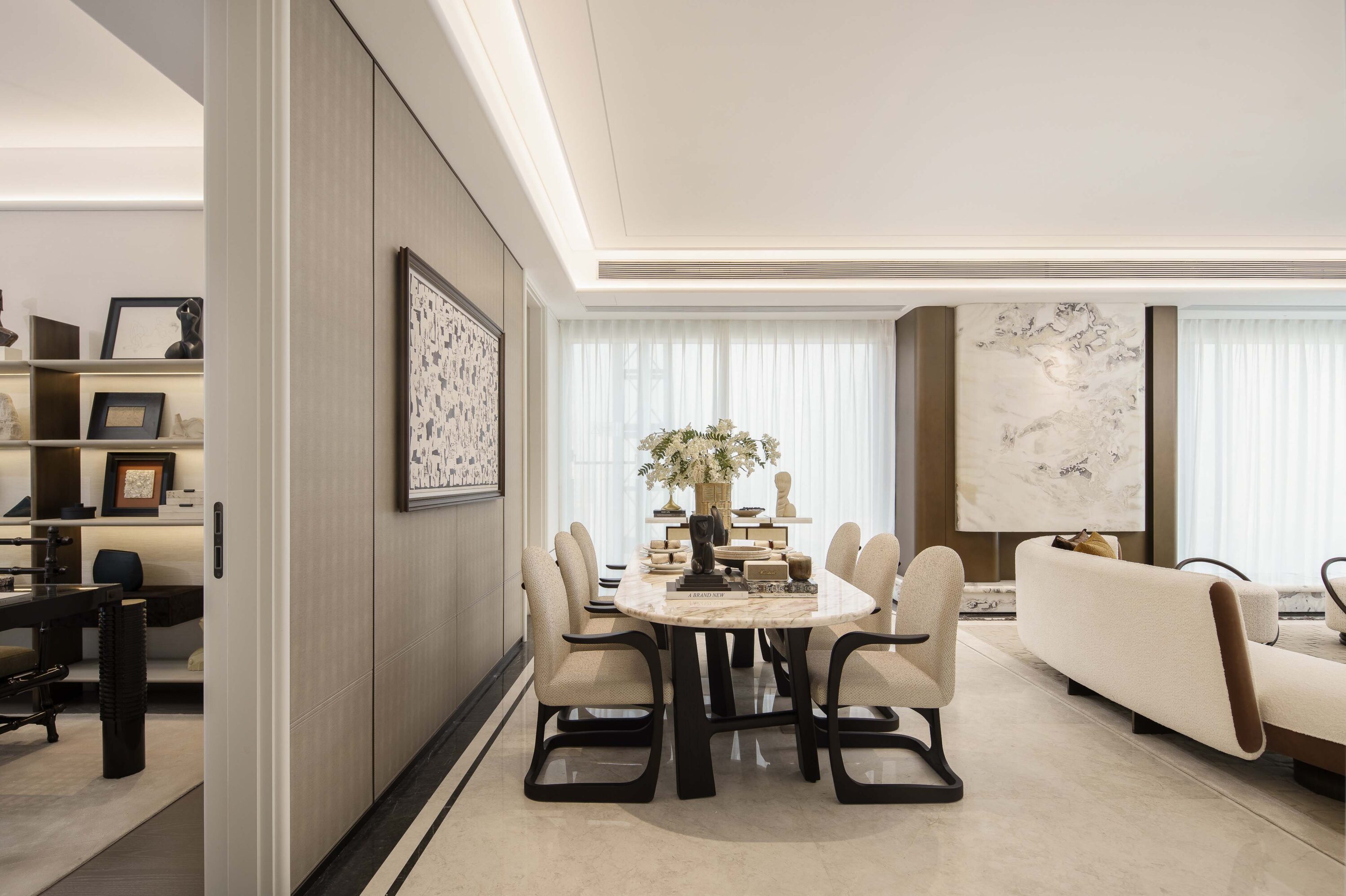 室内属于西伦敦的米金色优雅色调,搭配比较有生机的绿色大型花艺,以及parada绿奢石与液态金属相结合的茶几,形成一个具有奢华高雅又不失温度的空间。ArtDeco风格吊灯搭配玉石台灯,使空间更显大气与时髦。休息大堂整体设计灵感源自极具传奇色彩和历史底蕴的奢华酒店——纽约华尔道夫酒店,纽约华尔道夫酒店被视为装饰艺术时期建筑与室内设计的典范,将其设计元素应用于休息大堂,比如立面和家具细节采用了大量装饰丰富的石材和金属元素,复杂的金属浮雕、线条和几何形状,营造出华丽的装饰效果。