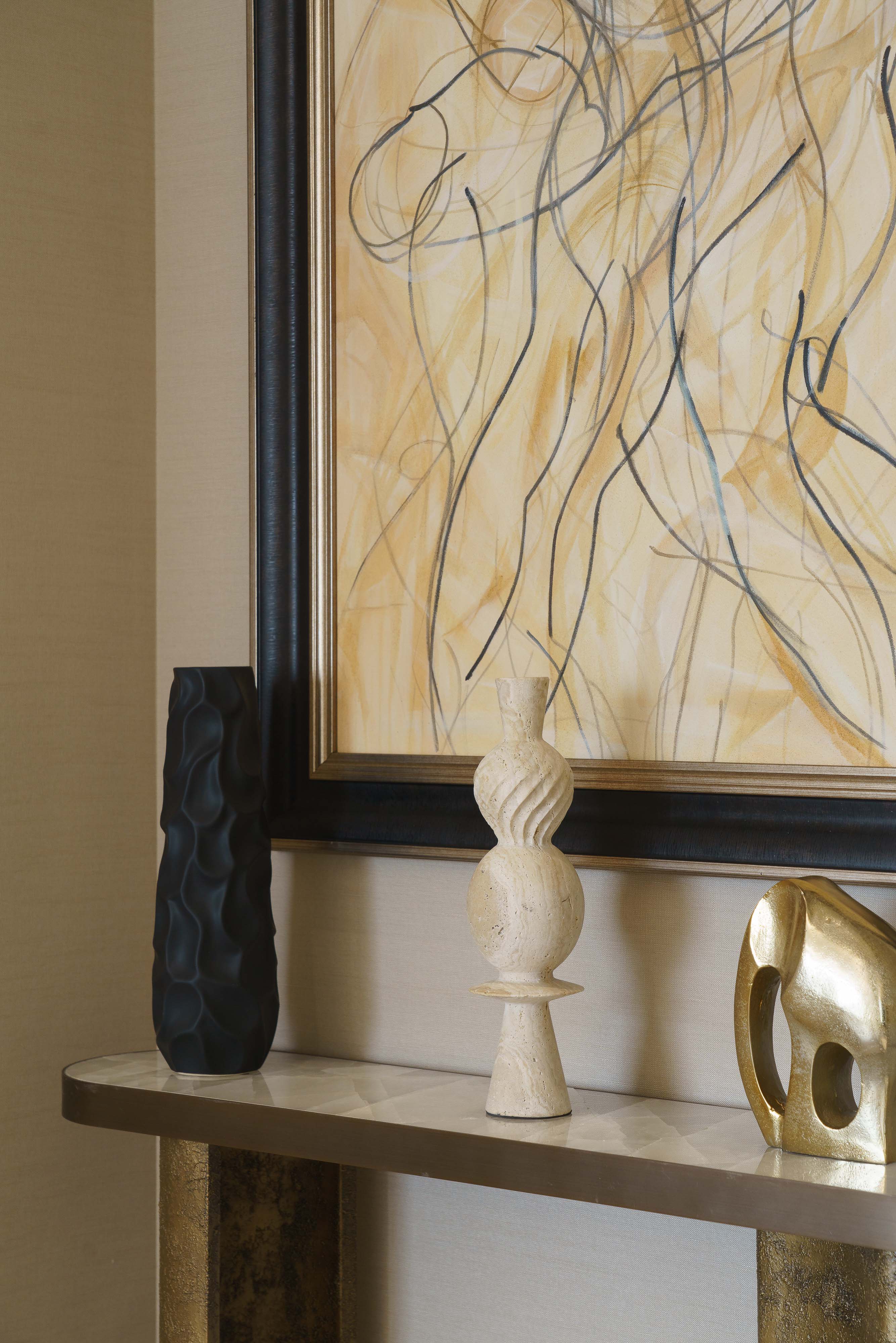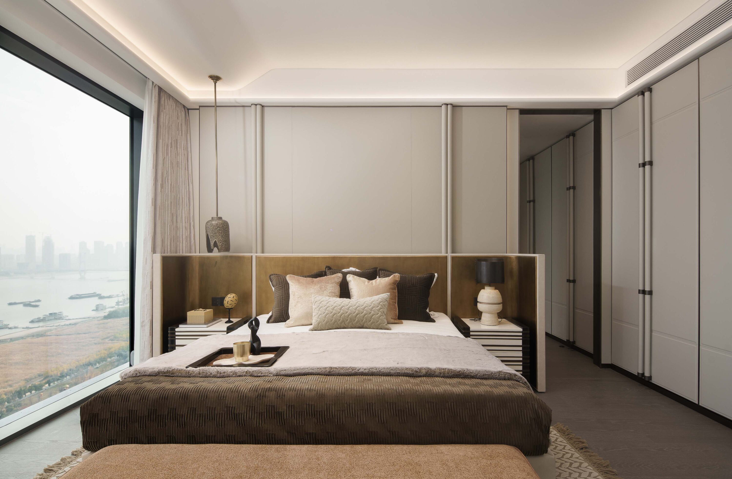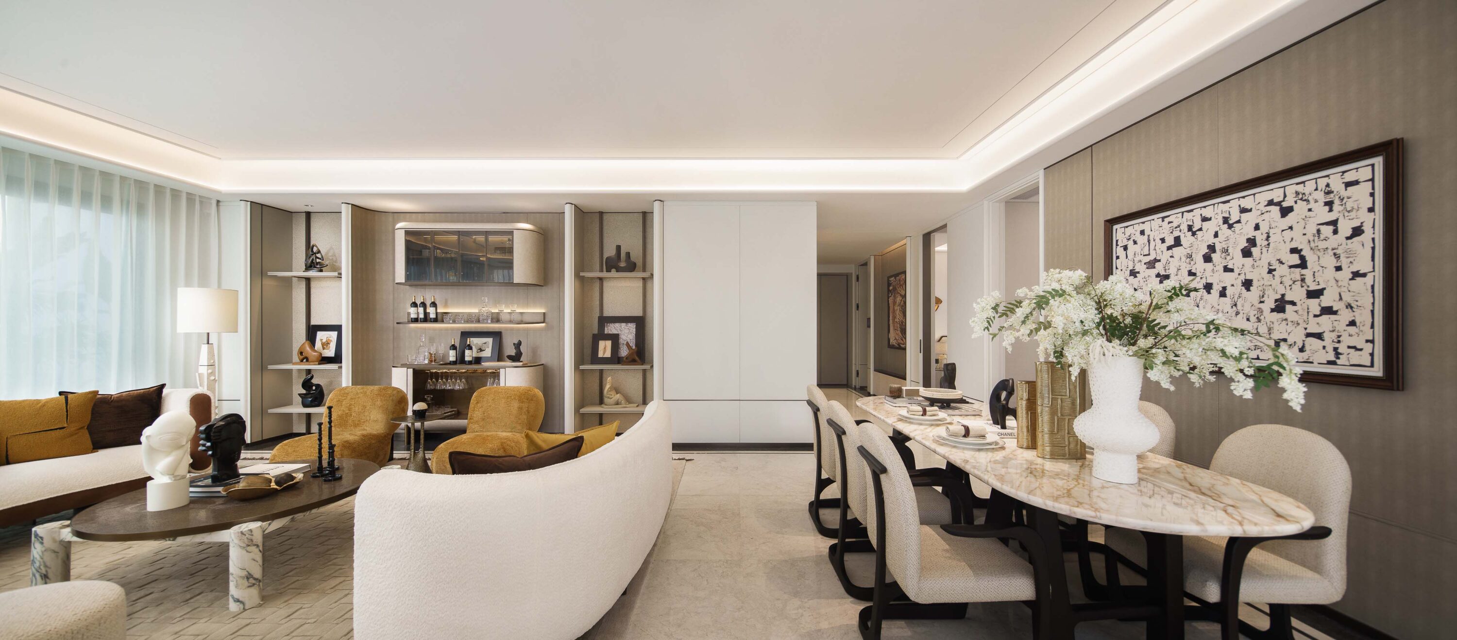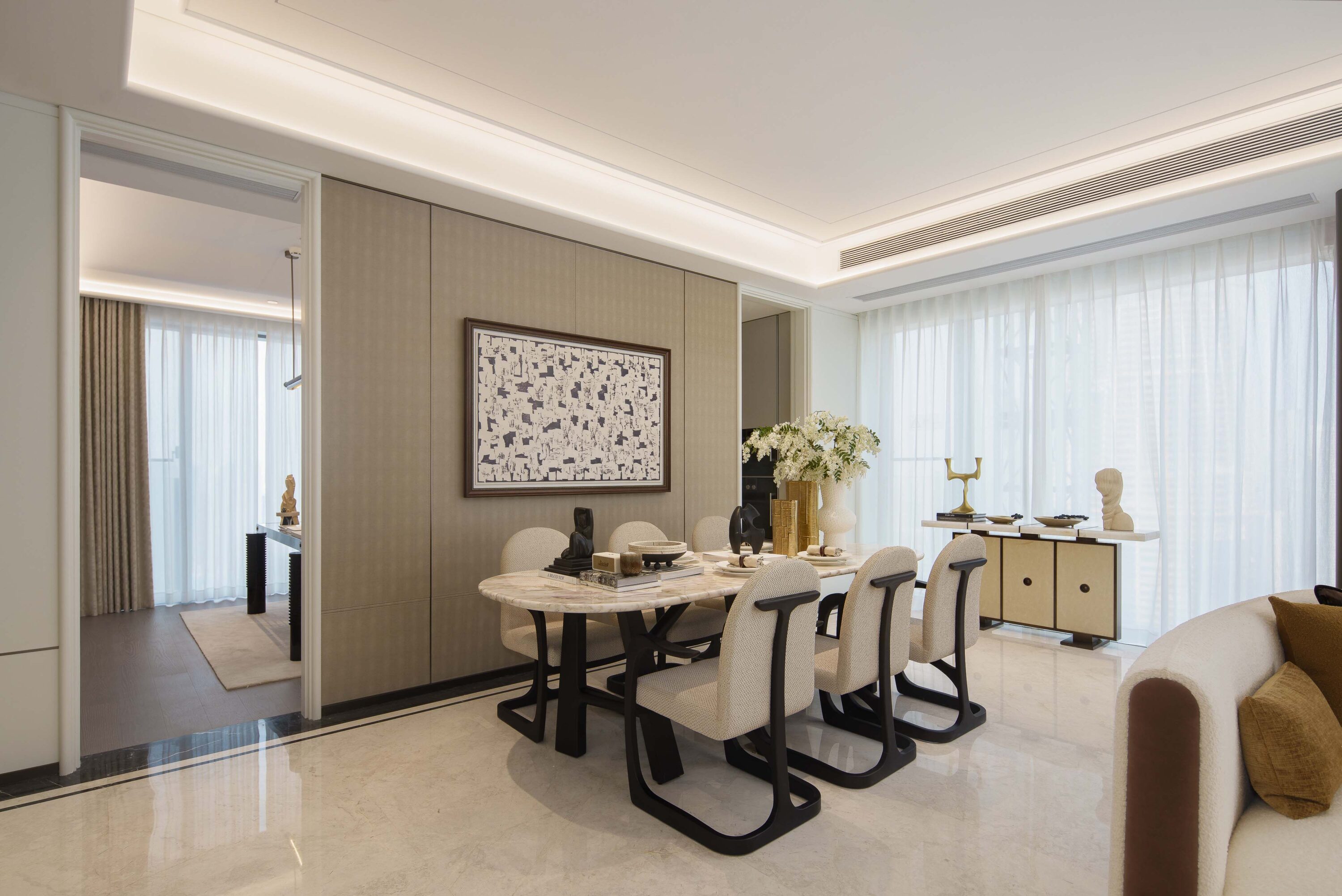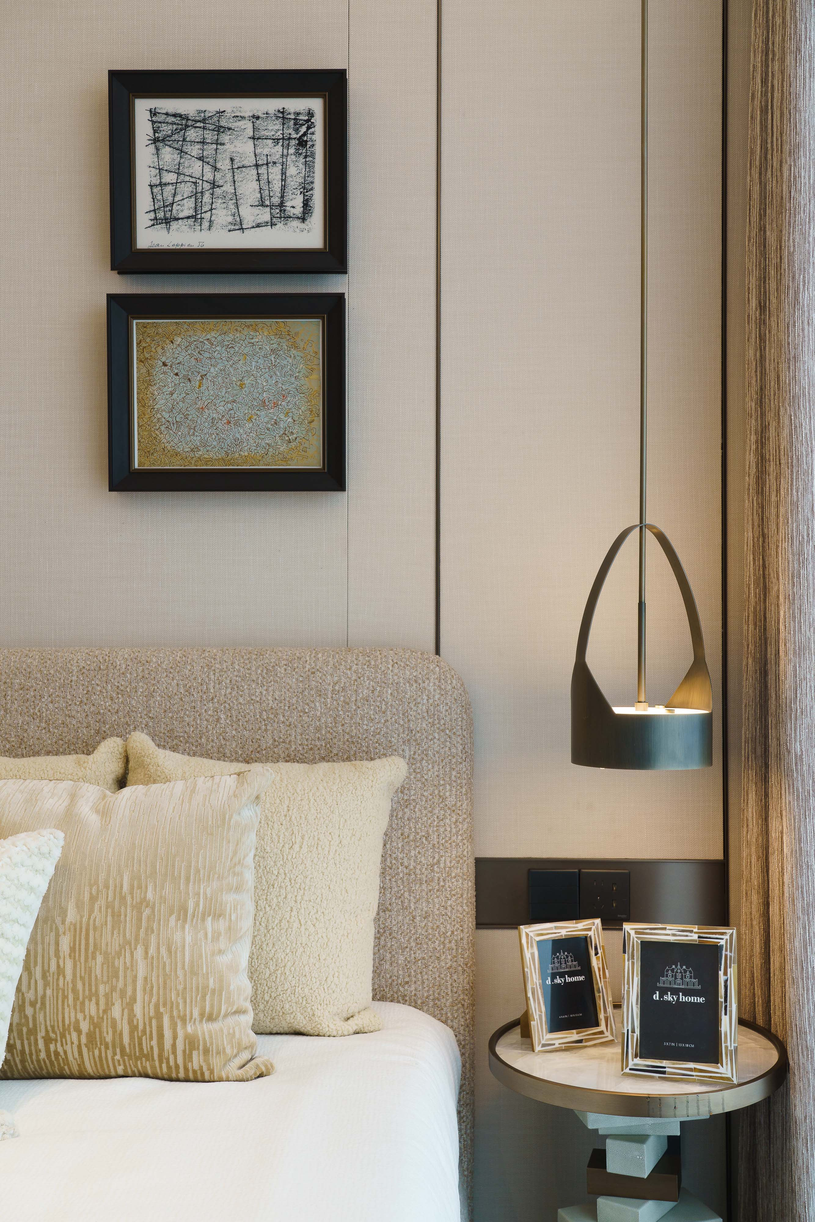 室内属于西伦敦的米金色优雅色调,搭配比较有生机的绿色大型花艺,以及parada绿奢石与液态金属相结合的茶几,形成一个具有奢华高雅又不失温度的空间。ArtDeco风格吊灯搭配玉石台灯,使空间更显大气与时髦。休息大堂整体设计灵感源自极具传奇色彩和历史底蕴的奢华酒店——纽约华尔道夫酒店,纽约华尔道夫酒店被视为装饰艺术时期建筑与室内设计的典范,将其设计元素应用于休息大堂,比如立面和家具细节采用了大量装饰丰富的石材和金属元素,复杂的金属浮雕、线条和几何形状,营造出华丽的装饰效果。