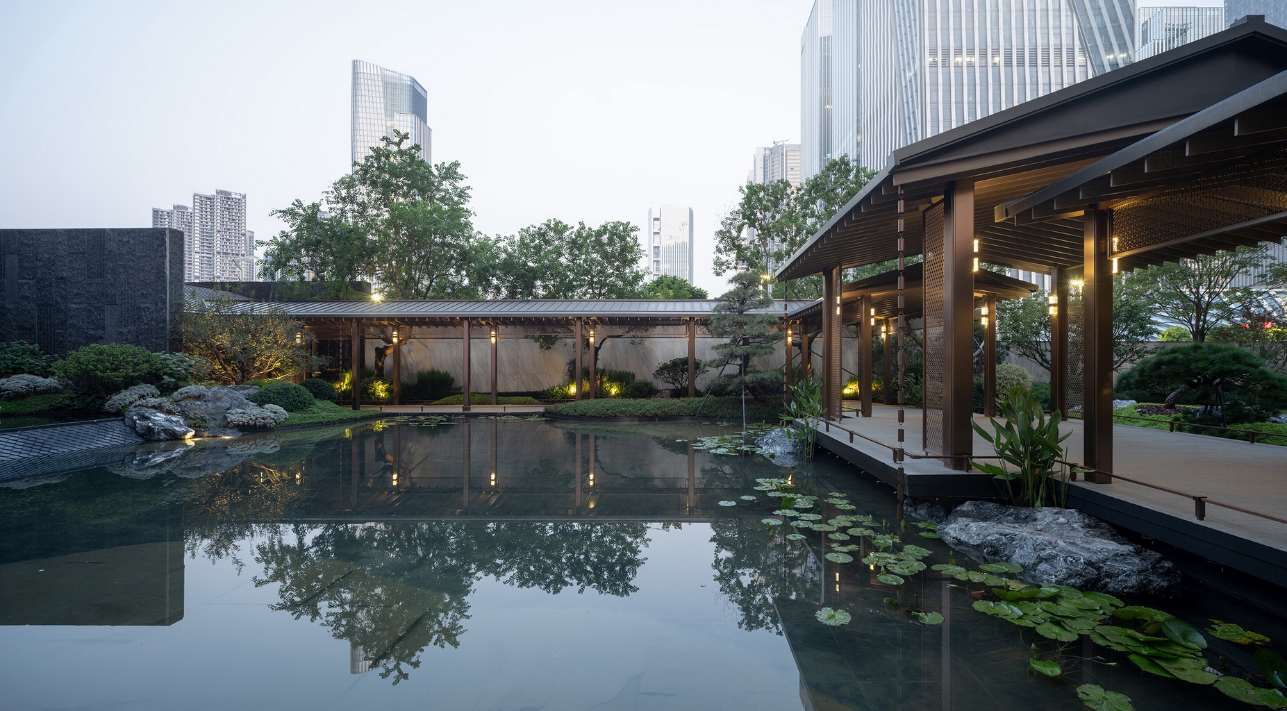 深铁粤港澳大湾区展厅位于深圳前海湾地铁枢纽,建筑为江南屋檐的现代幕墙演绎。景观也引用传统园林特点作为演绎,展现展厅外部场所。根据交通及游览动线点缀安排景点,去展场空间化,将文化展厅和公共交通做适当分隔,分别营造各自的功能场所,同时又以传统园林手法统一空间形象。院门形式的主入口,围堂格局的松石交通场所,入门见山的传统形式,解决人行车行交通。夹道回廊的展厅到达,酝酿进入展场游园体验。