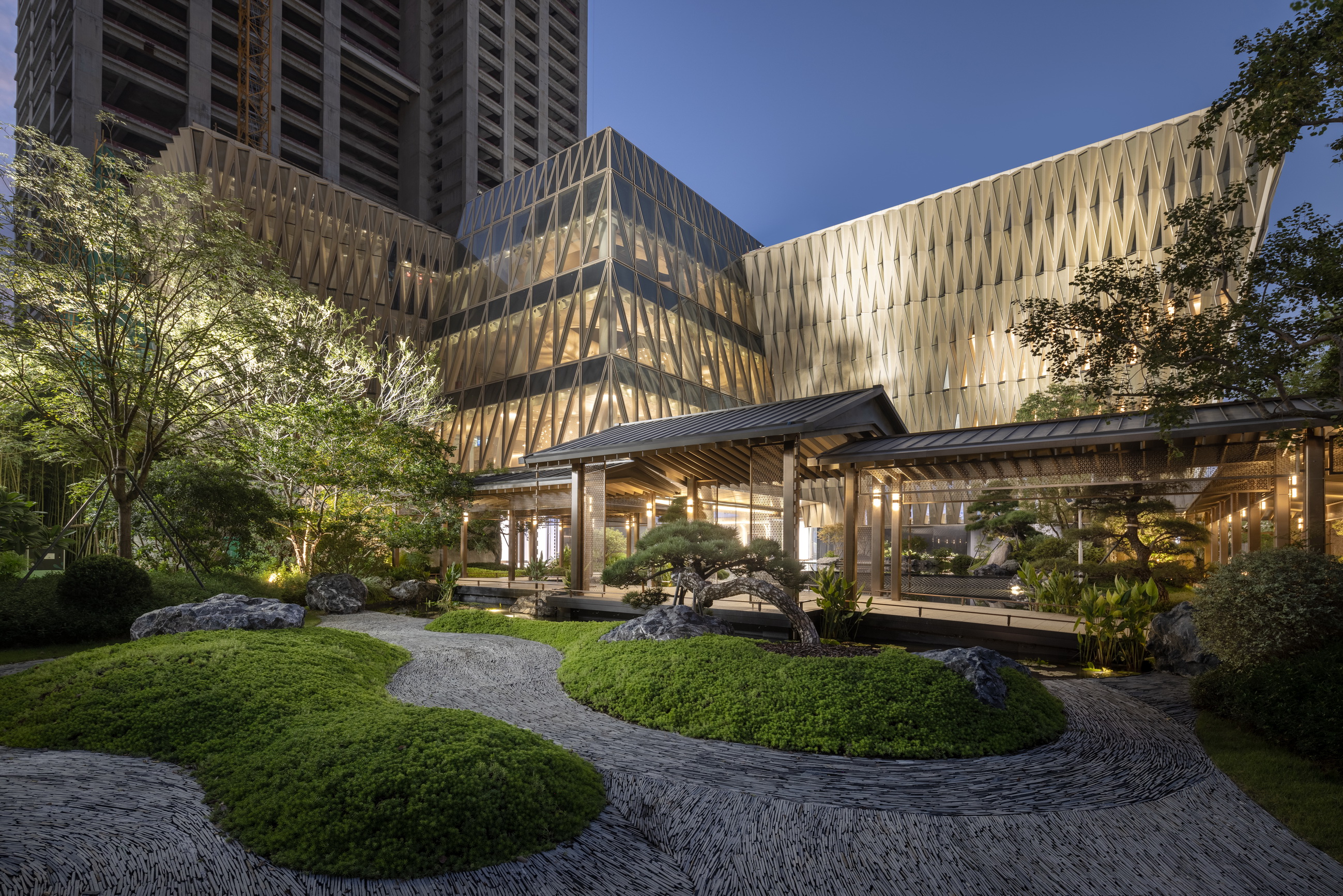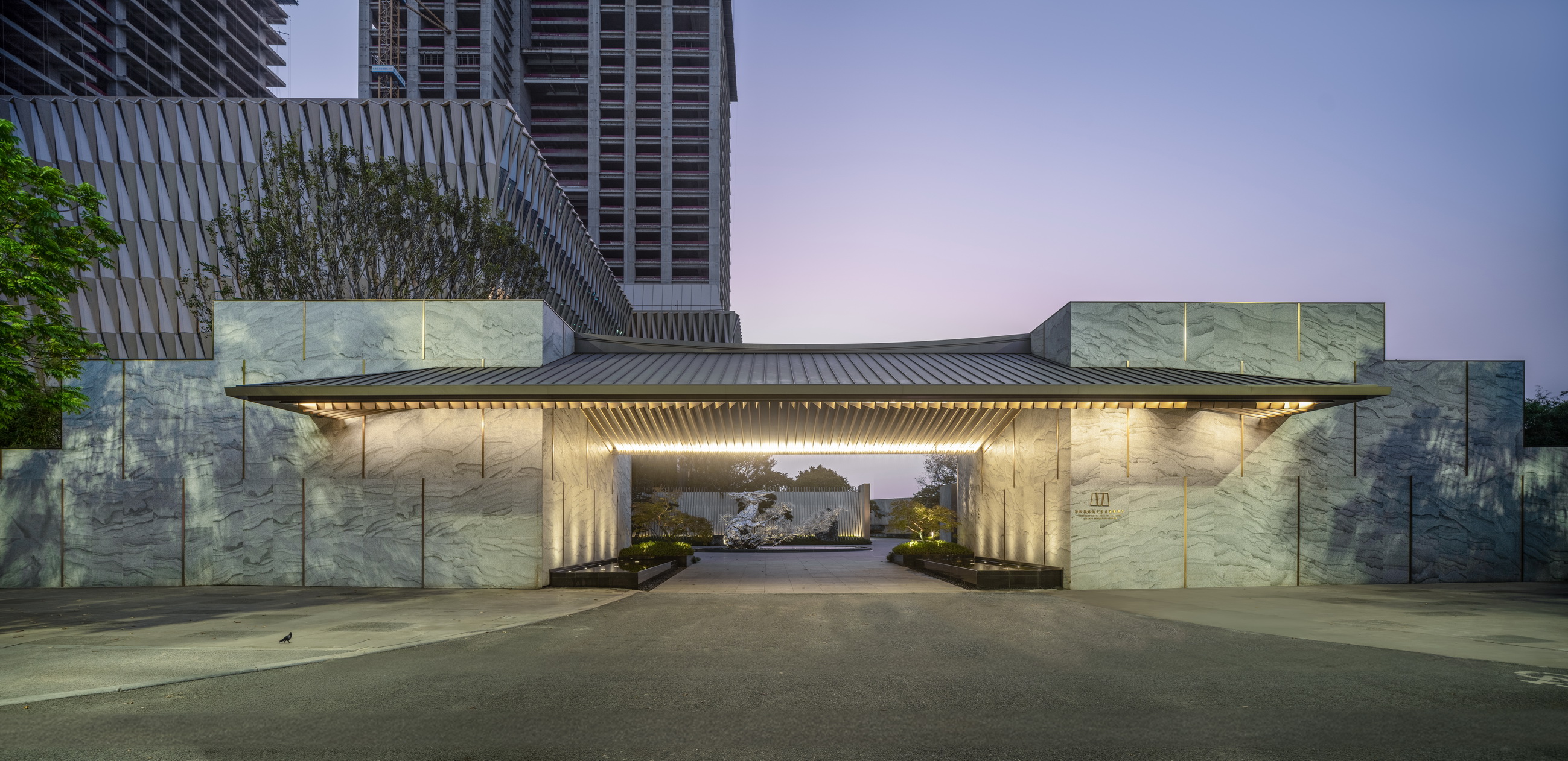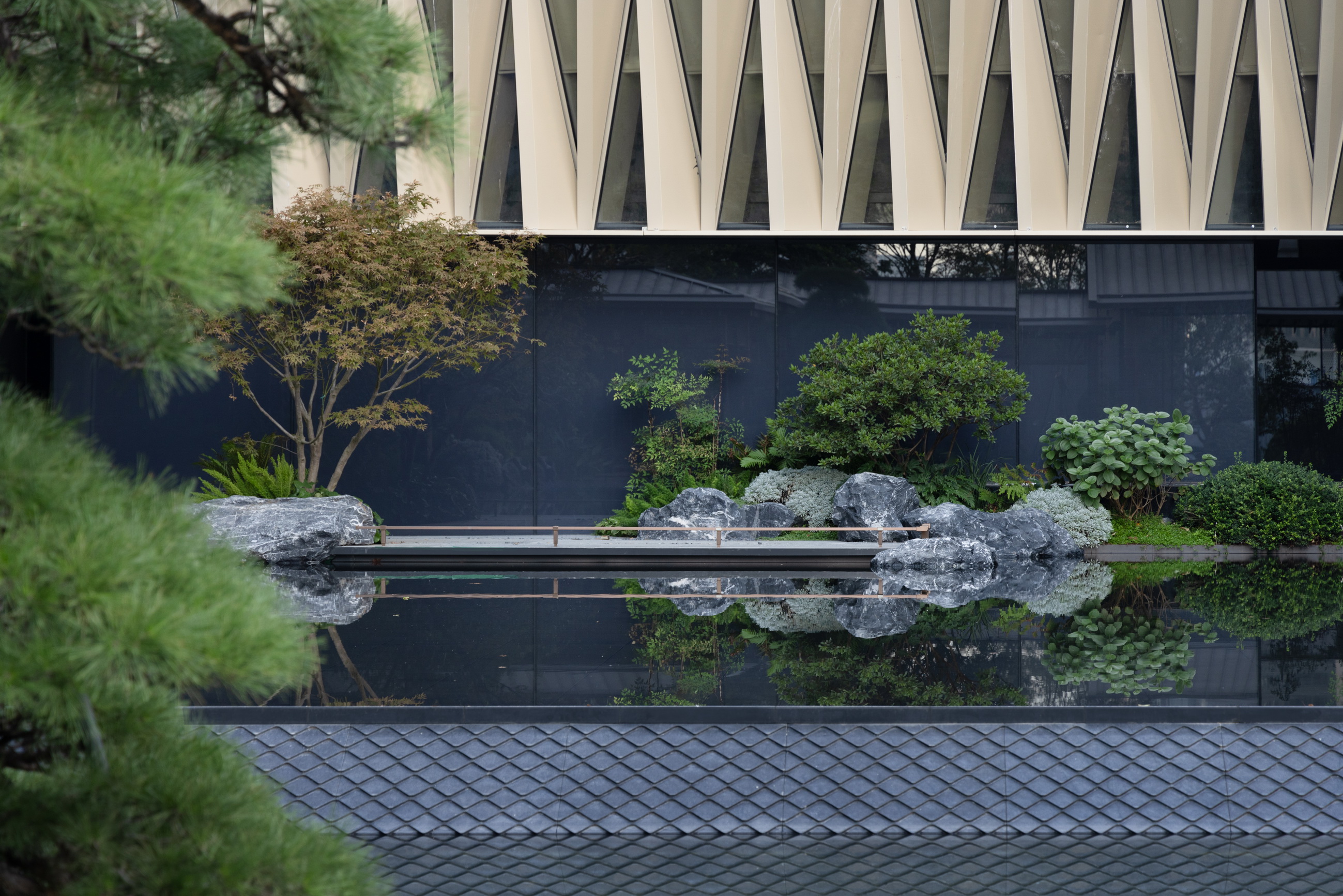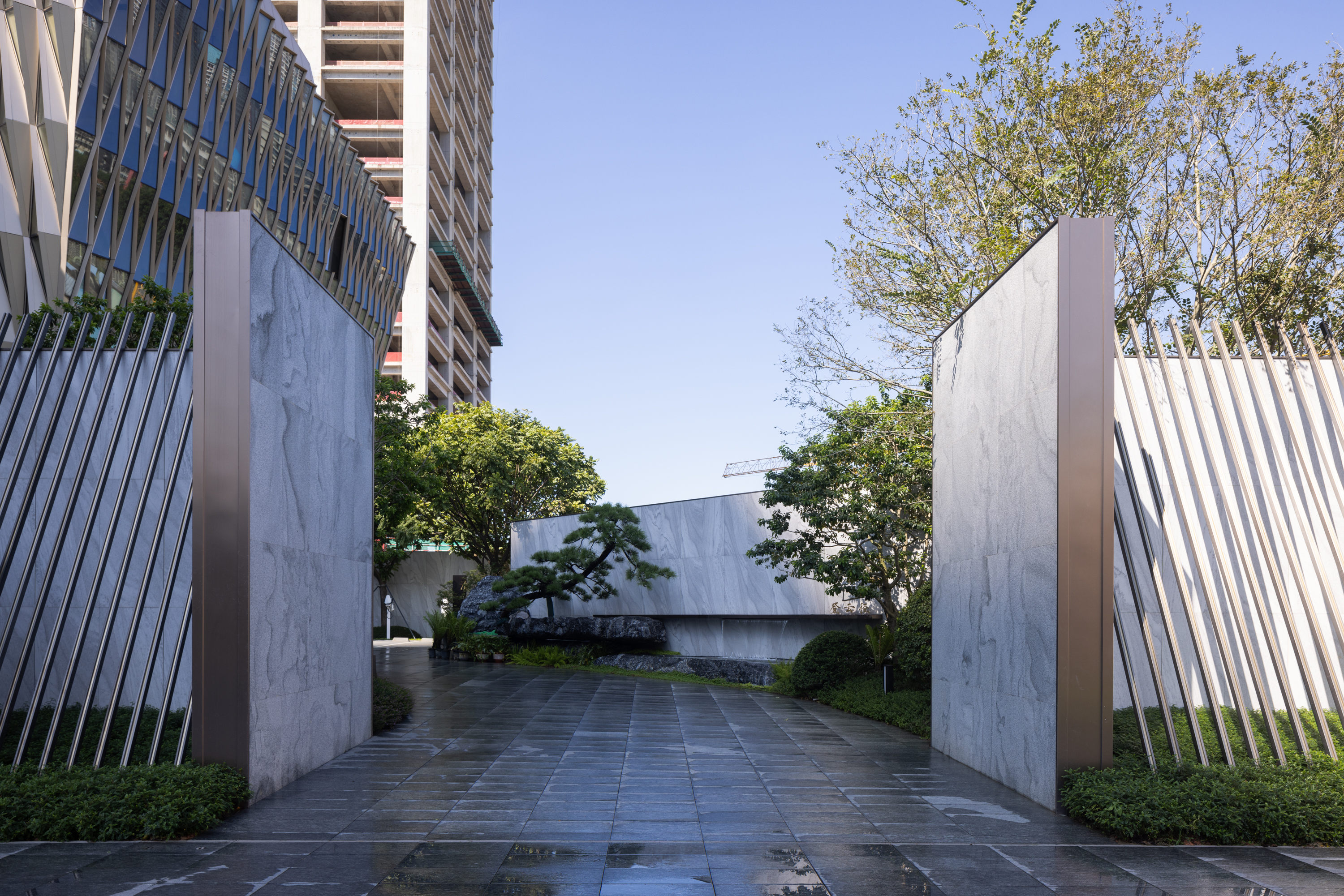 深铁粤港澳大湾区展厅位于深圳前海湾地铁枢纽,建筑为江南屋檐的现代幕墙演绎。景观也引用传统园林特点作为演绎,展现展厅外部场所。根据交通及游览动线点缀安排景点,去展场空间化,将文化展厅和公共交通做适当分隔,分别营造各自的功能场所,同时又以传统园林手法统一空间形象。院门形式的主入口,围堂格局的松石交通场所,入门见山的传统形式,解决人行车行交通。夹道回廊的展厅到达,酝酿进入展场游园体验。