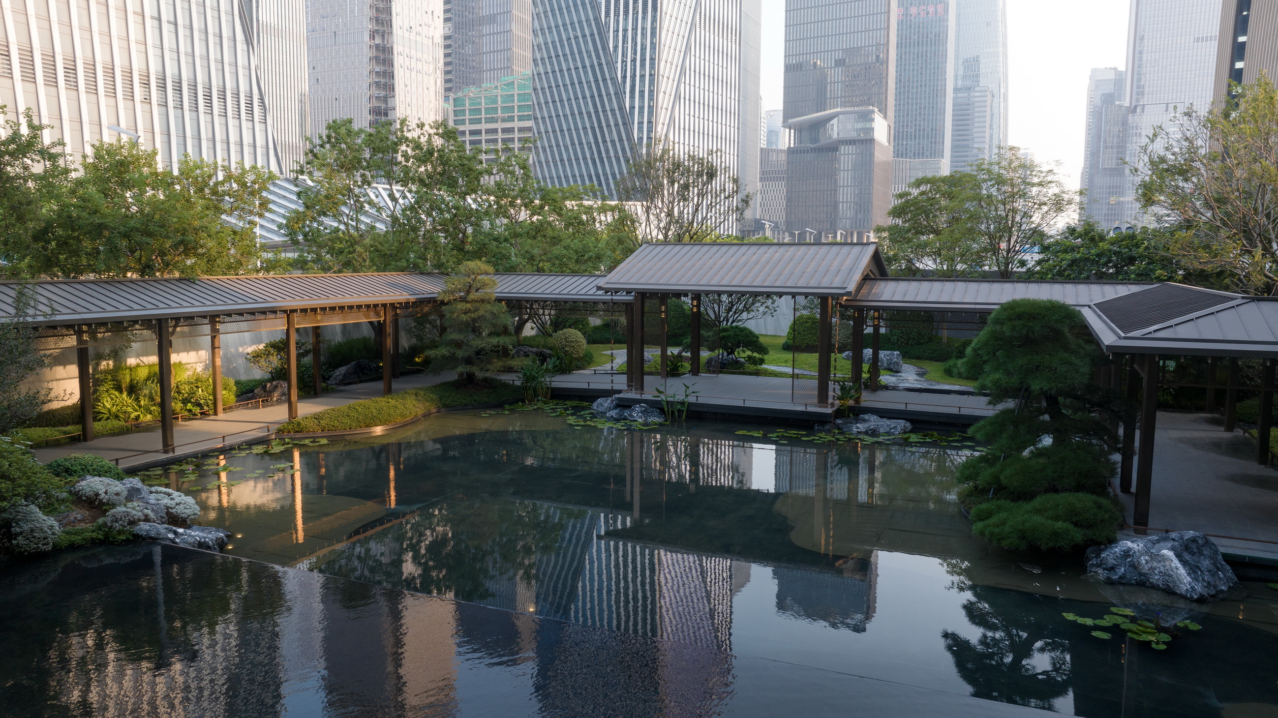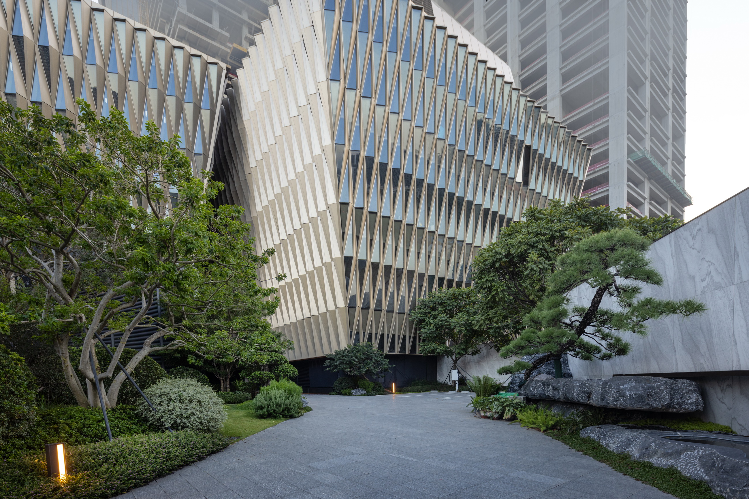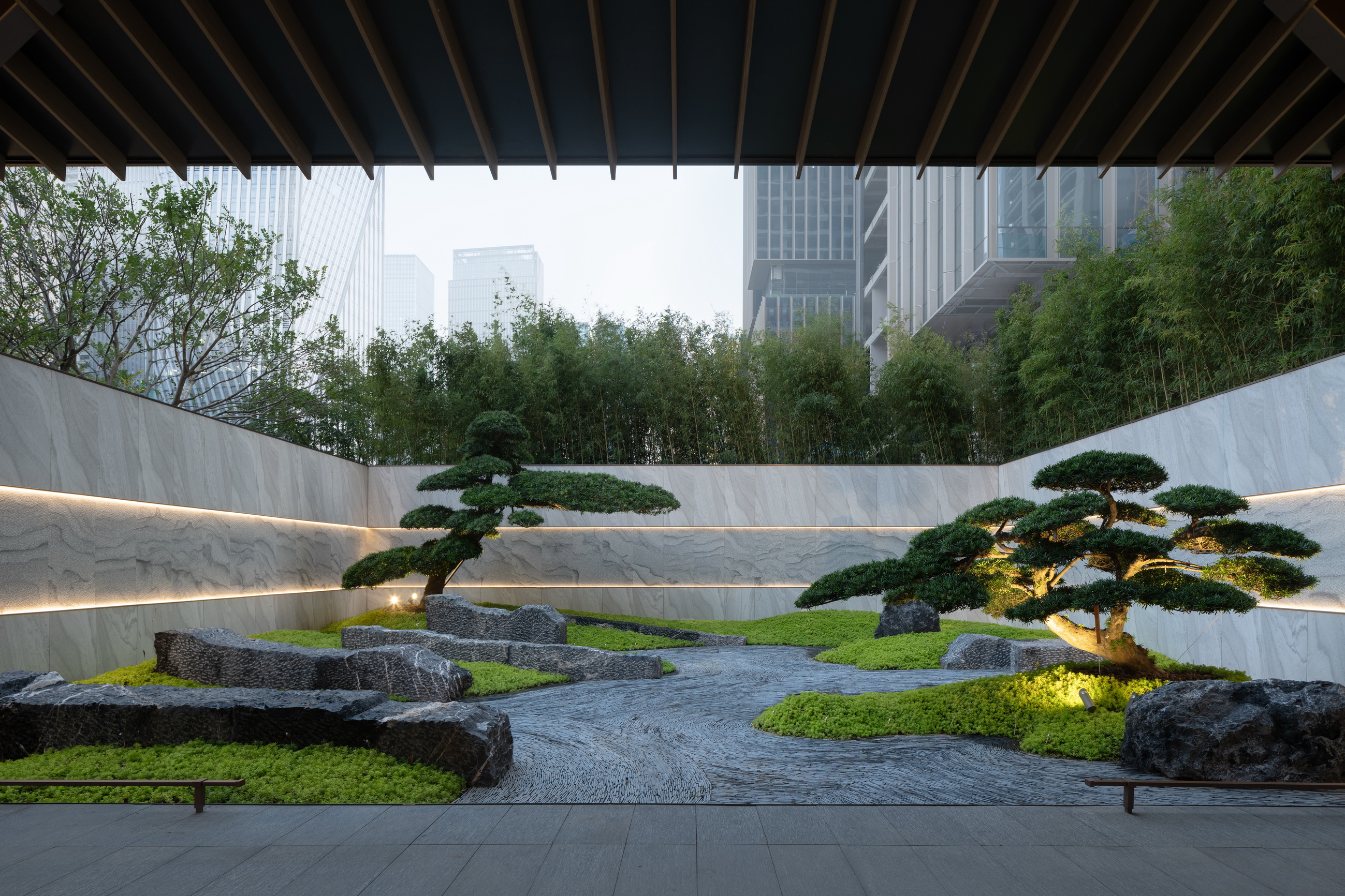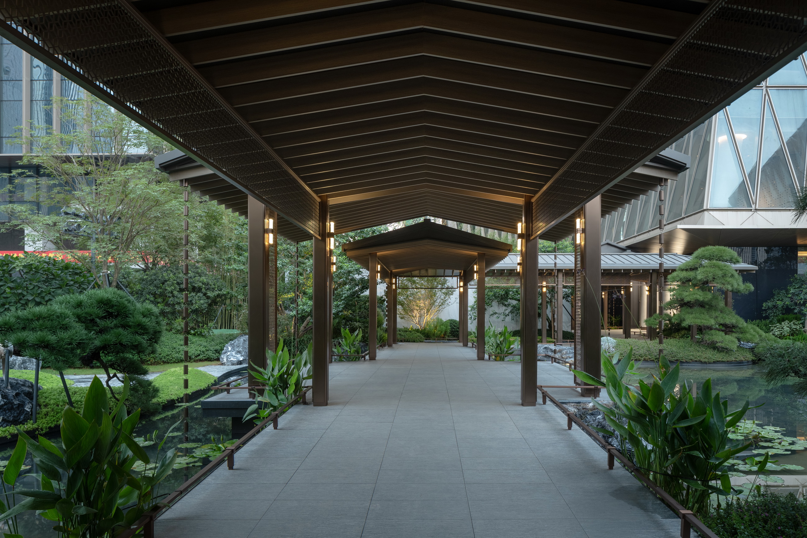 深铁粤港澳大湾区展厅位于深圳前海湾地铁枢纽,建筑为江南屋檐的现代幕墙演绎。景观也引用传统园林特点作为演绎,展现展厅外部场所。根据交通及游览动线点缀安排景点,去展场空间化,将文化展厅和公共交通做适当分隔,分别营造各自的功能场所,同时又以传统园林手法统一空间形象。院门形式的主入口,围堂格局的松石交通场所,入门见山的传统形式,解决人行车行交通。夹道回廊的展厅到达,酝酿进入展场游园体验。