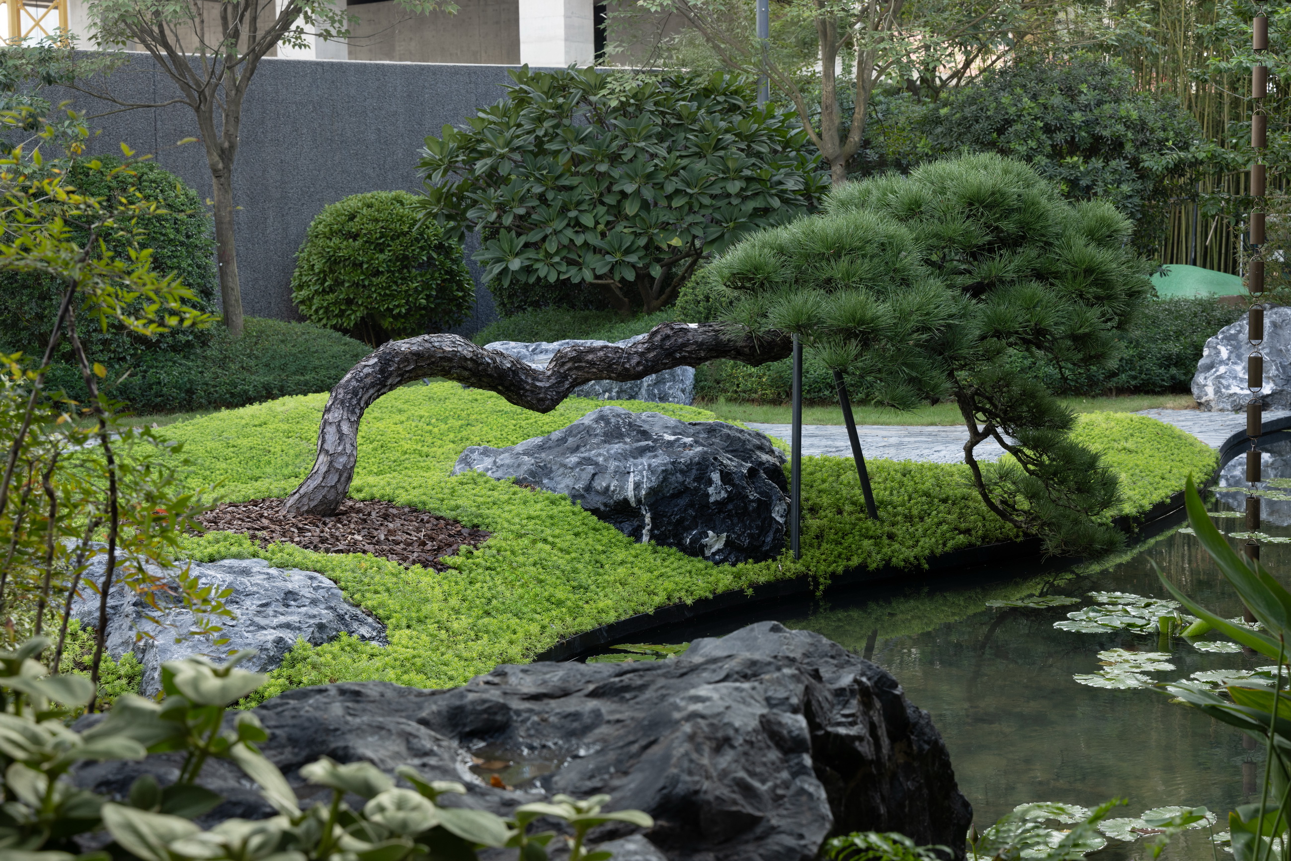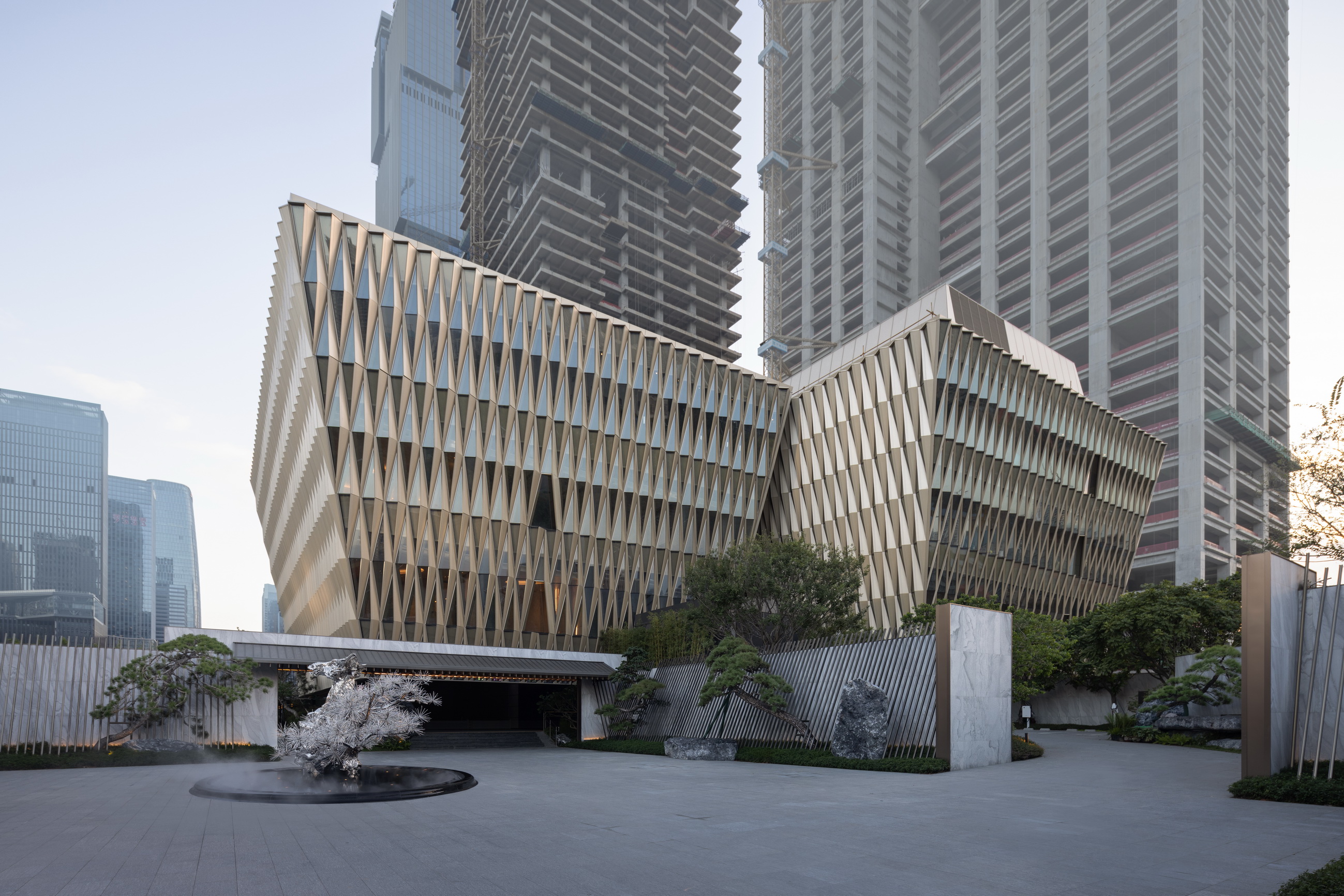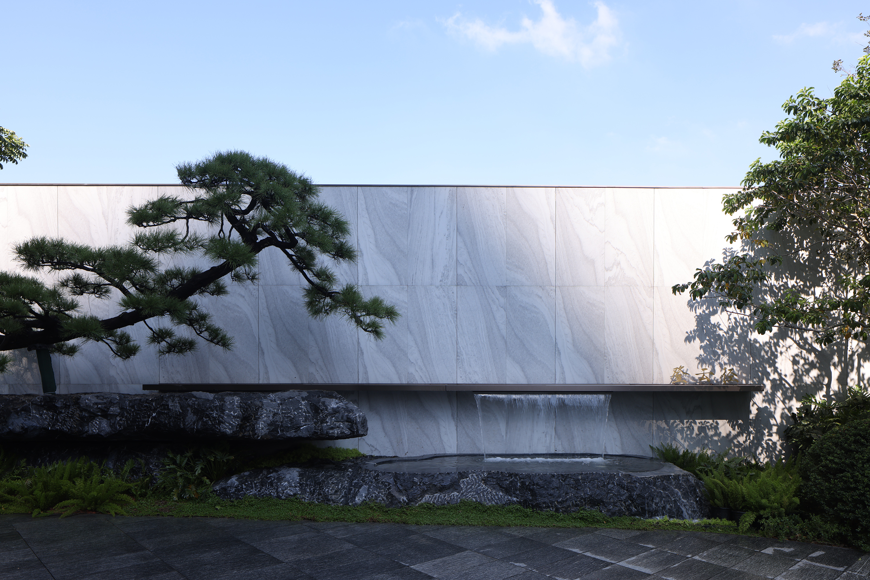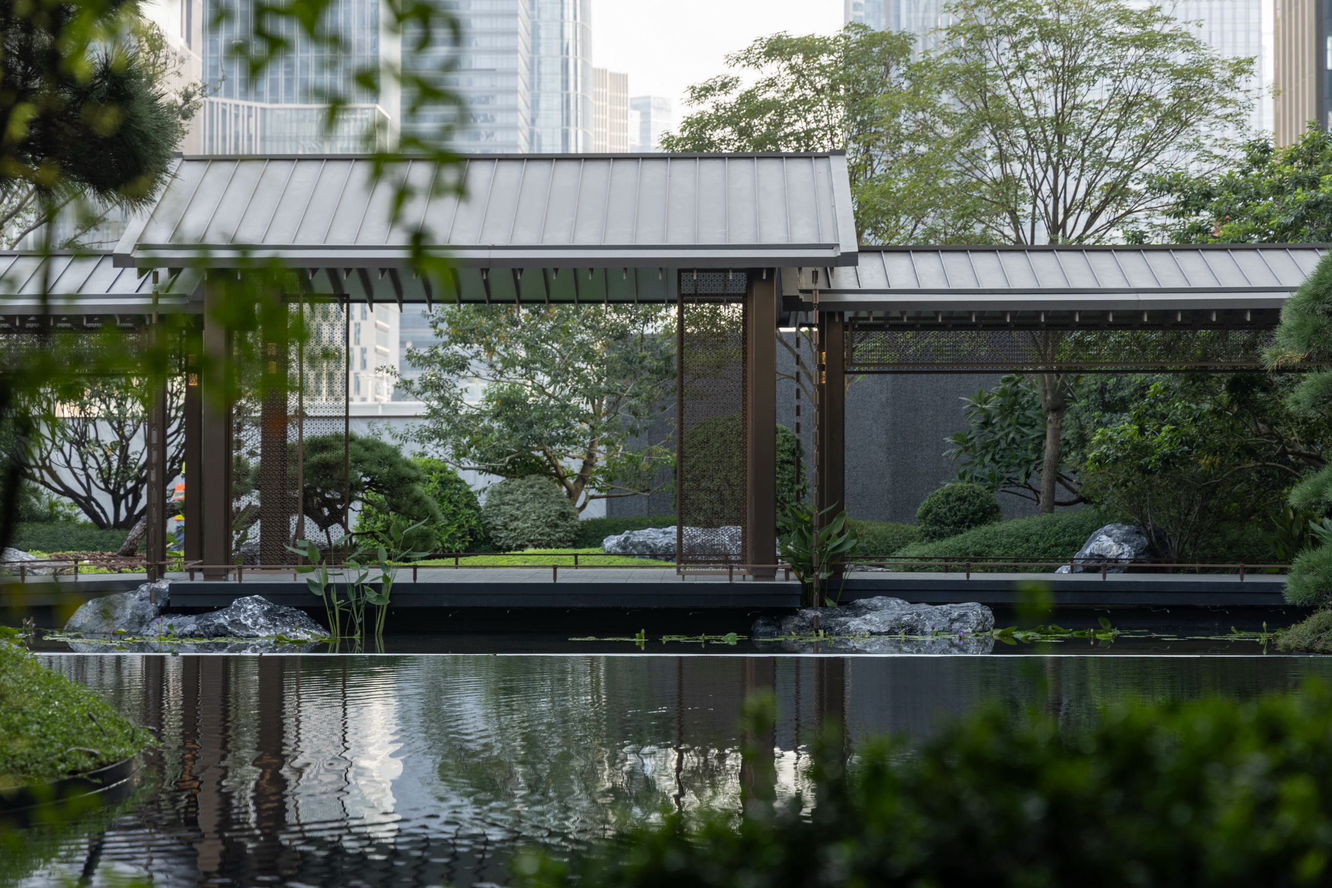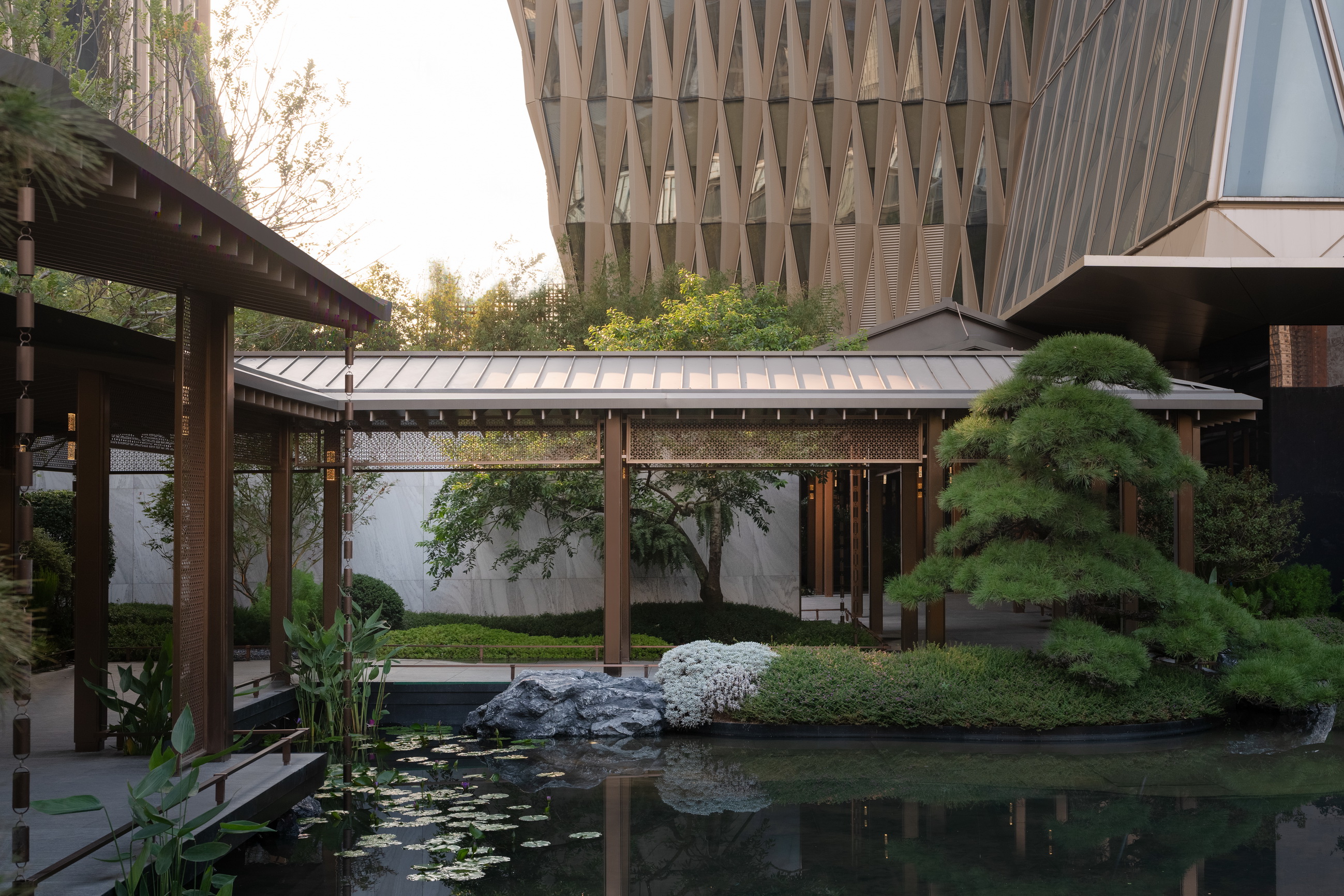 深铁粤港澳大湾区展厅位于深圳前海湾地铁枢纽,建筑为江南屋檐的现代幕墙演绎。景观也引用传统园林特点作为演绎,展现展厅外部场所。根据交通及游览动线点缀安排景点,去展场空间化,将文化展厅和公共交通做适当分隔,分别营造各自的功能场所,同时又以传统园林手法统一空间形象。院门形式的主入口,围堂格局的松石交通场所,入门见山的传统形式,解决人行车行交通。夹道回廊的展厅到达,酝酿进入展场游园体验。
