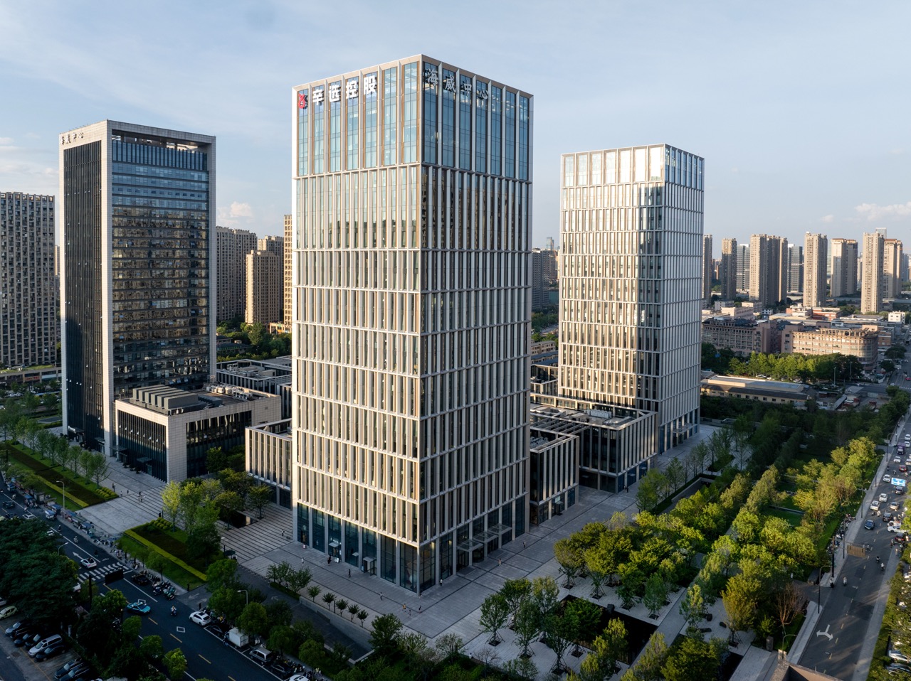 海威置业总部商务园 坐落于杭州江北区钱塘江南岸,完美融合了城市生态与现代商业环境。由著名建筑事务所GMP设计,该项目以极简主义的建筑风格为特色,建筑周围环绕着占地10,000平方米的开放景观空间,JTL Studio设计景观营造出郁郁葱葱的“城市森林”氛围。园区注重人与自然的共生,为员工与访客提供了一个实用、可持续且视觉丰富的绿色庇护所。