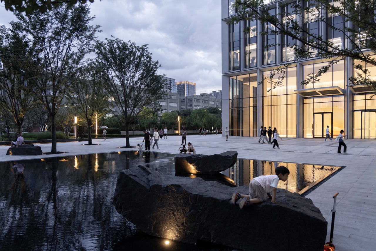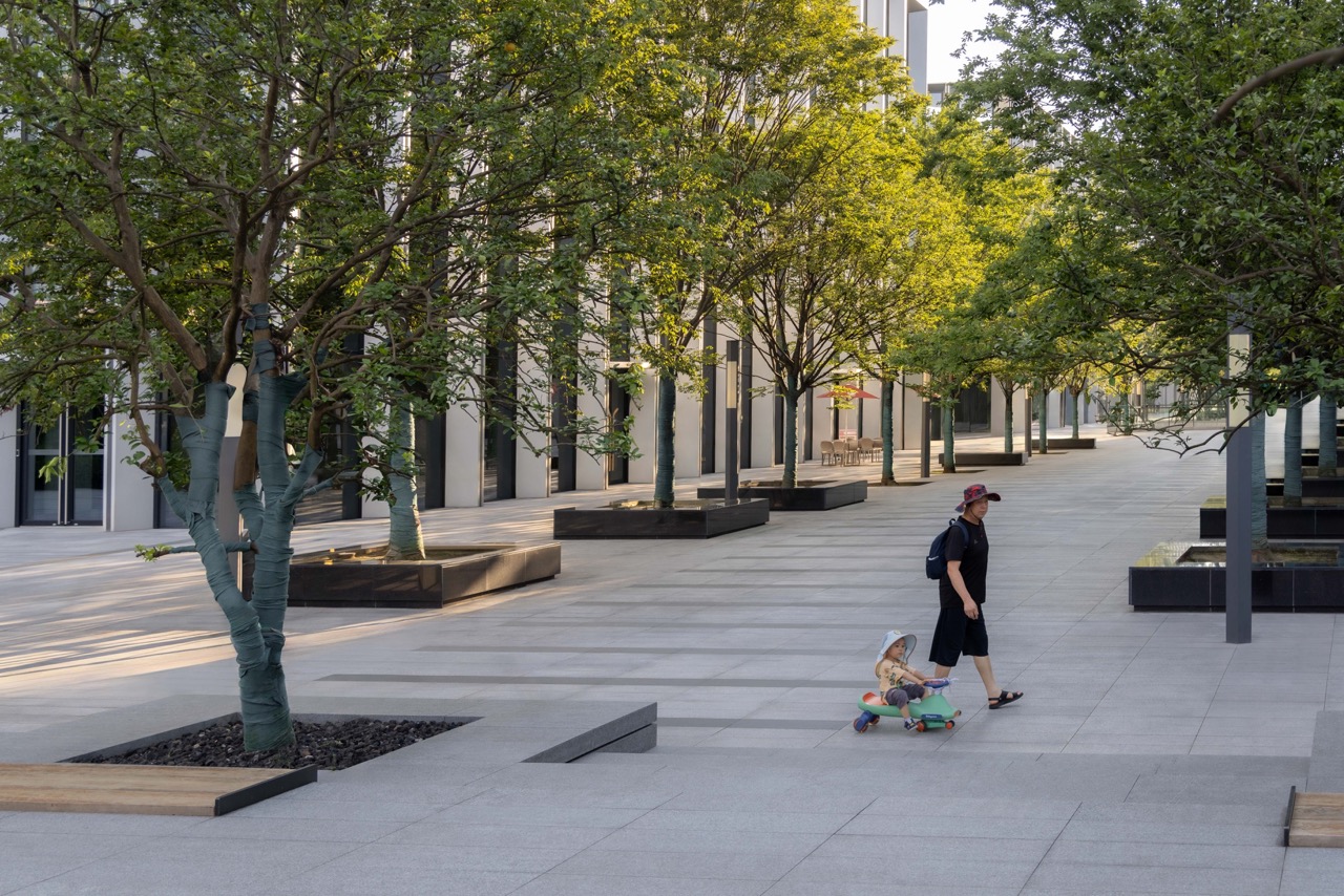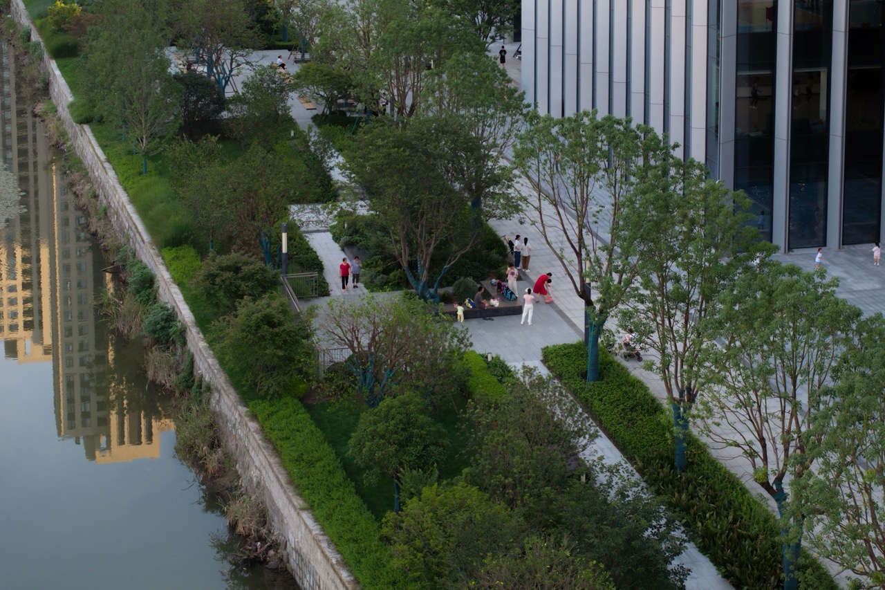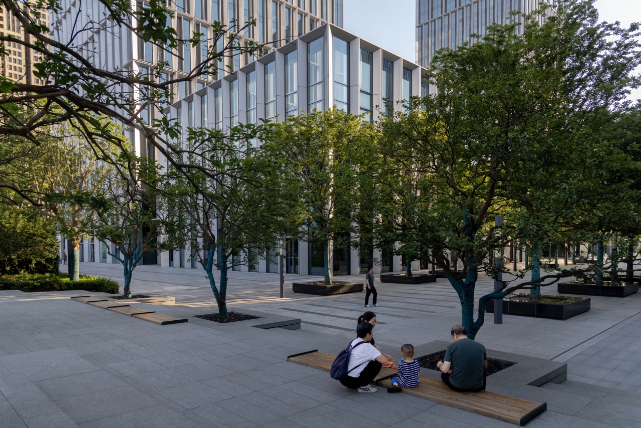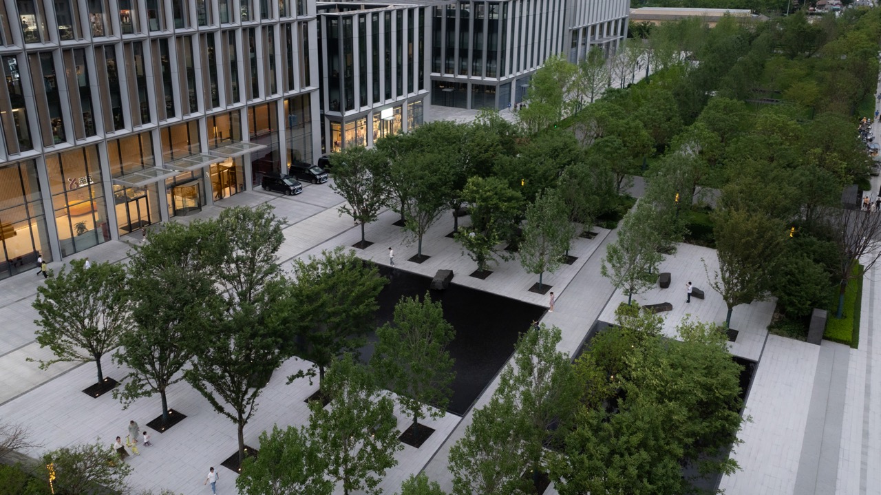 海威置业总部商务园 坐落于杭州江北区钱塘江南岸,完美融合了城市生态与现代商业环境。由著名建筑事务所GMP设计,该项目以极简主义的建筑风格为特色,建筑周围环绕着占地10,000平方米的开放景观空间,JTL Studio设计景观营造出郁郁葱葱的“城市森林”氛围。园区注重人与自然的共生,为员工与访客提供了一个实用、可持续且视觉丰富的绿色庇护所。