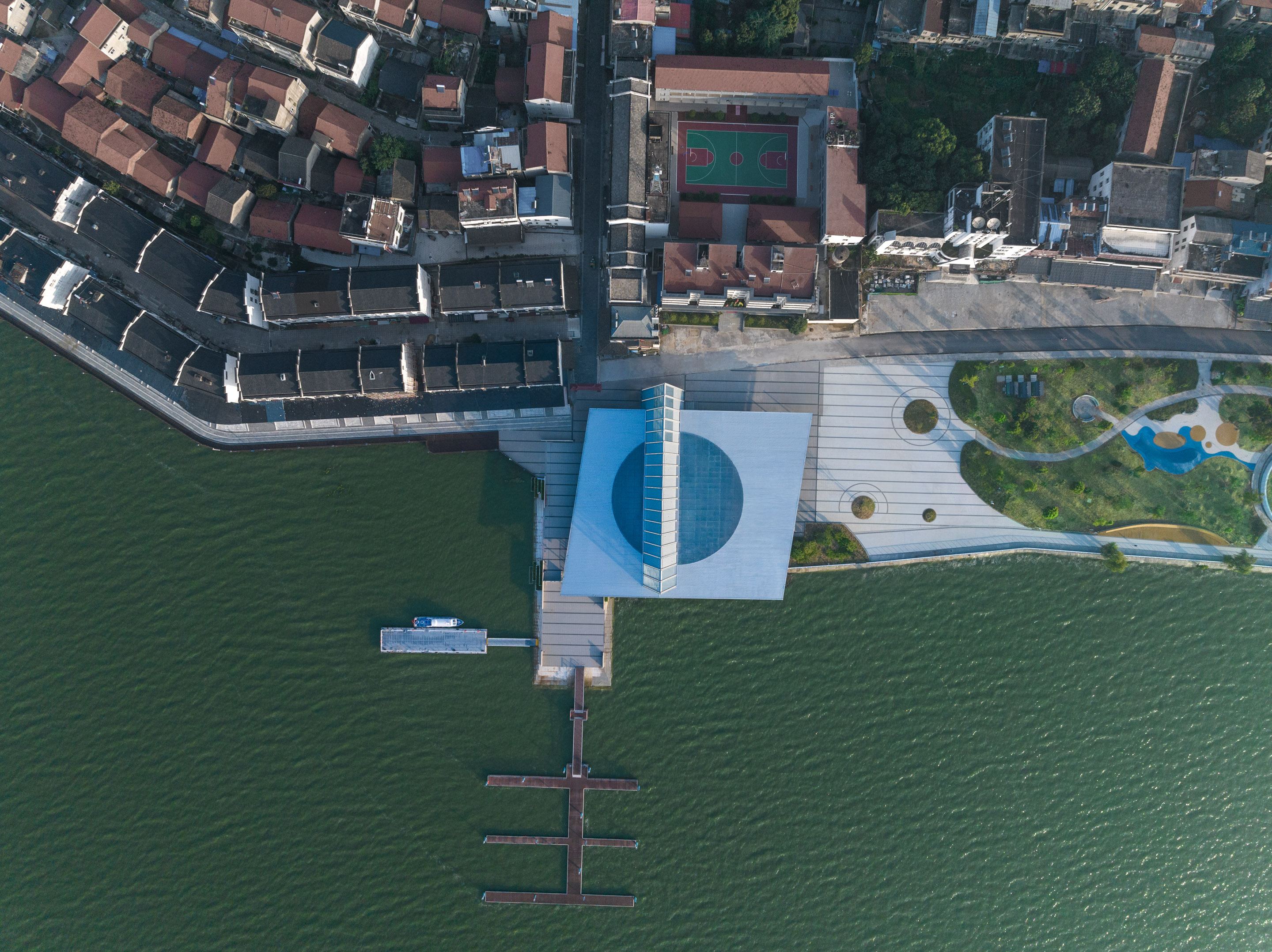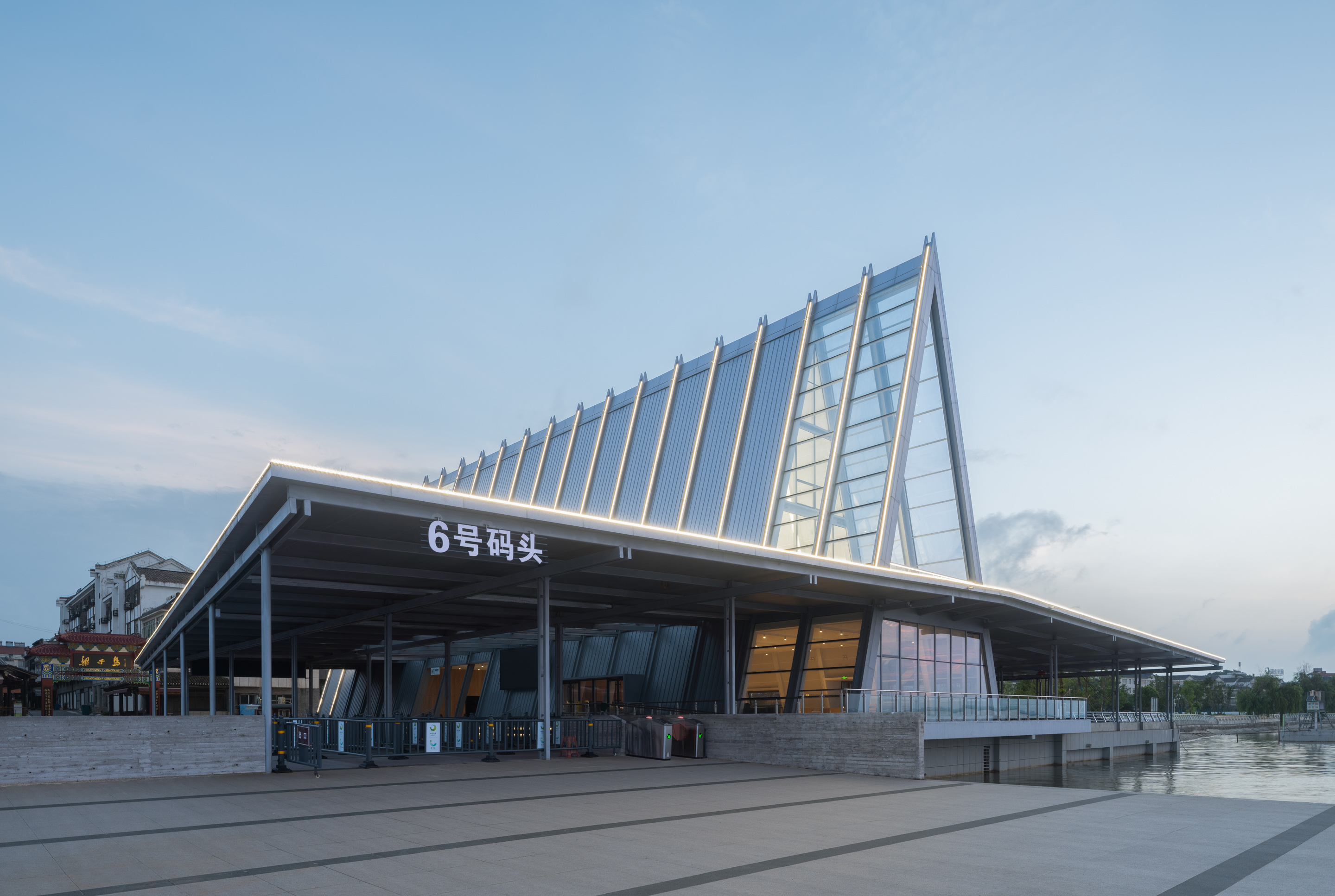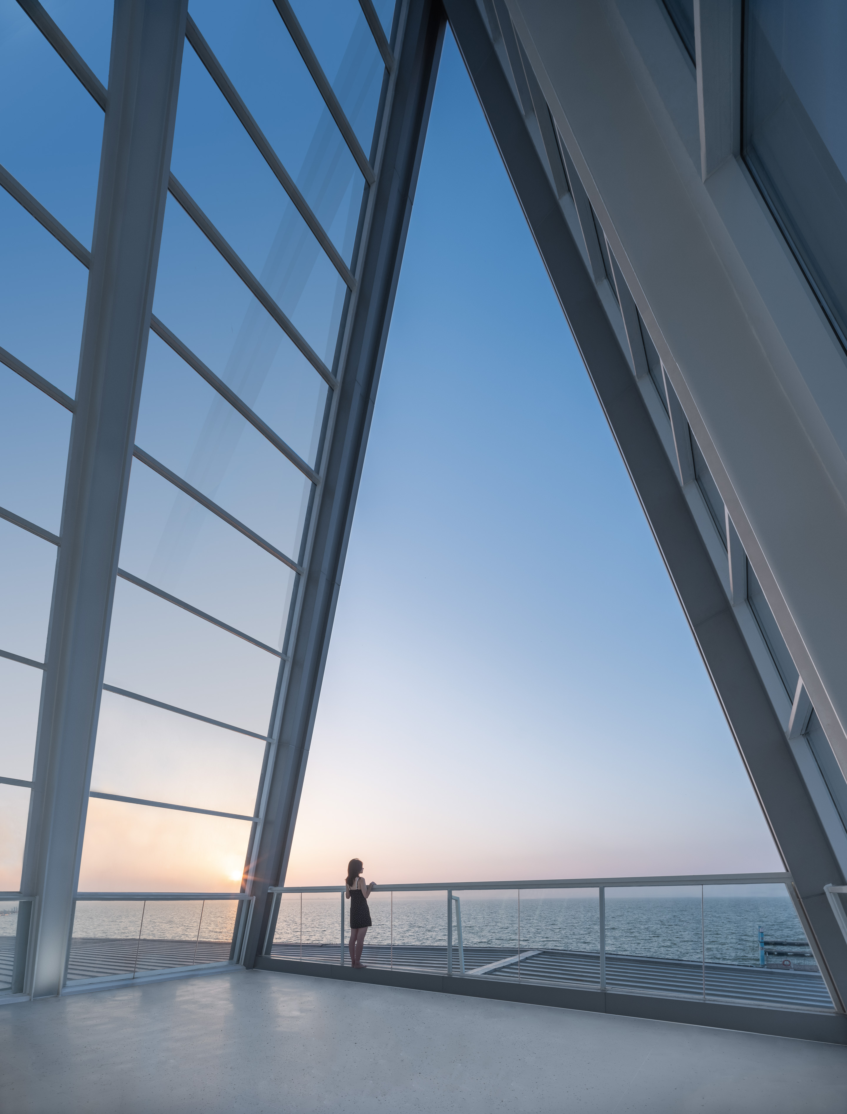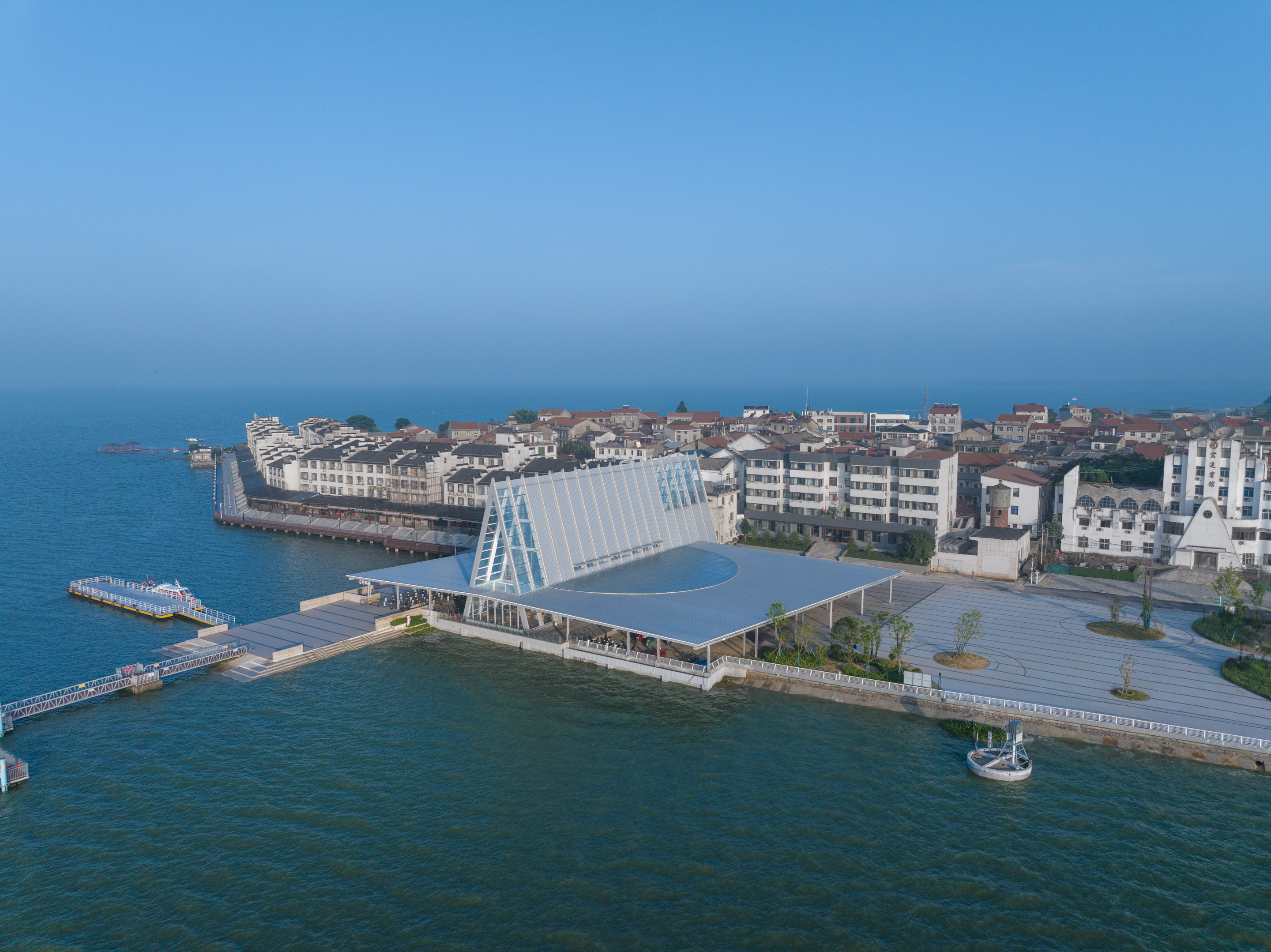 设计用一个圆形玻璃天窗布置到平行四边形屋面内引入自然光。蓬下支撑的柱子,通过两根小柱的组合,弱化支撑结构的尺度感,再通过夹住横梁的抬梁方式,以更加轻巧的结构呈现。 建筑的序列被3m的斜柱规训,广场的景观铺装也遵循这个3m的控制。屋面被银灰色铝镁锰板覆盖,斜柱外包铝合金板设计成工字造型。蓬中间高起的游客中心,一层容纳非高峰客流时段的等候和消费等功能;二层高耸的空间,则承担了水上“灯塔”的象征性意义。